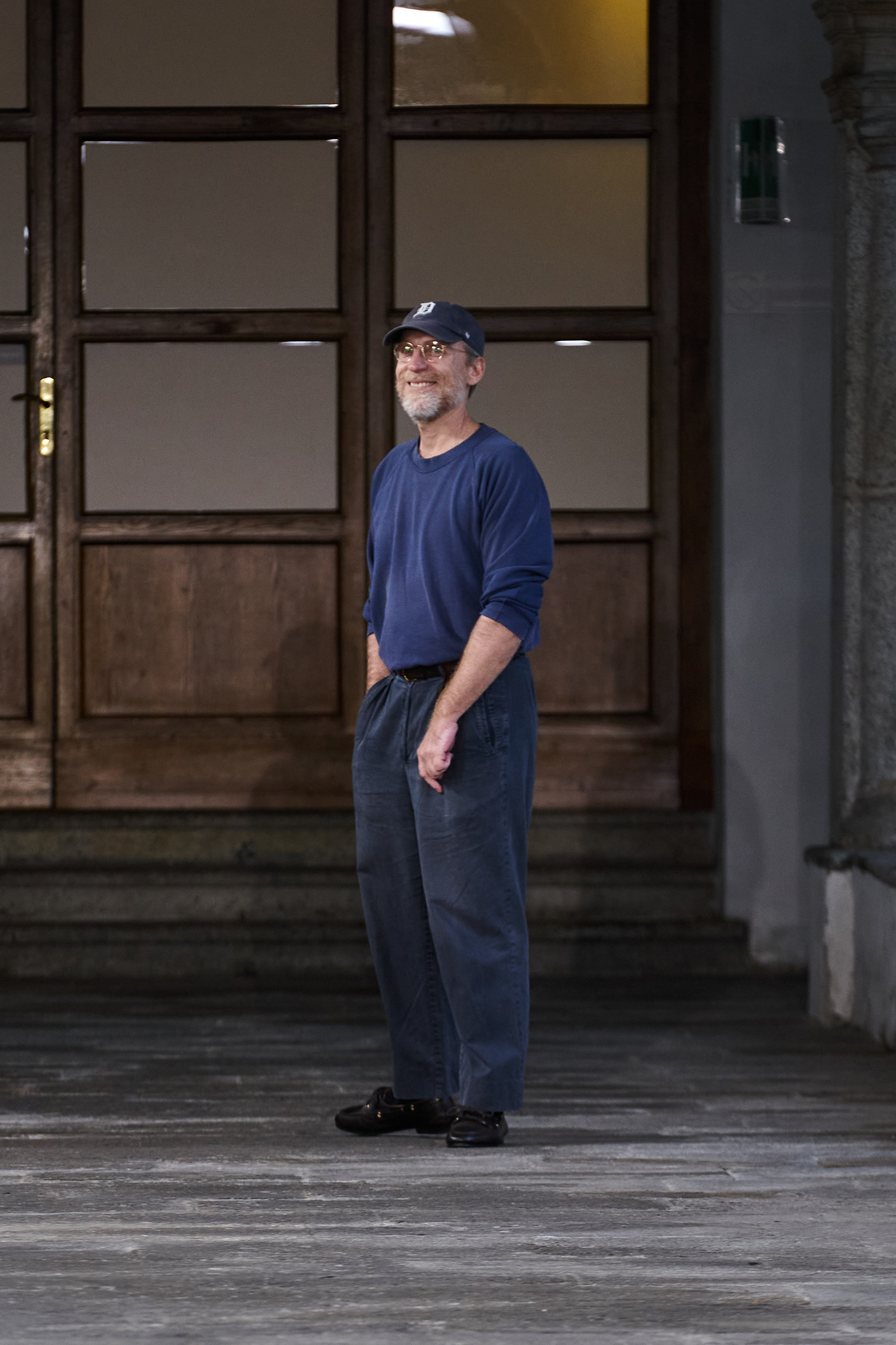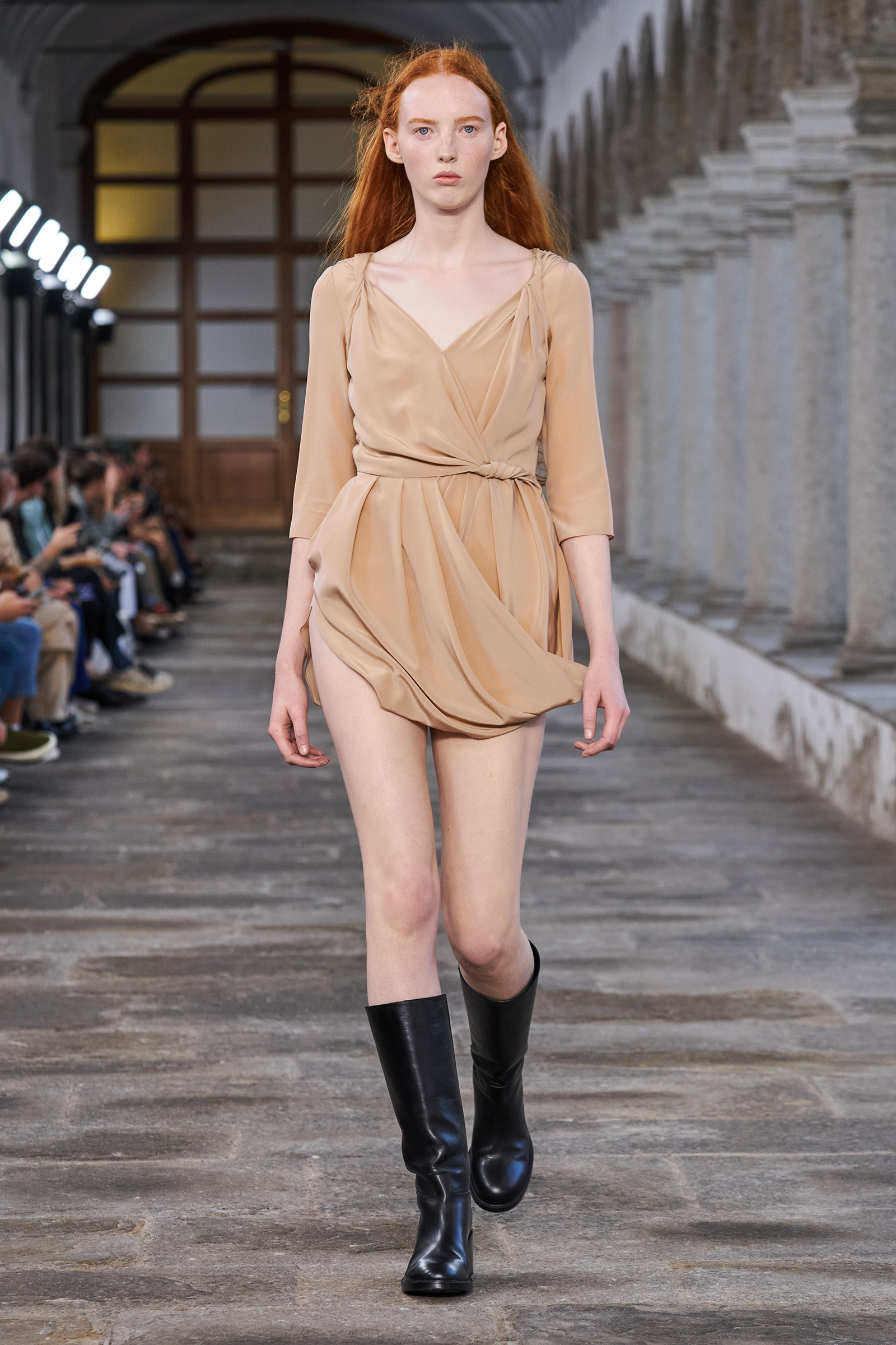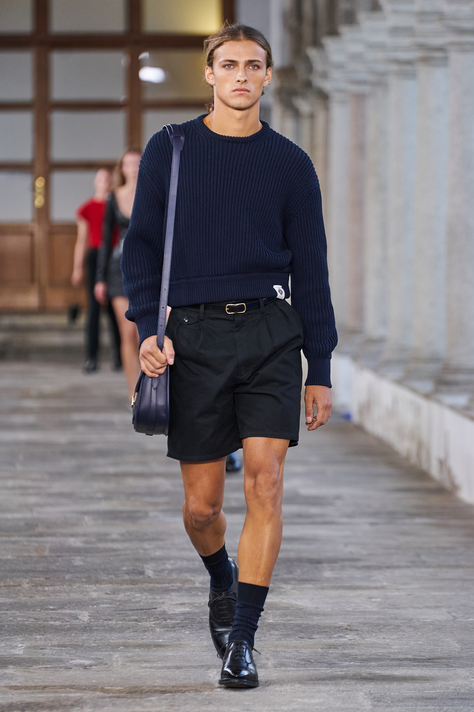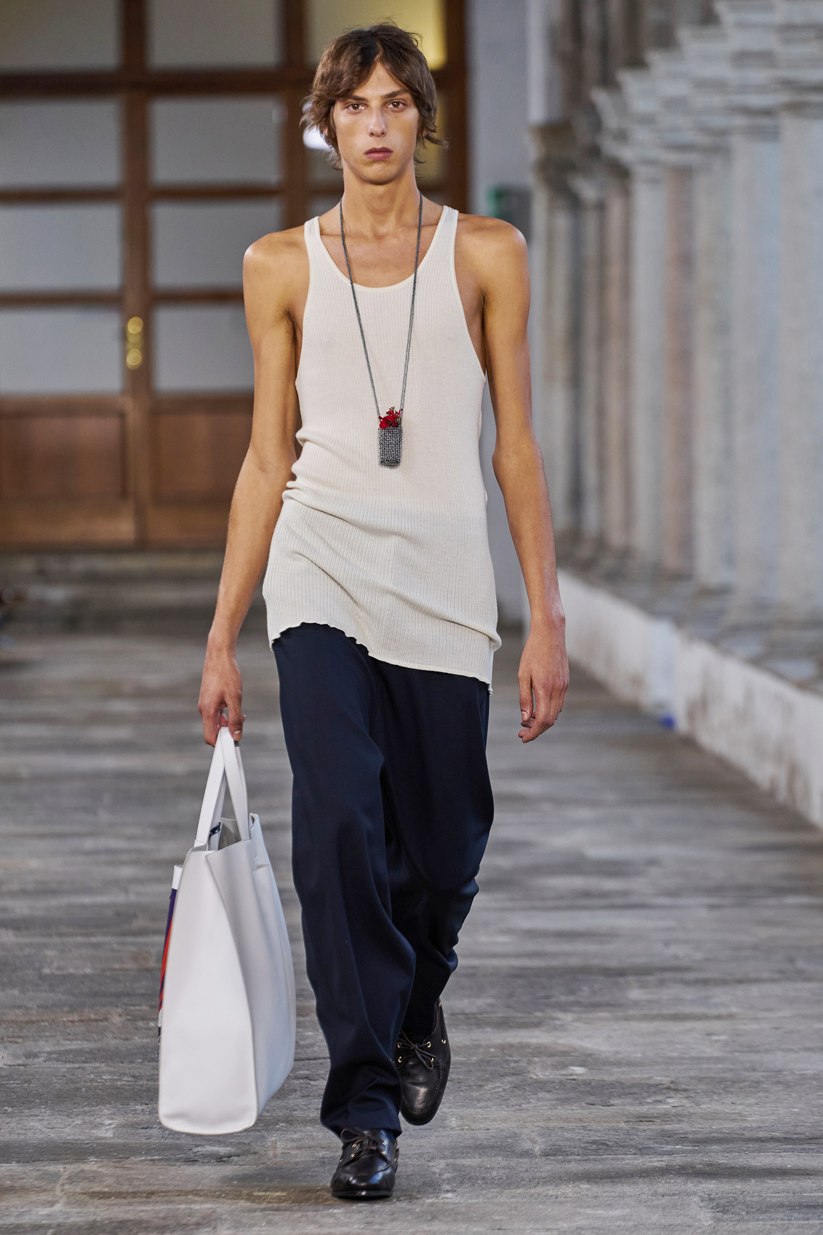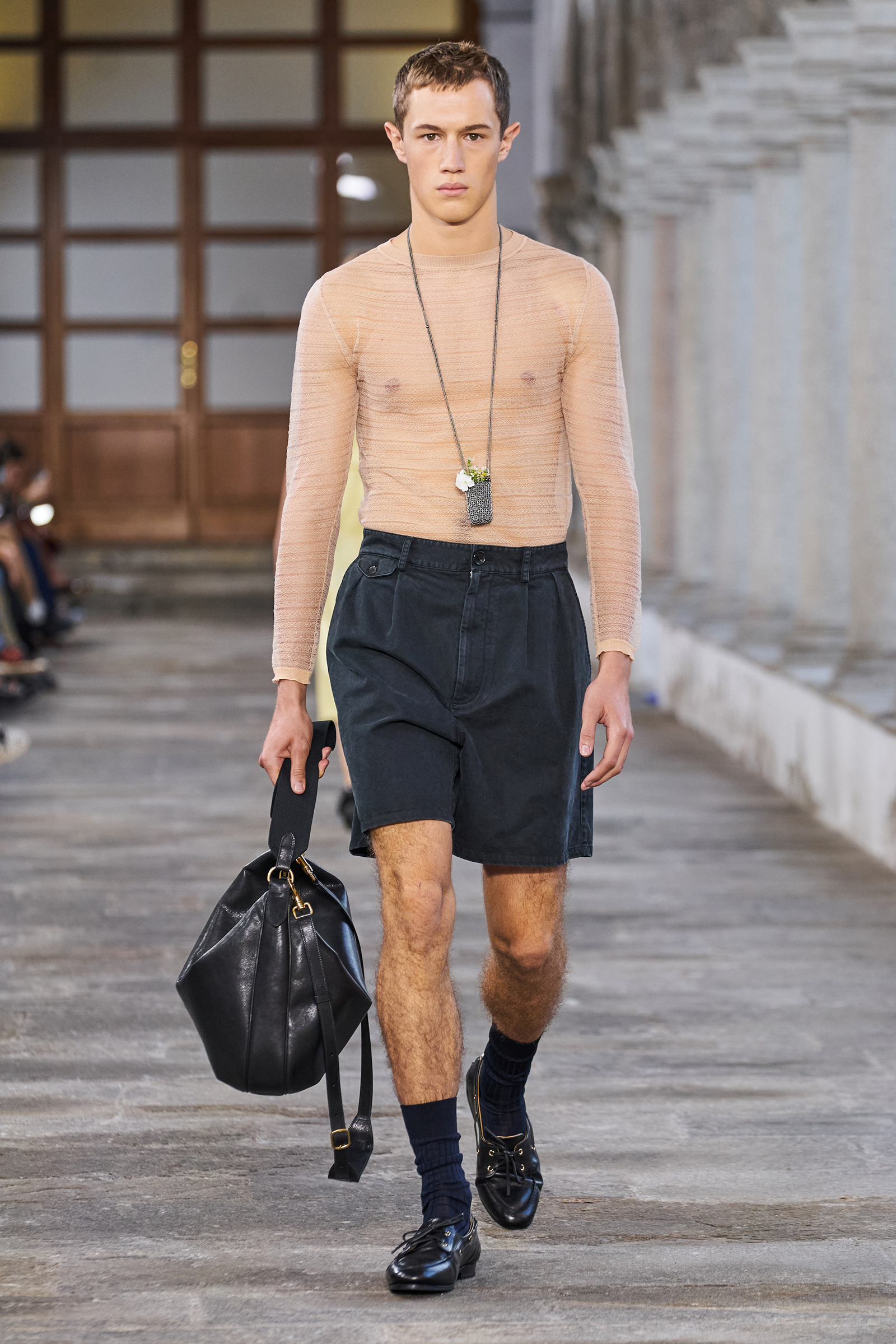 For his first collection, he mined the label’s rich archive “that holds incredible treasures of made in Switzerland craftsmanship,” he said backstage before today’s show, held in the portico surrounding the formal gardens of the San Simpliciano cloisters. A flair for precision and rigorous execution are inherent to the Swiss mindset. Yet as the saying goes, still waters run deep. Bellotti was drawn to explore a mysterious, expressive and subversive flip side of the spirit of the country’s culture. He came across the story of Monte Verità, a utopian community of free, creative souls founded in Ascona at the turn of the 20th century. A haven for spiritual regeneration and artistic and mystical practices, it was visited by famous intellectuals and artists—Carl Jung, Herman Hesse, Rudolf Steiner, Paul Klee and many others sojourned in the retreat, basking in the healing atmosphere of the alpine landscape.