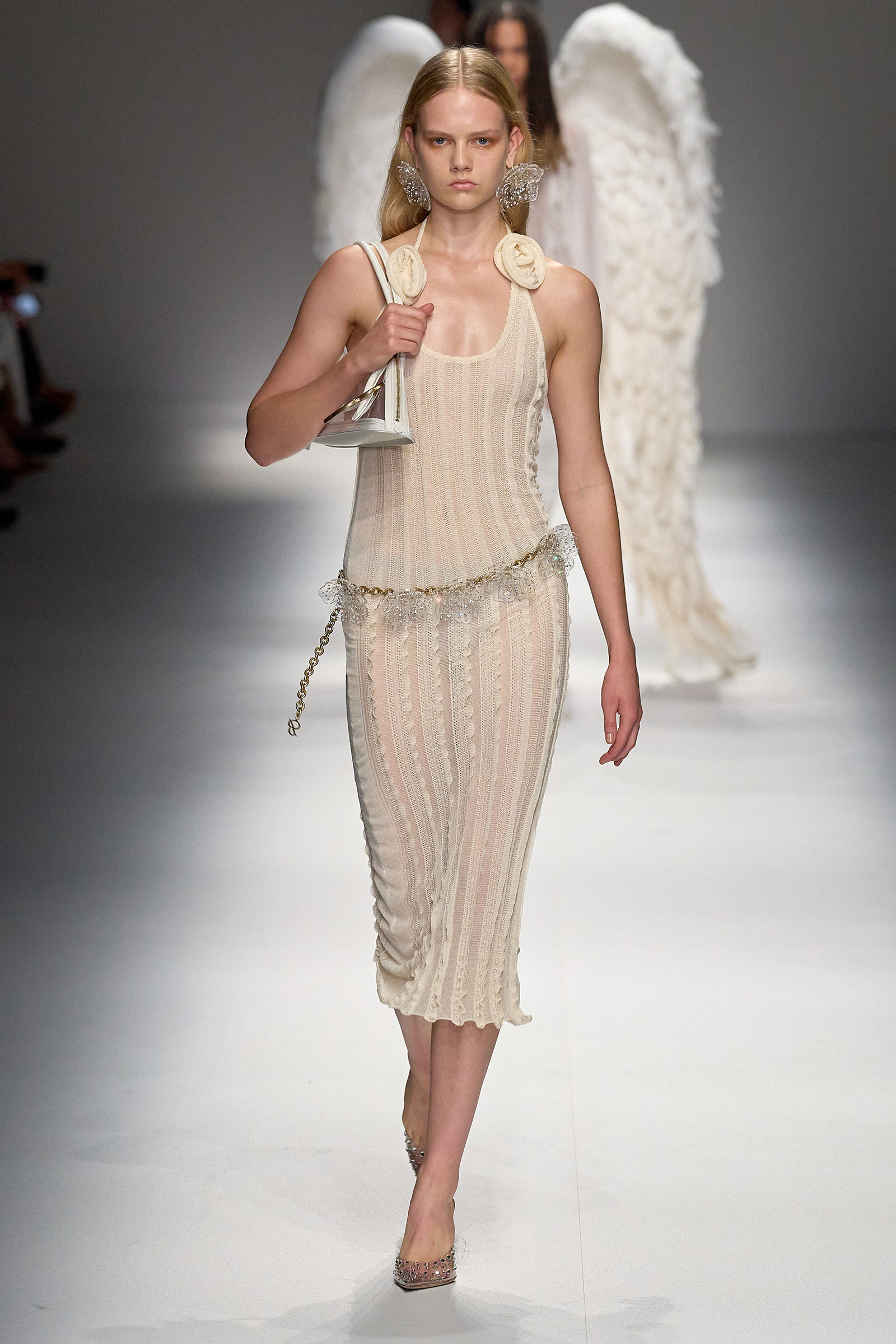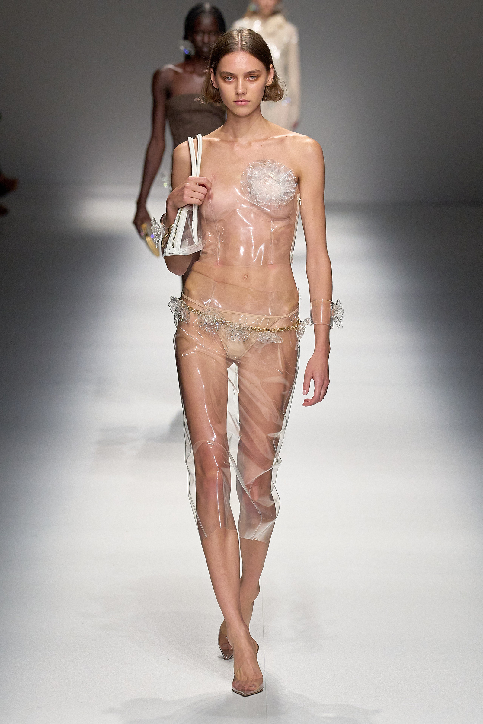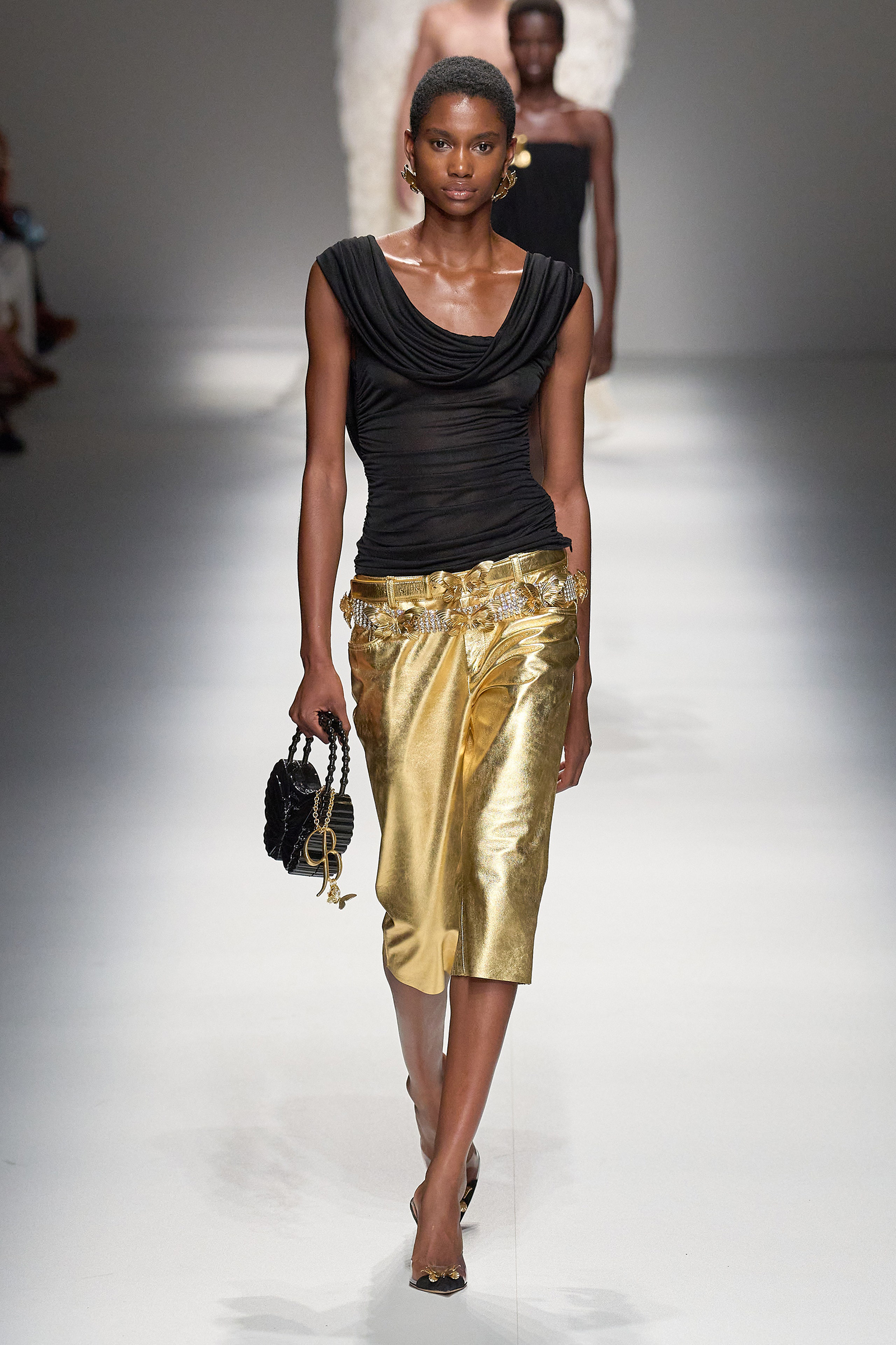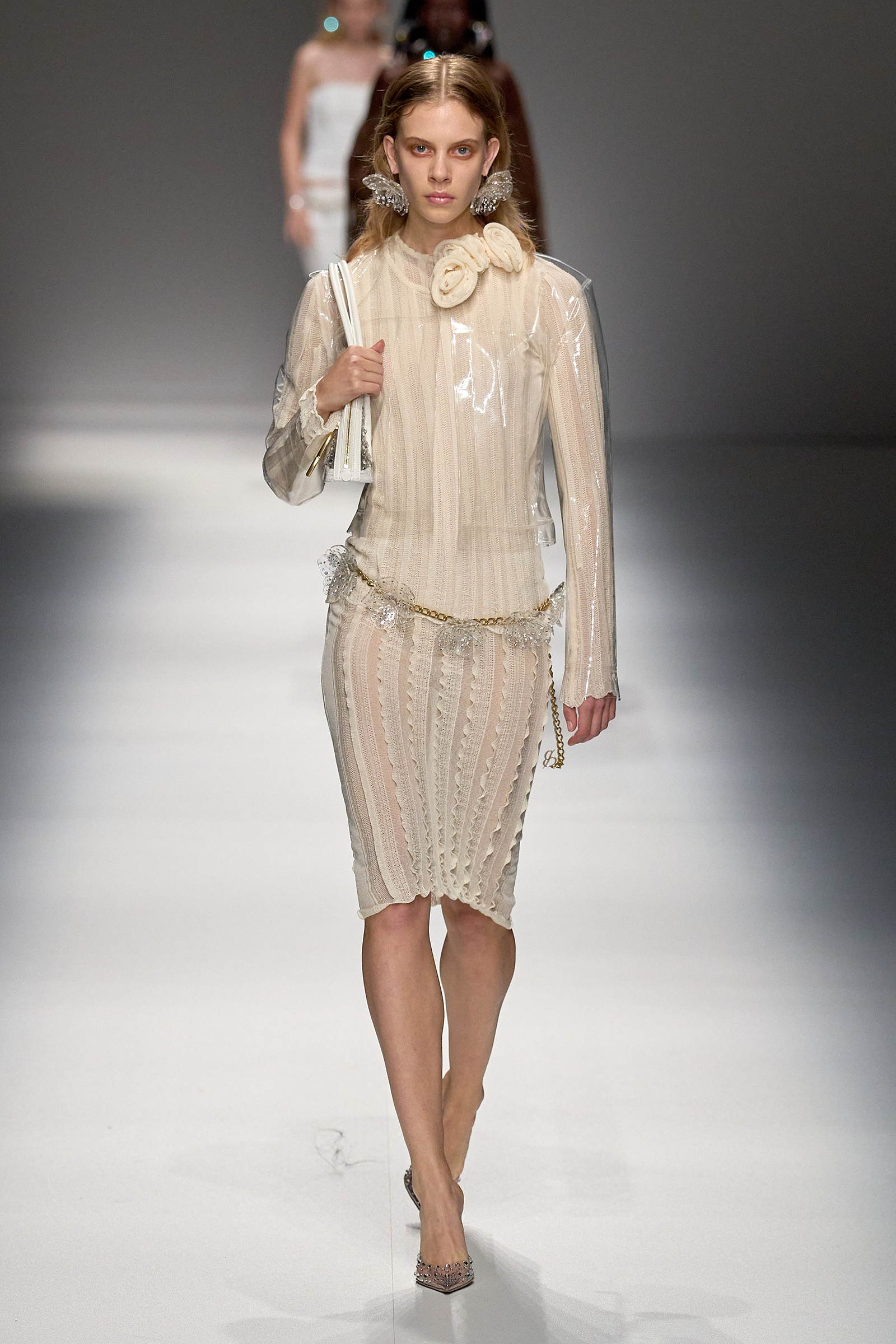 Brognano’s (rather peculiar) idea of purity and airy luminosity expanded into other literal translations: colors were pale, jerseys were flimsy like hosiery, ribbons and trains trailed breezily on the back of ultra-short sexy numbers; shiny gold leather lit up pedal pushers and corsets. Bustiers and pencil skirts in clear PVC, studded with an abundance of rhinestones and crystals, were the pinnacle of Blumarine’s ode to lightness—or better said, nakedness. They didn’t leave anything to the imagination. There’s nothing lighter than the (almost) absolute absence of clothes.