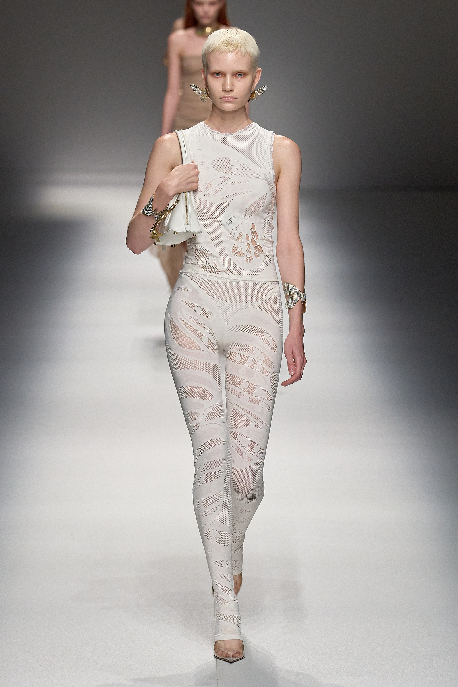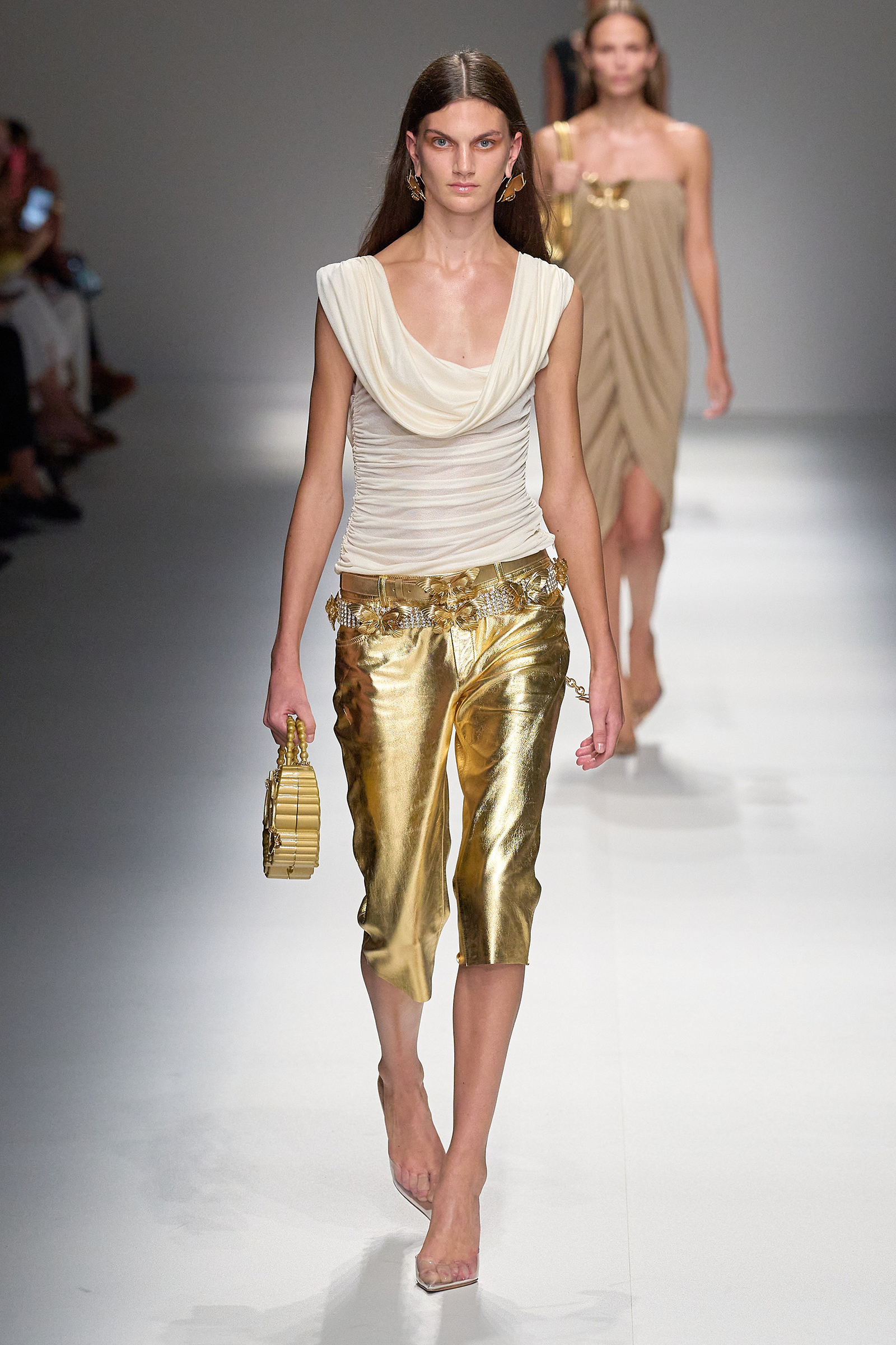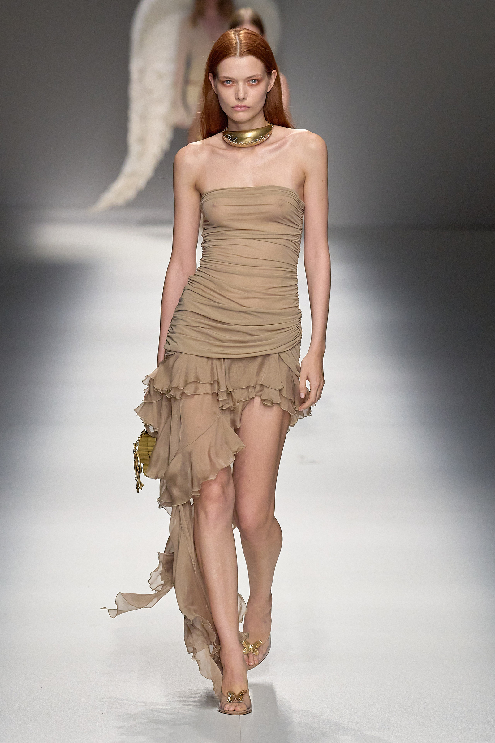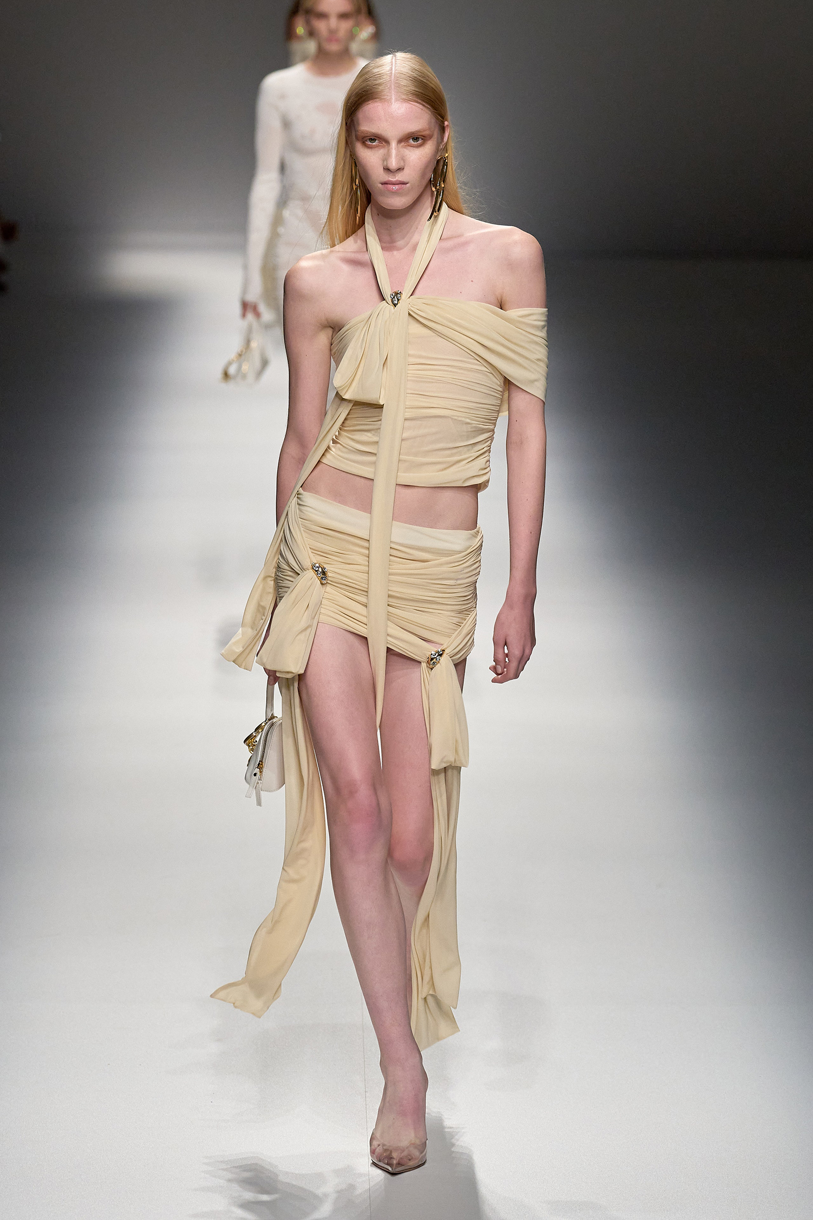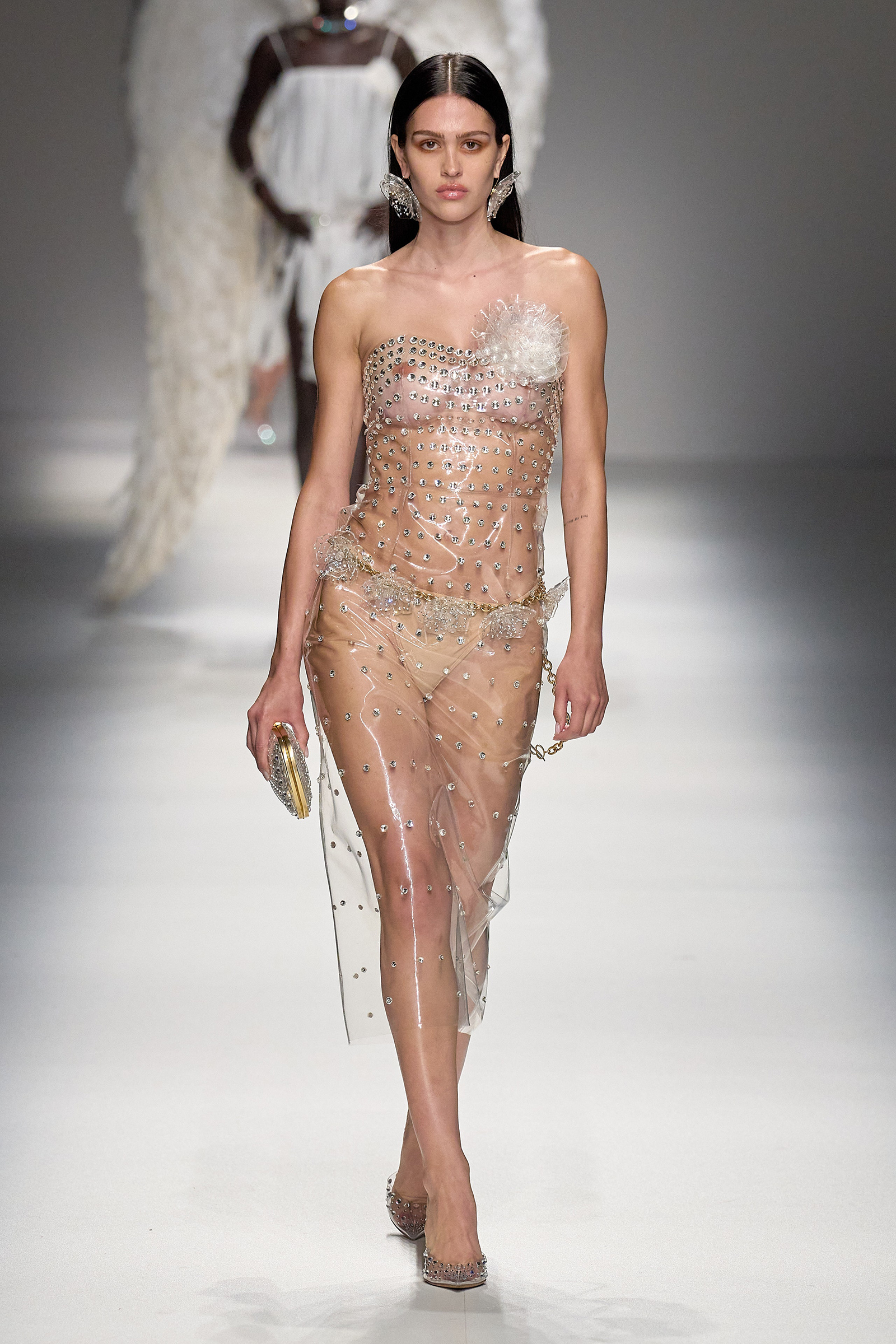 Brognano’s (rather peculiar) idea of purity and airy luminosity expanded into other literal translations: colors were pale, jerseys were flimsy like hosiery, ribbons and trains trailed breezily on the back of ultra-short sexy numbers; shiny gold leather lit up pedal pushers and corsets. Bustiers and pencil skirts in clear PVC, studded with an abundance of rhinestones and crystals, were the pinnacle of Blumarine’s ode to lightness—or better said, nakedness. They didn’t leave anything to the imagination. There’s nothing lighter than the (almost) absolute absence of clothes.