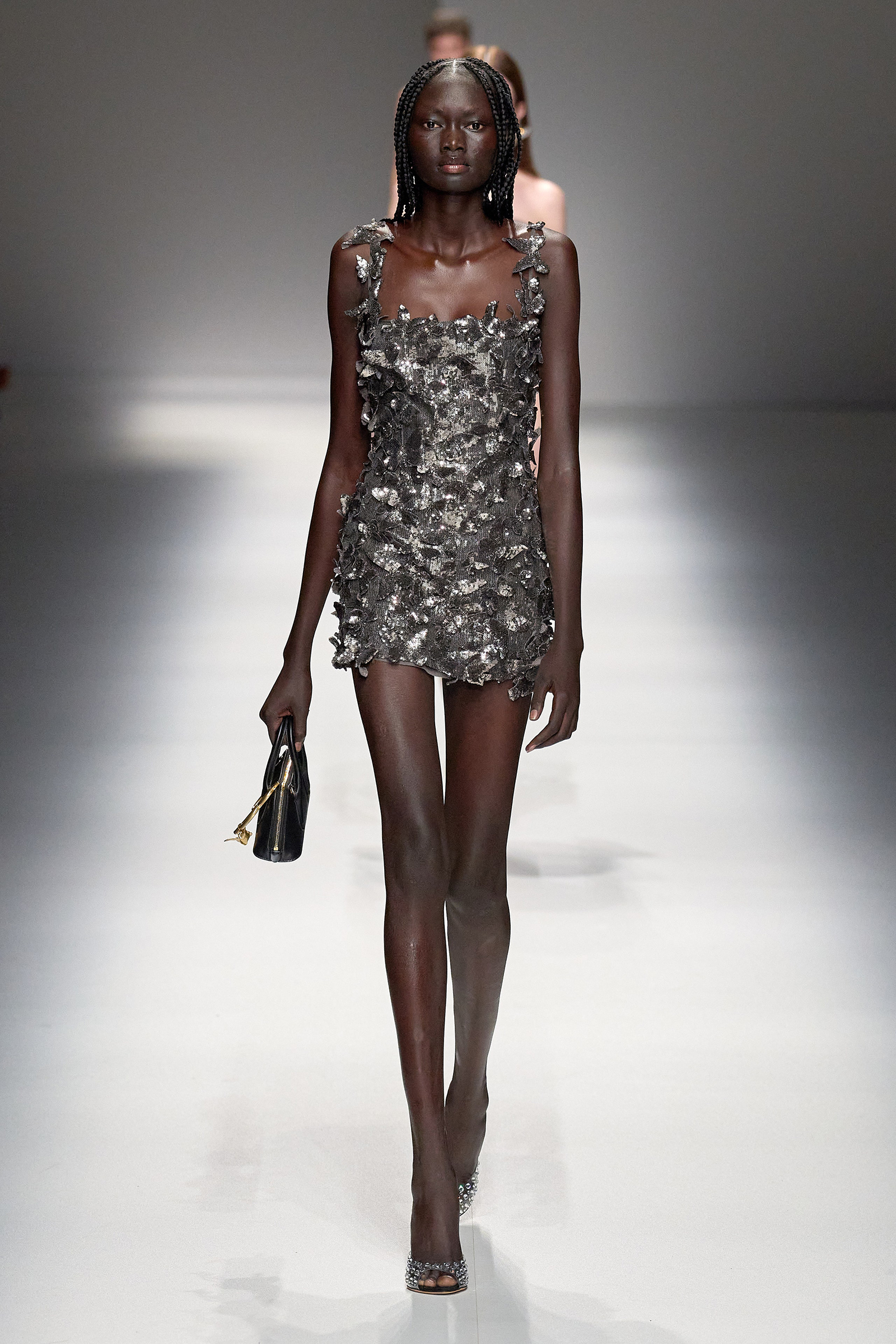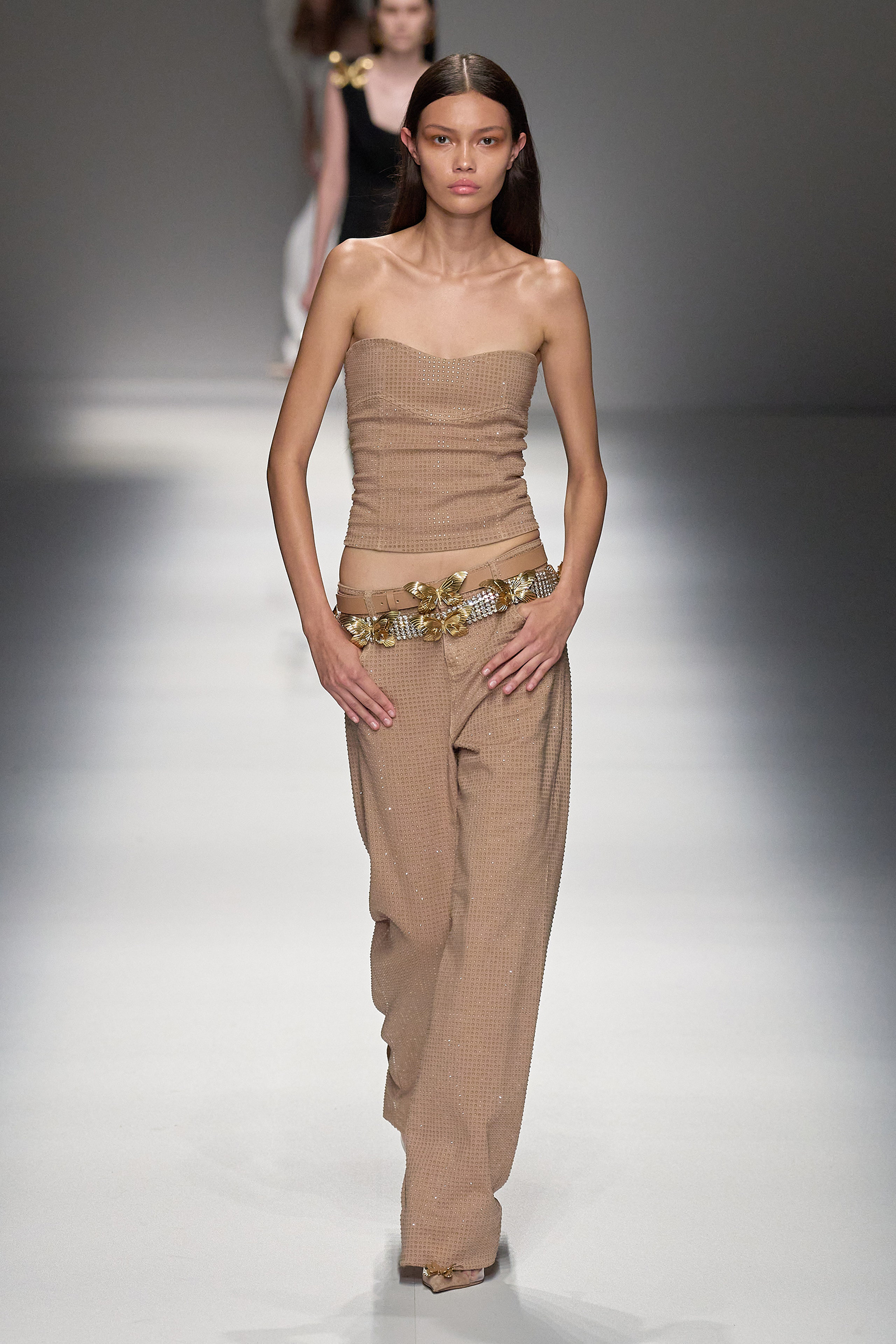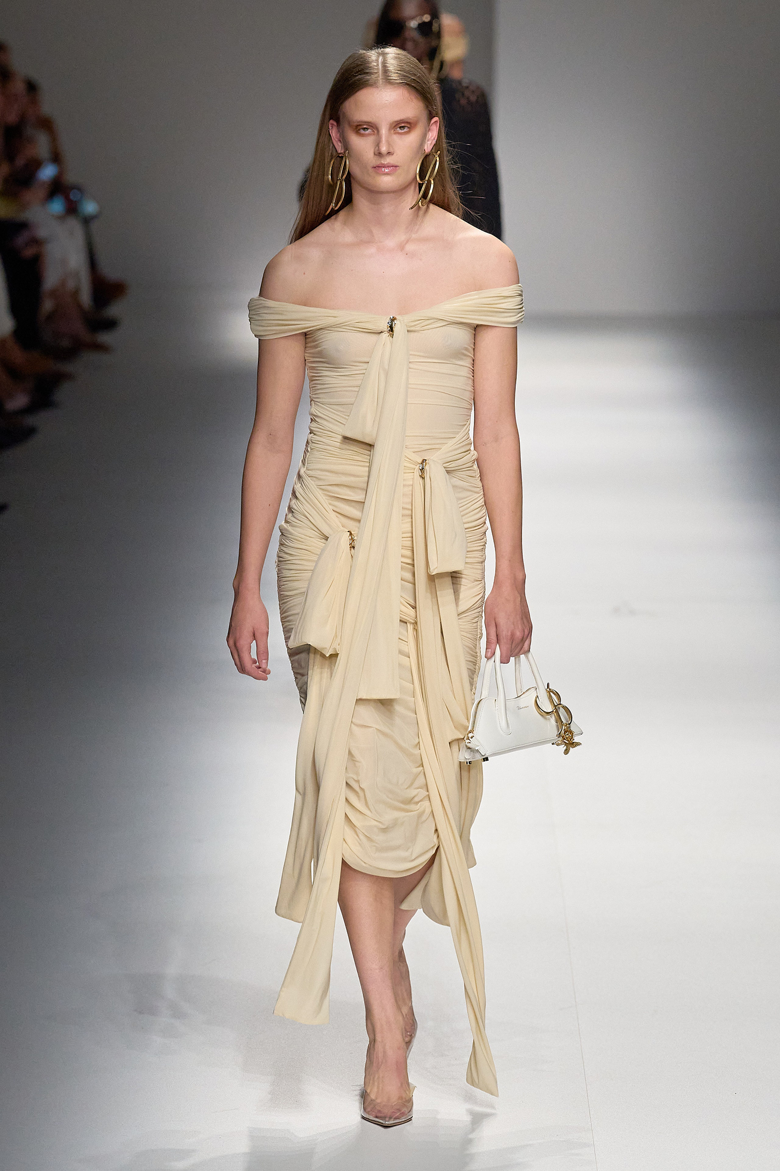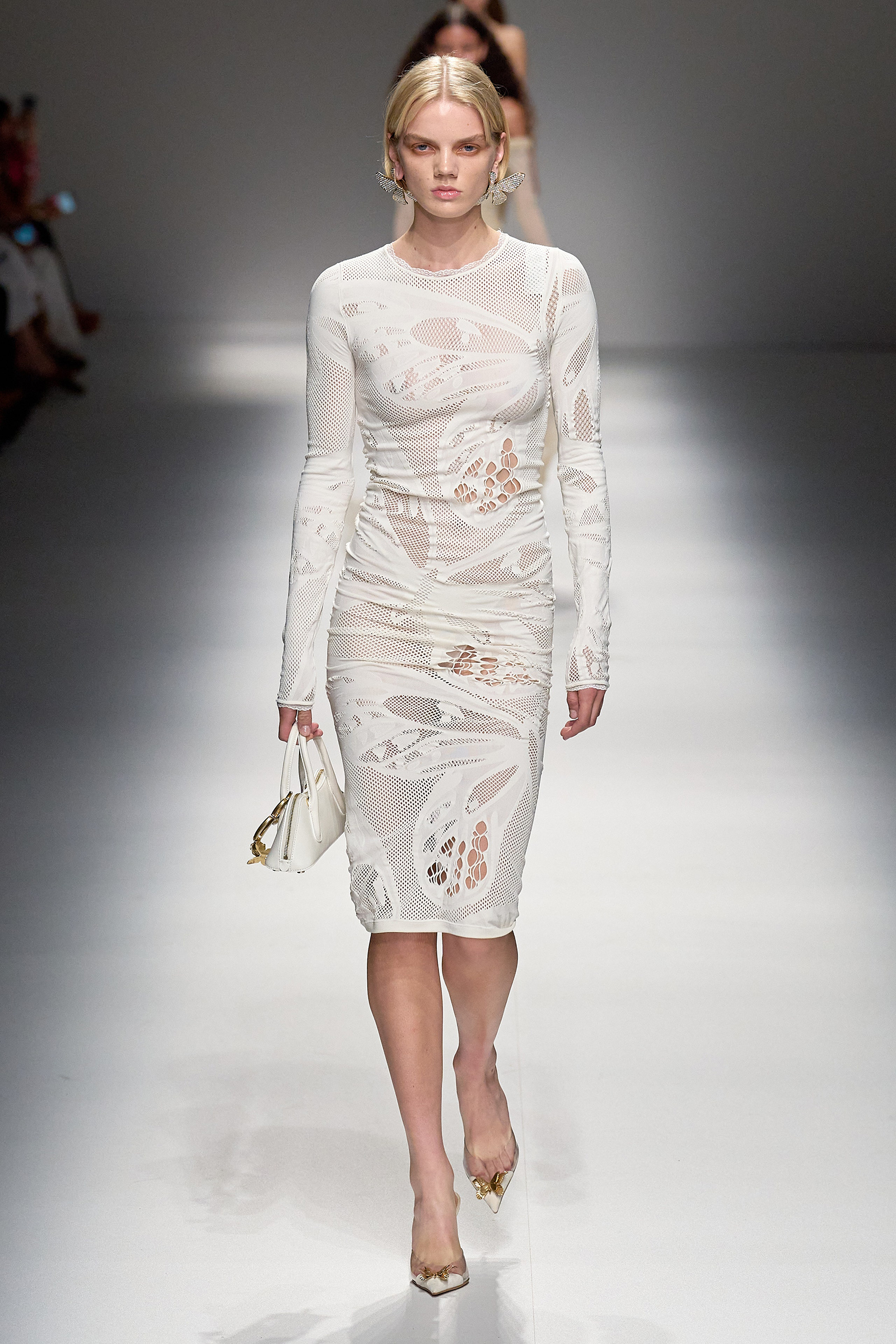 Brognano’s (rather peculiar) idea of purity and airy luminosity expanded into other literal translations: colors were pale, jerseys were flimsy like hosiery, ribbons and trains trailed breezily on the back of ultra-short sexy numbers; shiny gold leather lit up pedal pushers and corsets. Bustiers and pencil skirts in clear PVC, studded with an abundance of rhinestones and crystals, were the pinnacle of Blumarine’s ode to lightness—or better said, nakedness. They didn’t leave anything to the imagination. There’s nothing lighter than the (almost) absolute absence of clothes.