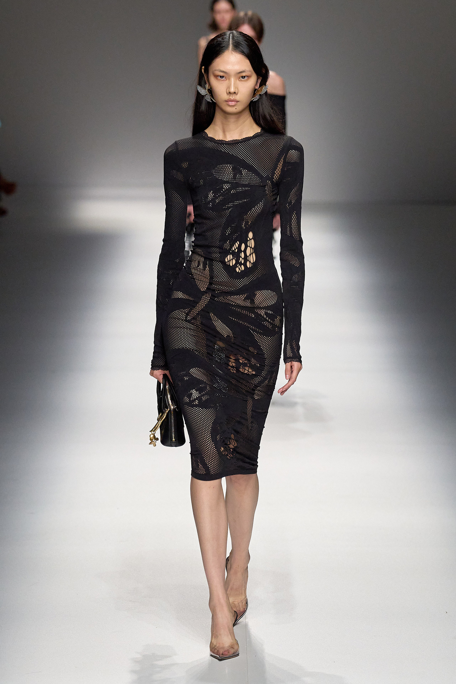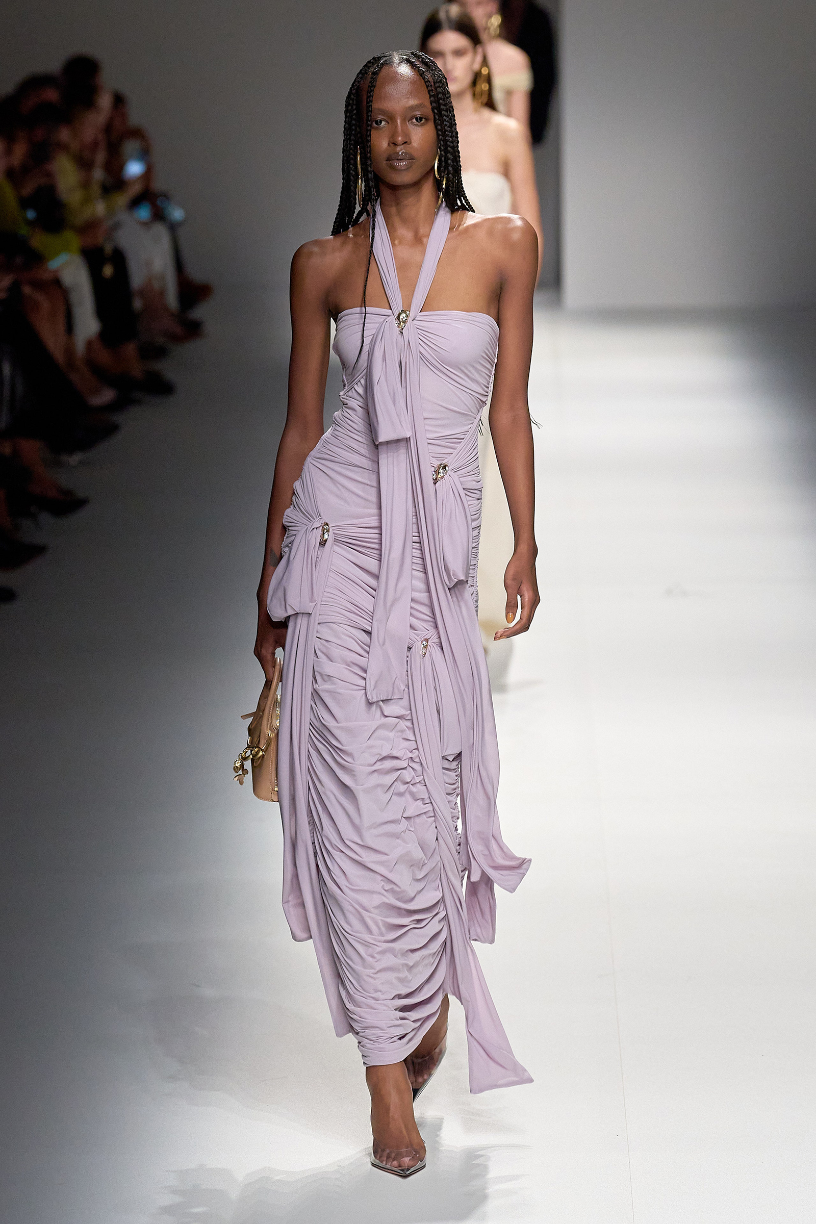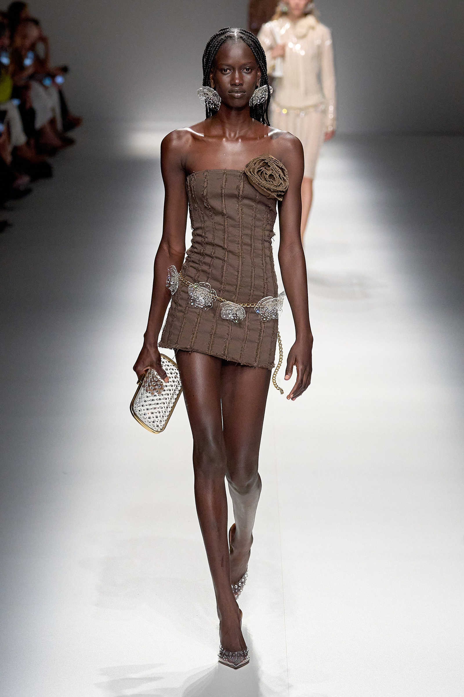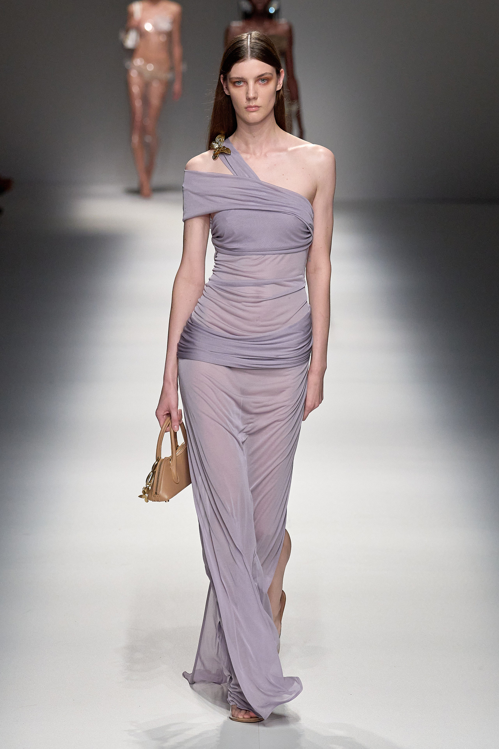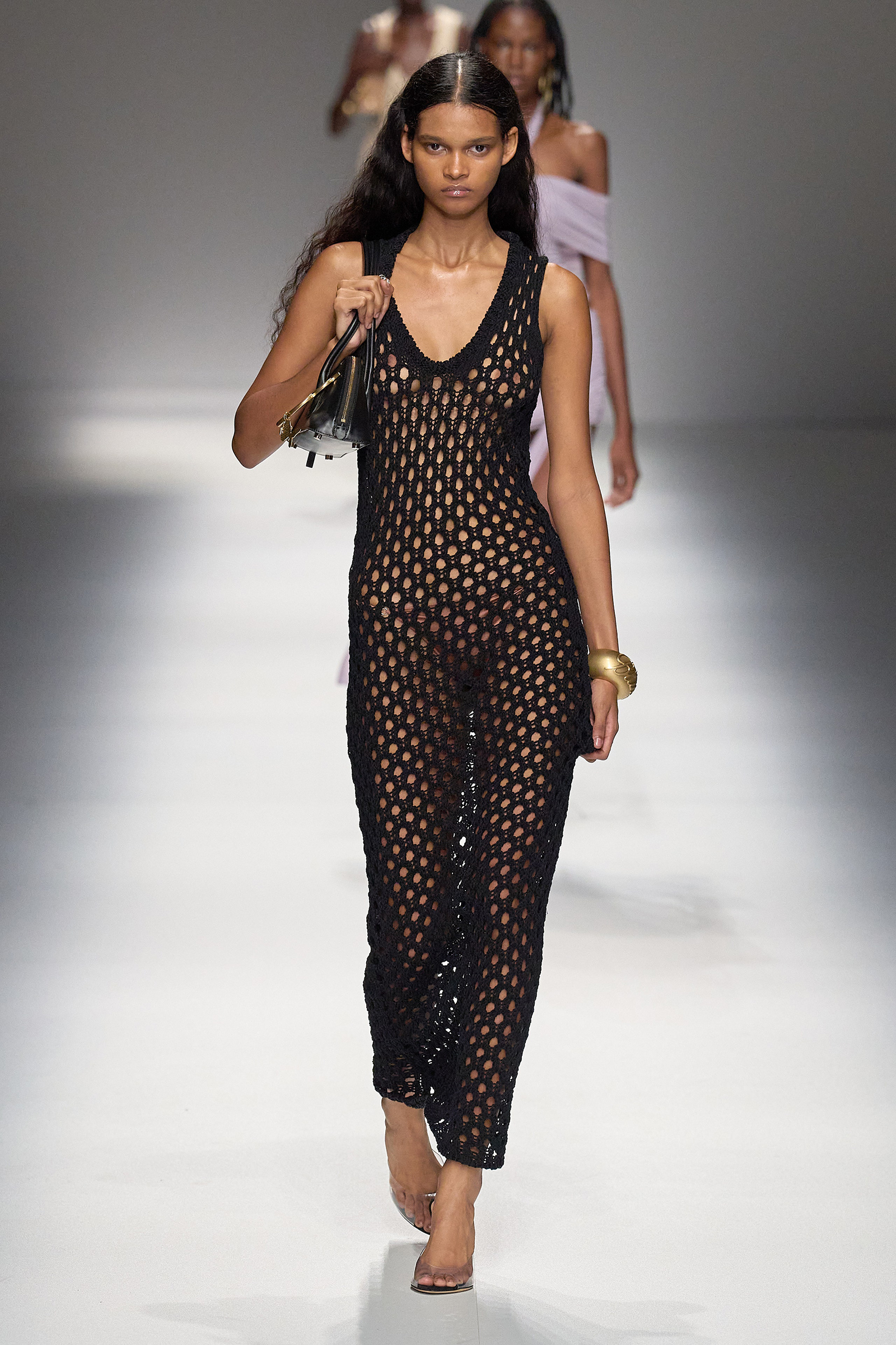 Brognano’s (rather peculiar) idea of purity and airy luminosity expanded into other literal translations: colors were pale, jerseys were flimsy like hosiery, ribbons and trains trailed breezily on the back of ultra-short sexy numbers; shiny gold leather lit up pedal pushers and corsets. Bustiers and pencil skirts in clear PVC, studded with an abundance of rhinestones and crystals, were the pinnacle of Blumarine’s ode to lightness—or better said, nakedness. They didn’t leave anything to the imagination. There’s nothing lighter than the (almost) absolute absence of clothes.