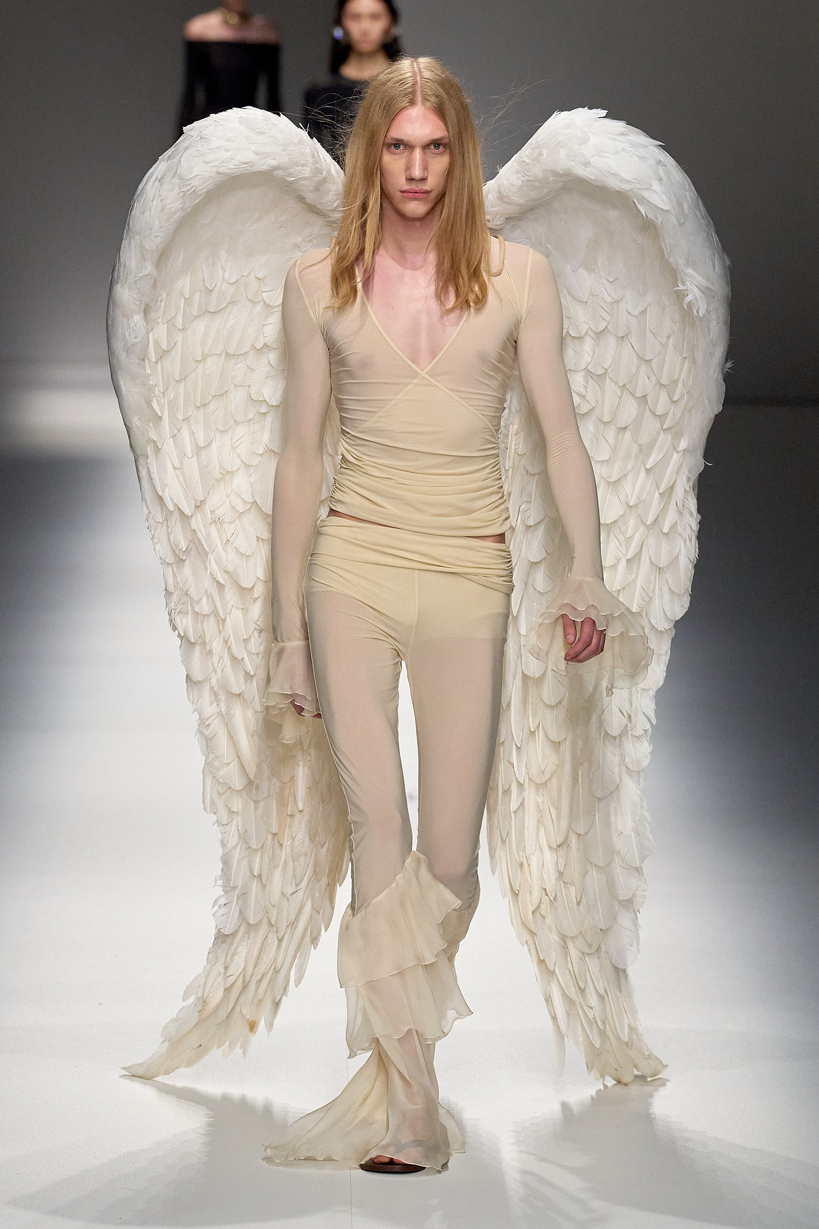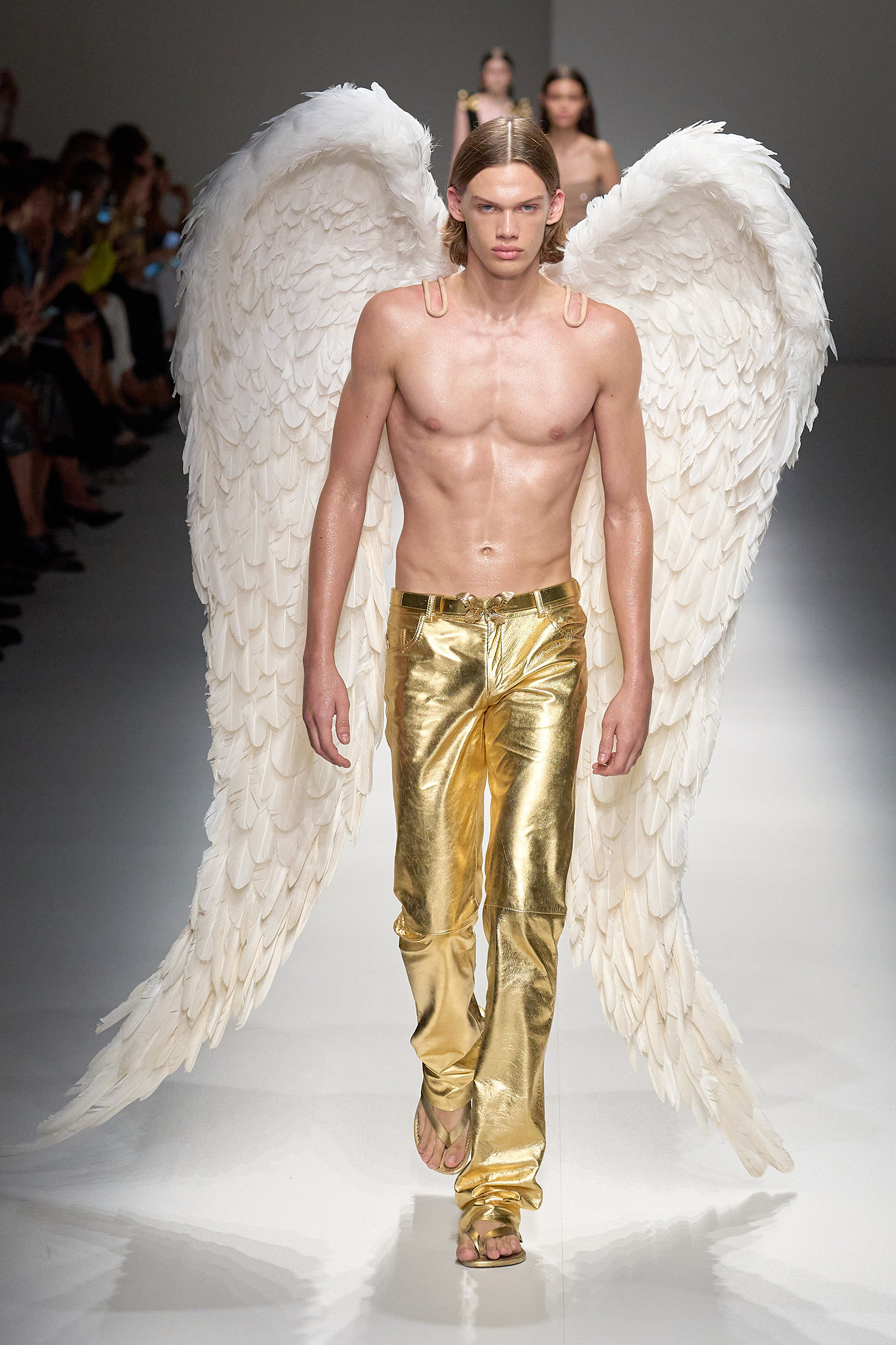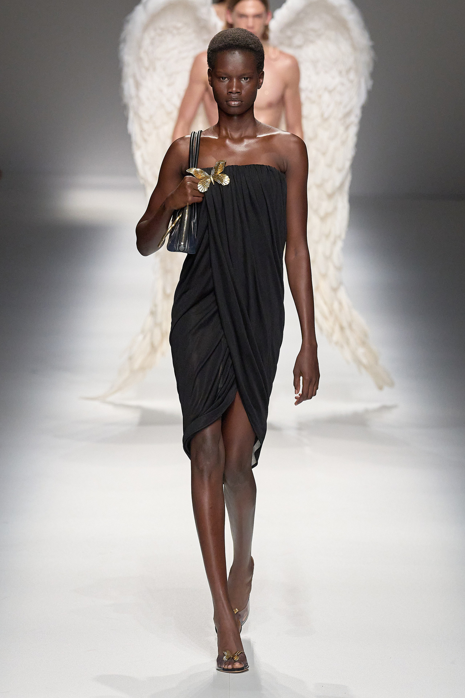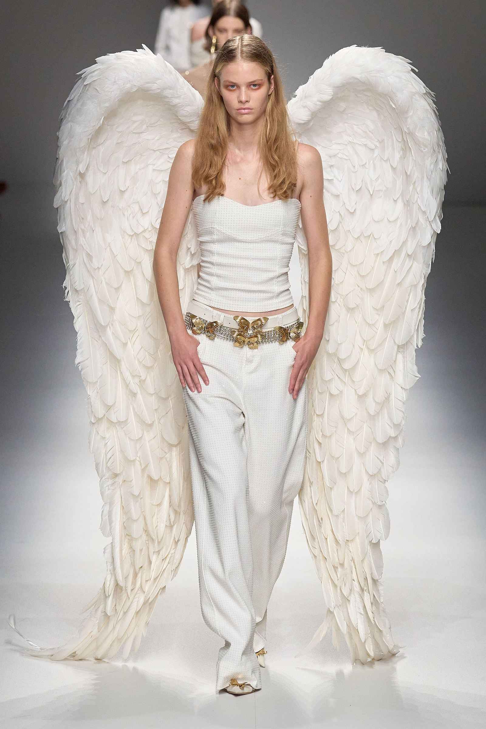 Butterflies, which in a previous collection were emblazoned on a sold-out skimpy top that was a TikTok sensations, came out in force this season, together with a parade of feathered wings à la Victoria’s Secret, making the case for Blumarine’s Lightness of Being new course. Butterflies are synonymous with frivolity. And angels, well, they’re angels. Blumarine’s were languid, lanky, handsome winged Adonises strutting down the catwalk in low-rise gold-leather trousers from which emerged smooth, naked torsos dusted with glitter—you couldn’t take the eyes off them, so lightness of thought wasn’t an option here. As for the butterflies, they seemed to have lost their impalpable, fluttering innocence, rendered as they were into heavily sequined thongs, barely covering the no-fly zone. “They’re pussy butterflies,” joked Brognano. To emphasize the concept, butterfly-shaped tiny rubber bags were part of a collaboration with a label (aptly) called For Bitches. And to make the waters even murkier, models walked to the beat of The Idol’s Lily-Rose Depp’s World Class Sinner/I’m A Freak.