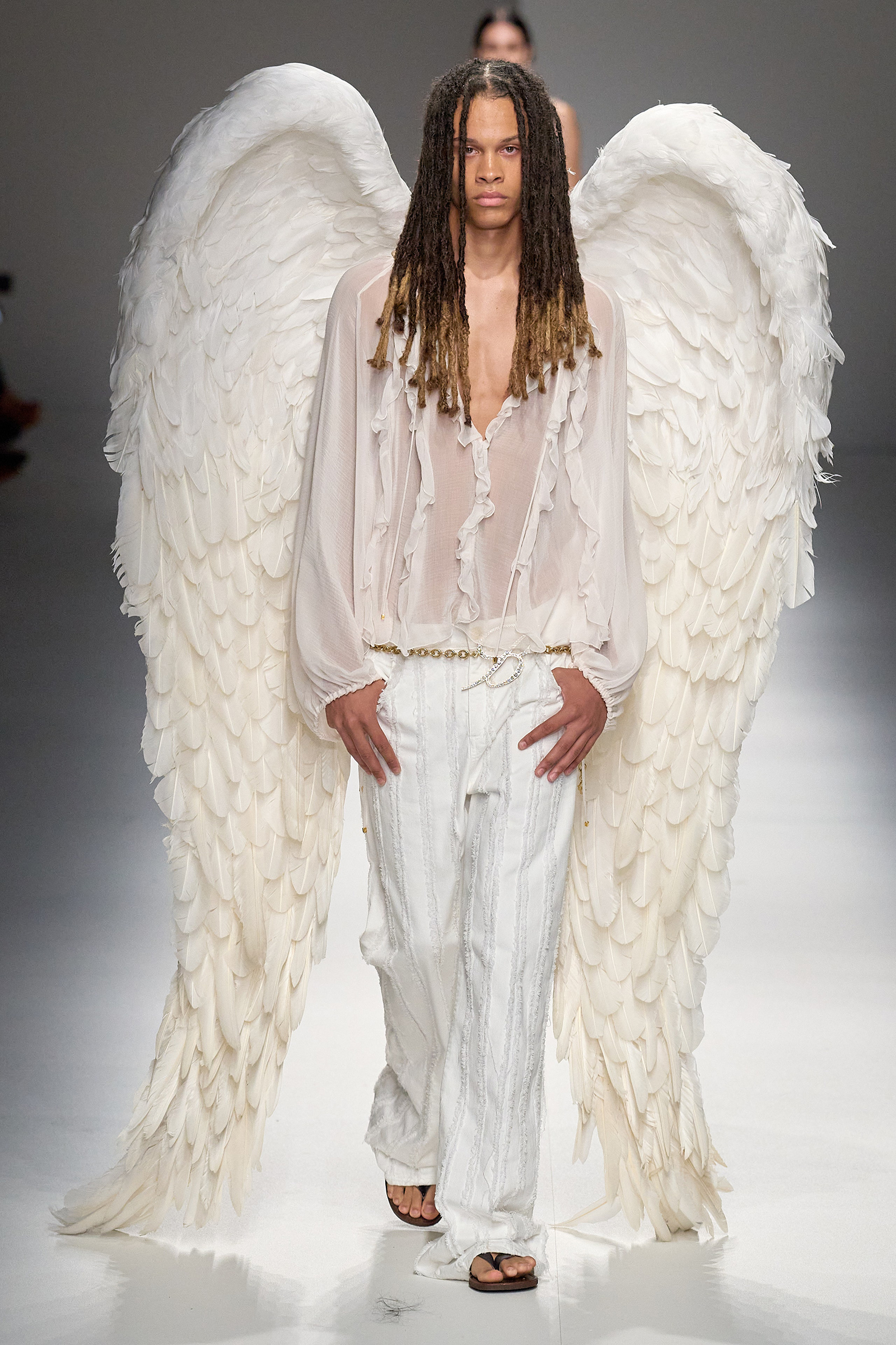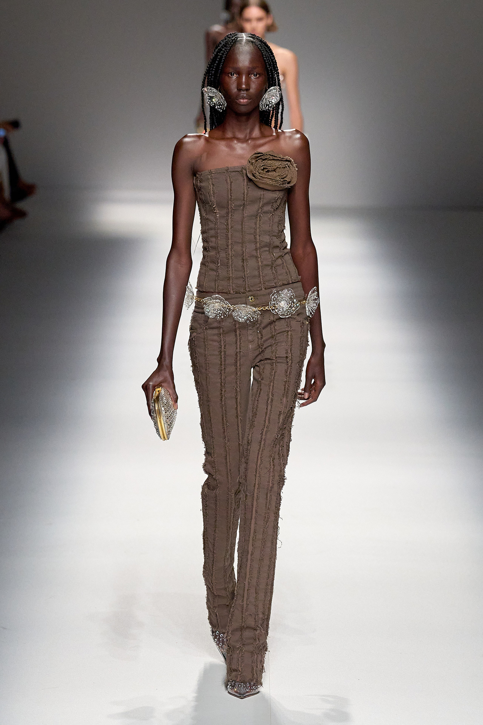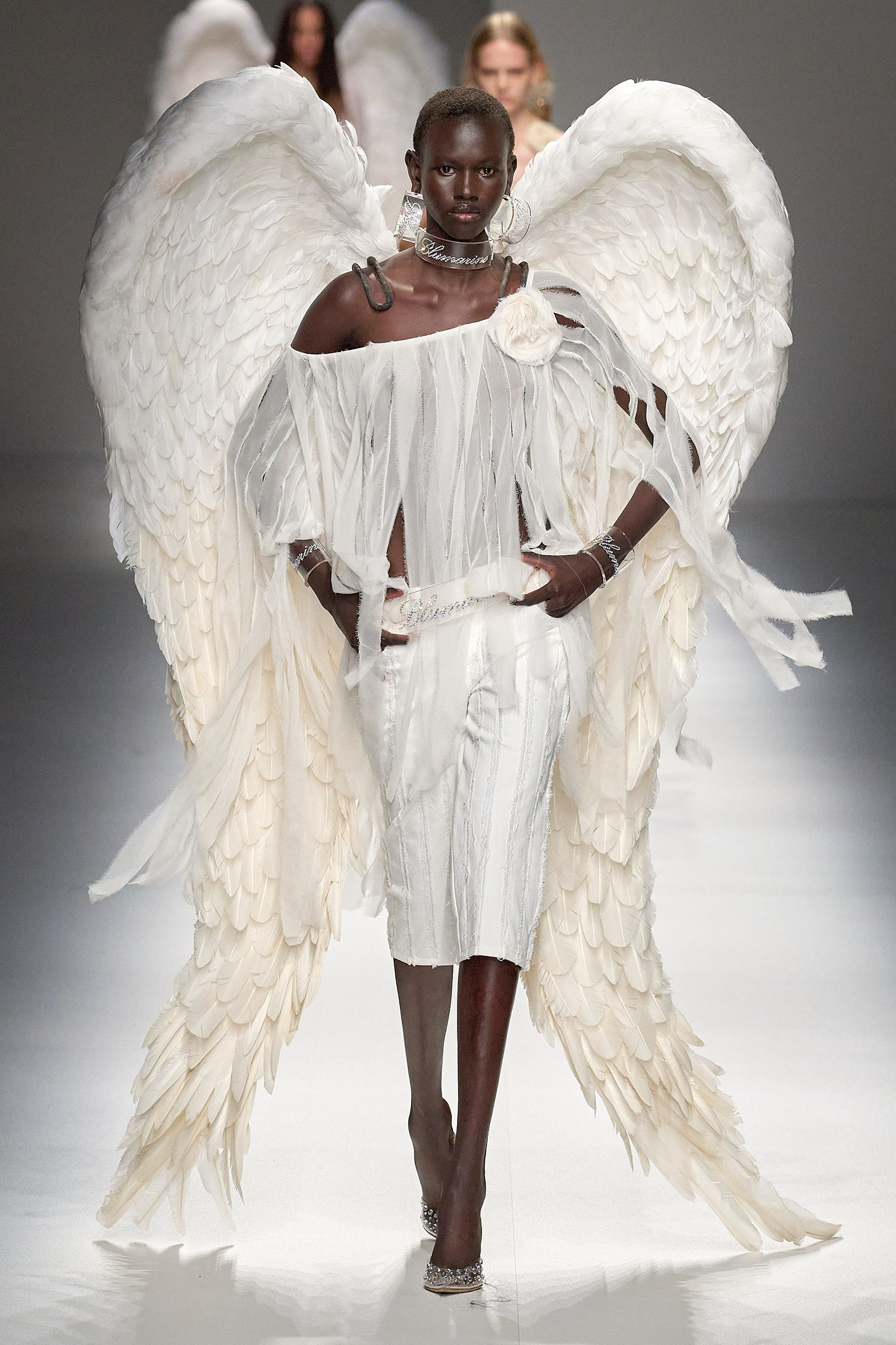 Butterflies, which in a previous collection were emblazoned on a sold-out skimpy top that was a TikTok sensations, came out in force this season, together with a parade of feathered wings à la Victoria’s Secret, making the case for Blumarine’s Lightness of Being new course. Butterflies are synonymous with frivolity. And angels, well, they’re angels. Blumarine’s were languid, lanky, handsome winged Adonises strutting down the catwalk in low-rise gold-leather trousers from which emerged smooth, naked torsos dusted with glitter—you couldn’t take the eyes off them, so lightness of thought wasn’t an option here. As for the butterflies, they seemed to have lost their impalpable, fluttering innocence, rendered as they were into heavily sequined thongs, barely covering the no-fly zone. “They’re pussy butterflies,” joked Brognano. To emphasize the concept, butterfly-shaped tiny rubber bags were part of a collaboration with a label (aptly) called For Bitches. And to make the waters even murkier, models walked to the beat of The Idol’s Lily-Rose Depp’s World Class Sinner/I’m A Freak.