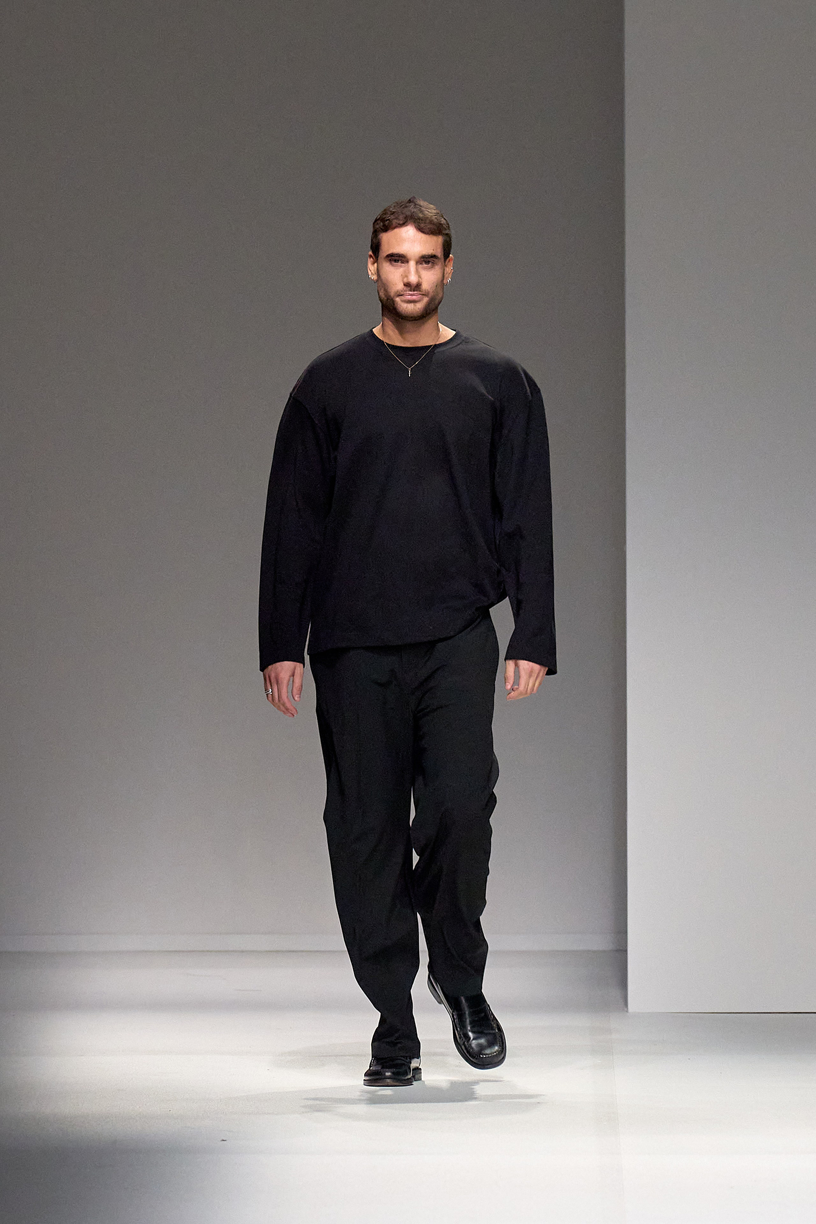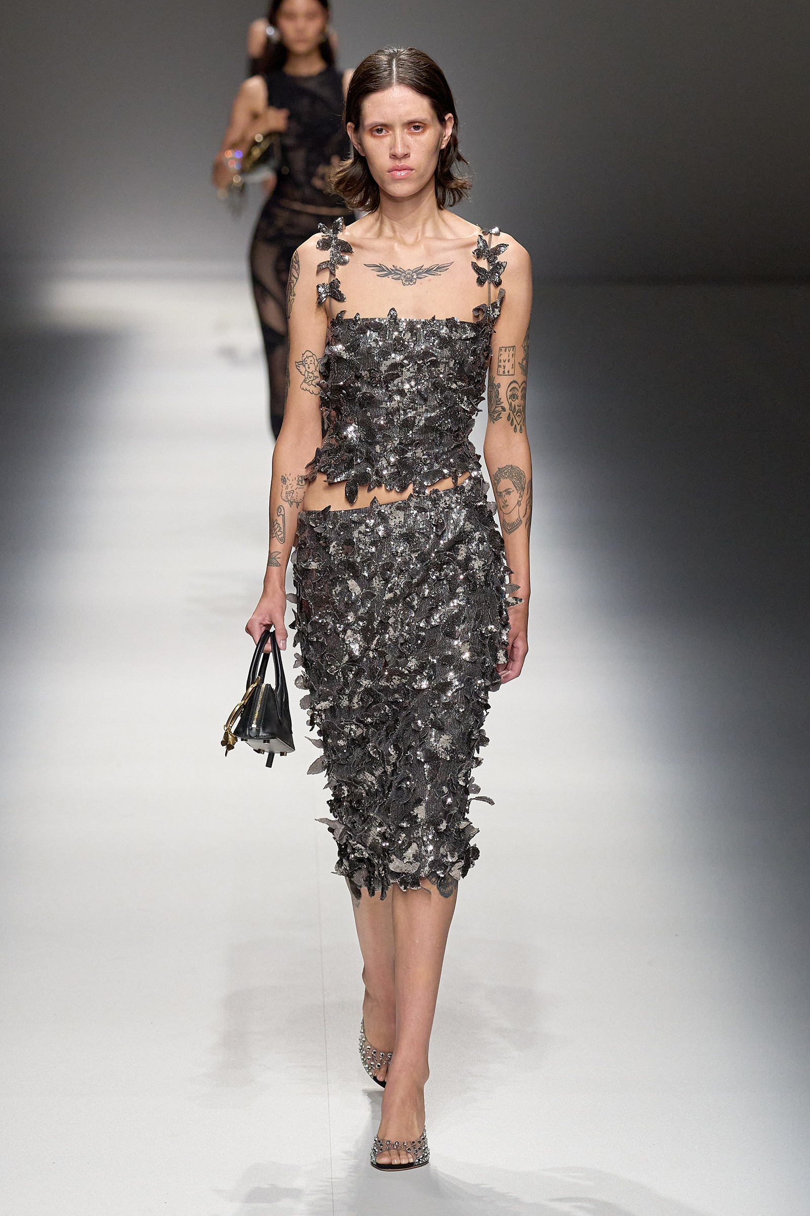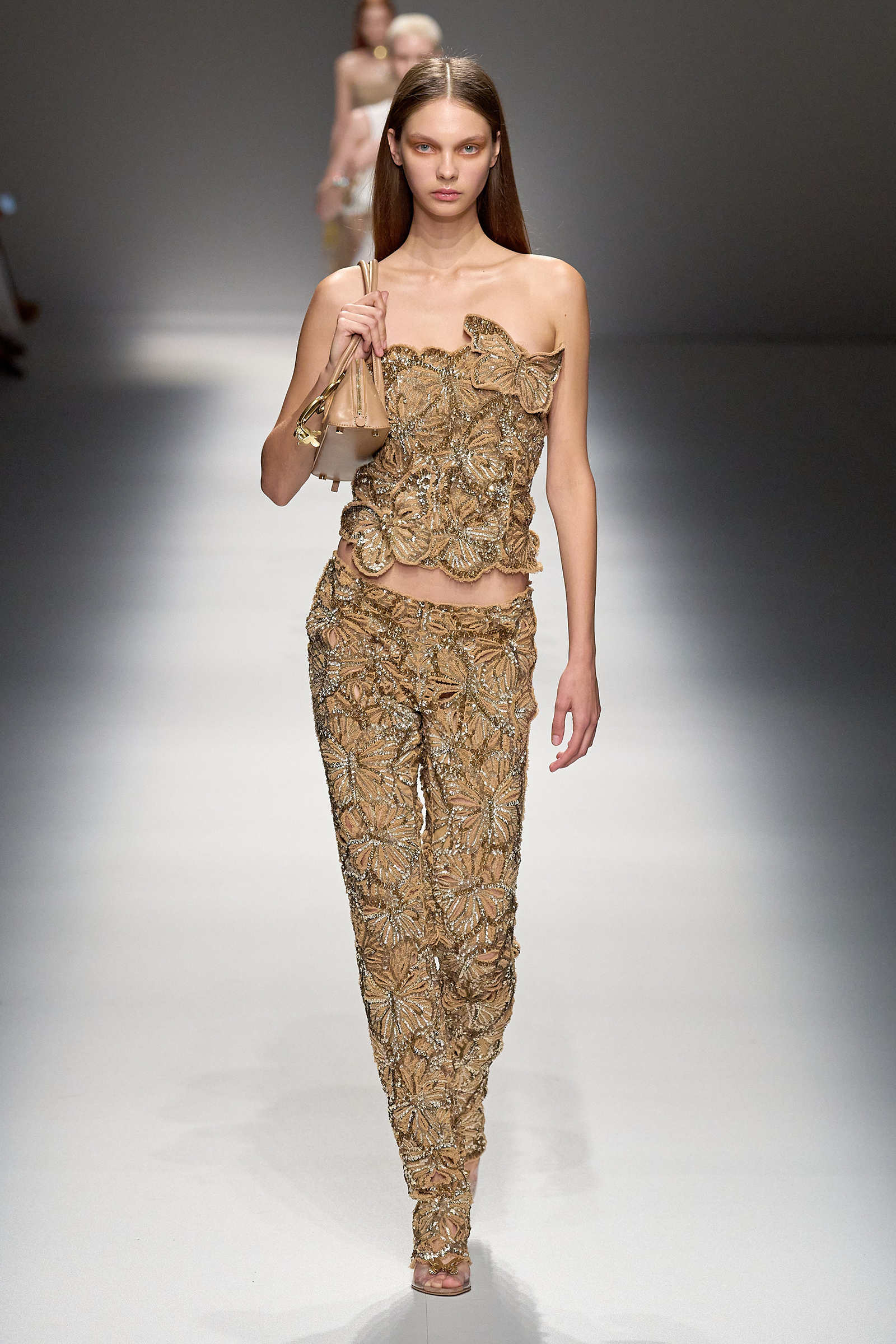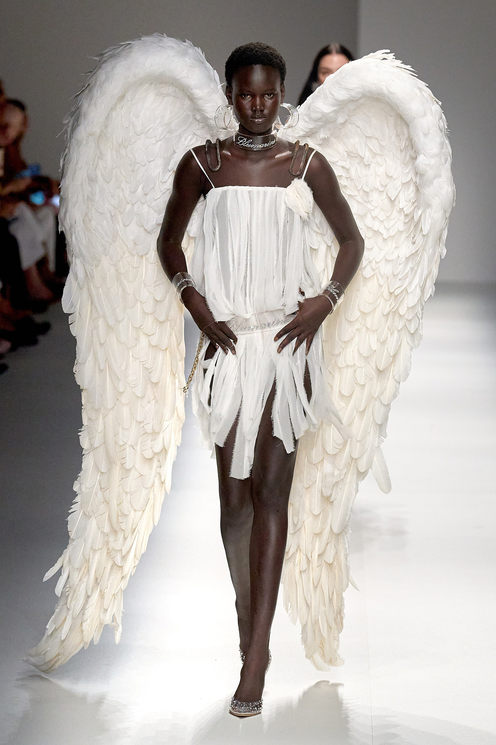 Butterflies, which in a previous collection were emblazoned on a sold-out skimpy top that was a TikTok sensations, came out in force this season, together with a parade of feathered wings à la Victoria’s Secret, making the case for Blumarine’s Lightness of Being new course. Butterflies are synonymous with frivolity. And angels, well, they’re angels. Blumarine’s were languid, lanky, handsome winged Adonises strutting down the catwalk in low-rise gold-leather trousers from which emerged smooth, naked torsos dusted with glitter—you couldn’t take the eyes off them, so lightness of thought wasn’t an option here. As for the butterflies, they seemed to have lost their impalpable, fluttering innocence, rendered as they were into heavily sequined thongs, barely covering the no-fly zone. “They’re pussy butterflies,” joked Brognano. To emphasize the concept, butterfly-shaped tiny rubber bags were part of a collaboration with a label (aptly) called For Bitches. And to make the waters even murkier, models walked to the beat of The Idol’s Lily-Rose Depp’s World Class Sinner/I’m A Freak.