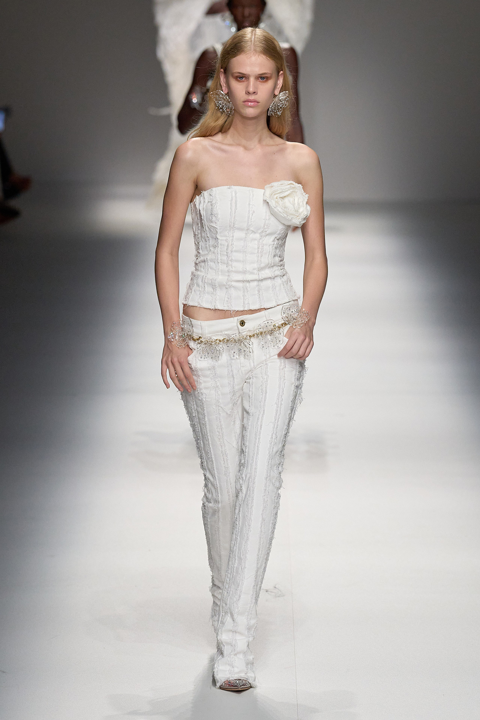 Blumarine’s show space today was an immaculate white box. Gone were the mounds of sand and blazing pyres of the Joan of Arc collection, or the dark underworld where livid mermaids were circling around heaps of broken shells. Or the red Lamborghini smacked in the middle of a catwalk surrounded by sashaying skimpy pink Barbies that were “resurrected from their dusty boxes,” as Nicola Brognano put it. Had Blumarine mutated its genes and gone minimal? “No,” was his answer. “I just felt it was time for more light, more lightness, more butterflies.”