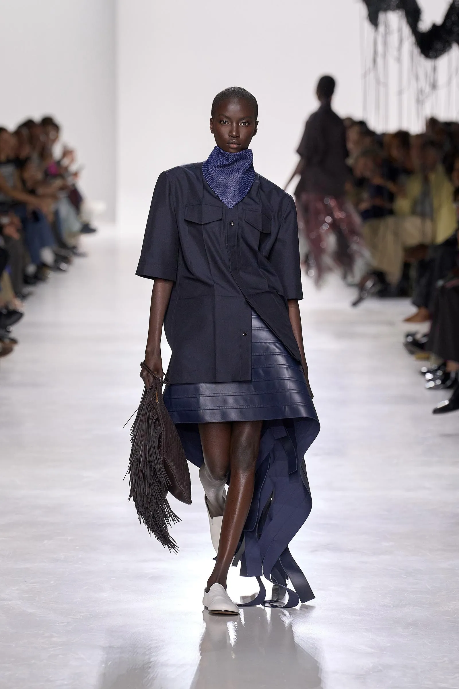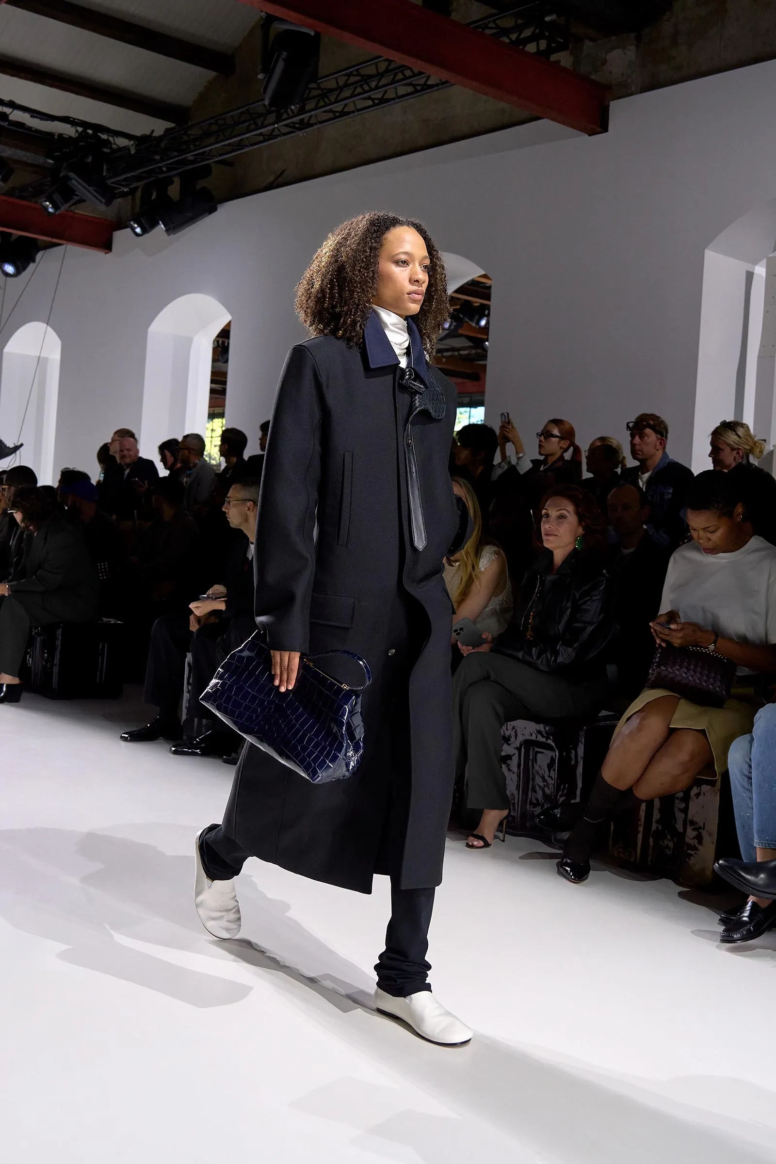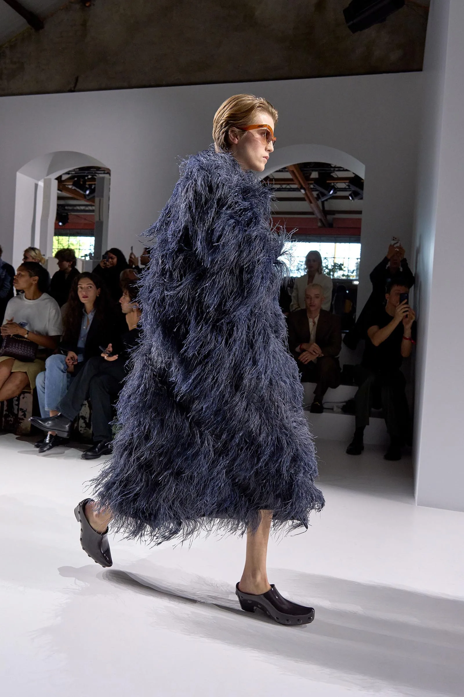 The collection did seem to suggest that she’s been reveling in her newfound situation—only less like a kid with a hand in the candy box, and more like a grown-up who knows exactly how good she’s got it. Bottega Veneta’s USP is its dedication to craft, and Trotter put it to work for her: weaving an intrecciato tailored coat so it looked like snake scales, using superfine strips of leather for a dramatic floor-length intrecciato cape, and adding feathers to a denim blue intrecciato robe coat so that it seemed to float down the runway.