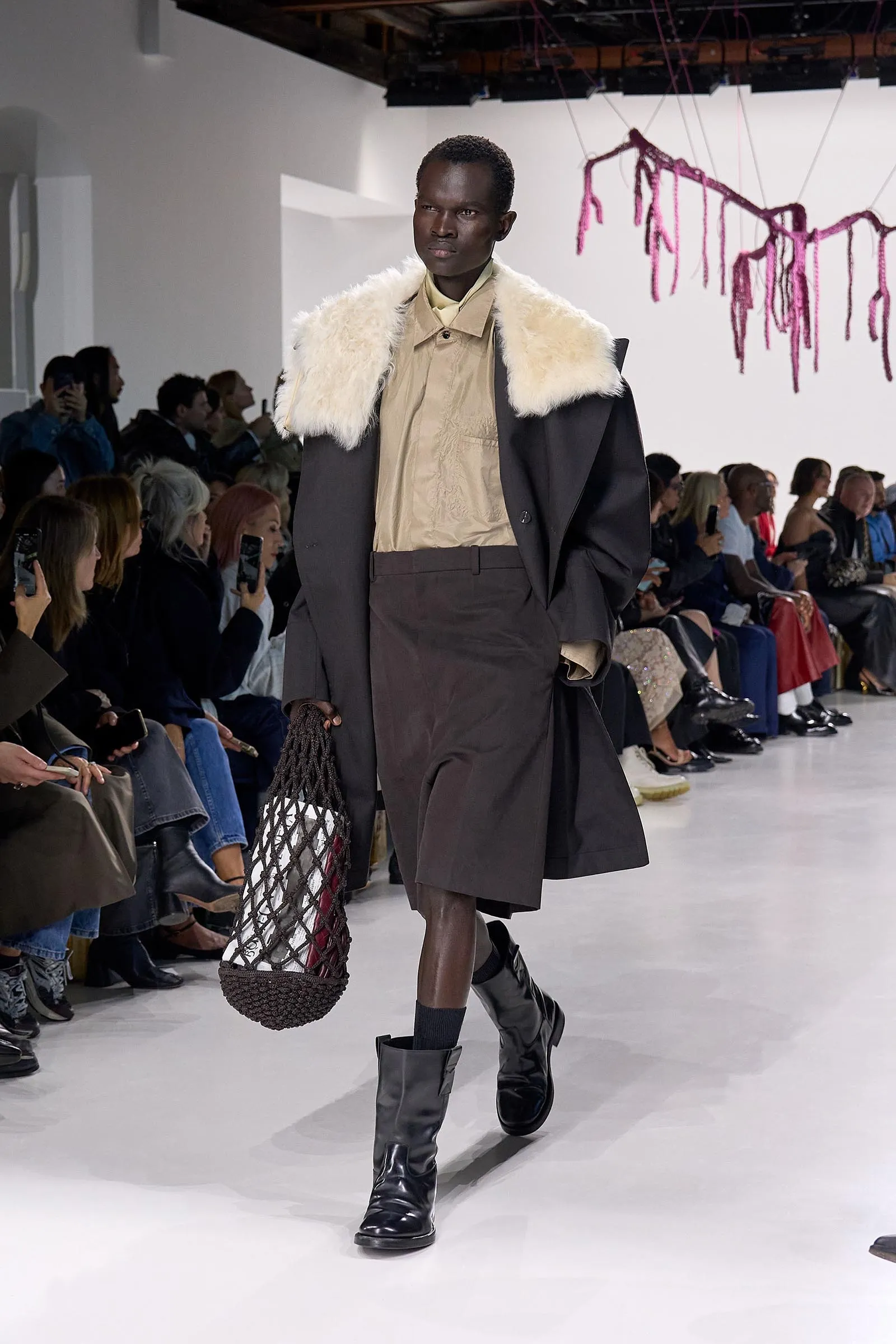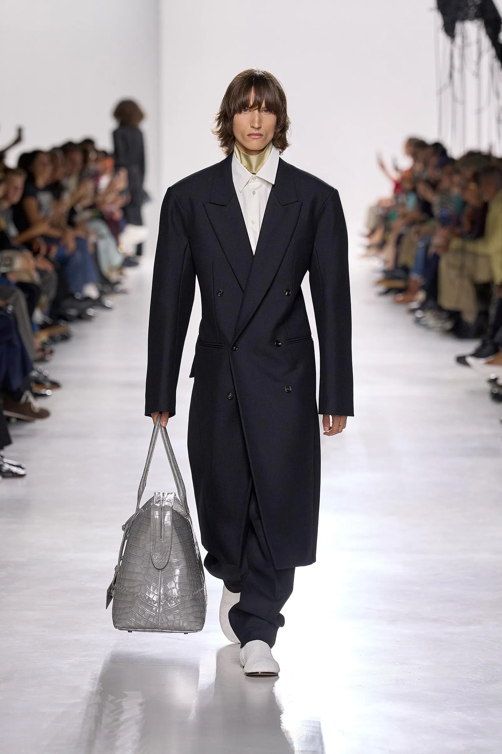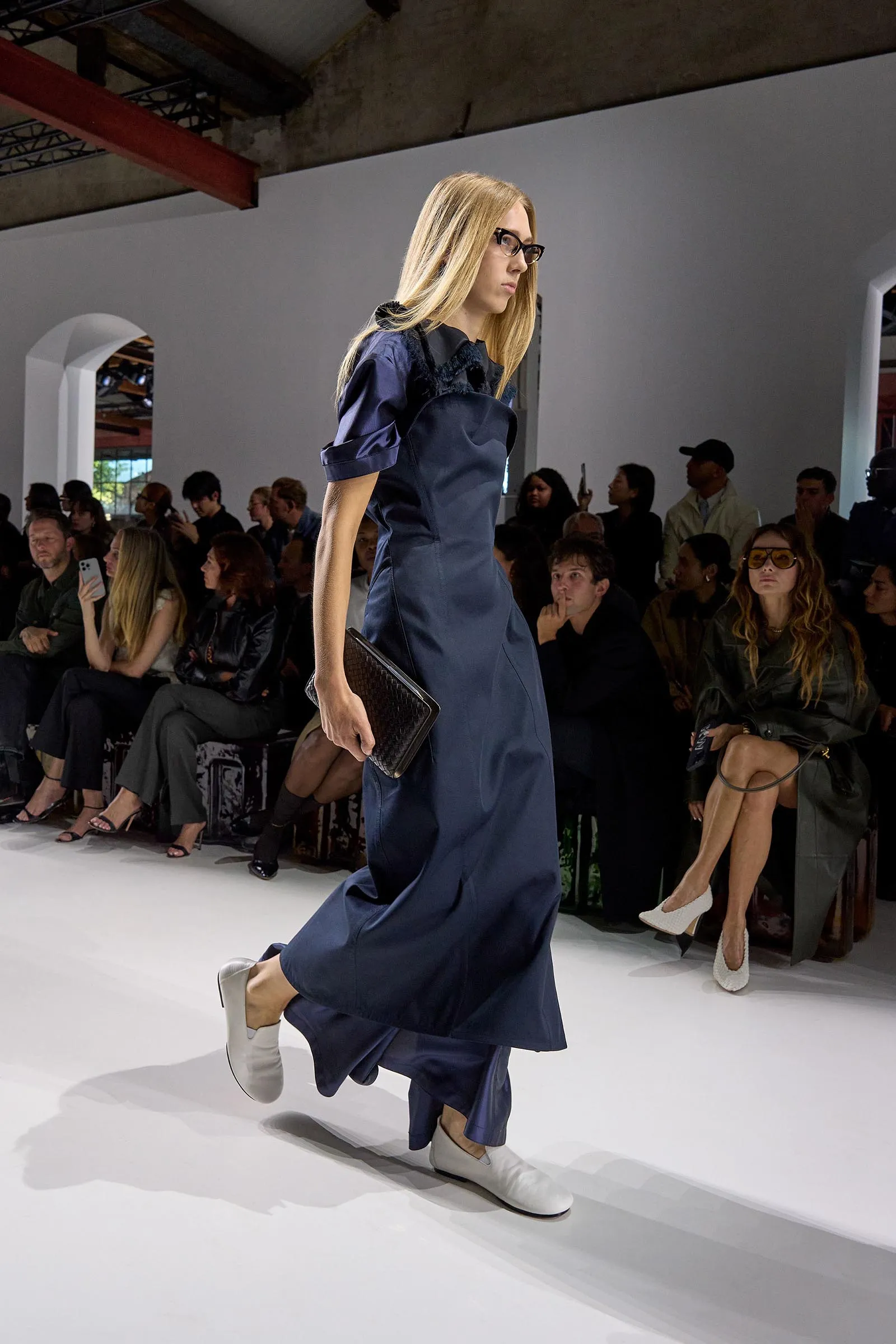 The collection did seem to suggest that she’s been reveling in her newfound situation—only less like a kid with a hand in the candy box, and more like a grown-up who knows exactly how good she’s got it. Bottega Veneta’s USP is its dedication to craft, and Trotter put it to work for her: weaving an intrecciato tailored coat so it looked like snake scales, using superfine strips of leather for a dramatic floor-length intrecciato cape, and adding feathers to a denim blue intrecciato robe coat so that it seemed to float down the runway.