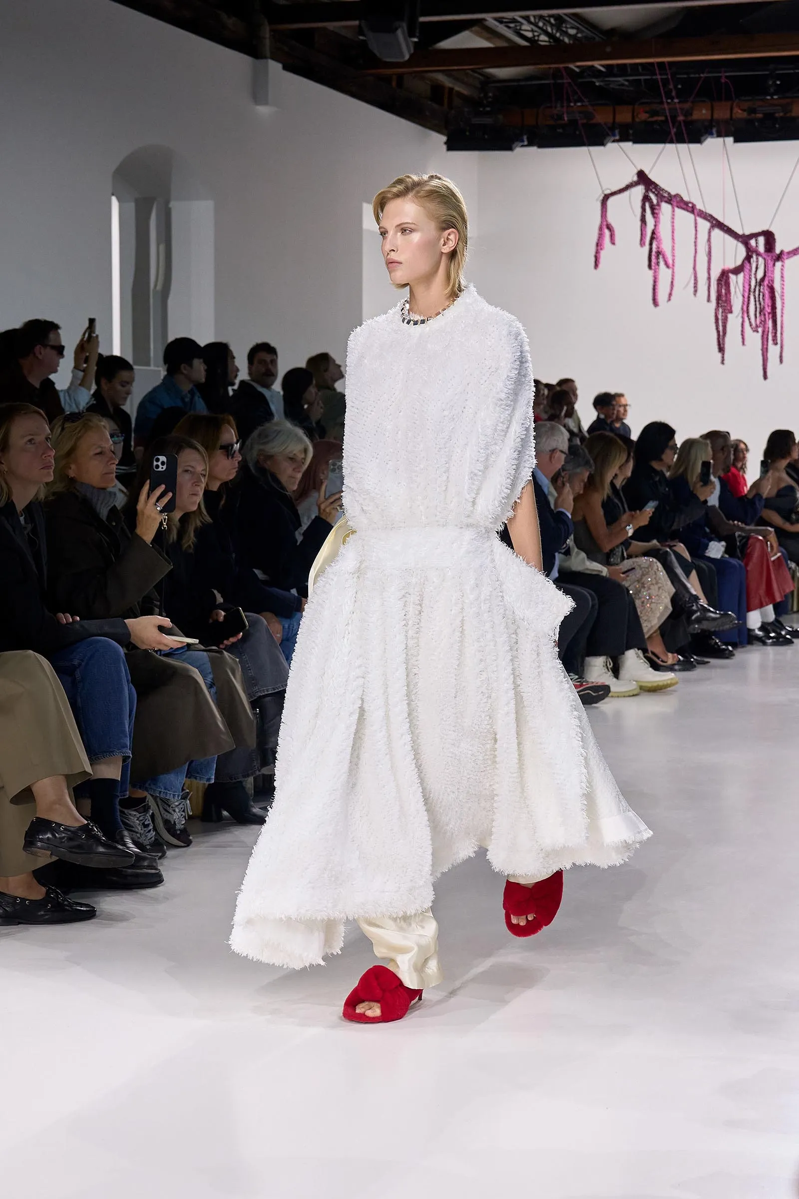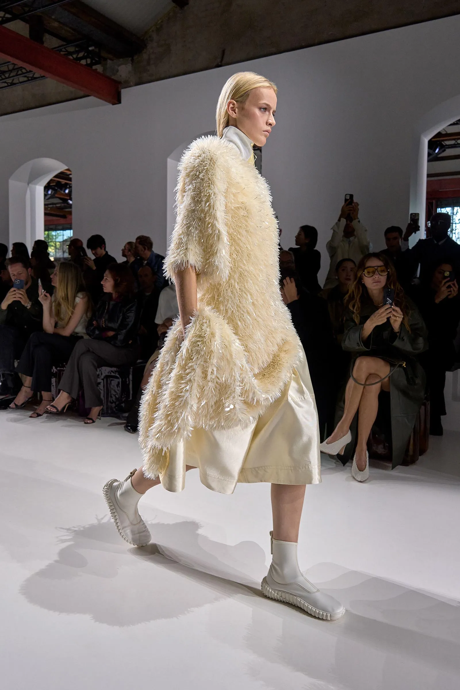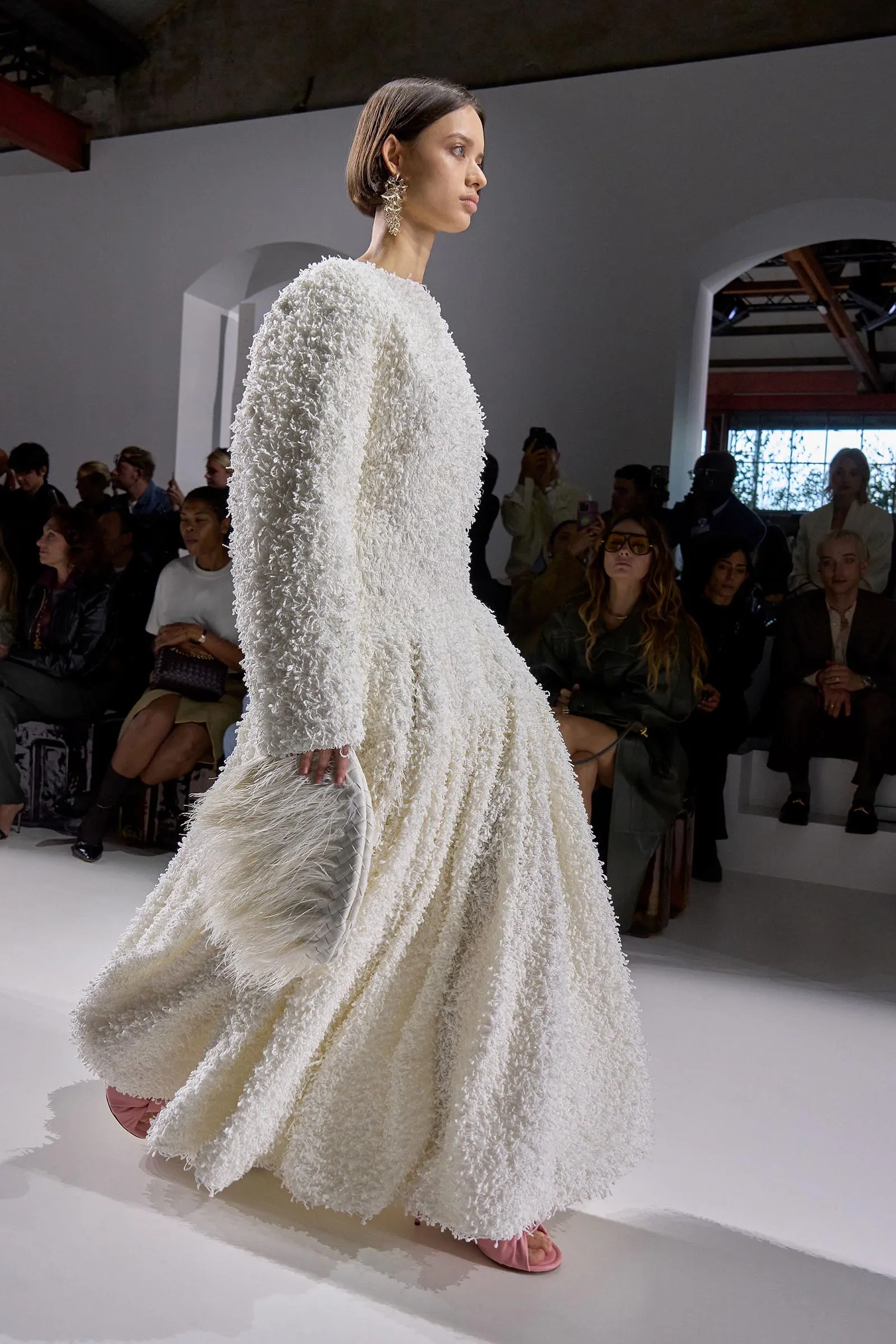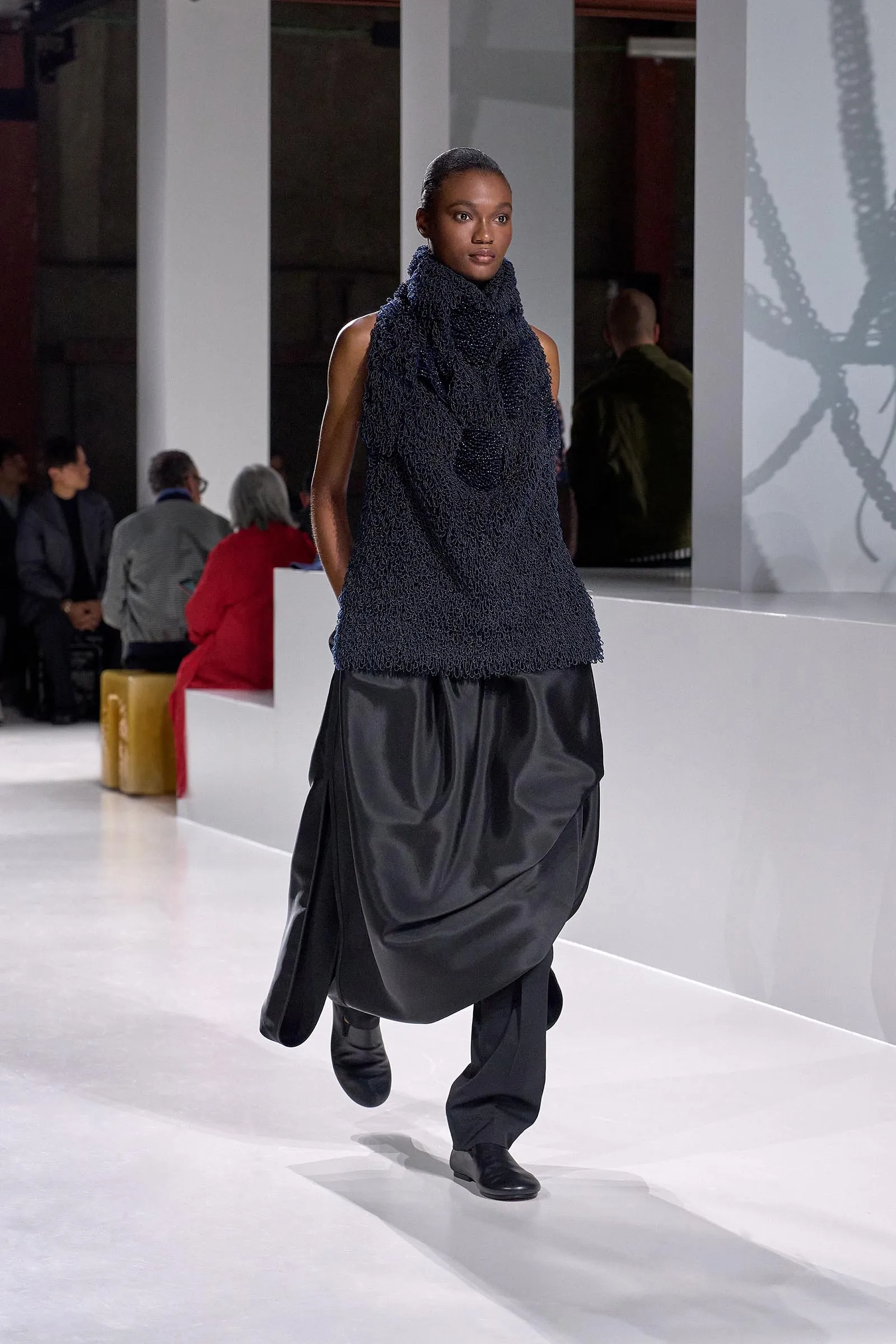 Movement was a defining feature of the collection, whether it was the trailing ends of a skirt constructed from a tier of leather bands or the fringes tracing the side seam of a micro-pleated dress. Most astounding were the “sweaters” in bright shades of orange, red, and silver-blue that shifted and gleamed under the lights. The material? Recycled fiberglass. “It has the feeling of fur and it moves like glass,” Trotter said. “And it’s been tailored and constructed so it follows where you normally have a shoulder line.” Skirts in the same stuff came in swirling ombré colors.