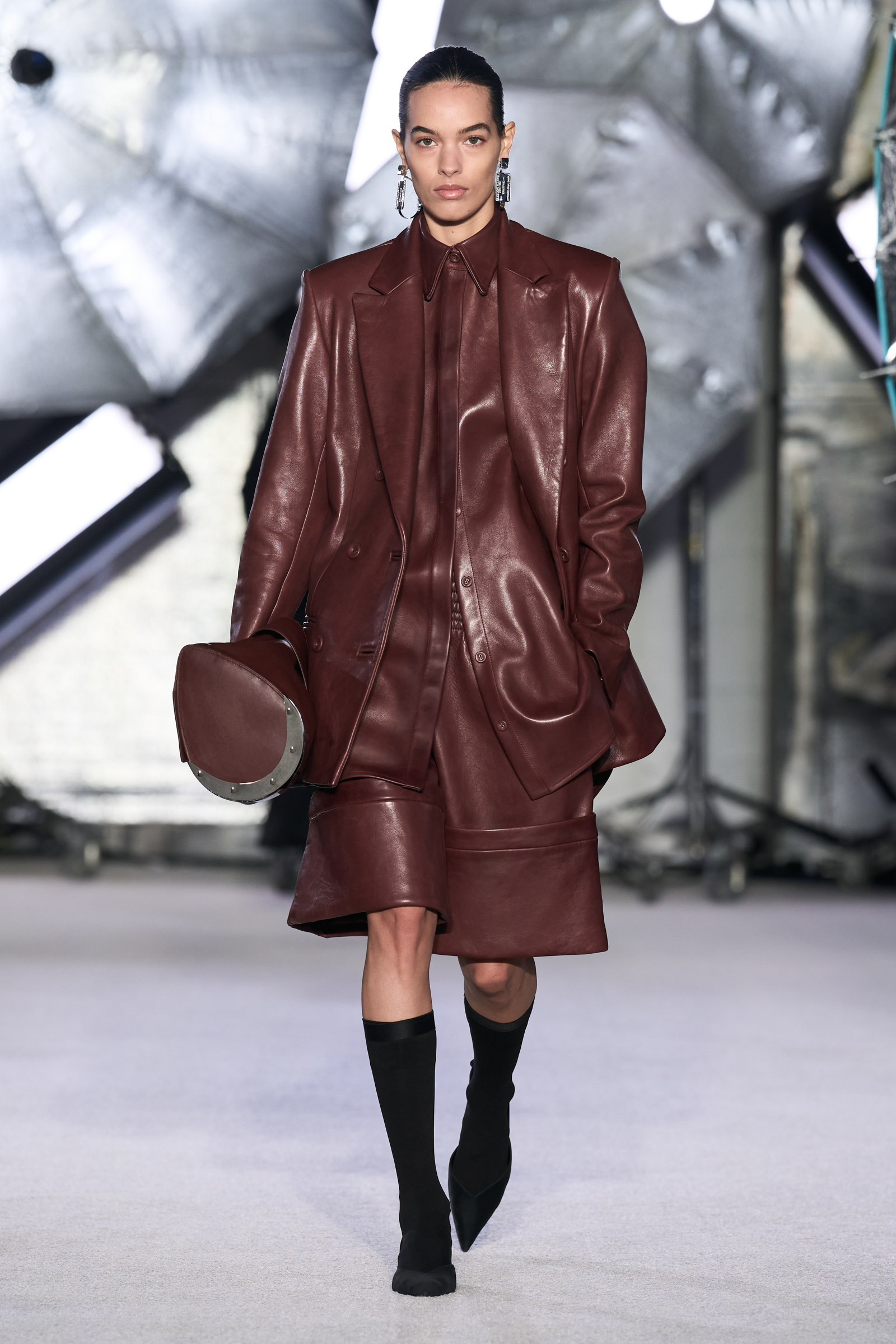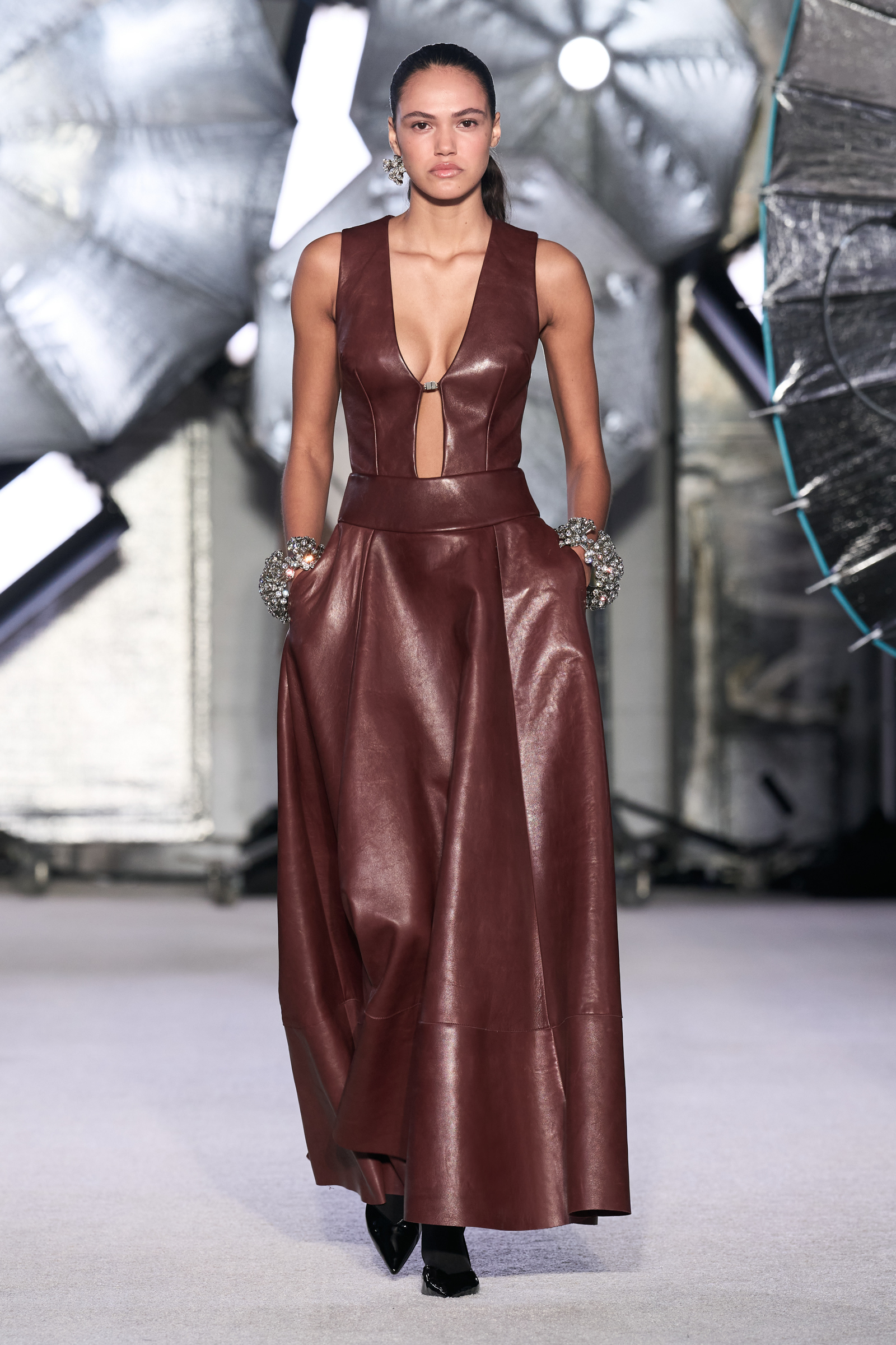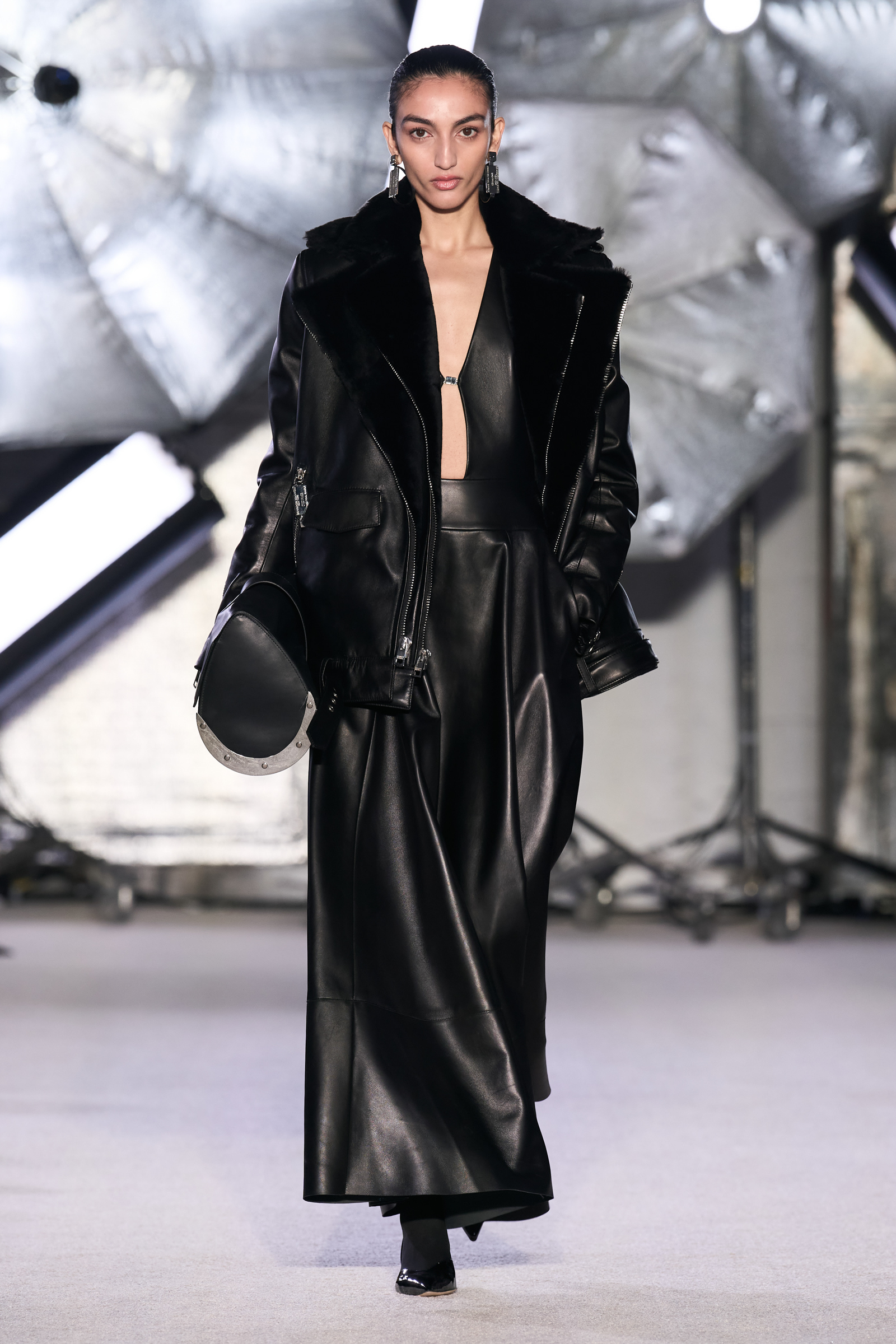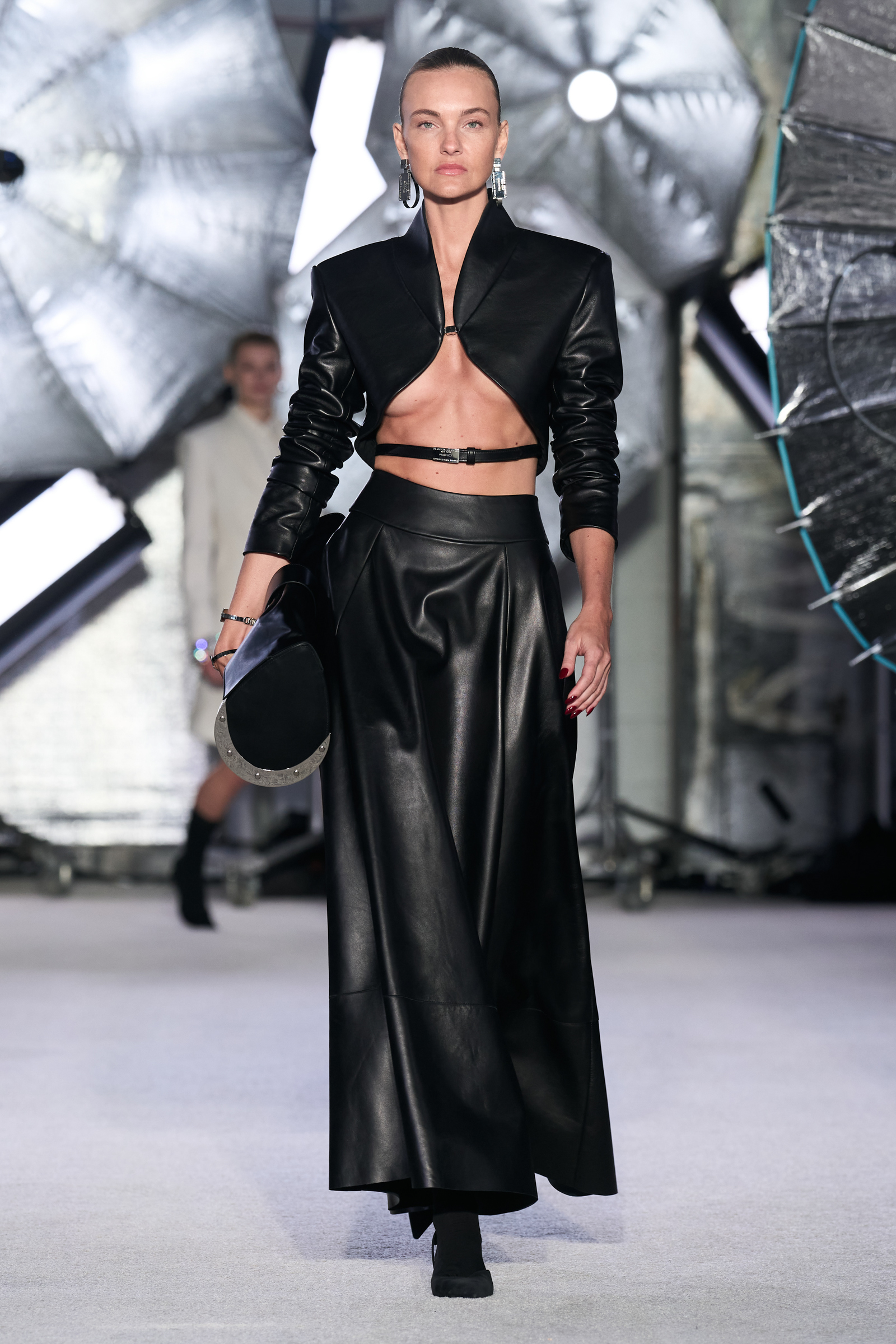On the tailoring front, he broke convention, pairing trad jackets with deeply cuffed shorts featuring elasticated waists. Cara Taylor opened and closed the show in black and white versions of the playful look. Leather was everywhere, from a shirt, maxi skirt, and bandeau top combo, to a plunge front dress held together under the bust with chrome hardware, that repeated on the jewelry. Maxwell called out an understated black wool shirt dress as his favorite piece.