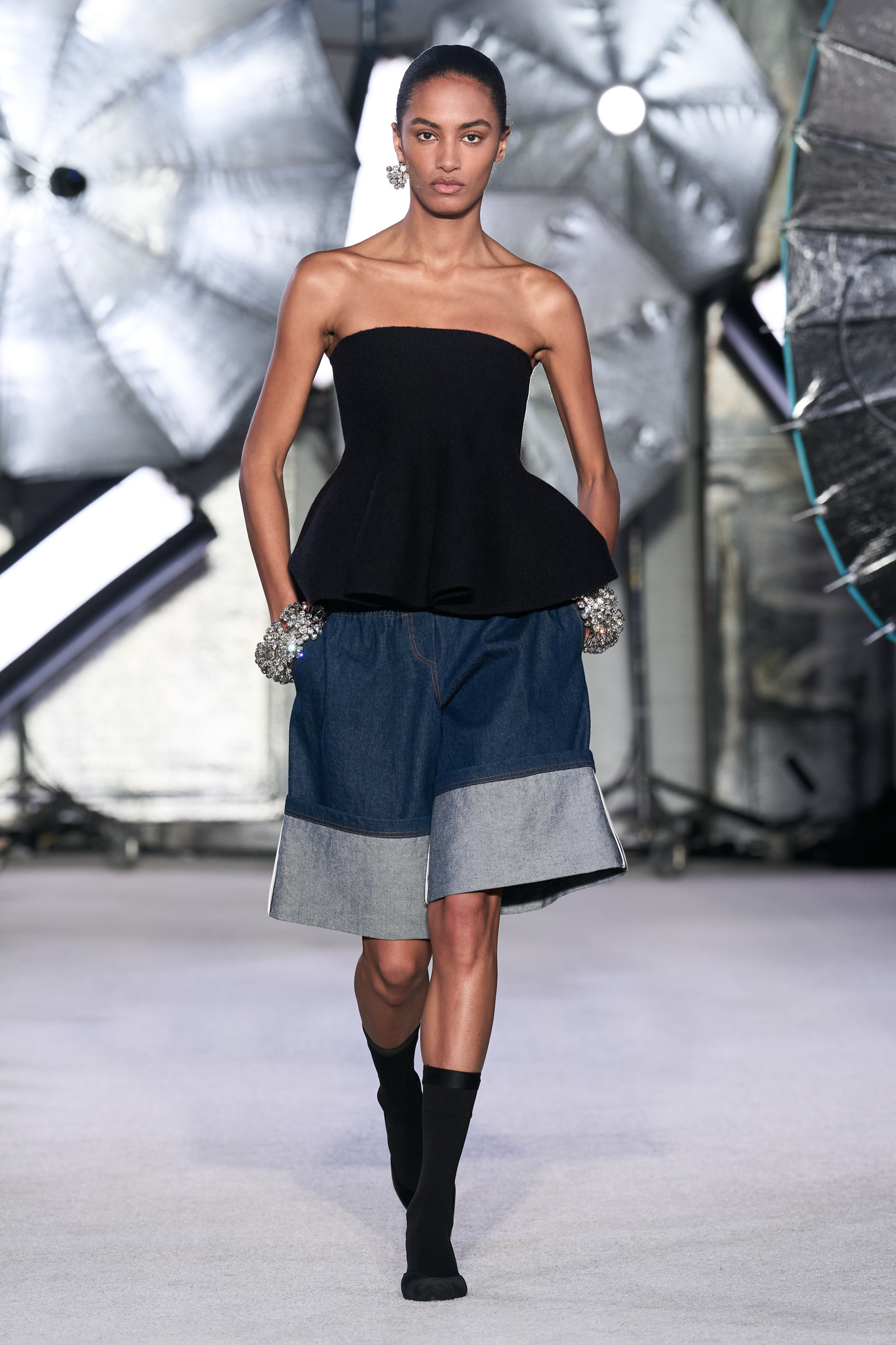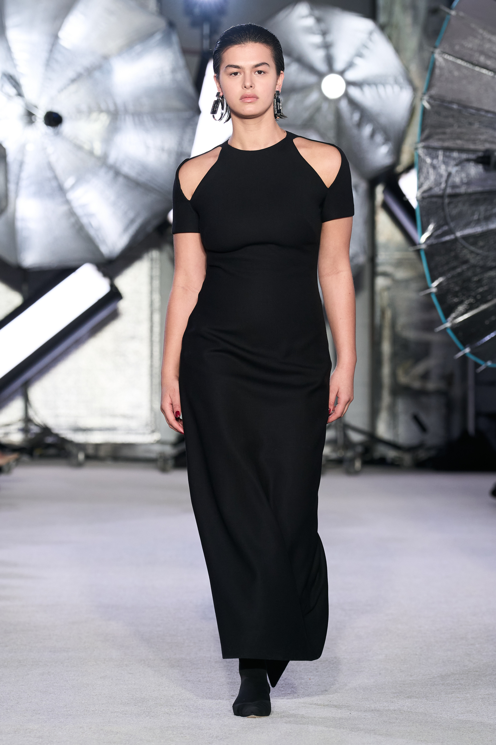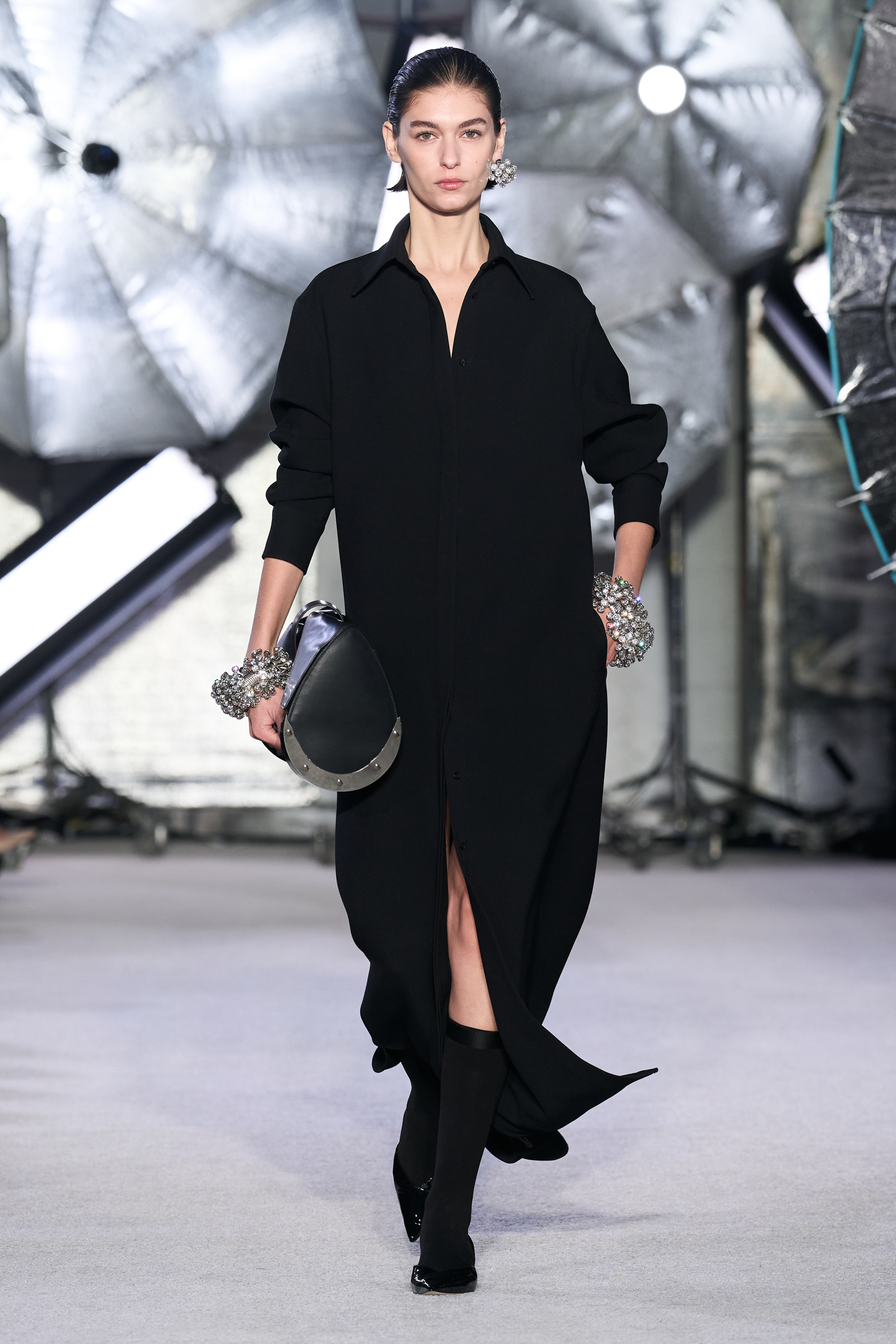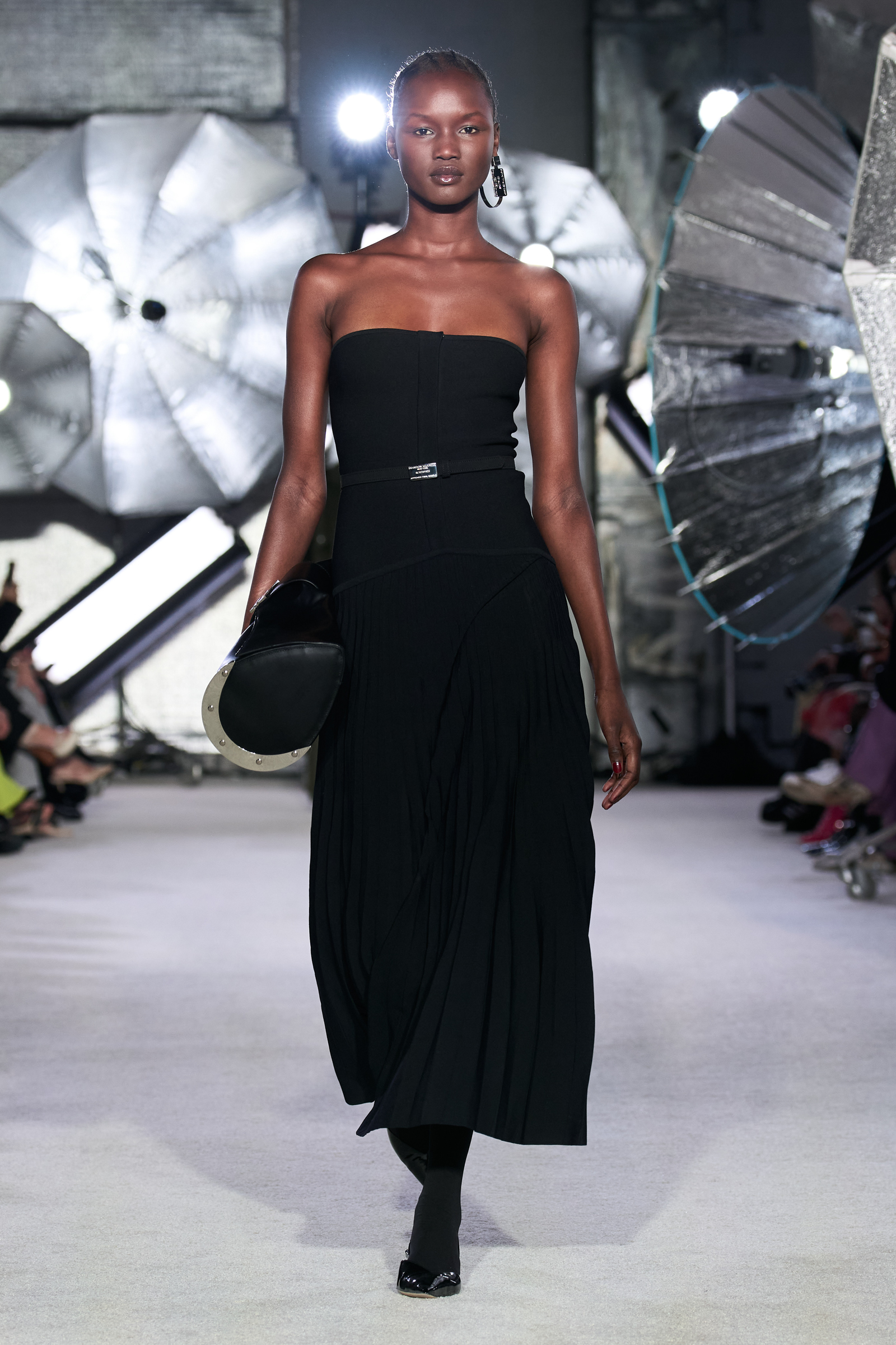 On the tailoring front, he broke convention, pairing trad jackets with deeply cuffed shorts featuring elasticated waists. Cara Taylor opened and closed the show in black and white versions of the playful look. Leather was everywhere, from a shirt, maxi skirt, and bandeau top combo, to a plunge front dress held together under the bust with chrome hardware, that repeated on the jewelry. Maxwell called out an understated black wool shirt dress as his favorite piece.