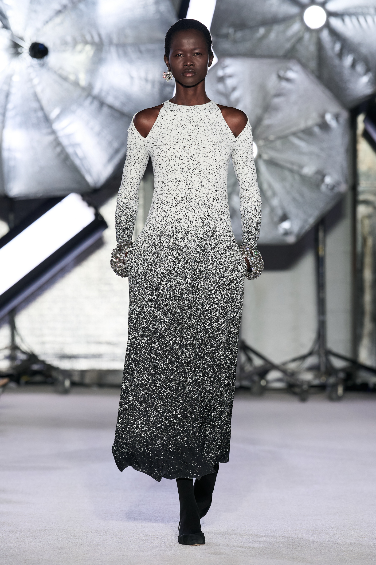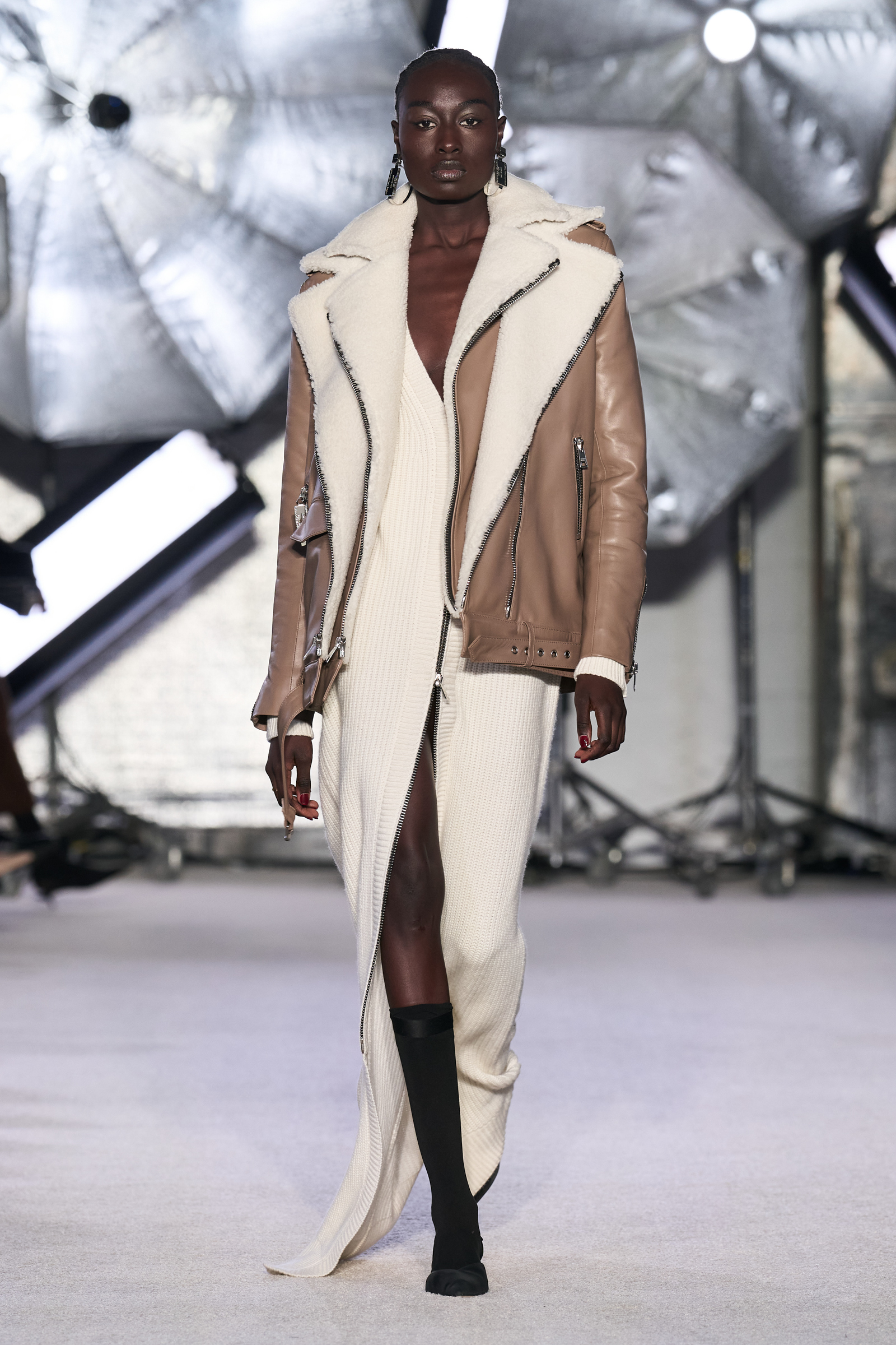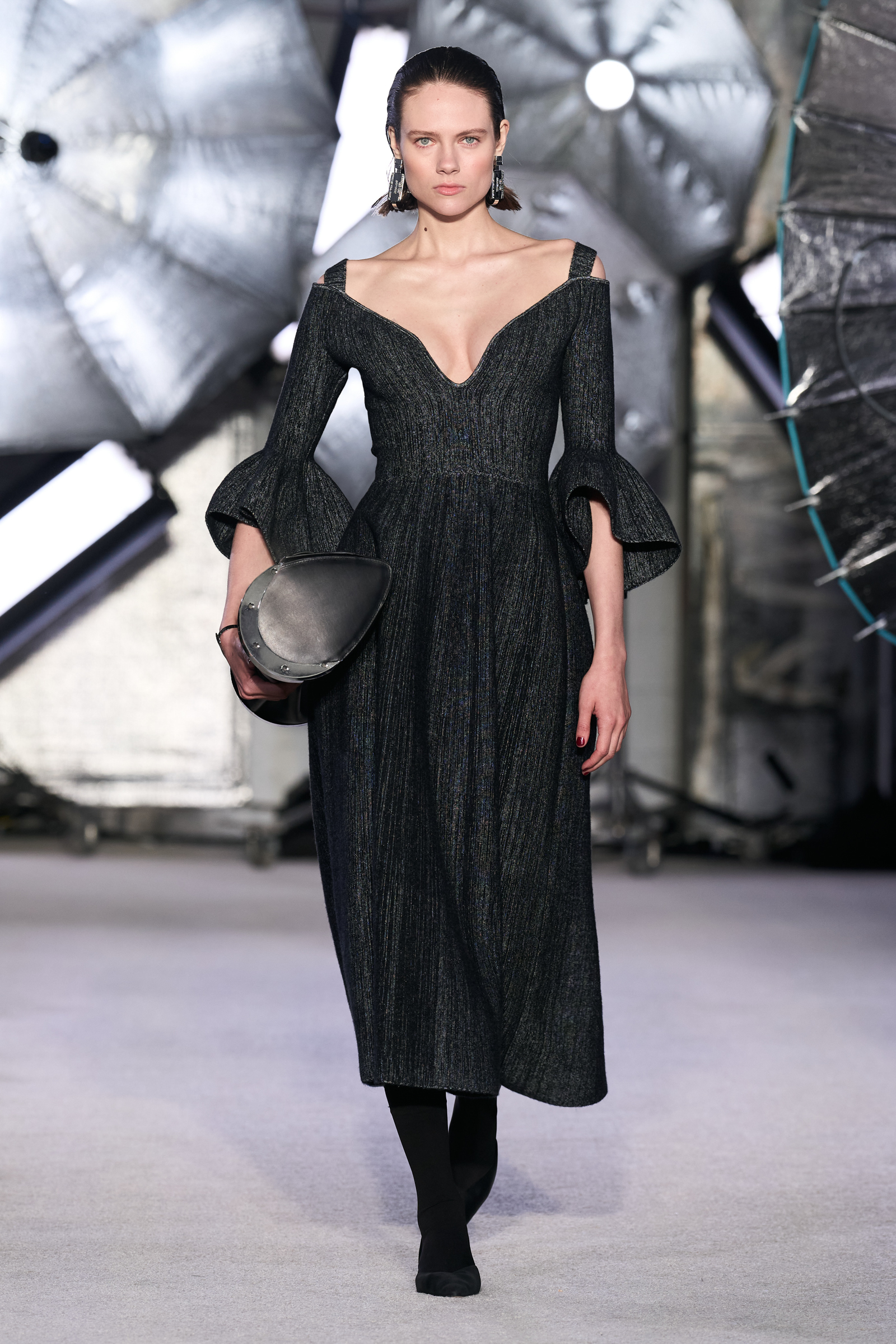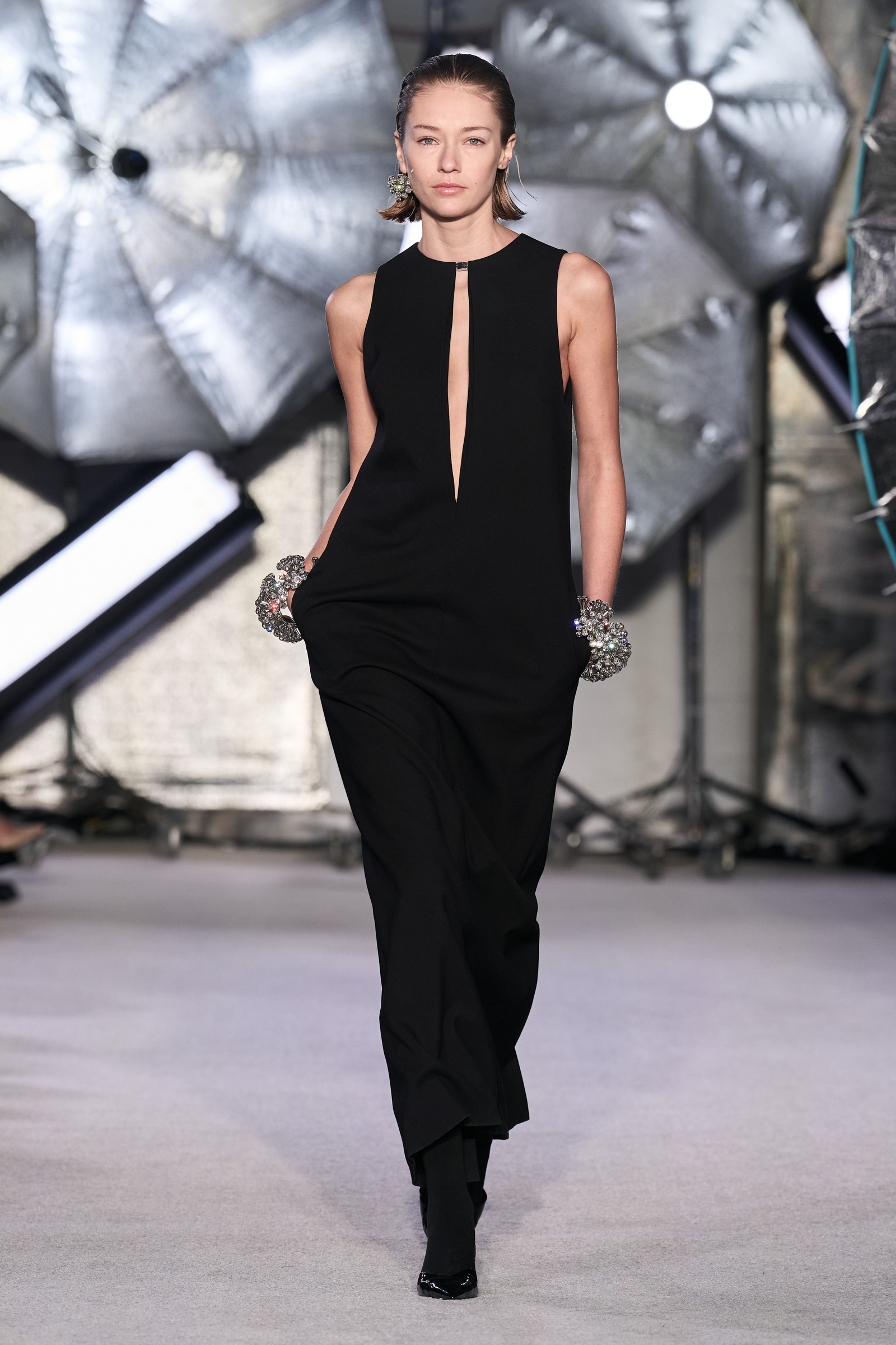 On the tailoring front, he broke convention, pairing trad jackets with deeply cuffed shorts featuring elasticated waists. Cara Taylor opened and closed the show in black and white versions of the playful look. Leather was everywhere, from a shirt, maxi skirt, and bandeau top combo, to a plunge front dress held together under the bust with chrome hardware, that repeated on the jewelry. Maxwell called out an understated black wool shirt dress as his favorite piece.