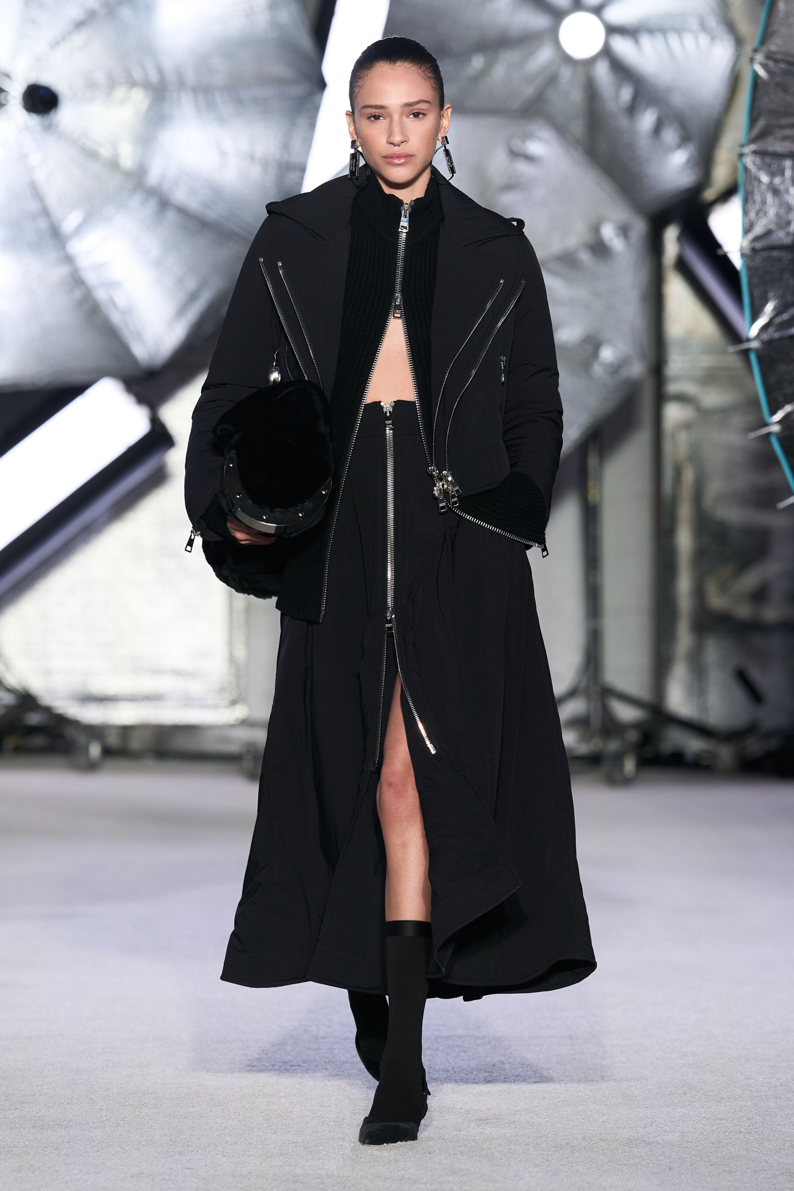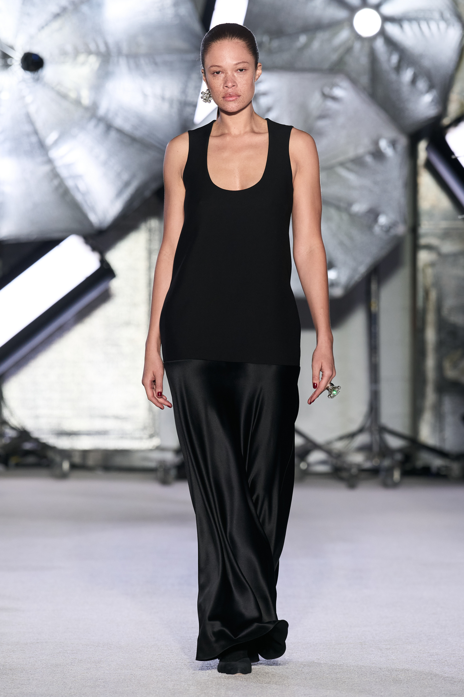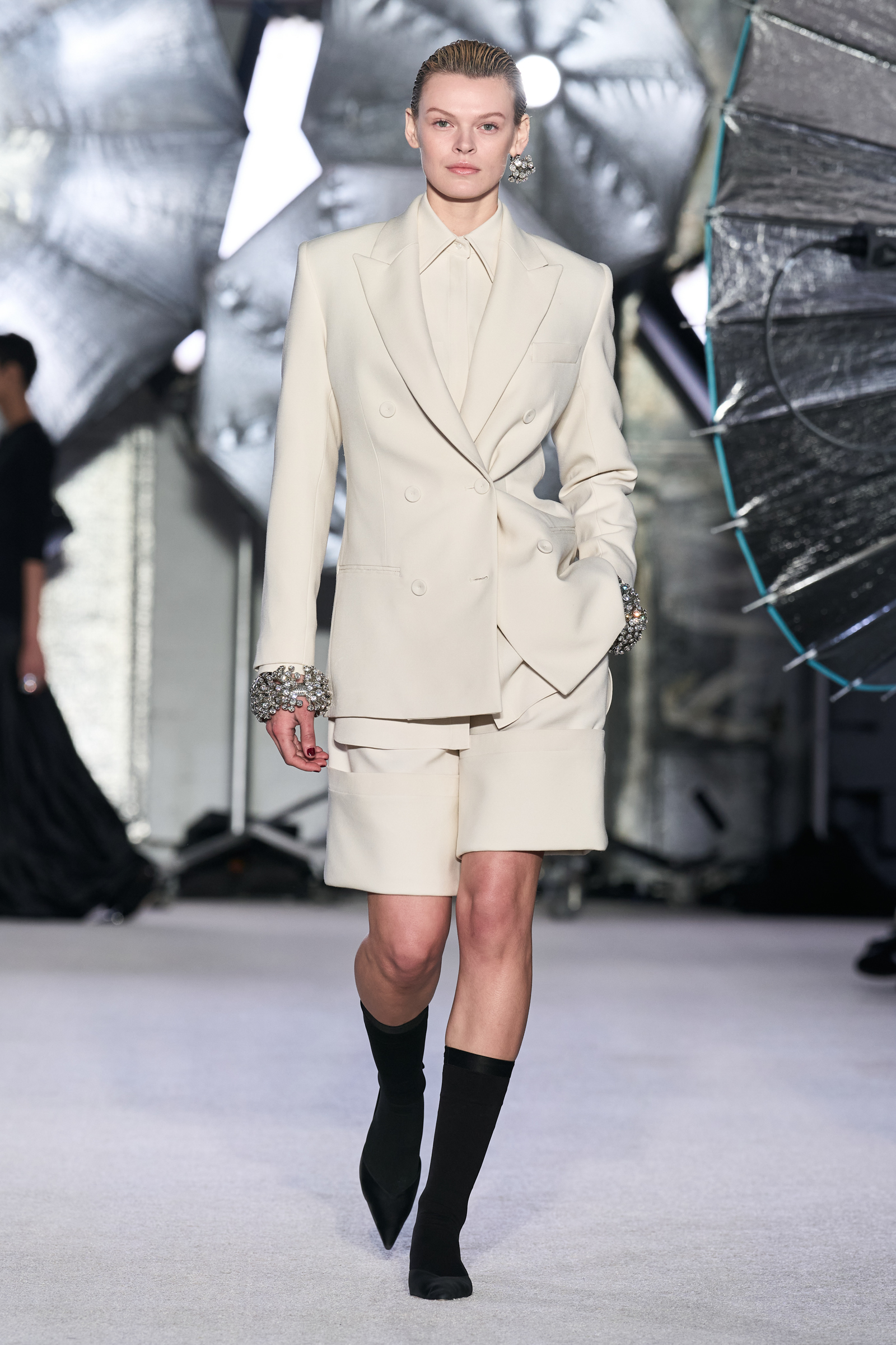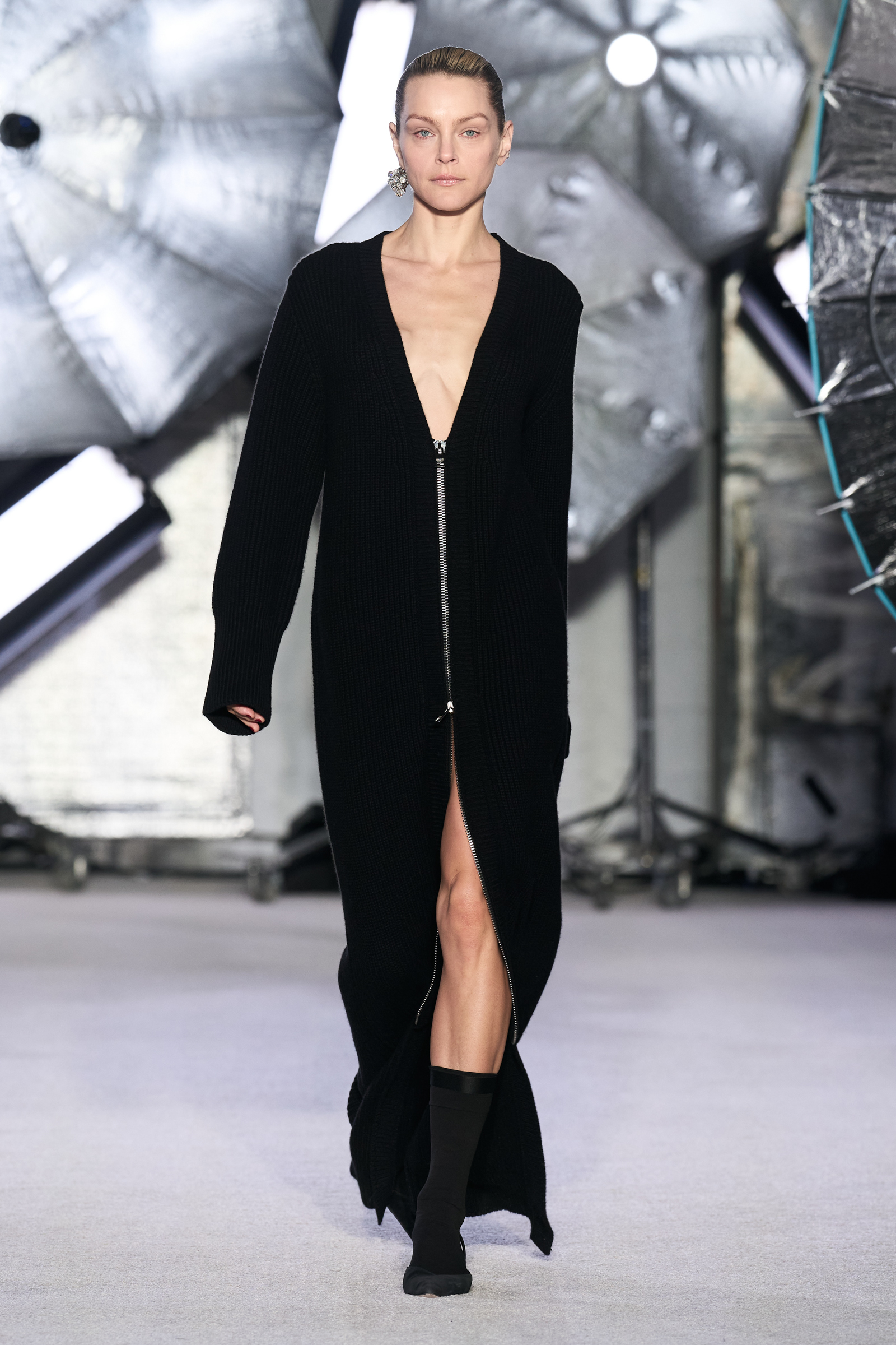 On the tailoring front, he broke convention, pairing trad jackets with deeply cuffed shorts featuring elasticated waists. Cara Taylor opened and closed the show in black and white versions of the playful look. Leather was everywhere, from a shirt, maxi skirt, and bandeau top combo, to a plunge front dress held together under the bust with chrome hardware, that repeated on the jewelry. Maxwell called out an understated black wool shirt dress as his favorite piece.