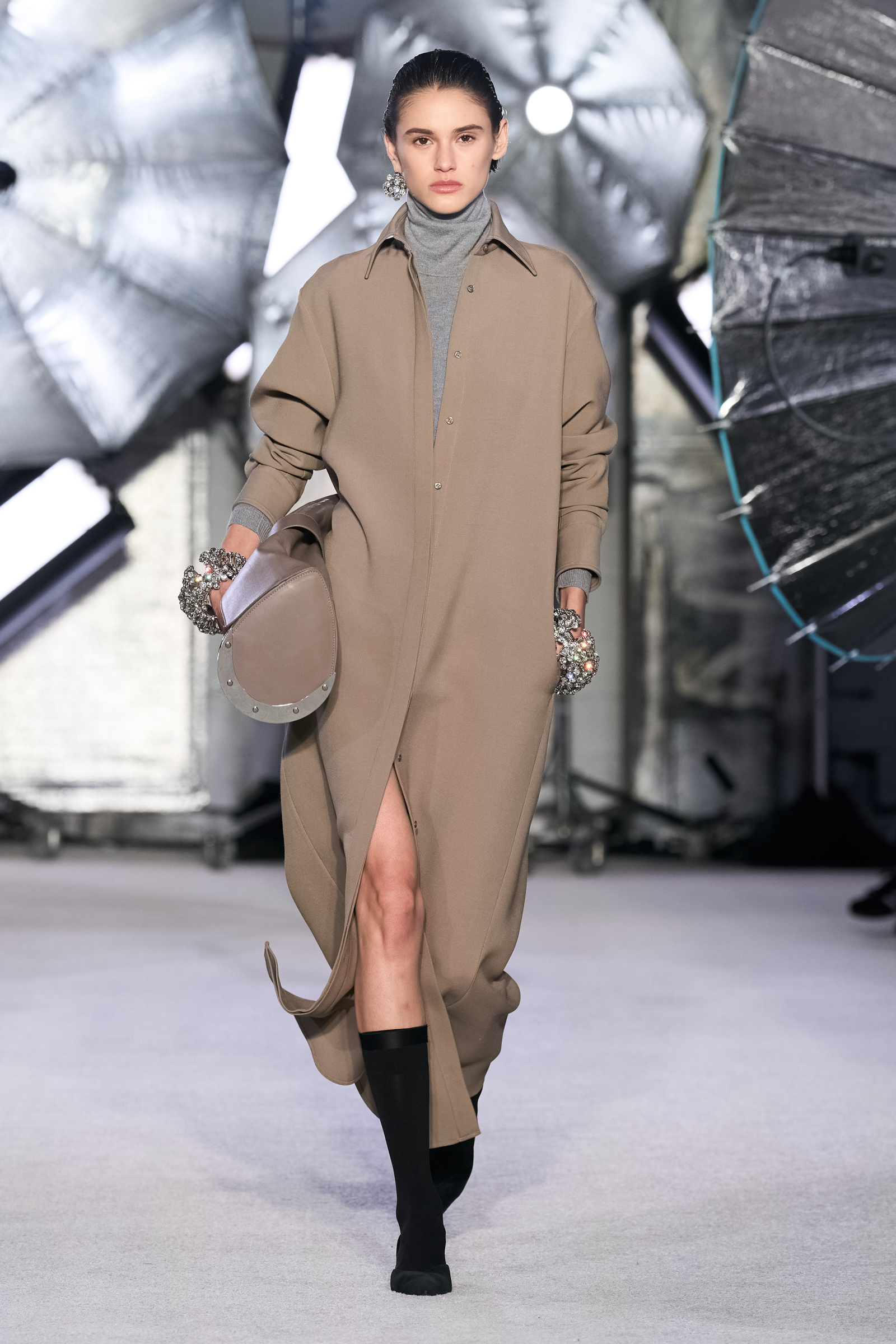 Though there were a few bejeweled items, the big takeaway here was the collection’s grown-up restraint, for both day or night. “I don’t know that evening for me right now is a gown,” he said. I had a hard time with anything that felt too ‘dressed.’” Favoring subtlety over drama, one sylph-like look dress combined a sweater with lightly padded shoulders and a bias cut silk skirt, another spliced together a knit tank and a fuller silk skirt. In recent season Maxwell toyed around with color and a variety of prints. He said goodbye to all that for fall. Almost everything came in monochrome, and 100% of it was in neutrals. He seemed to anticipate questions about the palette. Brandon Maxwell faded to gray? “Actually,” he said, “it came from a place of joy.”