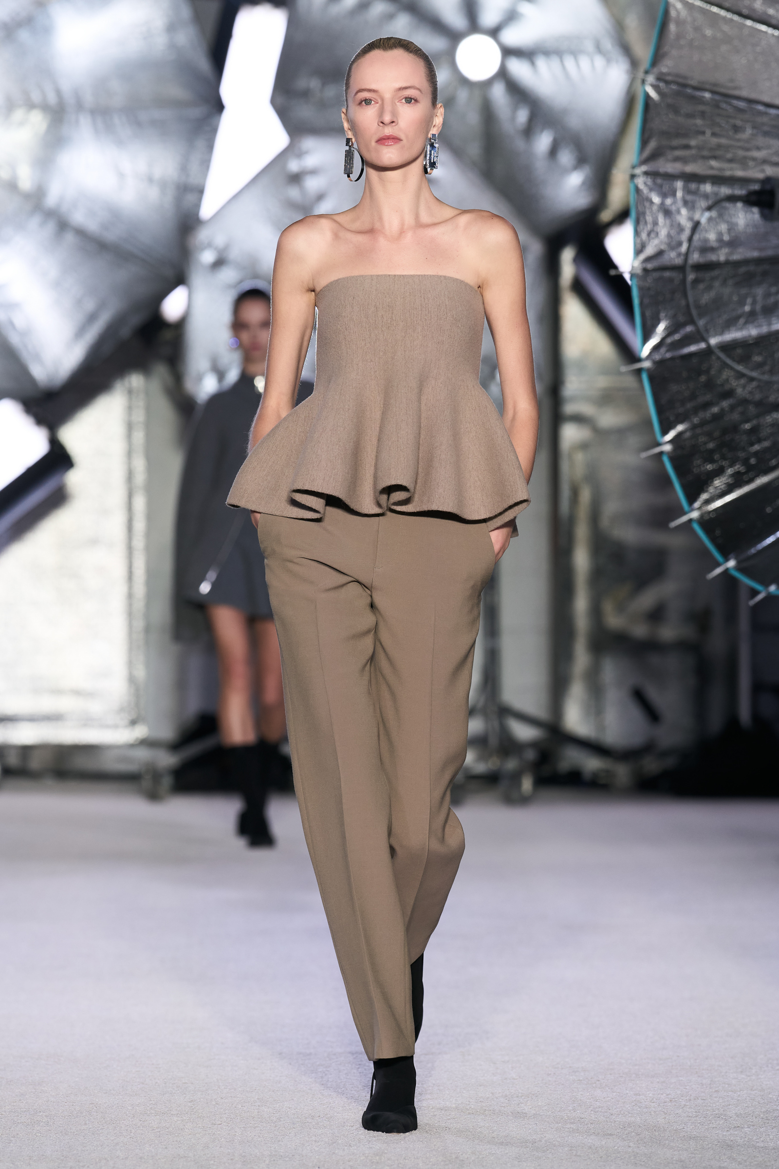 Maxwell said he went back to the beginning for this collection, picking out a bell sleeve peplum top that he felt was ripe for revival. In that first collection he cut it in what he described today as a “cumbersome” crepe; this time around, with half a dozen years under his belt, he used an alpaca wool stretch knit that follows the contours of the body. “It was about taking stock of who I am and asking ‘what can I do better?’” he said backstage. The same shape turned up on an off-the-shoulder dress and on a strapless top.
