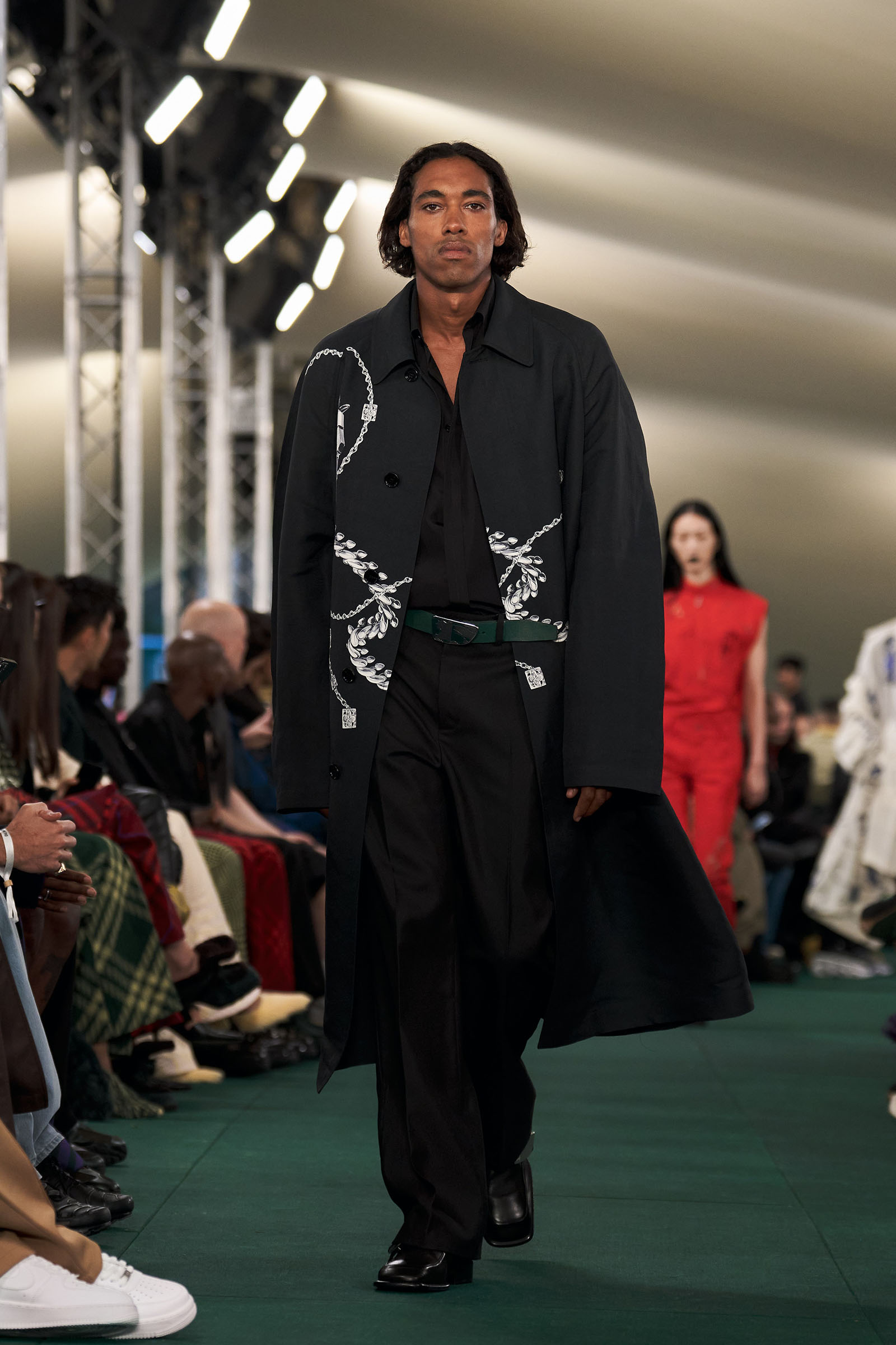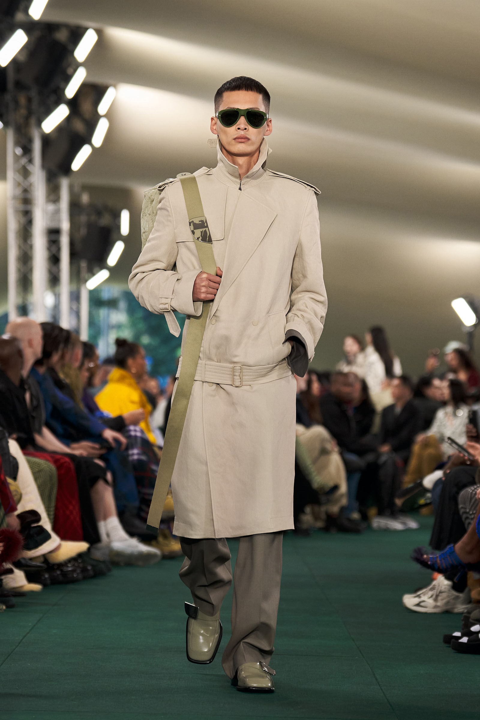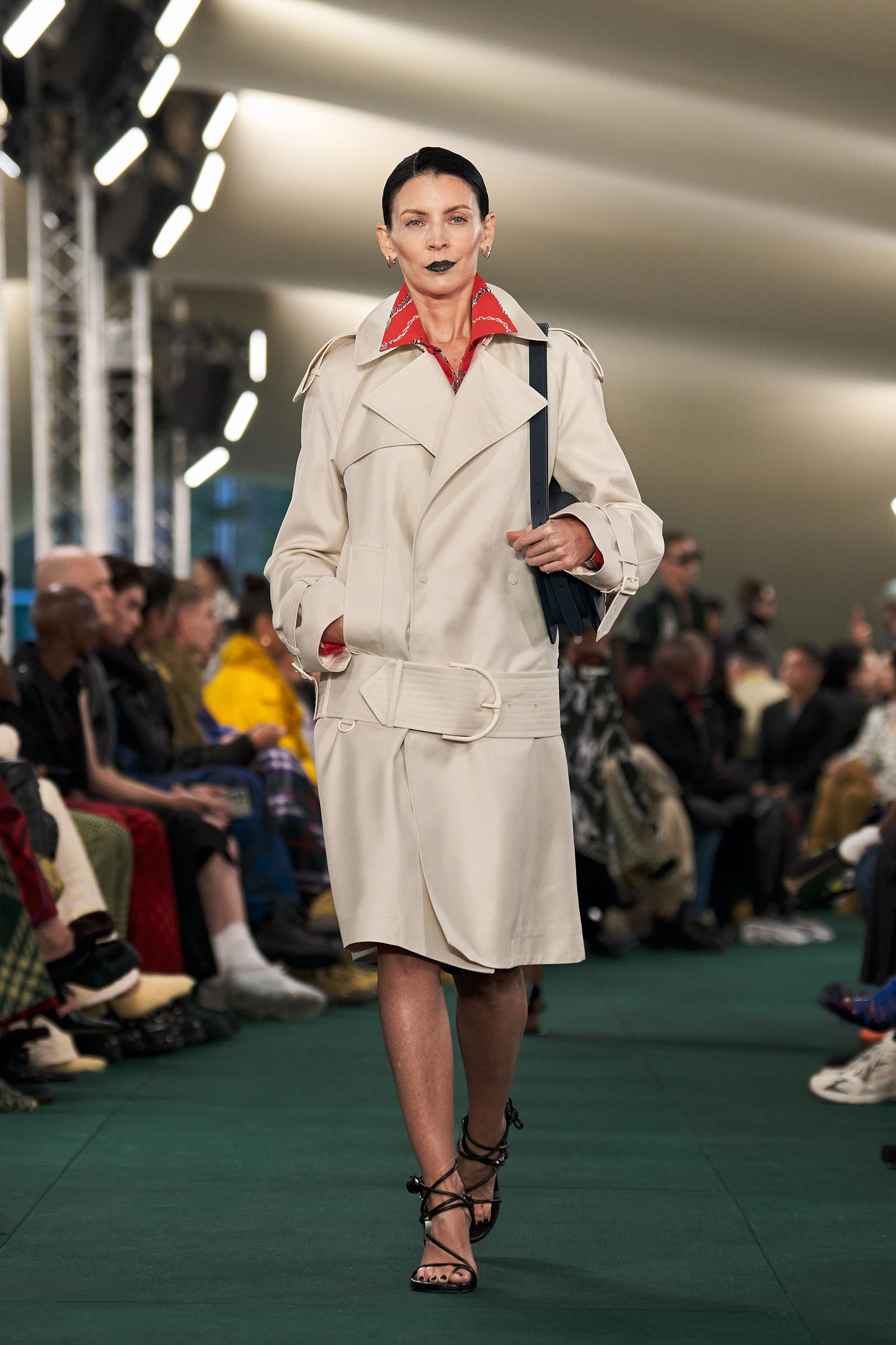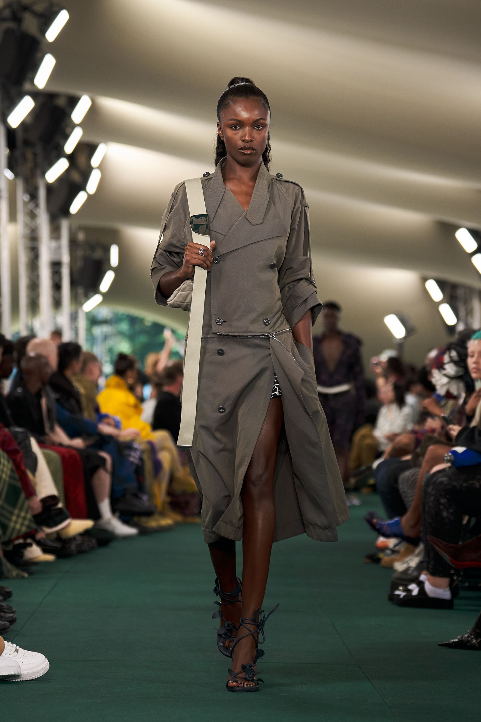 Outside the leafy local venue, there was a very English food van, dispensing Eccles cakes, Guinness bread, and cups of tea—a taste of cheerful traditional Yorkshire hospitality familiar to Lee’s upbringing in the North of England. Inside, there were green park benches, quilted green horse blankets, camping bottles, and a friendly convergence of the kind of guests who make multicultural London and Britain what they are today—actors, athletes, artists, footballers, rappers, and musicians including Kylie Minogue, Rachel Weisz, Naomi Ackie, Jason Statham, and Mo Farah. The good-natured atmosphere, somehow leveling, uplifting, and a little bit jolly had nobody strutting around behaving like look-at-me superstars. Instead, there was sitting down, chatting, smiling, and waving. And as we know, this is a rarity among the rigid dividing-lines of the social snobberies which normally pertain at a big brand fashion show.