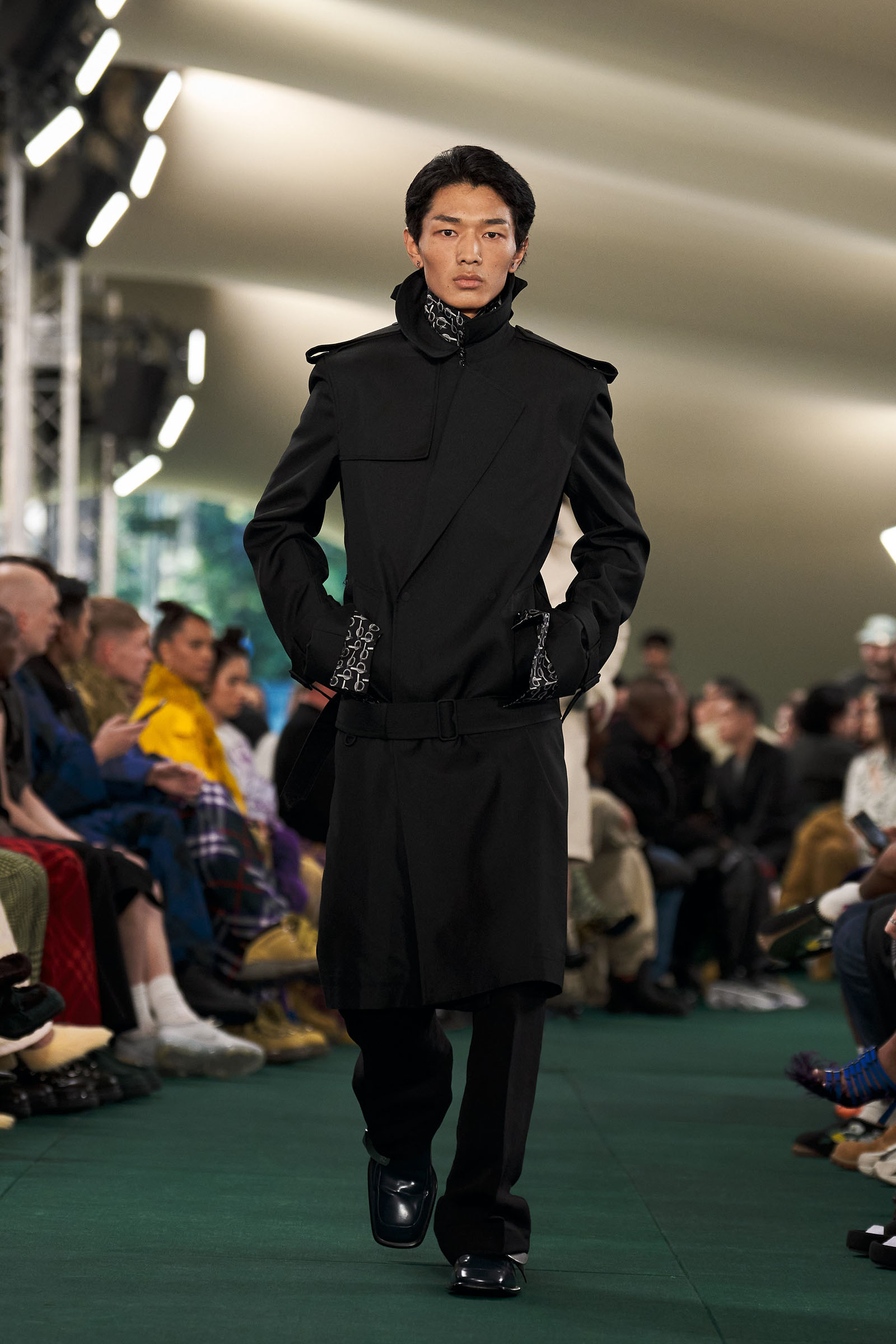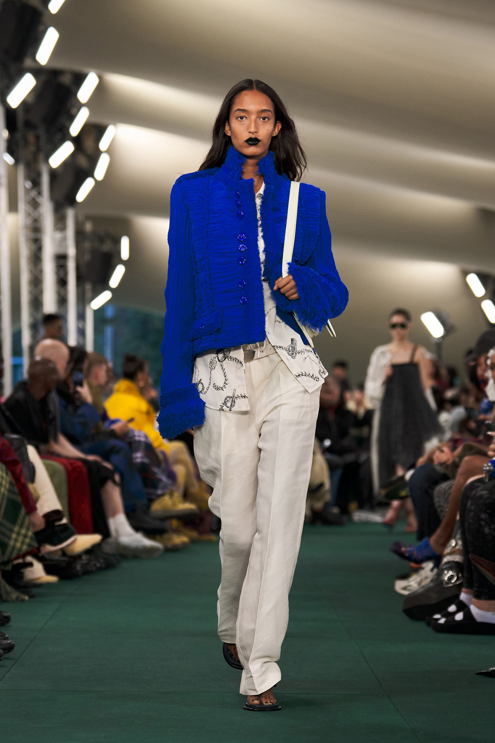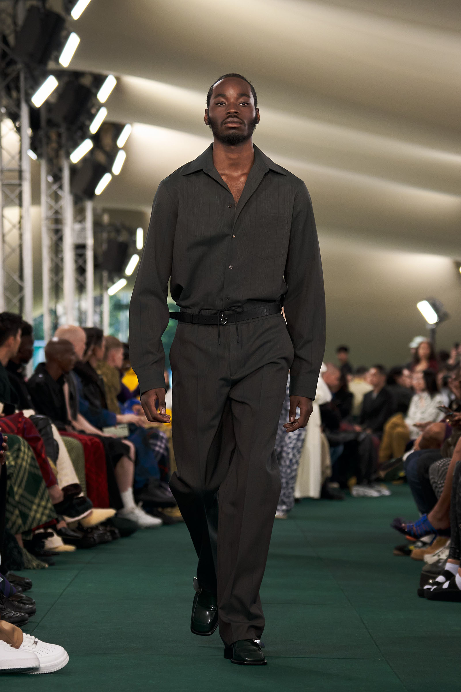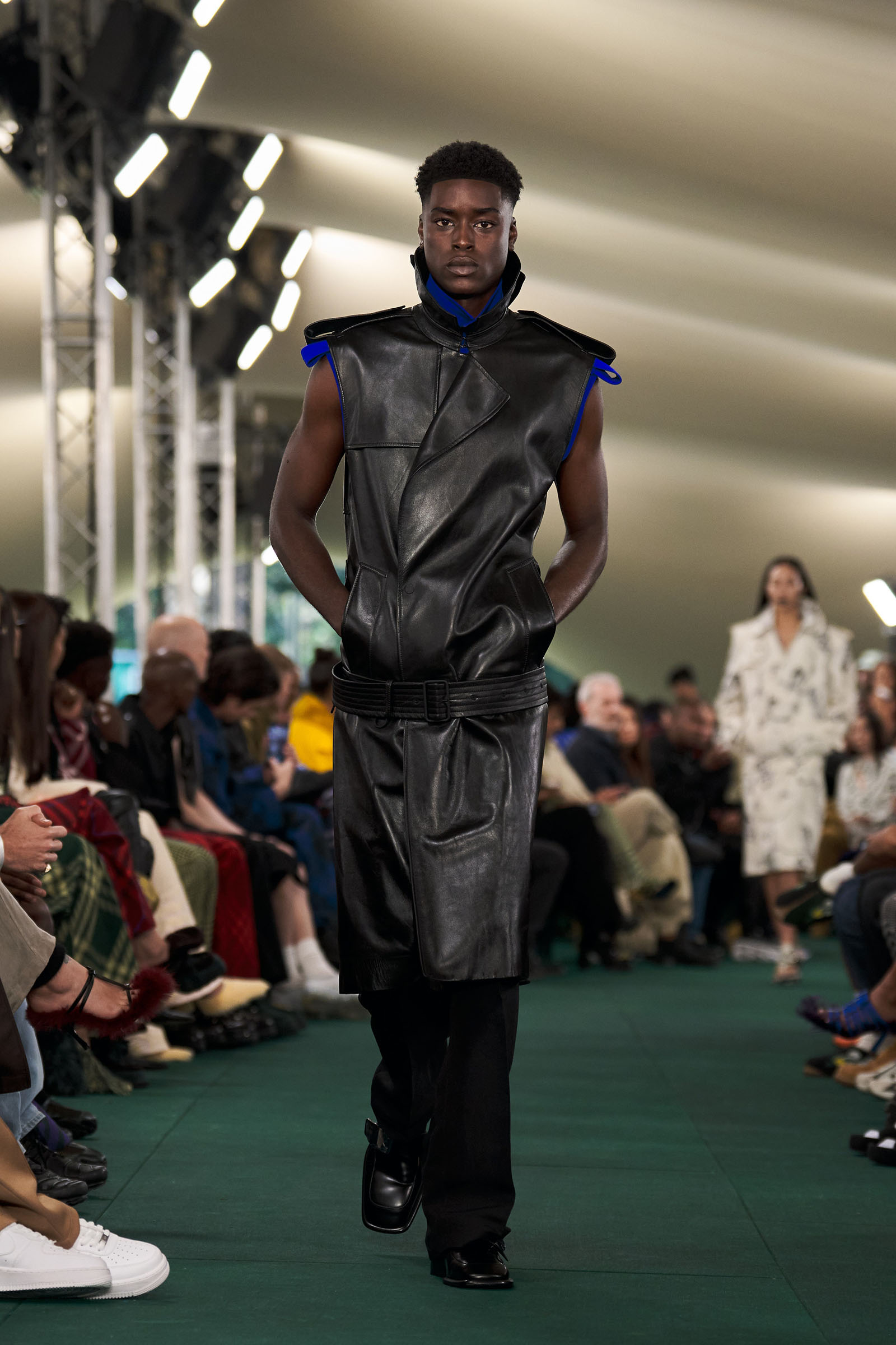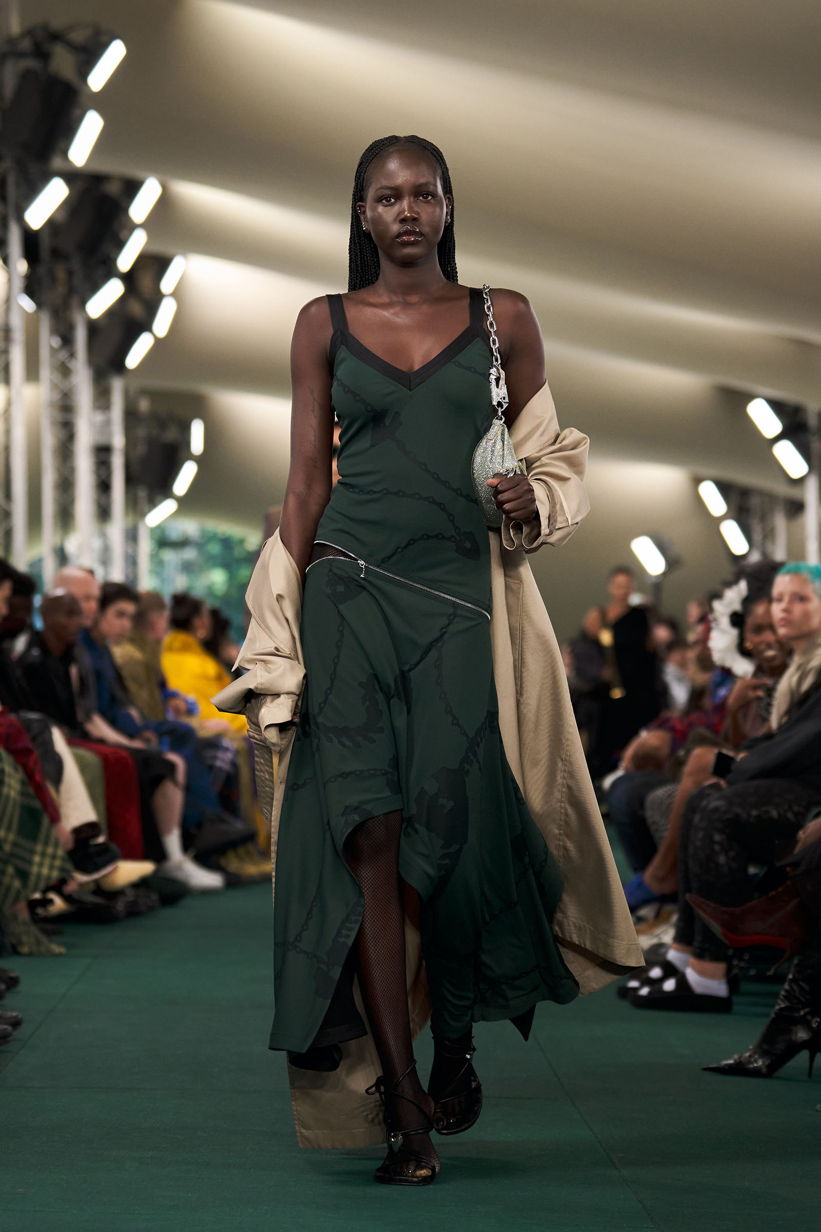 Outside the leafy local venue, there was a very English food van, dispensing Eccles cakes, Guinness bread, and cups of tea—a taste of cheerful traditional Yorkshire hospitality familiar to Lee’s upbringing in the North of England. Inside, there were green park benches, quilted green horse blankets, camping bottles, and a friendly convergence of the kind of guests who make multicultural London and Britain what they are today—actors, athletes, artists, footballers, rappers, and musicians including Kylie Minogue, Rachel Weisz, Naomi Ackie, Jason Statham, and Mo Farah. The good-natured atmosphere, somehow leveling, uplifting, and a little bit jolly had nobody strutting around behaving like look-at-me superstars. Instead, there was sitting down, chatting, smiling, and waving. And as we know, this is a rarity among the rigid dividing-lines of the social snobberies which normally pertain at a big brand fashion show.