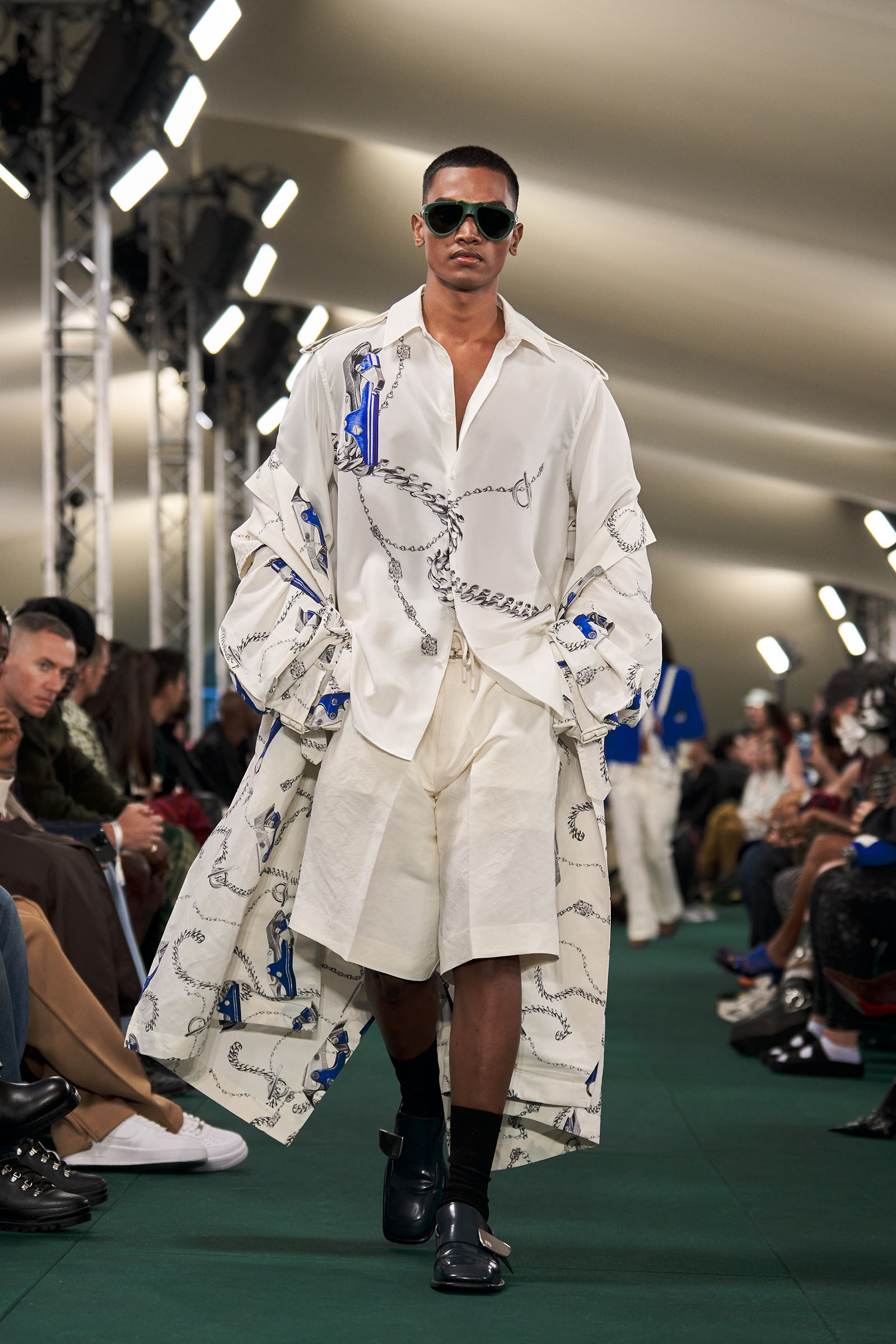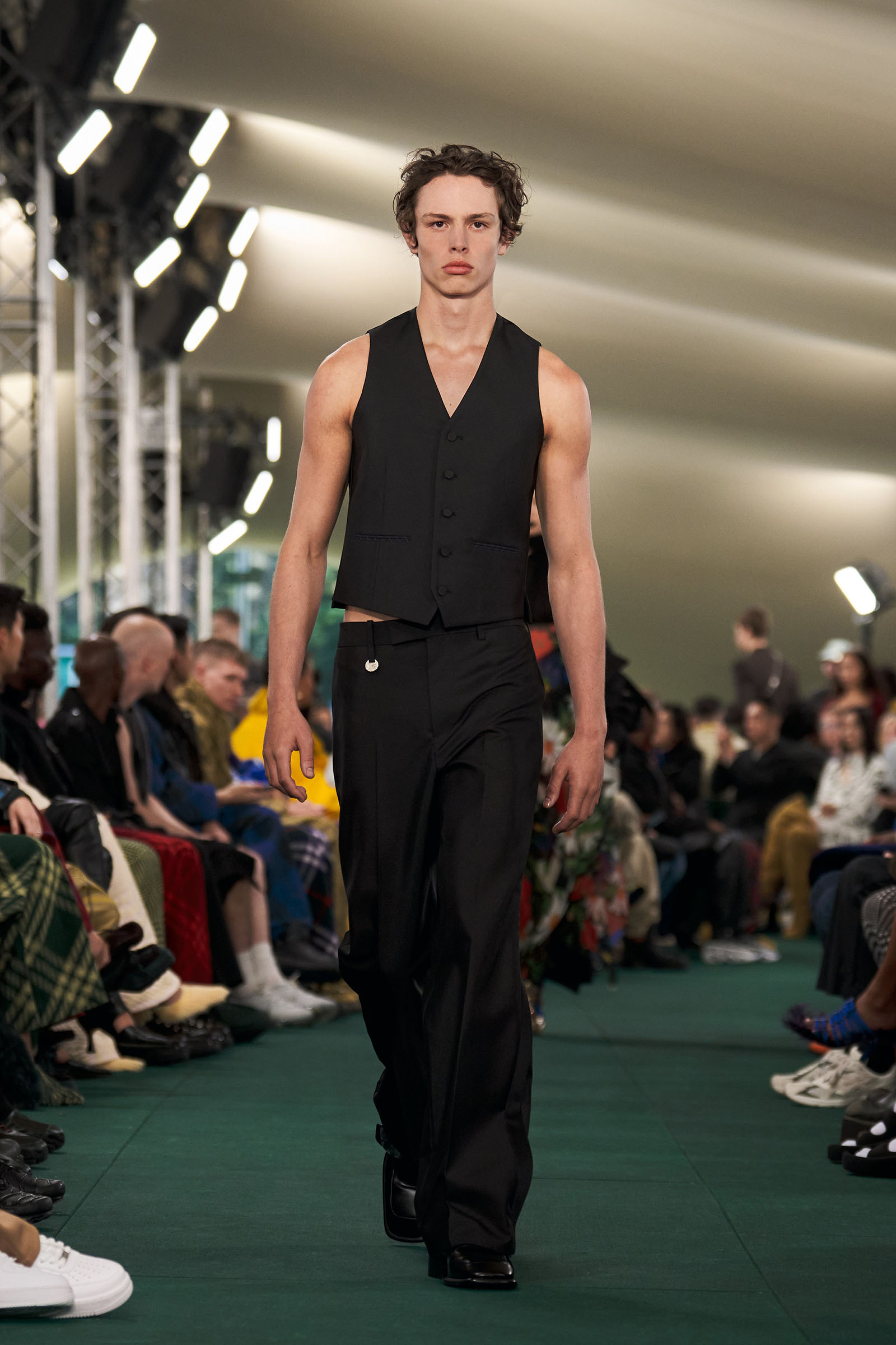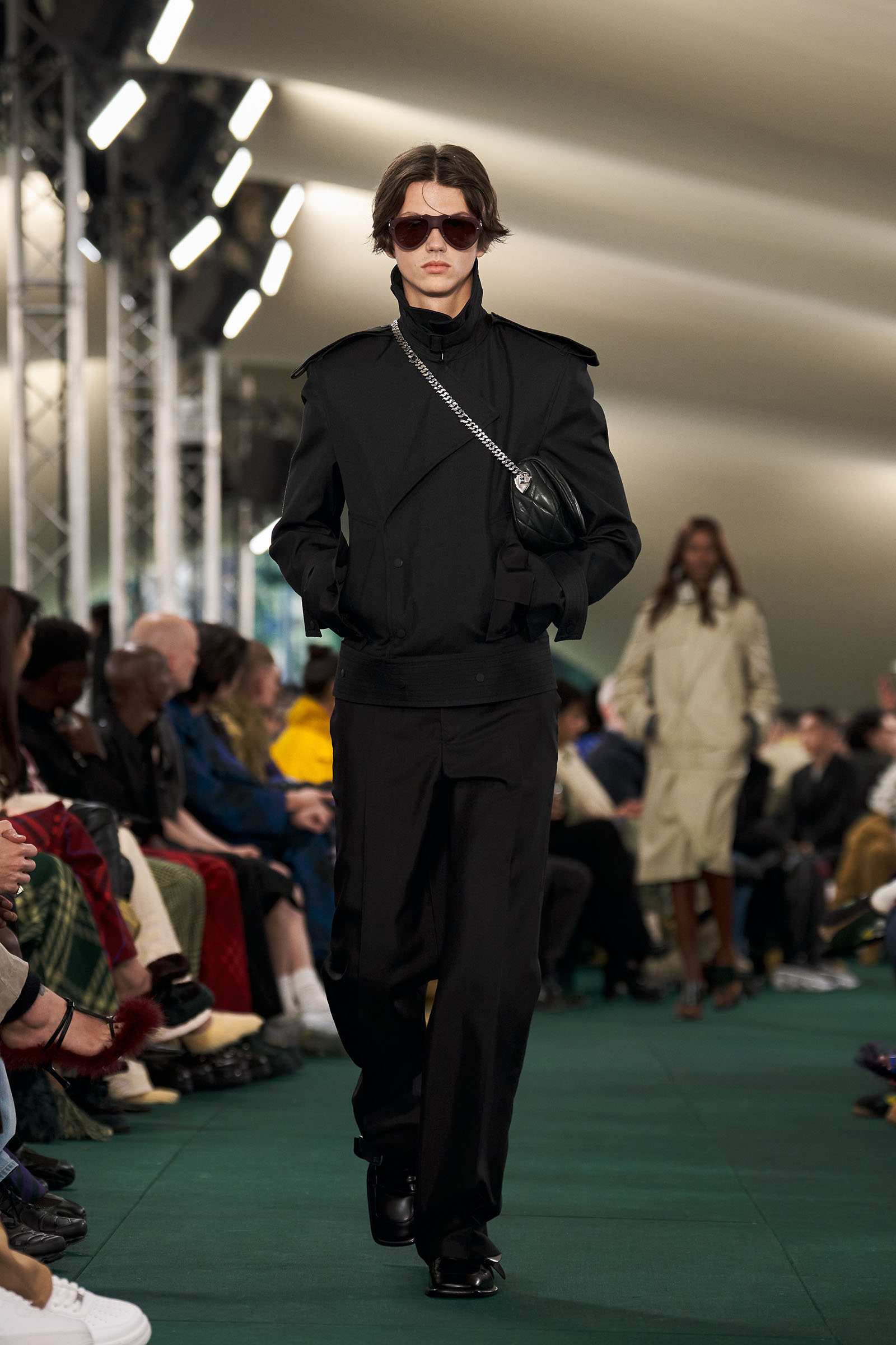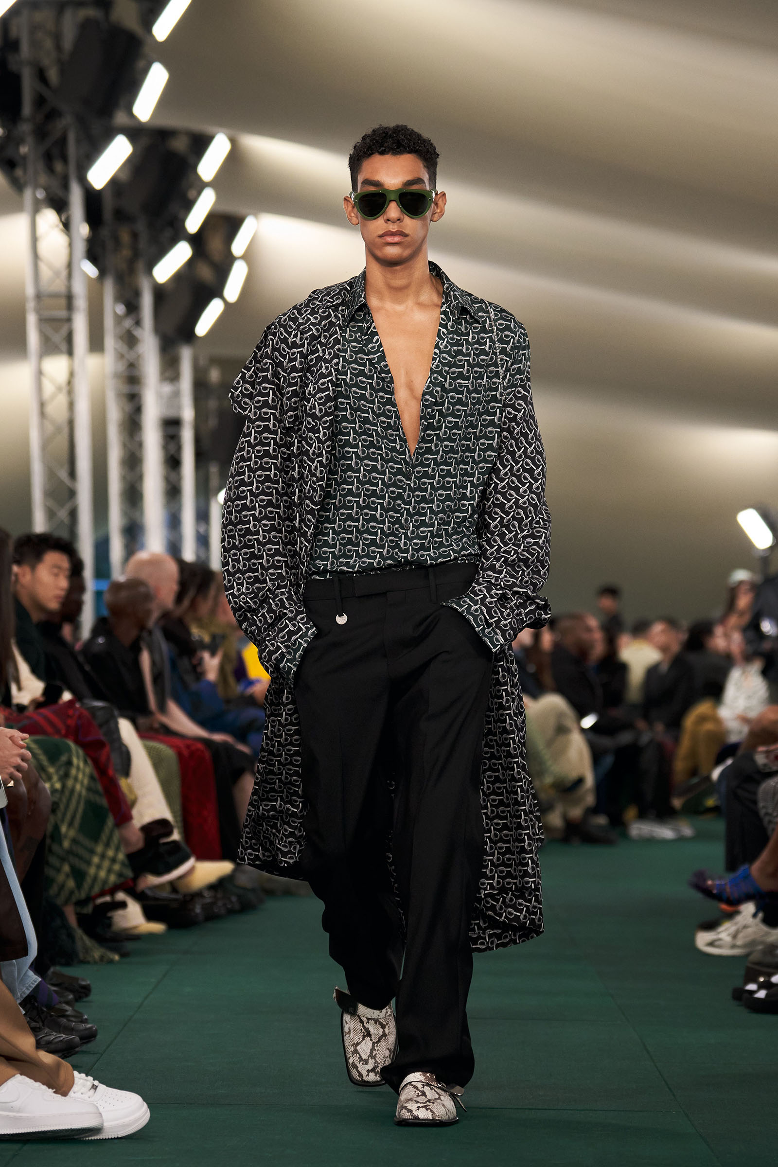 Outside the leafy local venue, there was a very English food van, dispensing Eccles cakes, Guinness bread, and cups of tea—a taste of cheerful traditional Yorkshire hospitality familiar to Lee’s upbringing in the North of England. Inside, there were green park benches, quilted green horse blankets, camping bottles, and a friendly convergence of the kind of guests who make multicultural London and Britain what they are today—actors, athletes, artists, footballers, rappers, and musicians including Kylie Minogue, Rachel Weisz, Naomi Ackie, Jason Statham, and Mo Farah. The good-natured atmosphere, somehow leveling, uplifting, and a little bit jolly had nobody strutting around behaving like look-at-me superstars. Instead, there was sitting down, chatting, smiling, and waving. And as we know, this is a rarity among the rigid dividing-lines of the social snobberies which normally pertain at a big brand fashion show.