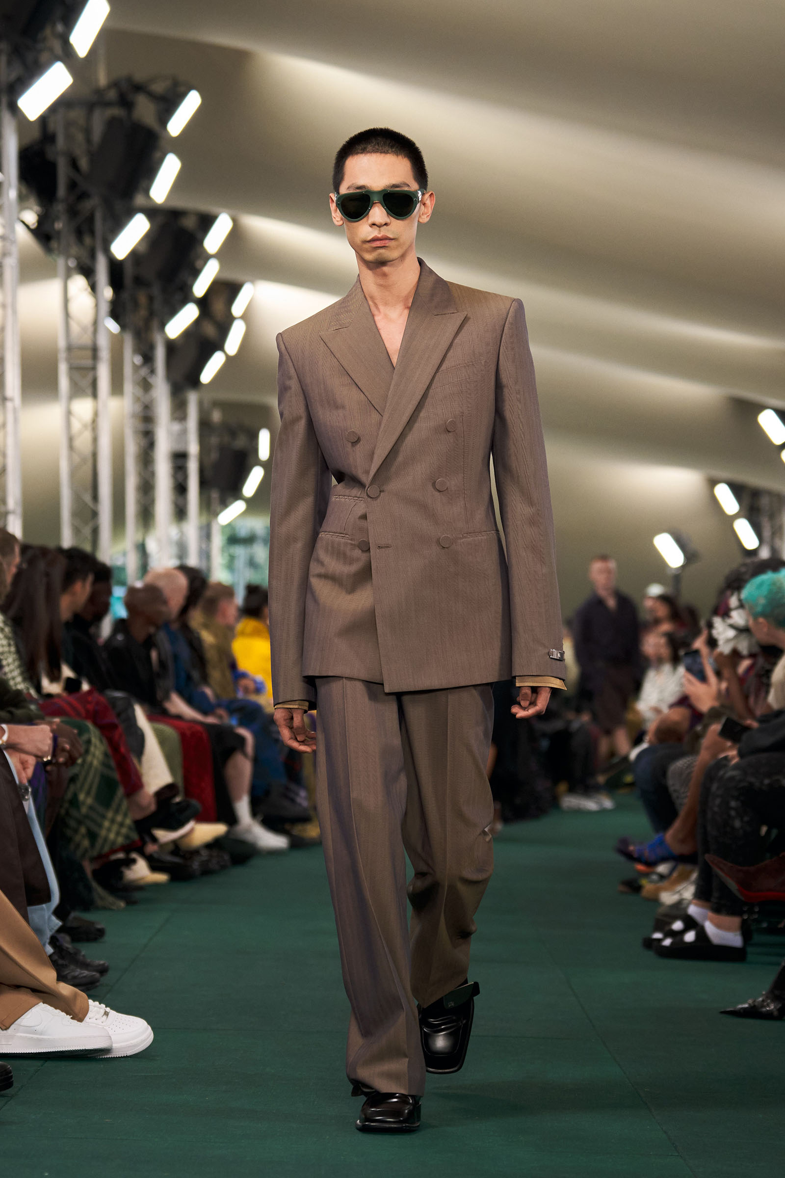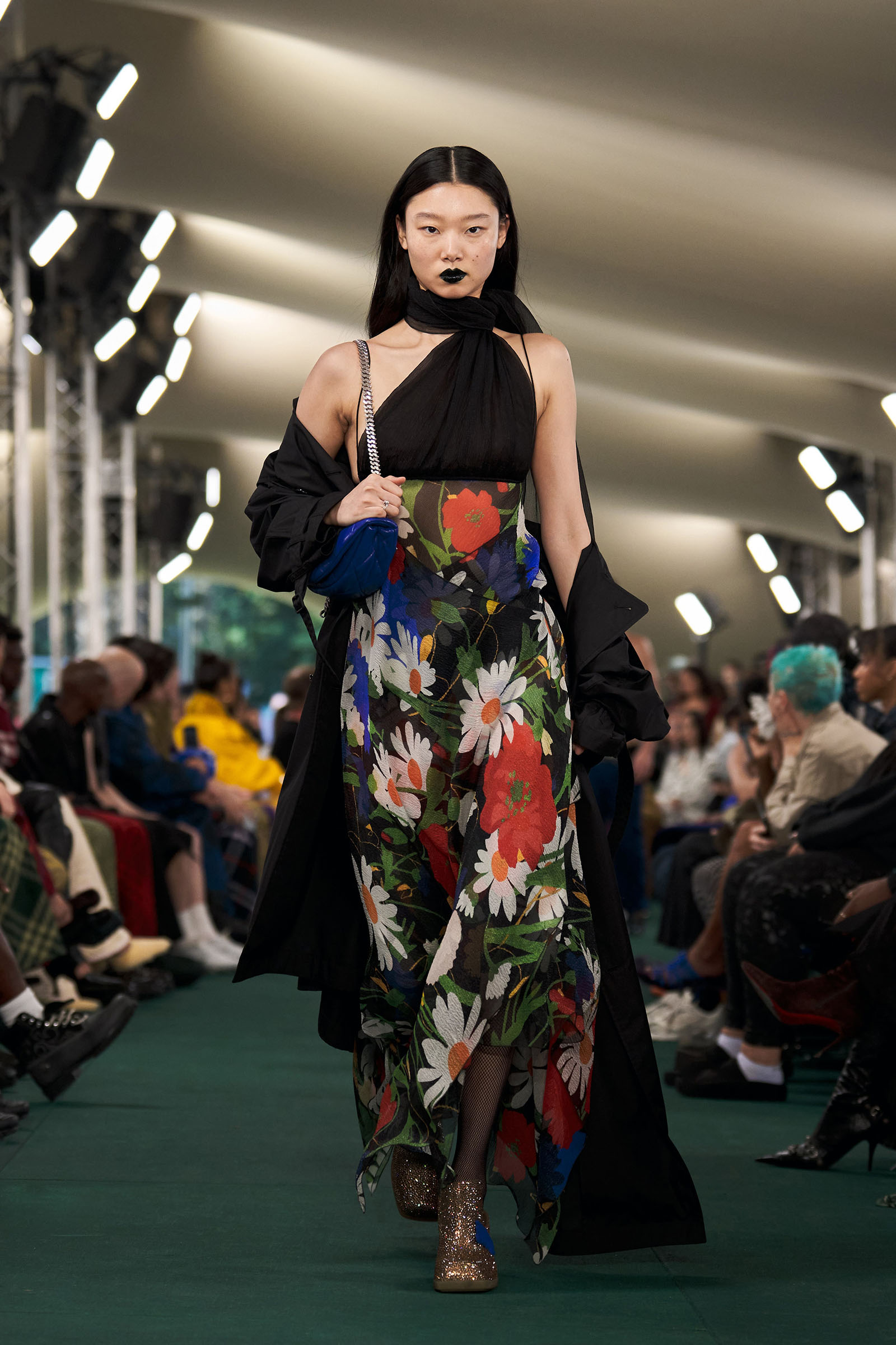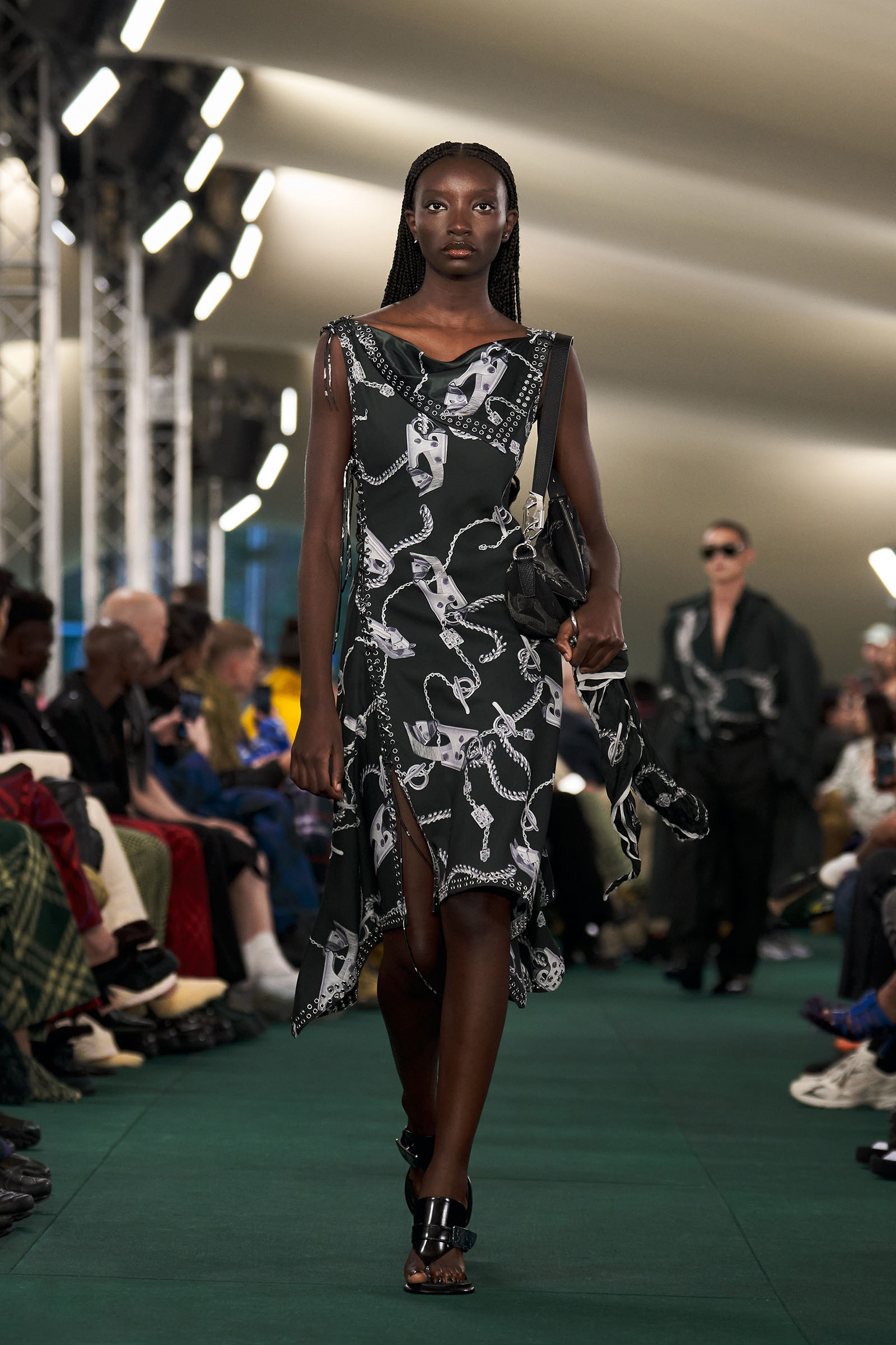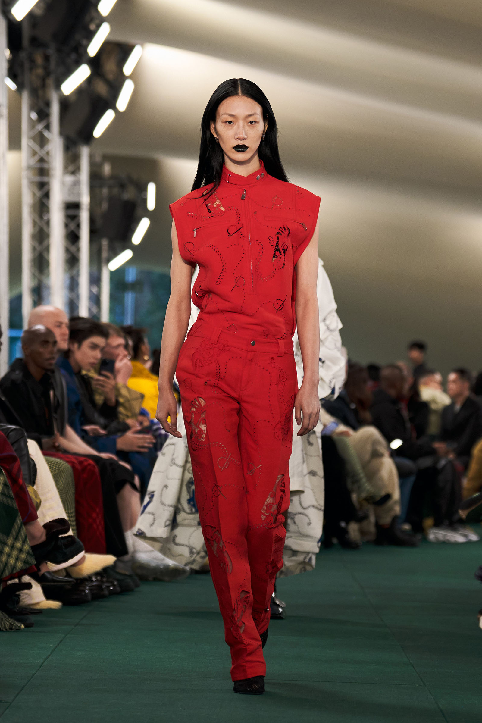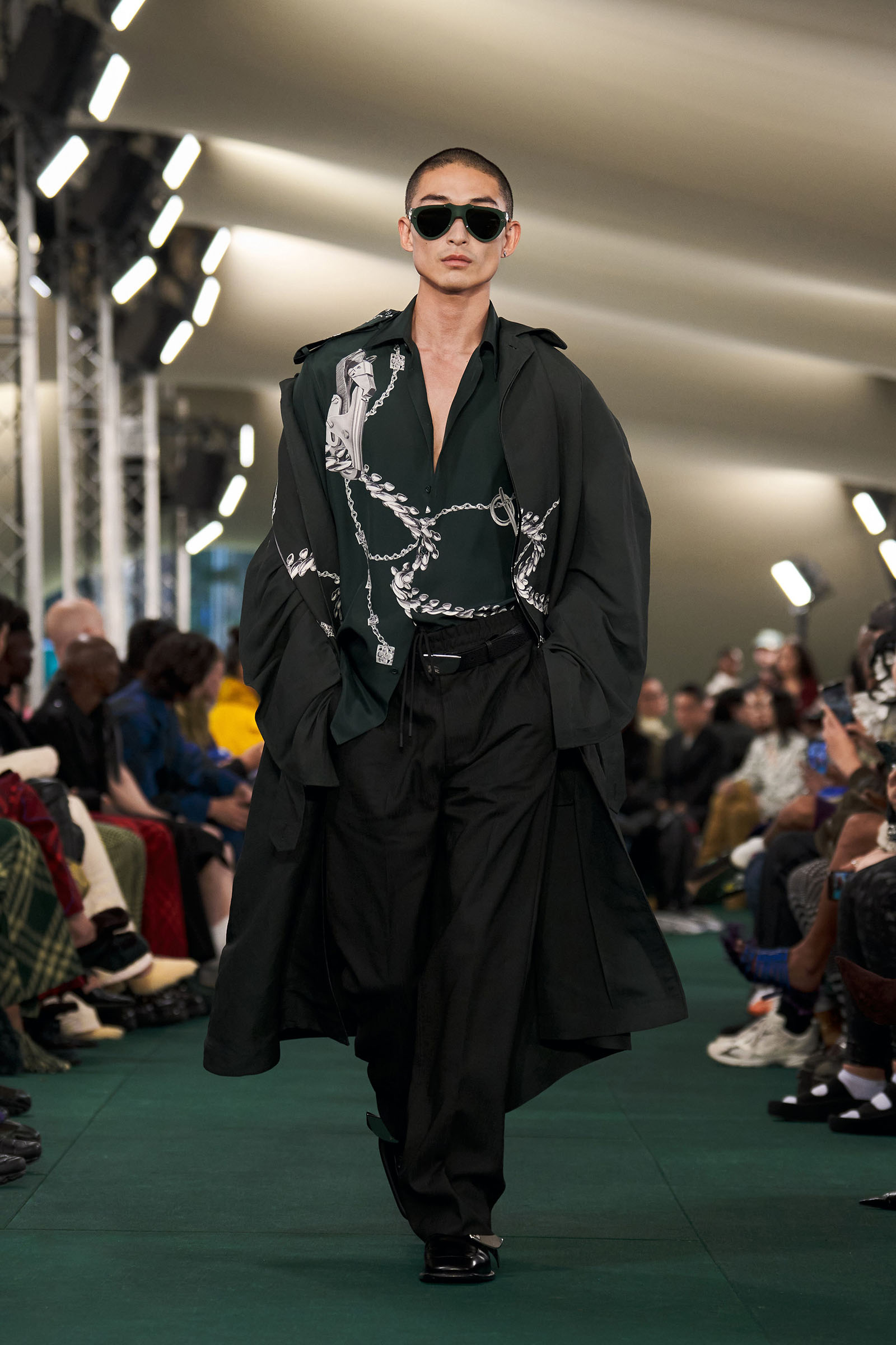 Outside the leafy local venue, there was a very English food van, dispensing Eccles cakes, Guinness bread, and cups of tea—a taste of cheerful traditional Yorkshire hospitality familiar to Lee’s upbringing in the North of England. Inside, there were green park benches, quilted green horse blankets, camping bottles, and a friendly convergence of the kind of guests who make multicultural London and Britain what they are today—actors, athletes, artists, footballers, rappers, and musicians including Kylie Minogue, Rachel Weisz, Naomi Ackie, Jason Statham, and Mo Farah. The good-natured atmosphere, somehow leveling, uplifting, and a little bit jolly had nobody strutting around behaving like look-at-me superstars. Instead, there was sitting down, chatting, smiling, and waving. And as we know, this is a rarity among the rigid dividing-lines of the social snobberies which normally pertain at a big brand fashion show.