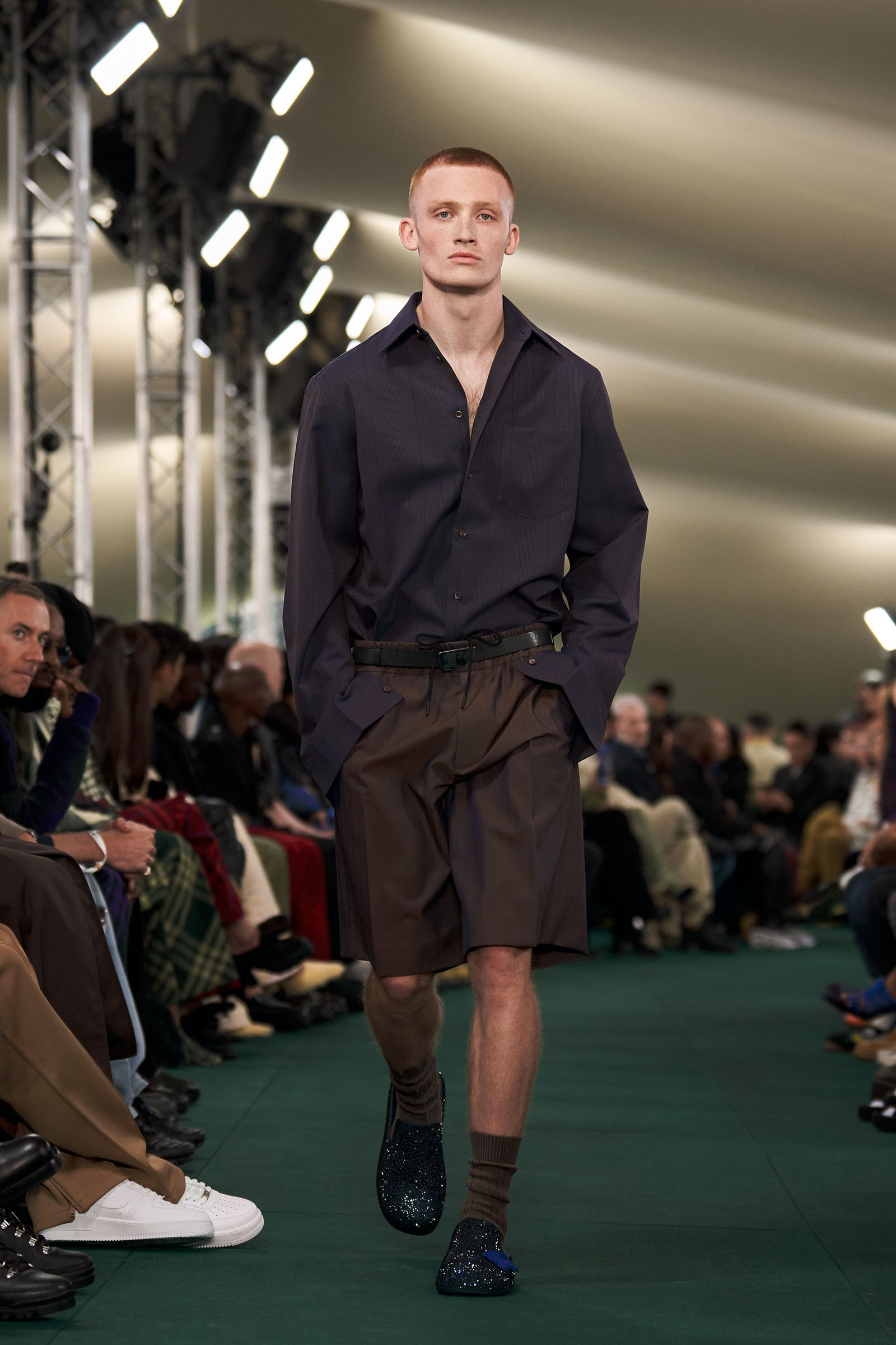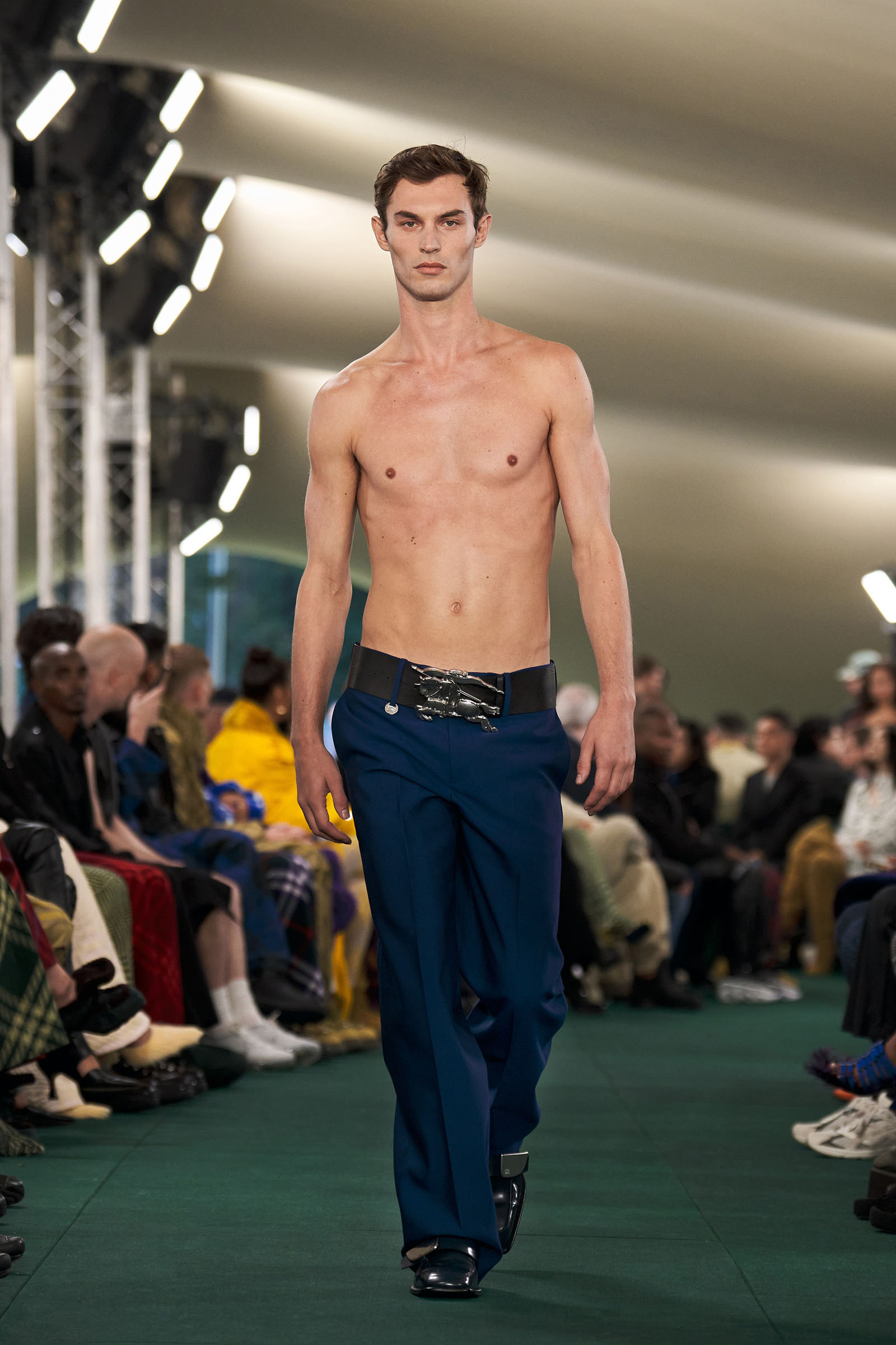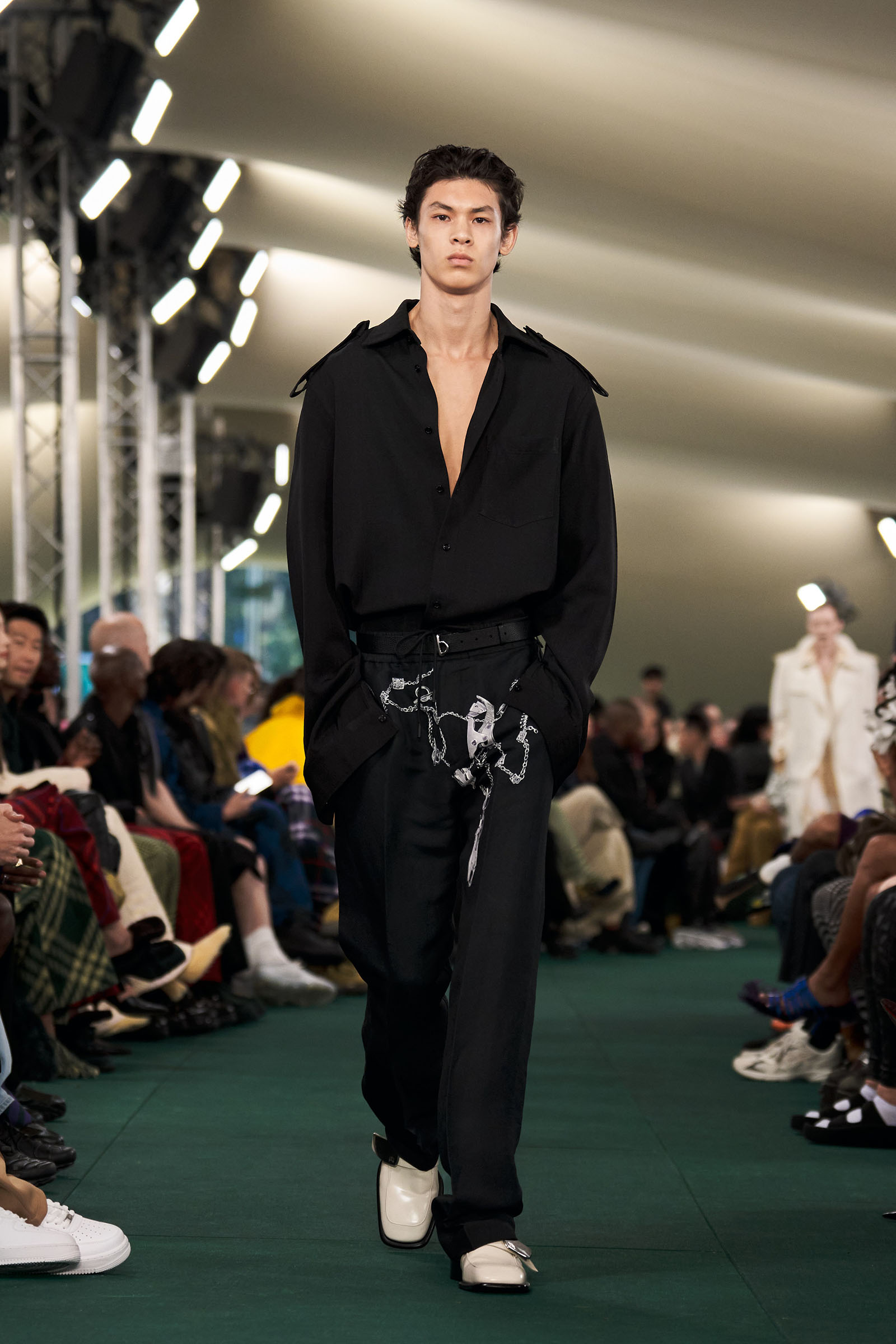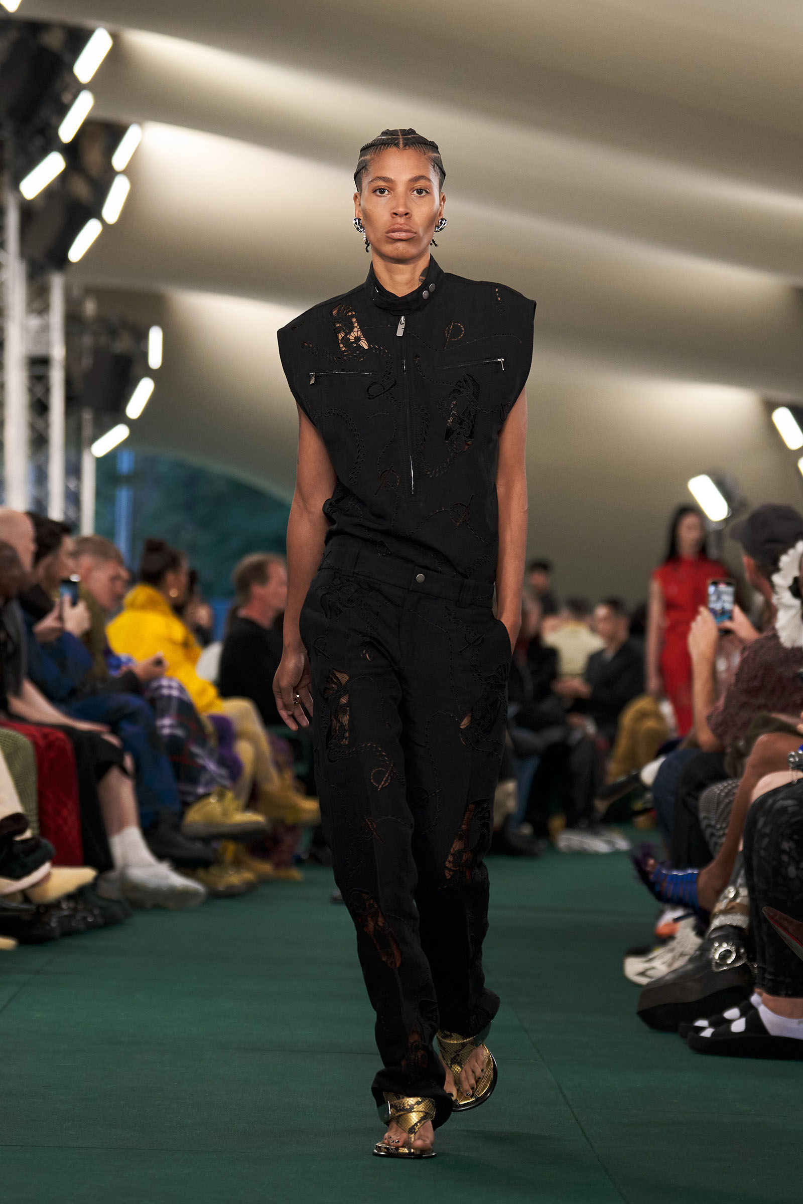 Outside the leafy local venue, there was a very English food van, dispensing Eccles cakes, Guinness bread, and cups of tea—a taste of cheerful traditional Yorkshire hospitality familiar to Lee’s upbringing in the North of England. Inside, there were green park benches, quilted green horse blankets, camping bottles, and a friendly convergence of the kind of guests who make multicultural London and Britain what they are today—actors, athletes, artists, footballers, rappers, and musicians including Kylie Minogue, Rachel Weisz, Naomi Ackie, Jason Statham, and Mo Farah. The good-natured atmosphere, somehow leveling, uplifting, and a little bit jolly had nobody strutting around behaving like look-at-me superstars. Instead, there was sitting down, chatting, smiling, and waving. And as we know, this is a rarity among the rigid dividing-lines of the social snobberies which normally pertain at a big brand fashion show.