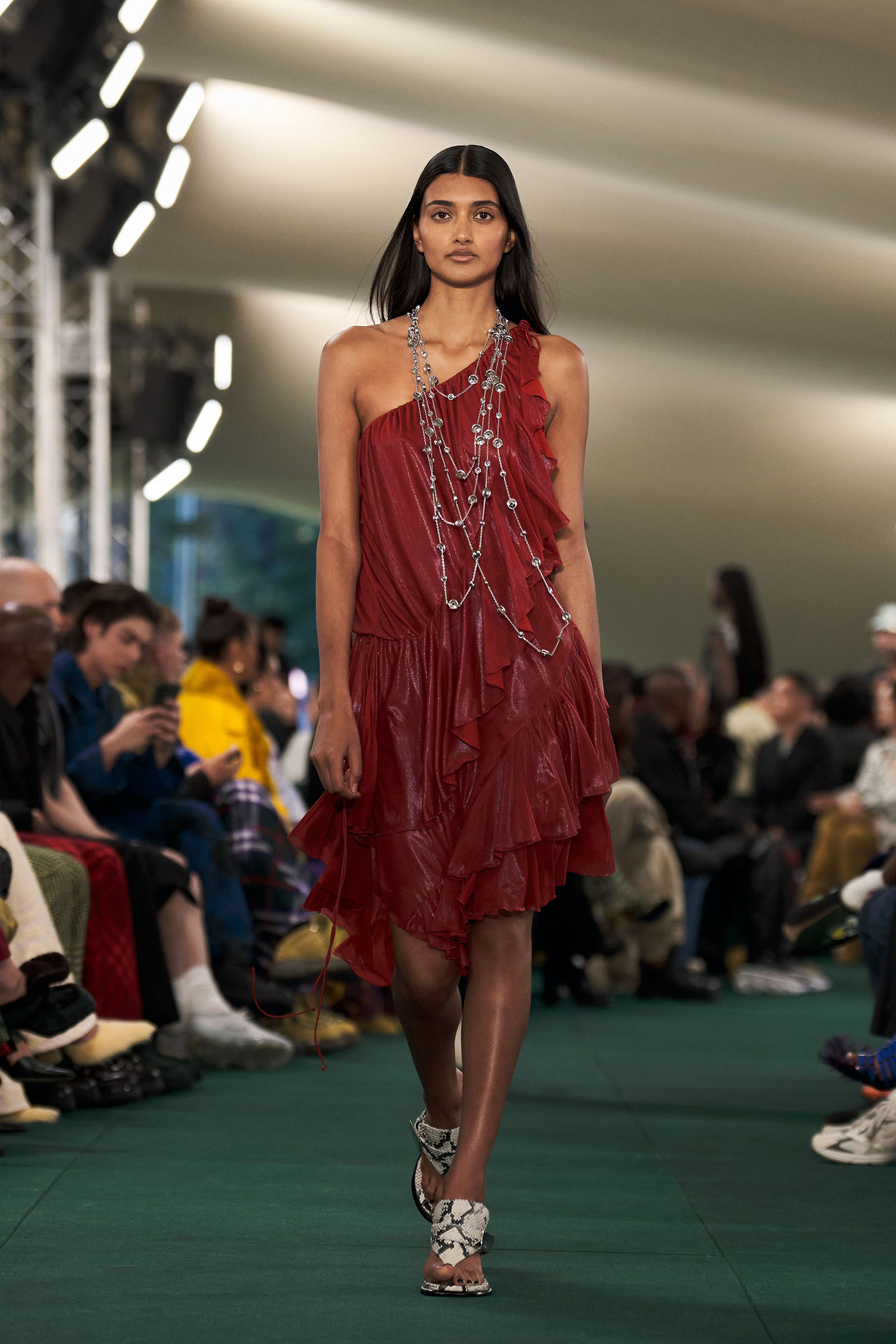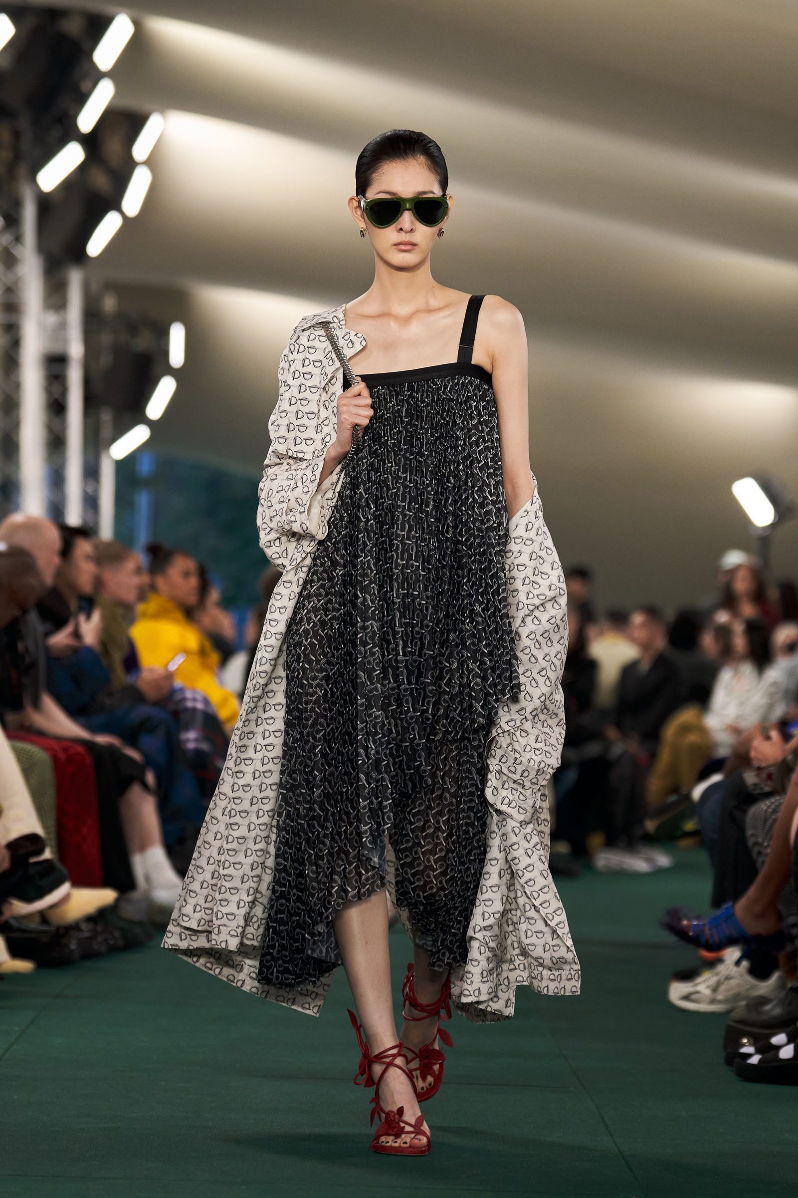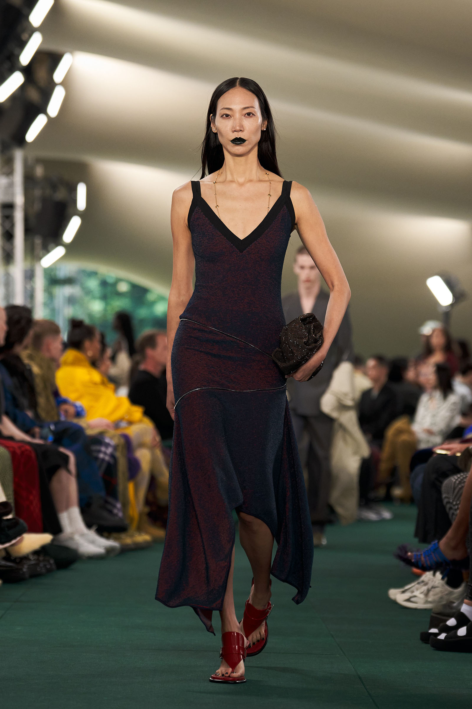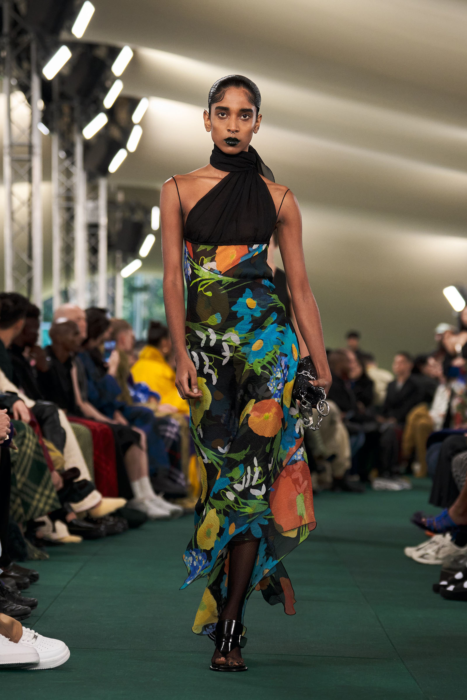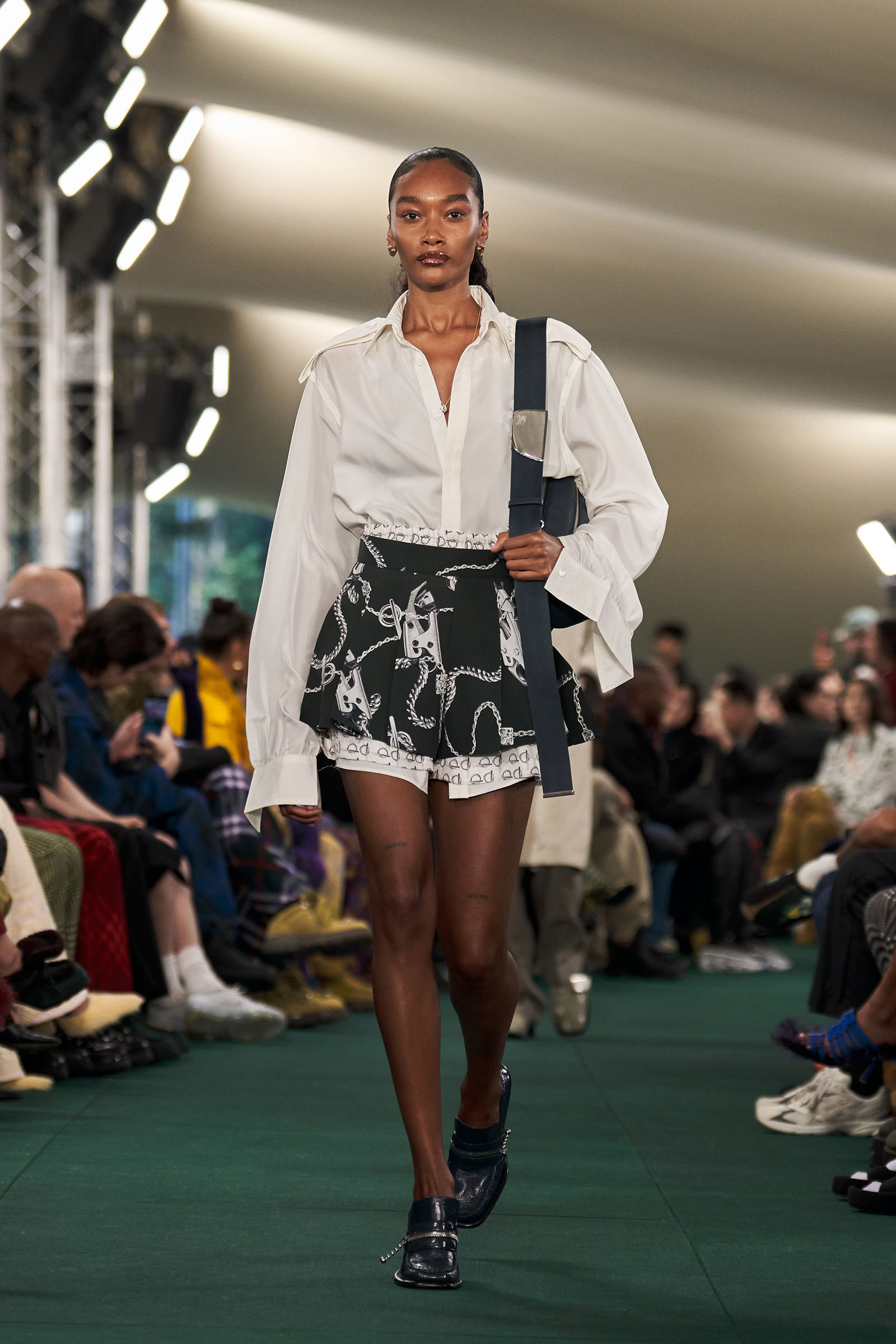 Outside the leafy local venue, there was a very English food van, dispensing Eccles cakes, Guinness bread, and cups of tea—a taste of cheerful traditional Yorkshire hospitality familiar to Lee’s upbringing in the North of England. Inside, there were green park benches, quilted green horse blankets, camping bottles, and a friendly convergence of the kind of guests who make multicultural London and Britain what they are today—actors, athletes, artists, footballers, rappers, and musicians including Kylie Minogue, Rachel Weisz, Naomi Ackie, Jason Statham, and Mo Farah. The good-natured atmosphere, somehow leveling, uplifting, and a little bit jolly had nobody strutting around behaving like look-at-me superstars. Instead, there was sitting down, chatting, smiling, and waving. And as we know, this is a rarity among the rigid dividing-lines of the social snobberies which normally pertain at a big brand fashion show.