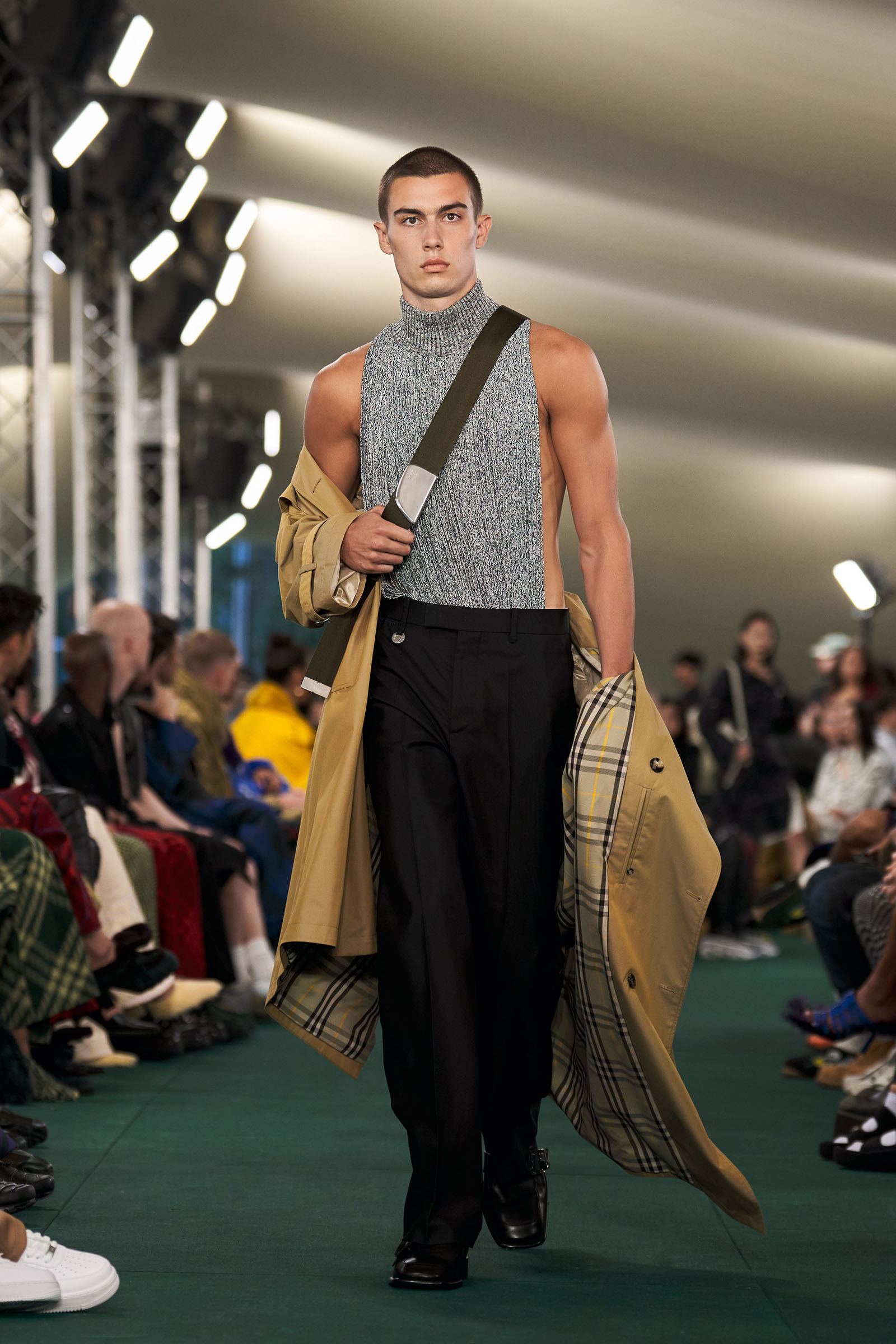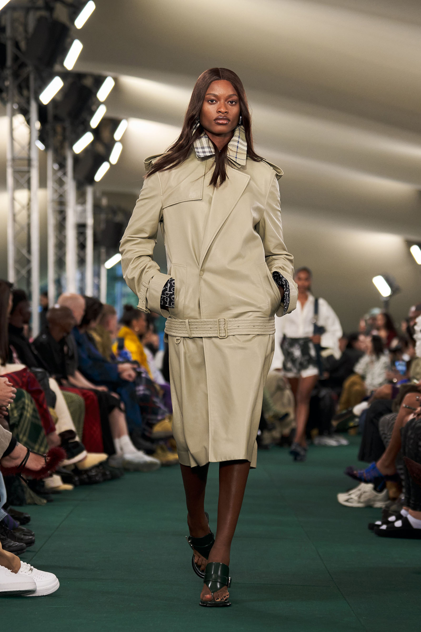 Setting a tone, a personality, and a ton of subliminal messages for the British behemoth of global fashion is what Lee has been working on at speed in all directions since he arrived last year. Giving the fashion itself a clear and relevant point of view was obviously at the crux of it. Clarity and crispness was the first impression he made on the spring runway. “We’re in a kind of frame of mind of not messing around with the trench,” he said. “To keep it precious and beautiful, and not to conceptualize. The idea of neatness and sharpness.”