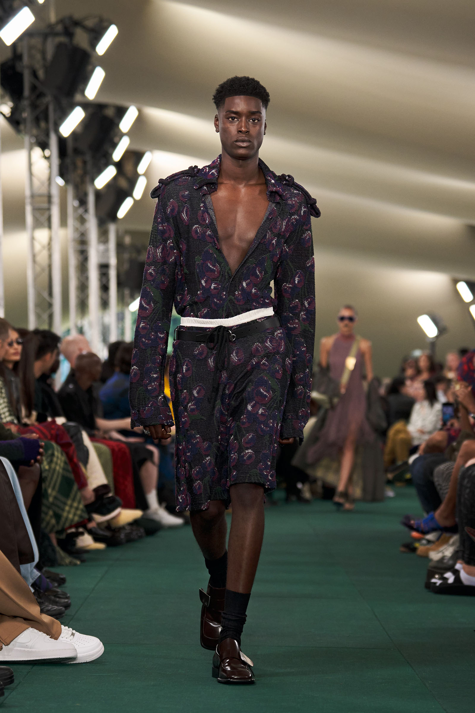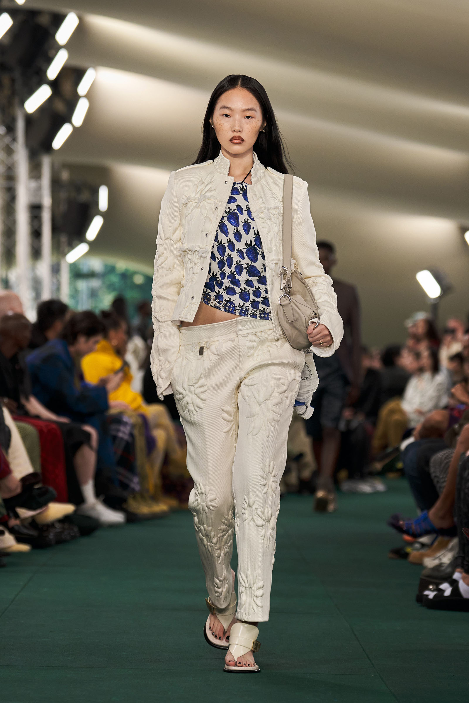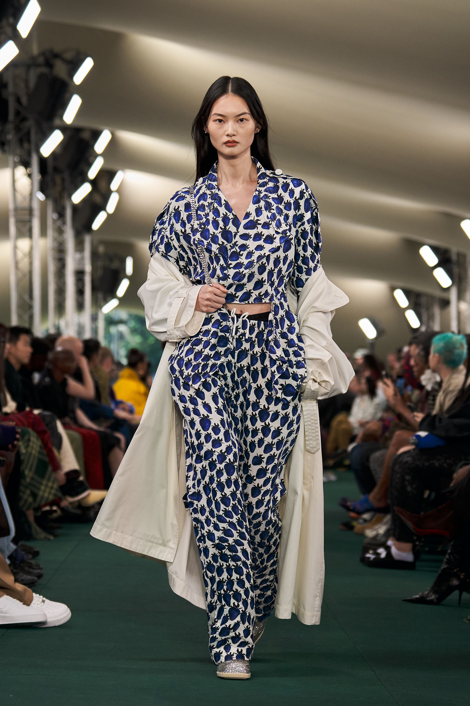 Lee had moments, too, dedicated to English summer flowers and fruit: cascading swarms of blue strawberries, blown-up meadow-flower prints. “Because it’s definitely about taking wardrobe codes, subverting them, and making them feel more London,” he said with a smile.