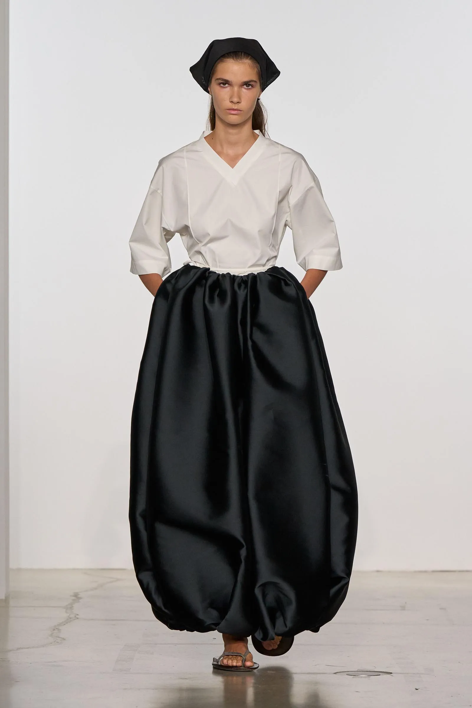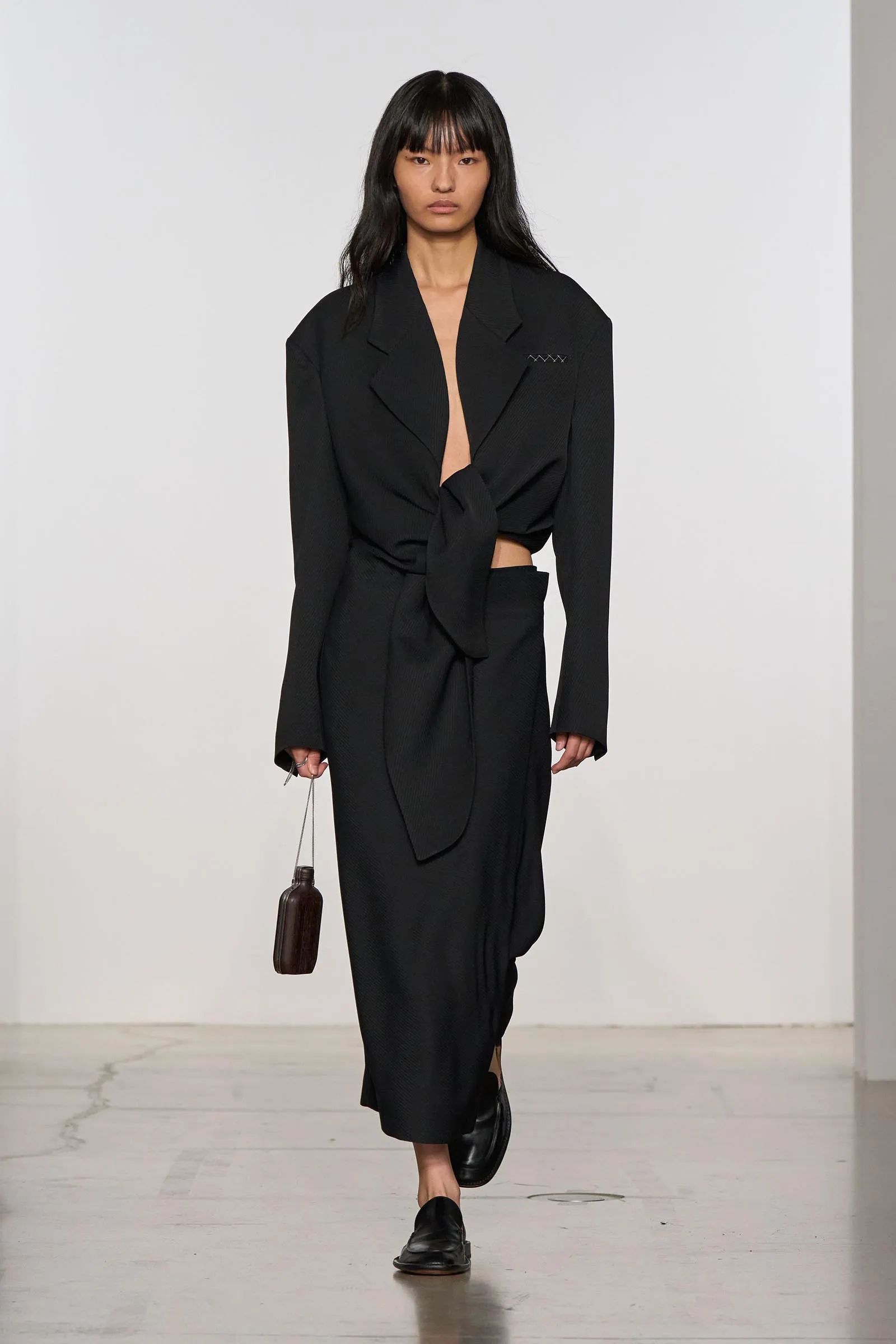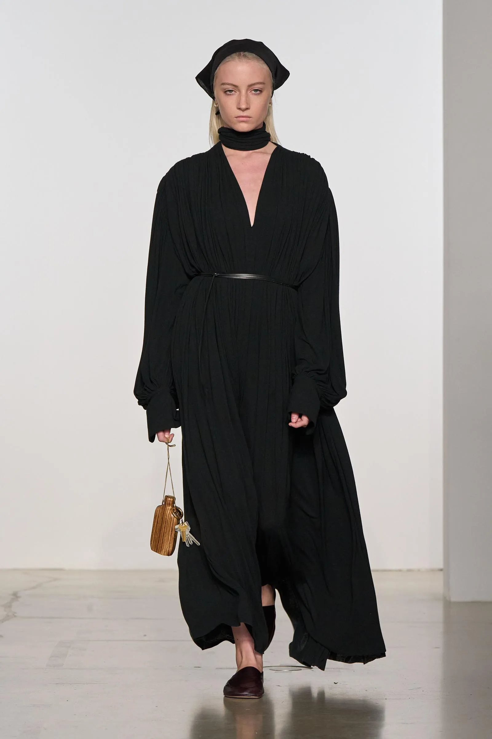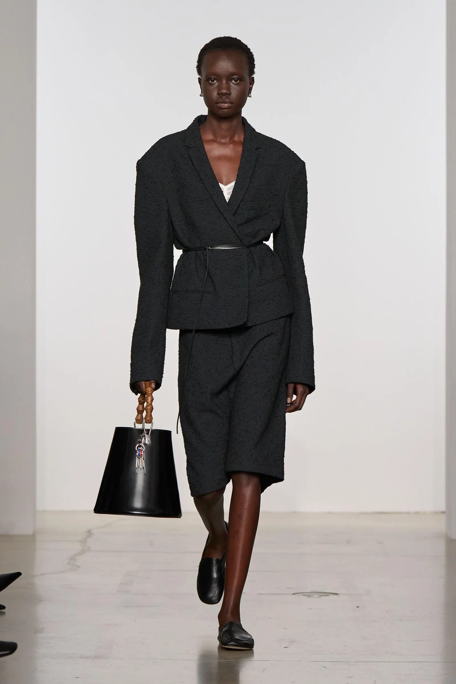 Leoni said, “I tried to split the season in two different exercises. One of course is my lens for it, and the other one is to try to get a bit more practice with the icons and try to own it my own way.” She’s a thoughtful designer, heady even, but overintellectualizing is not the Calvin way. The papery crinkled coat and dress looked overly arty, the pompoms seemed superfluous and sort of silly, and a sculpted evening dress woven from underwear waistbands may have been a technical feat, but would a woman wear it? Klein was always stripping excesses away in his efforts to land on something that looked modern. There’s rigor in that, but also a kind of relaxation.
