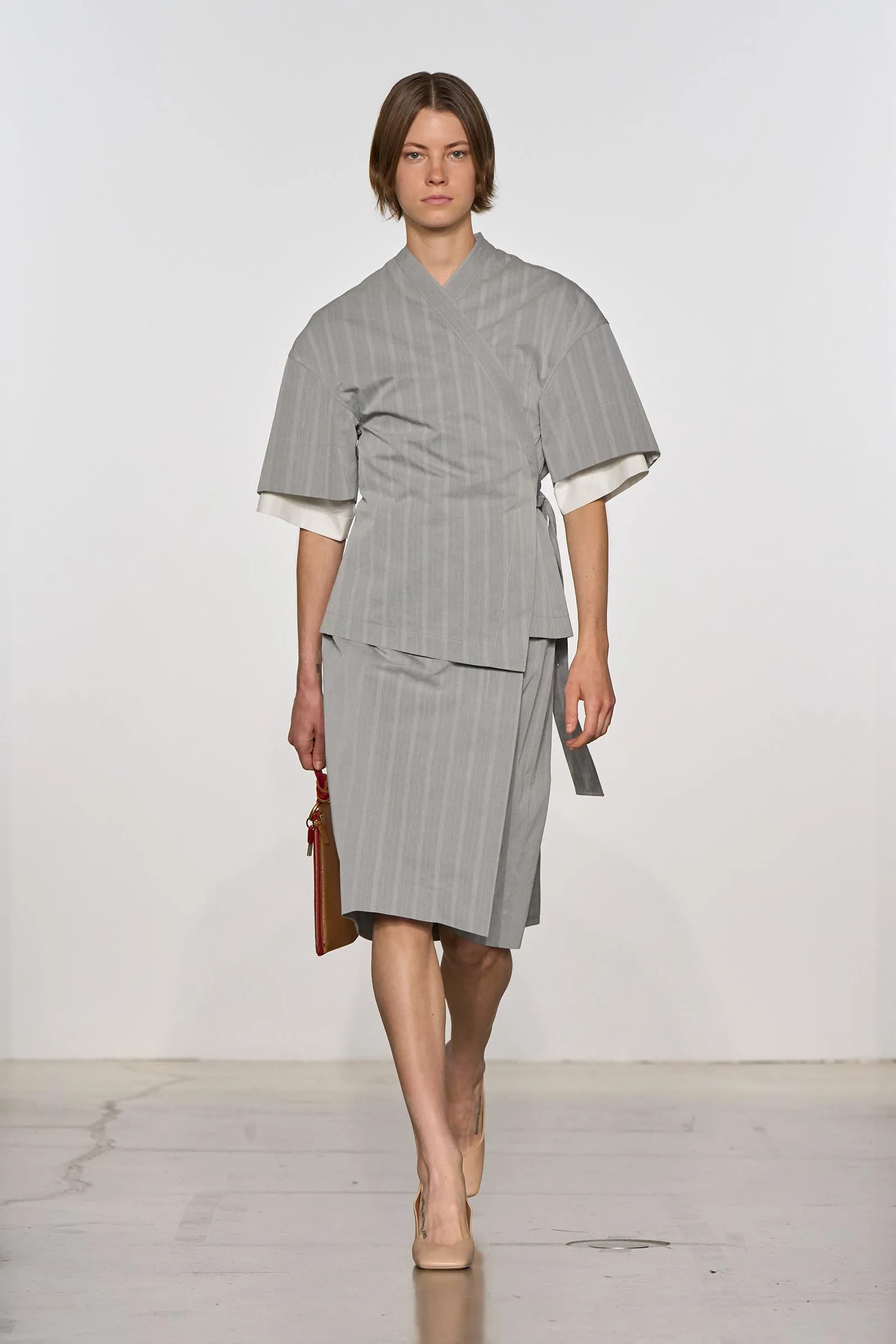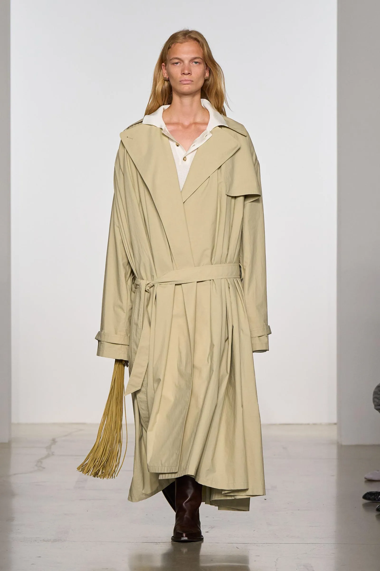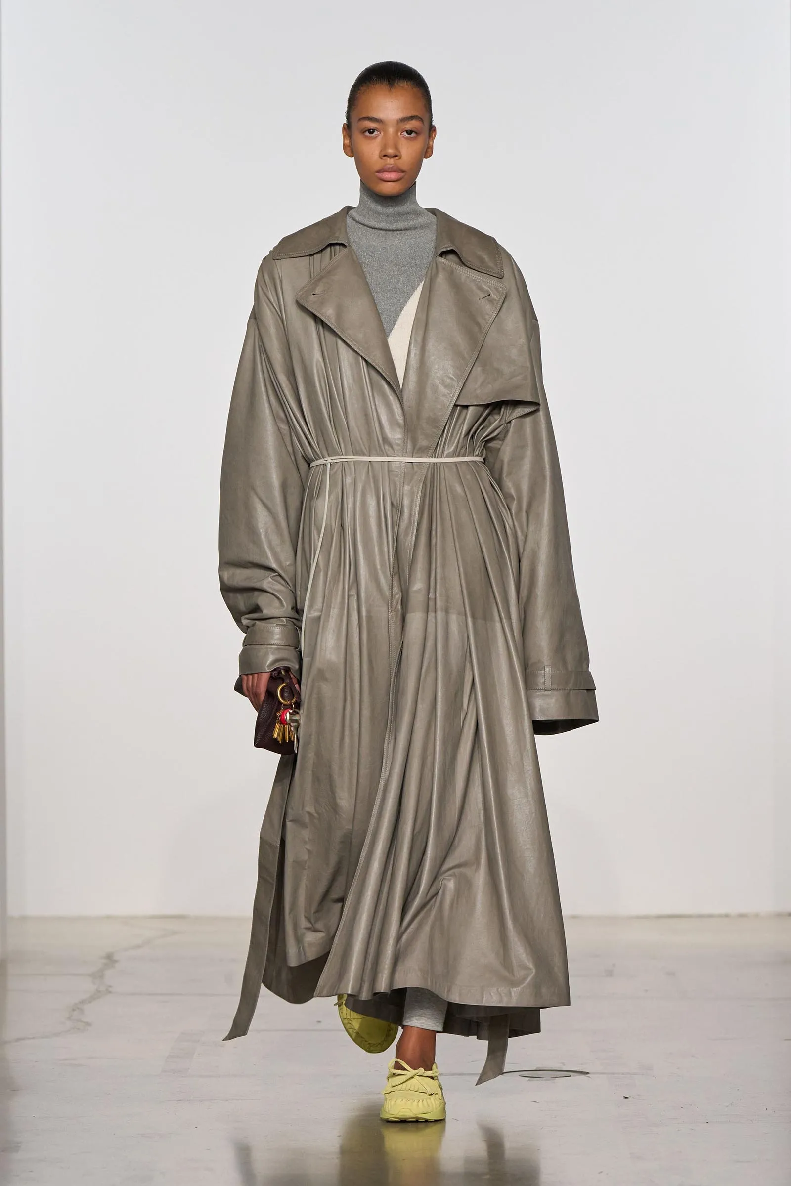 Some of the looks caught that sense of offhanded chic in more straightforward ways. The models in the brown double-collar trench over boots and jeans and the paper-thin leather bomber teamed with chinos really did look like East Village girls. The “broken” suits with mismatched jackets and pants were convincing too.