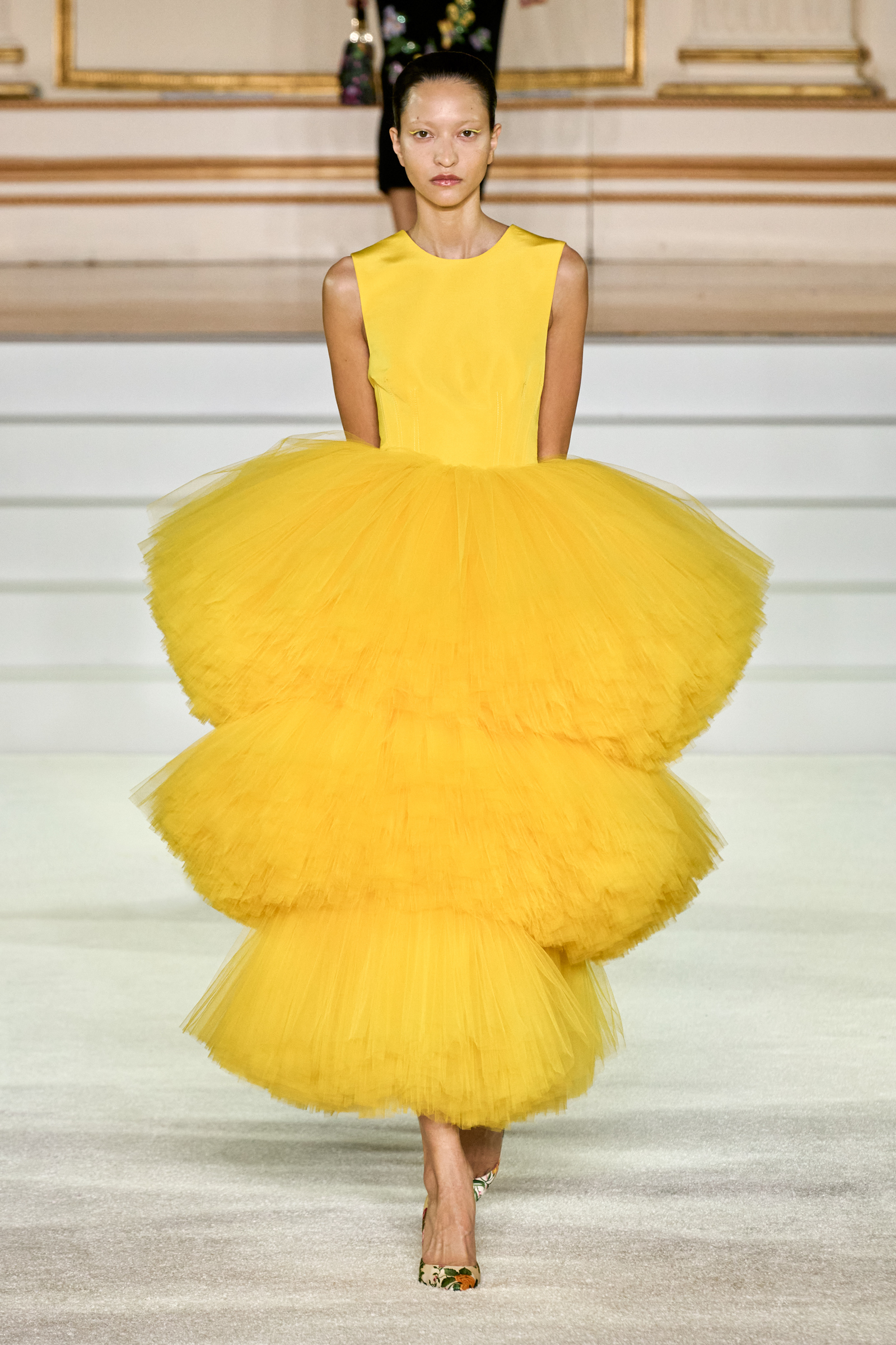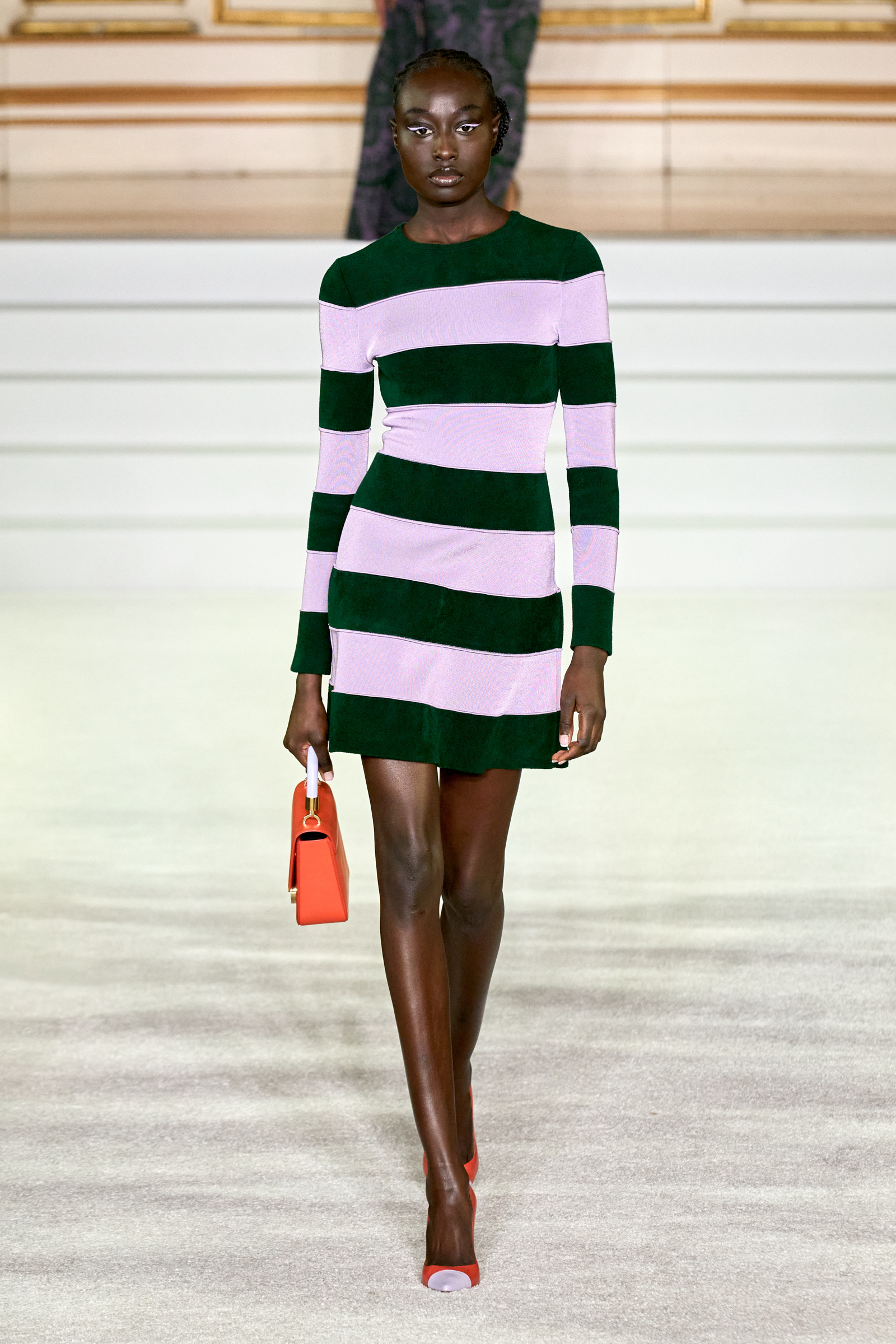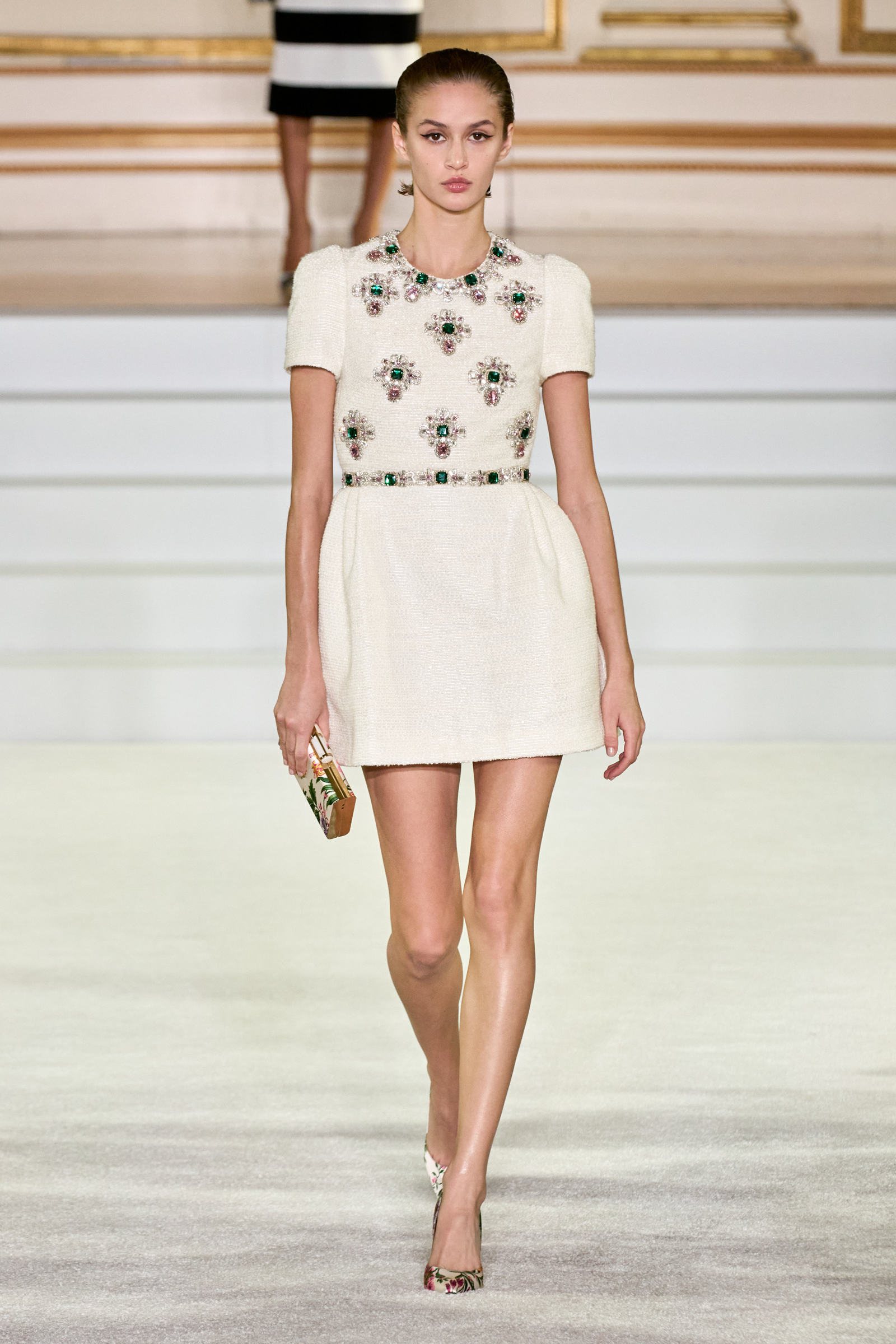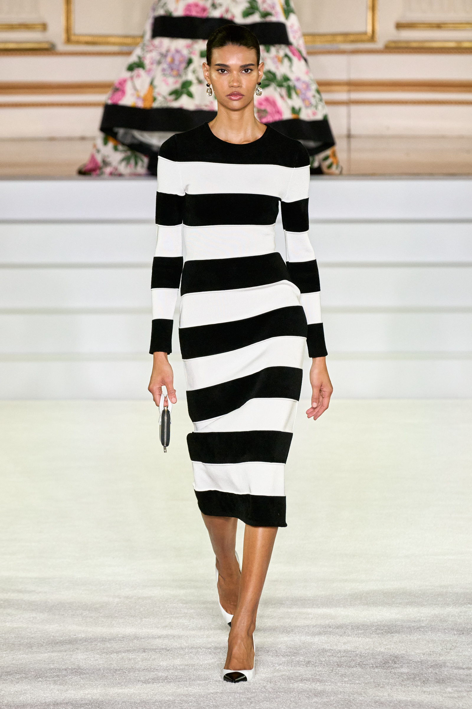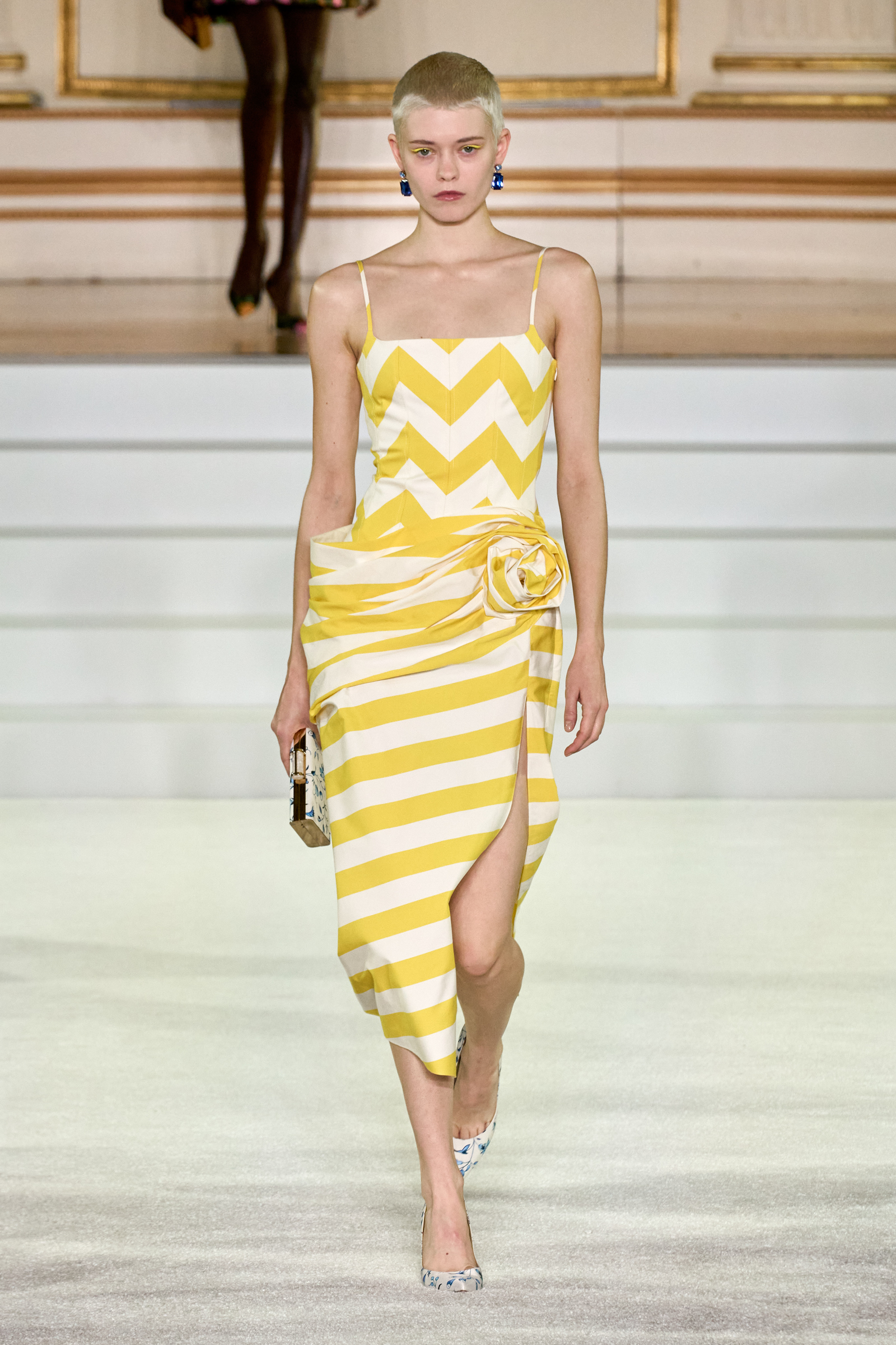 We were back in a ballroom at the Plaza for today’s show. As the models emerged from backstage, they paused before descending a staircase. That was fitting: Gordon specializes in entrance makers, no matter the occasion. Beforehand he said he likes to blend the distinctions between day and night, which meant that a short skirt suit was embellished with clusters of large crystals, while a fitted sheath was cut from yellow and white striped cotton poplin. Gordon is feeling more at home at Herrera than ever. Backstage he mentioned the Netflix series The Empress, which centers around the 19th century Viennese court of Sisi of Austria; he identifies with it because “the same combination is what made Mrs. Herrera and what made the house—that discipline and severity with the flamboyance.”