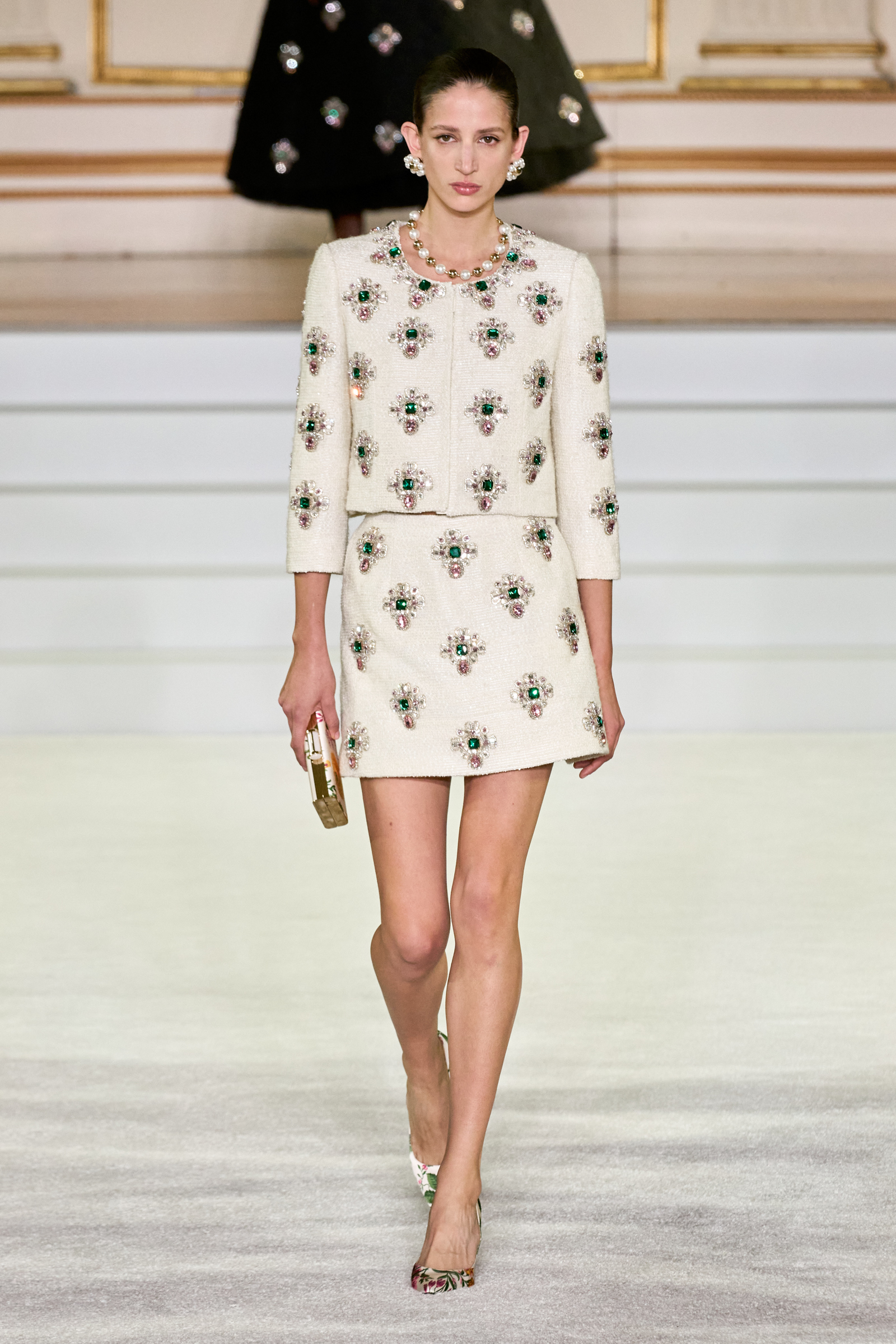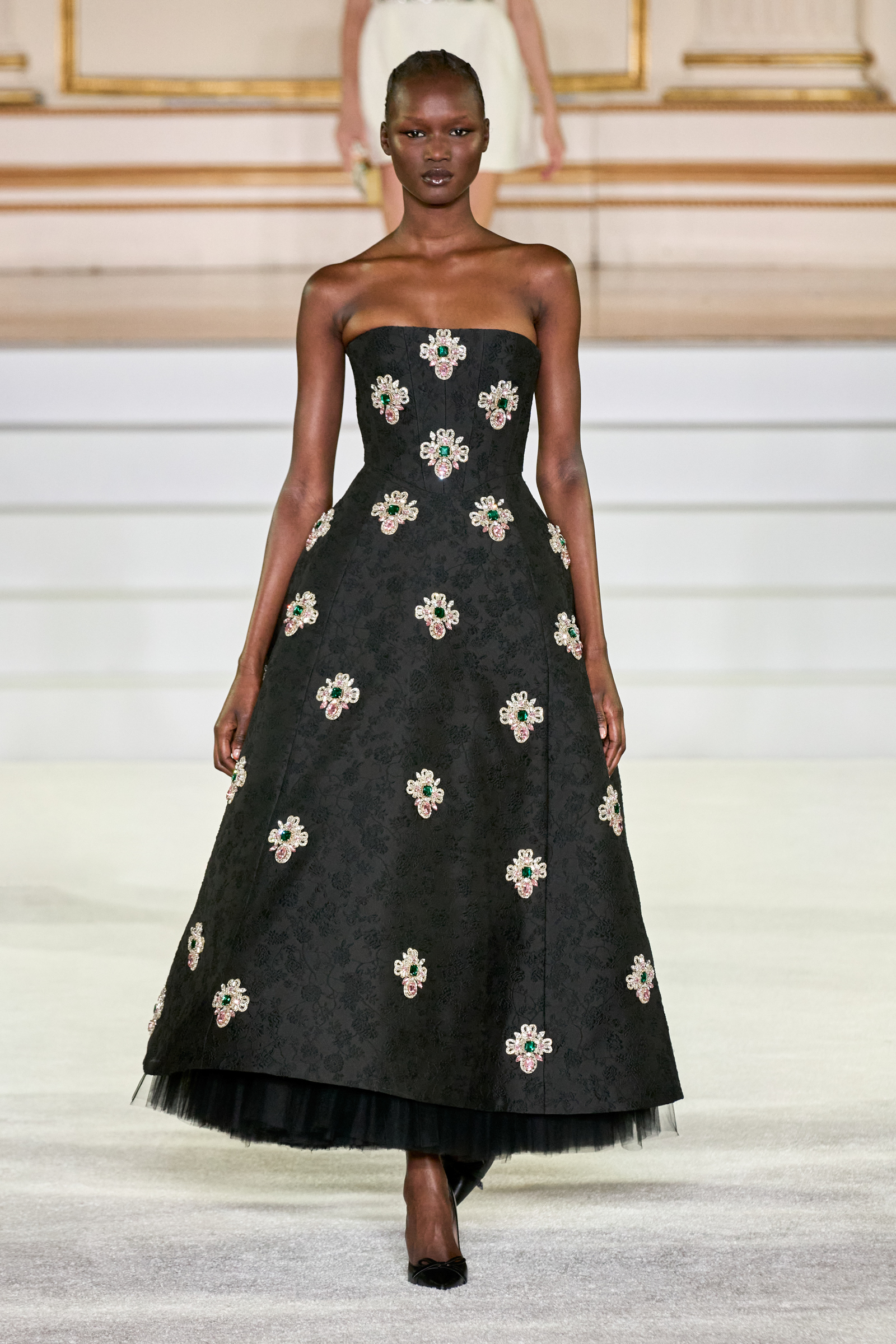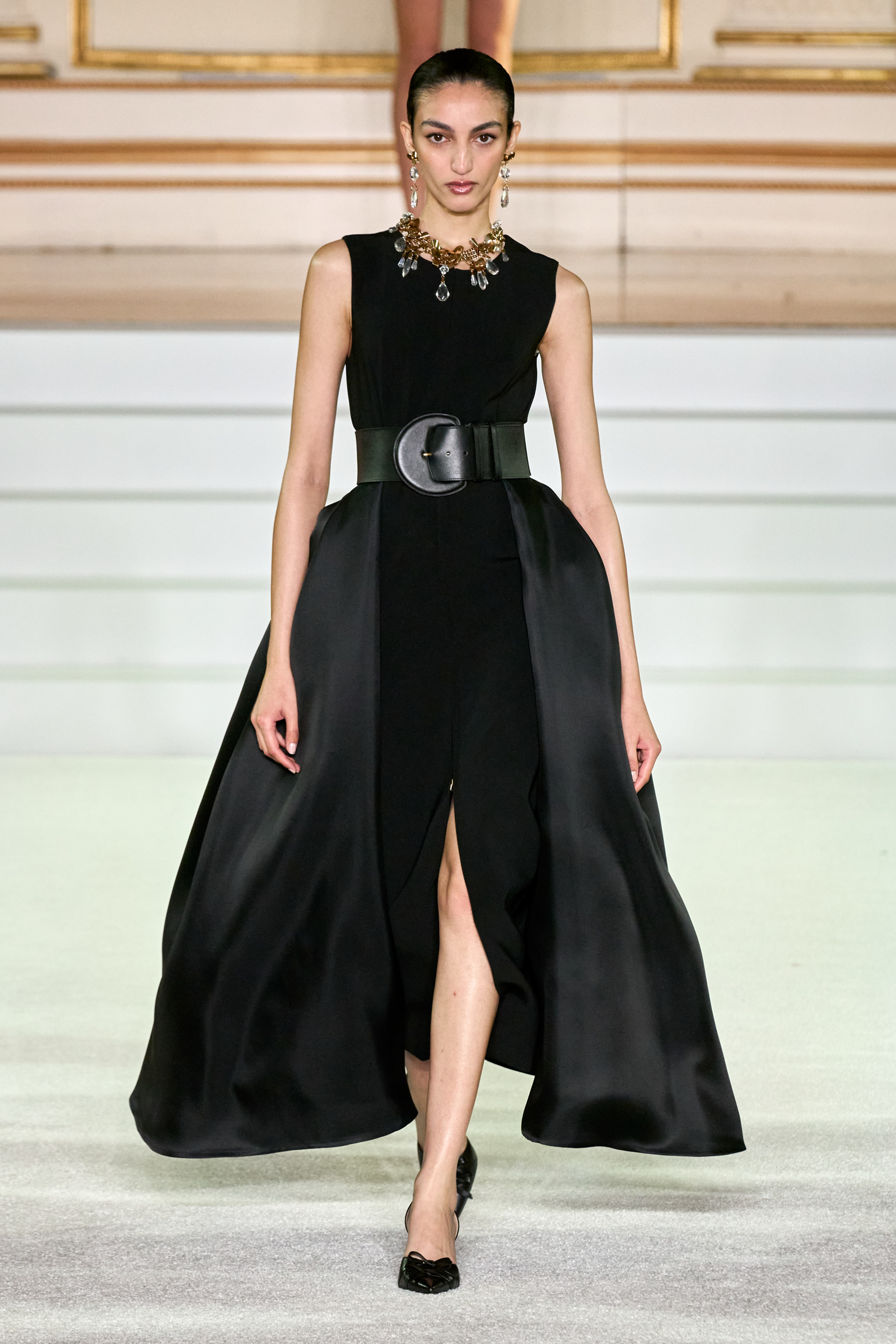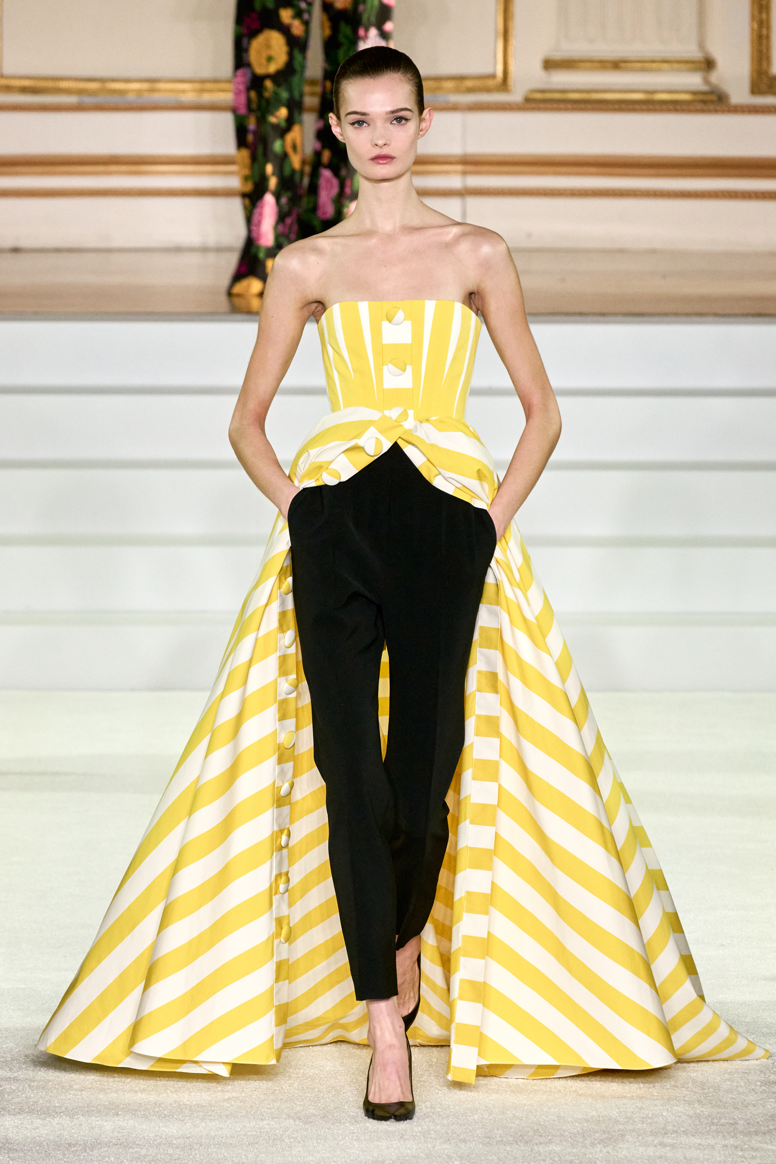 We were back in a ballroom at the Plaza for today’s show. As the models emerged from backstage, they paused before descending a staircase. That was fitting: Gordon specializes in entrance makers, no matter the occasion. Beforehand he said he likes to blend the distinctions between day and night, which meant that a short skirt suit was embellished with clusters of large crystals, while a fitted sheath was cut from yellow and white striped cotton poplin. Gordon is feeling more at home at Herrera than ever. Backstage he mentioned the Netflix series The Empress, which centers around the 19th century Viennese court of Sisi of Austria; he identifies with it because “the same combination is what made Mrs. Herrera and what made the house—that discipline and severity with the flamboyance.”