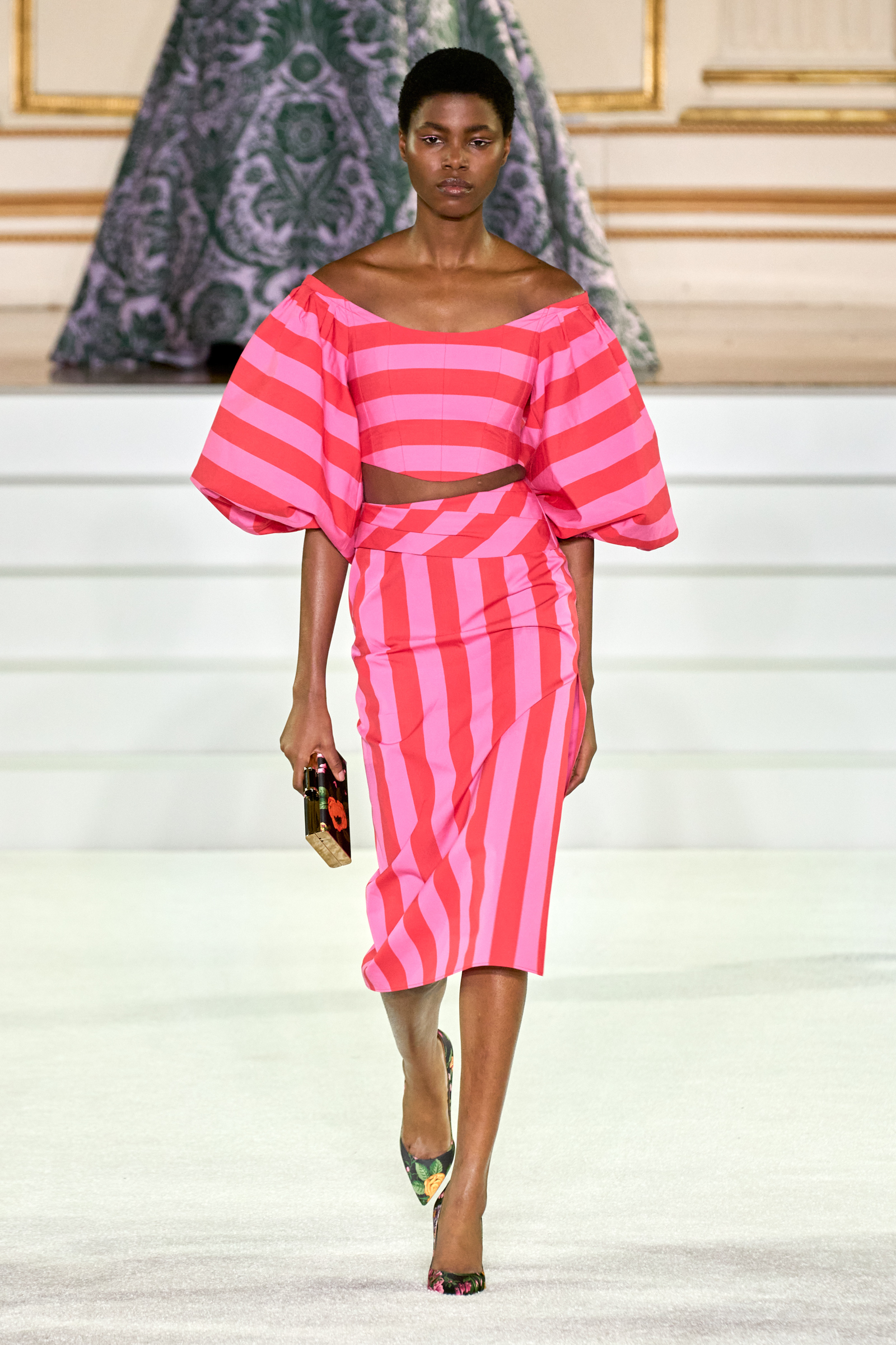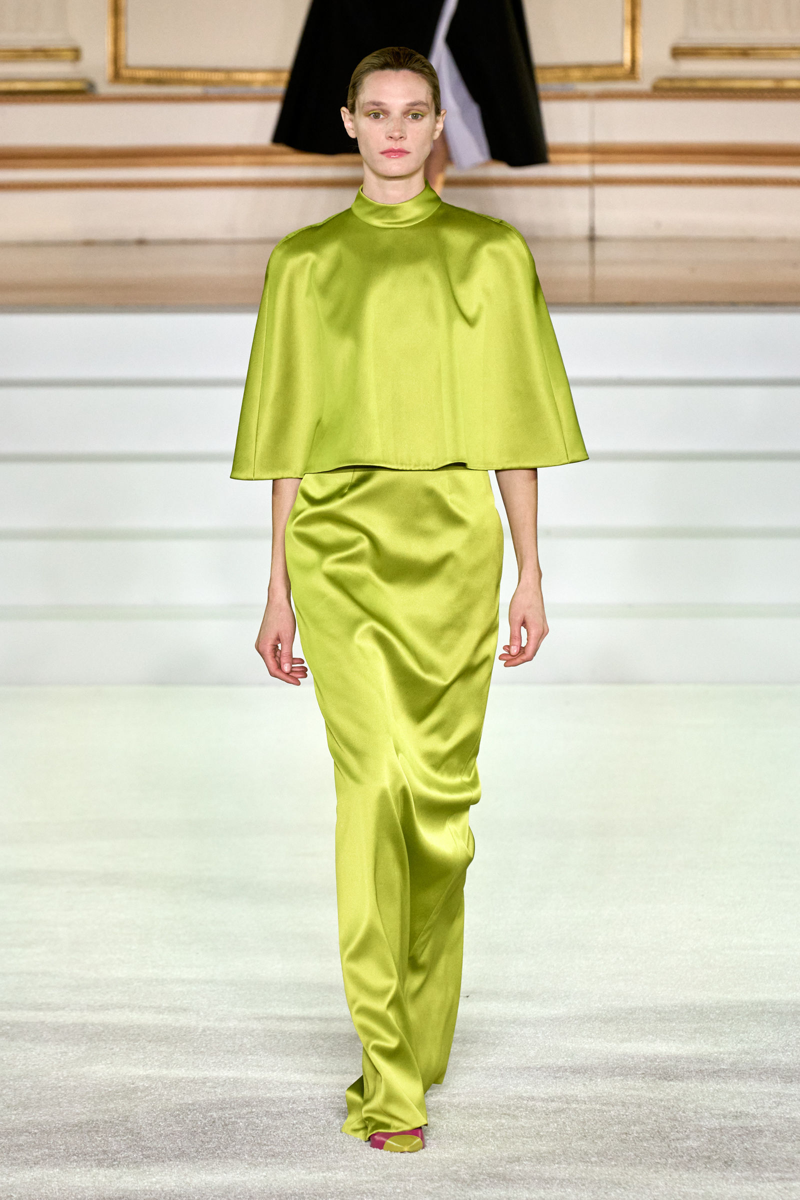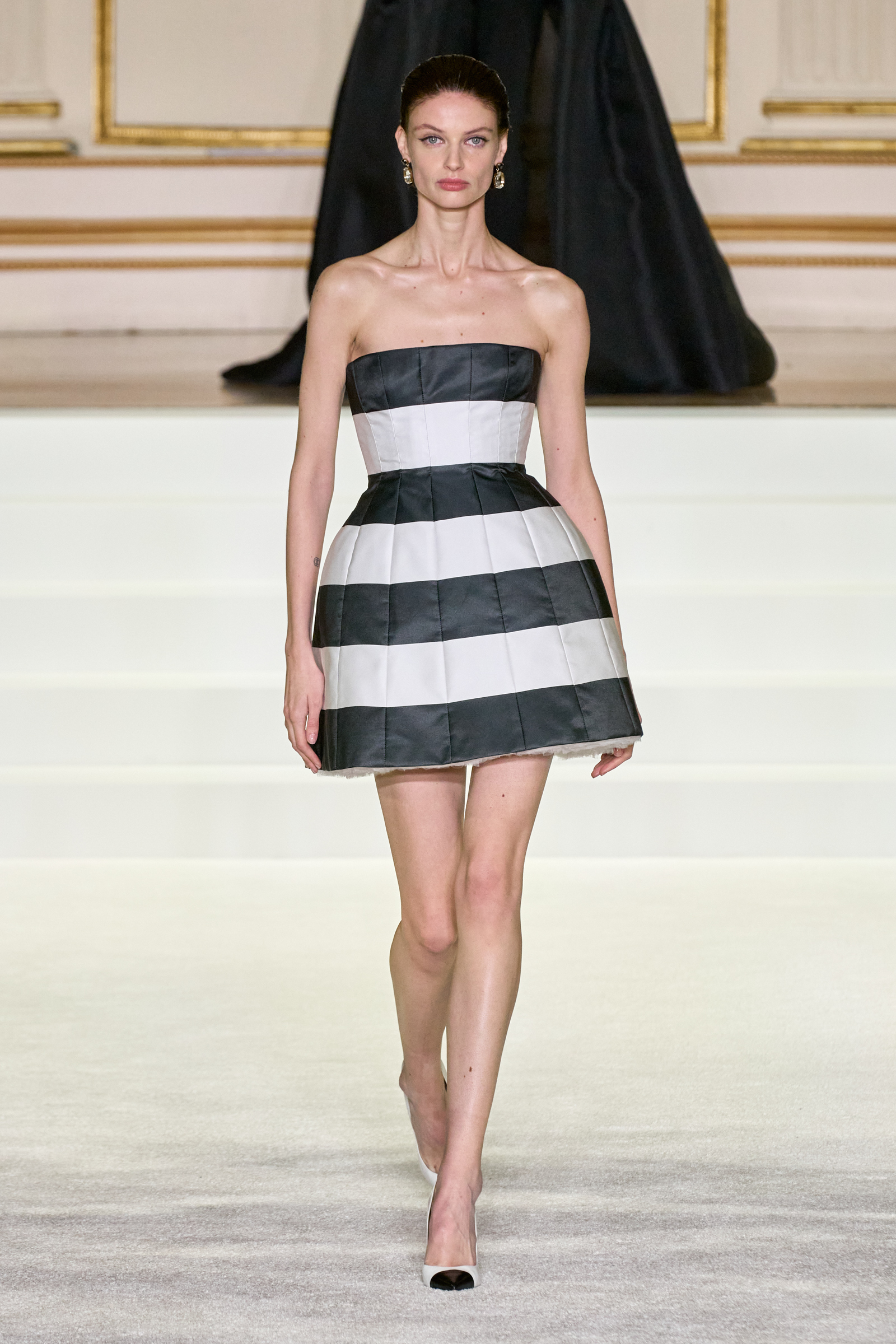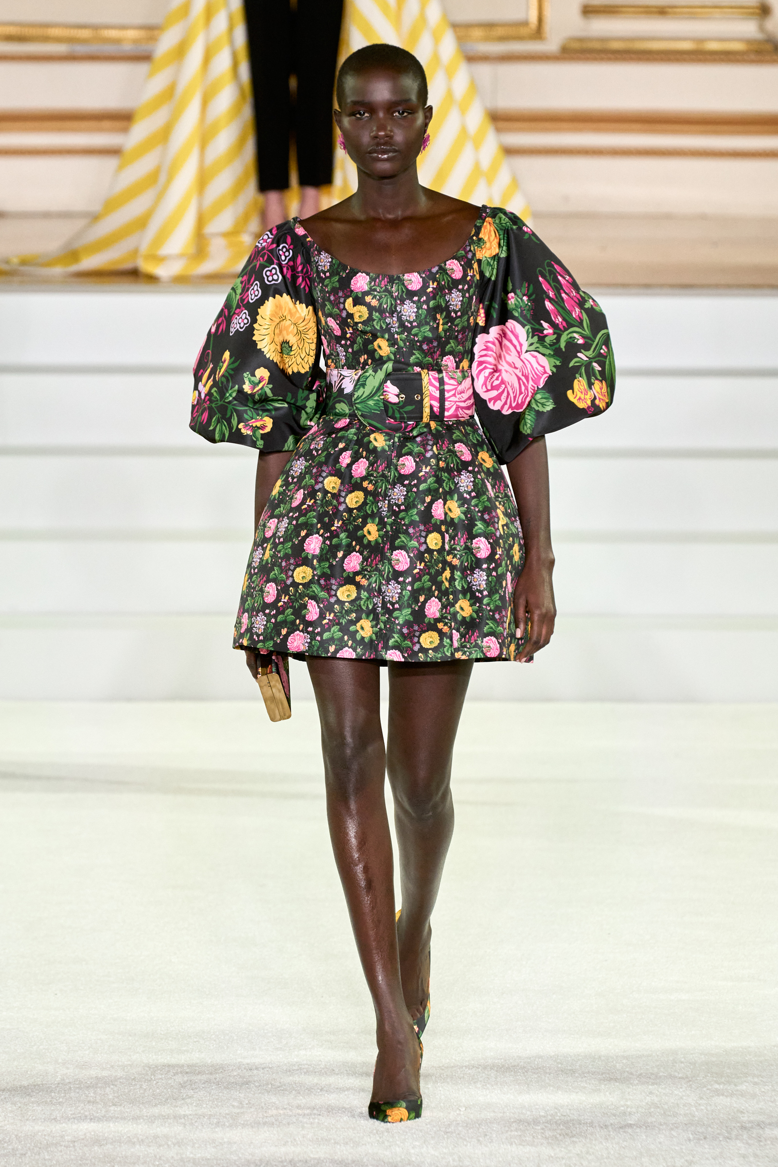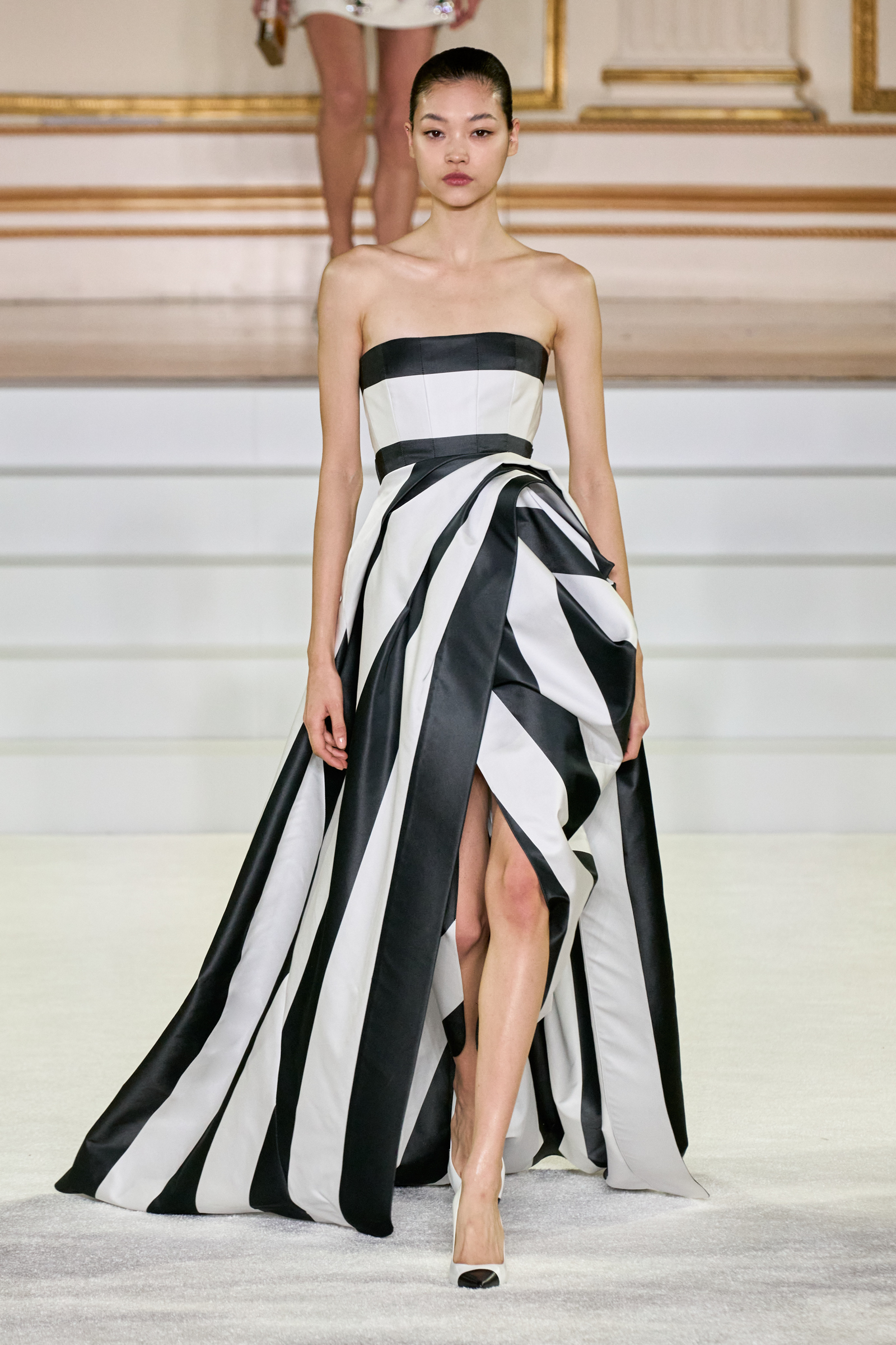 We were back in a ballroom at the Plaza for today’s show. As the models emerged from backstage, they paused before descending a staircase. That was fitting: Gordon specializes in entrance makers, no matter the occasion. Beforehand he said he likes to blend the distinctions between day and night, which meant that a short skirt suit was embellished with clusters of large crystals, while a fitted sheath was cut from yellow and white striped cotton poplin. Gordon is feeling more at home at Herrera than ever. Backstage he mentioned the Netflix series The Empress, which centers around the 19th century Viennese court of Sisi of Austria; he identifies with it because “the same combination is what made Mrs. Herrera and what made the house—that discipline and severity with the flamboyance.”