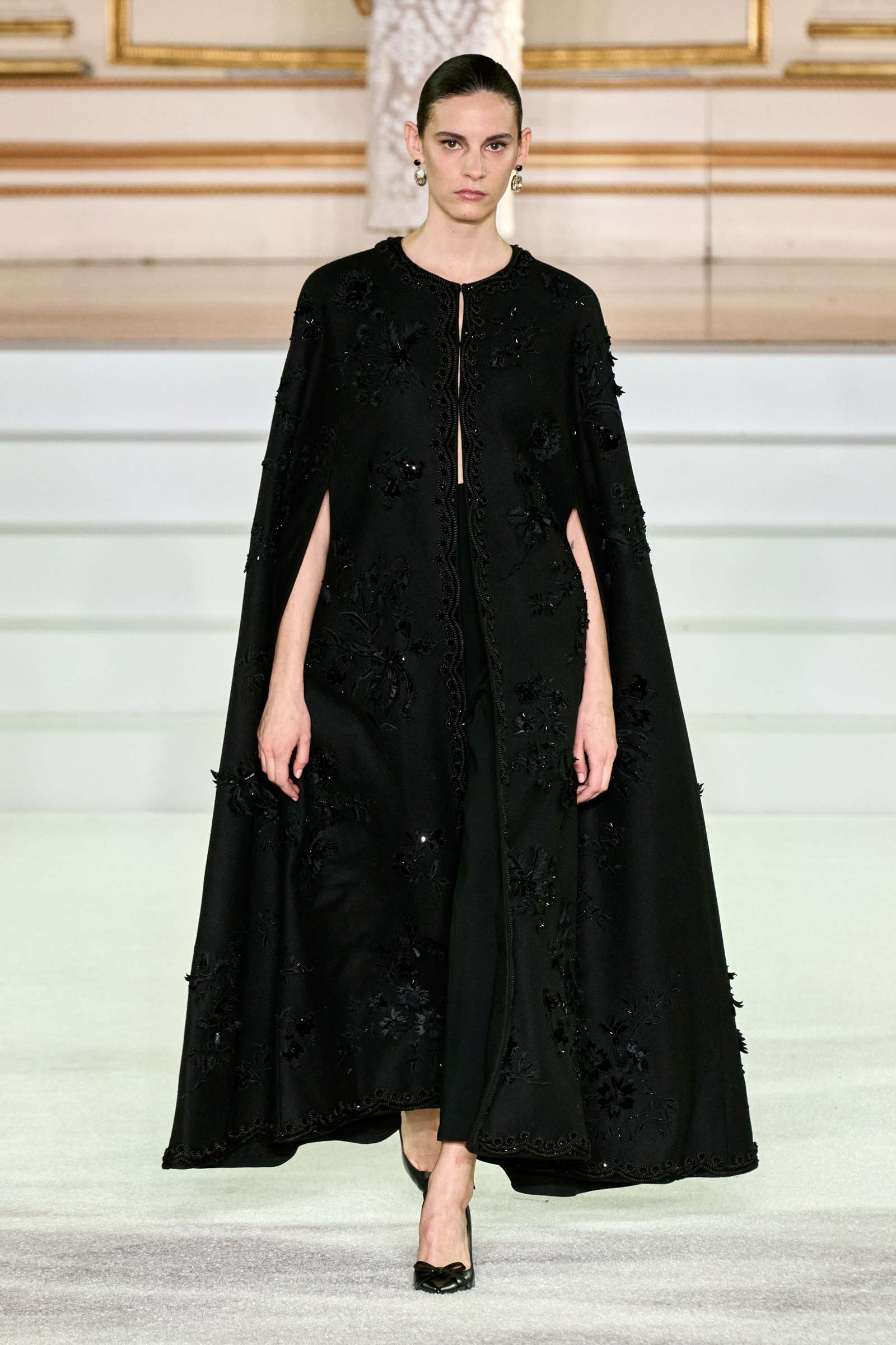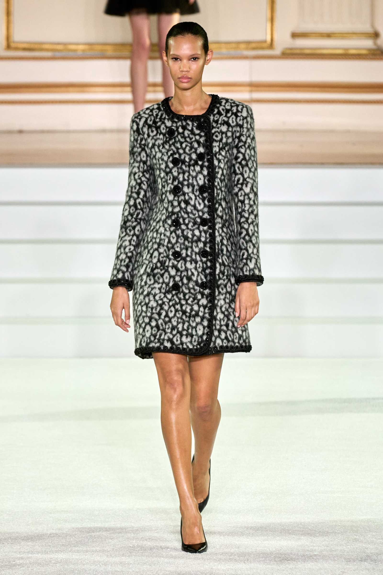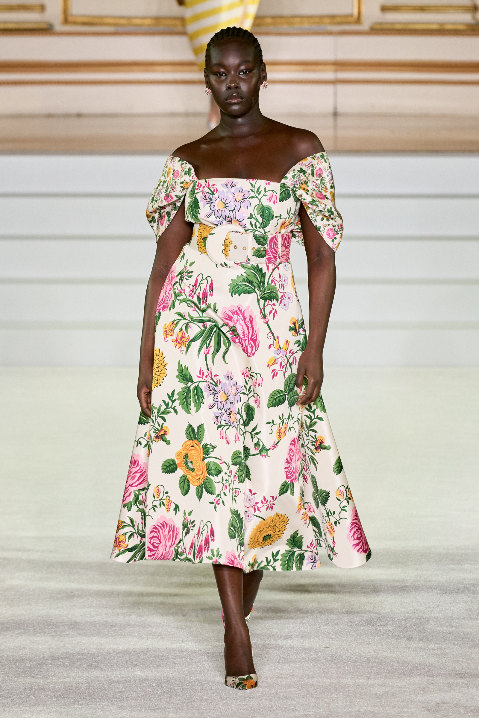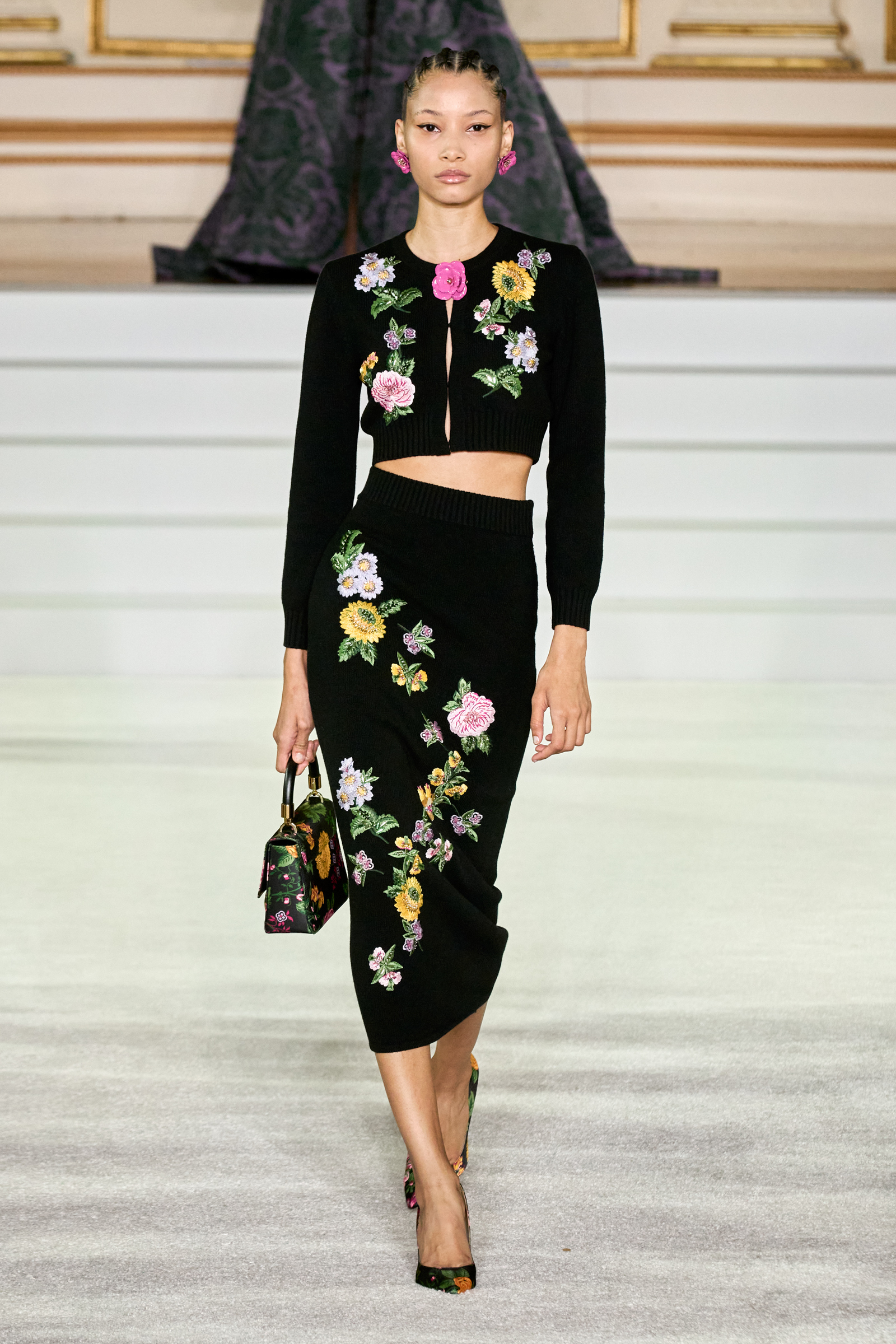 We were back in a ballroom at the Plaza for today’s show. As the models emerged from backstage, they paused before descending a staircase. That was fitting: Gordon specializes in entrance makers, no matter the occasion. Beforehand he said he likes to blend the distinctions between day and night, which meant that a short skirt suit was embellished with clusters of large crystals, while a fitted sheath was cut from yellow and white striped cotton poplin. Gordon is feeling more at home at Herrera than ever. Backstage he mentioned the Netflix series The Empress, which centers around the 19th century Viennese court of Sisi of Austria; he identifies with it because “the same combination is what made Mrs. Herrera and what made the house—that discipline and severity with the flamboyance.”