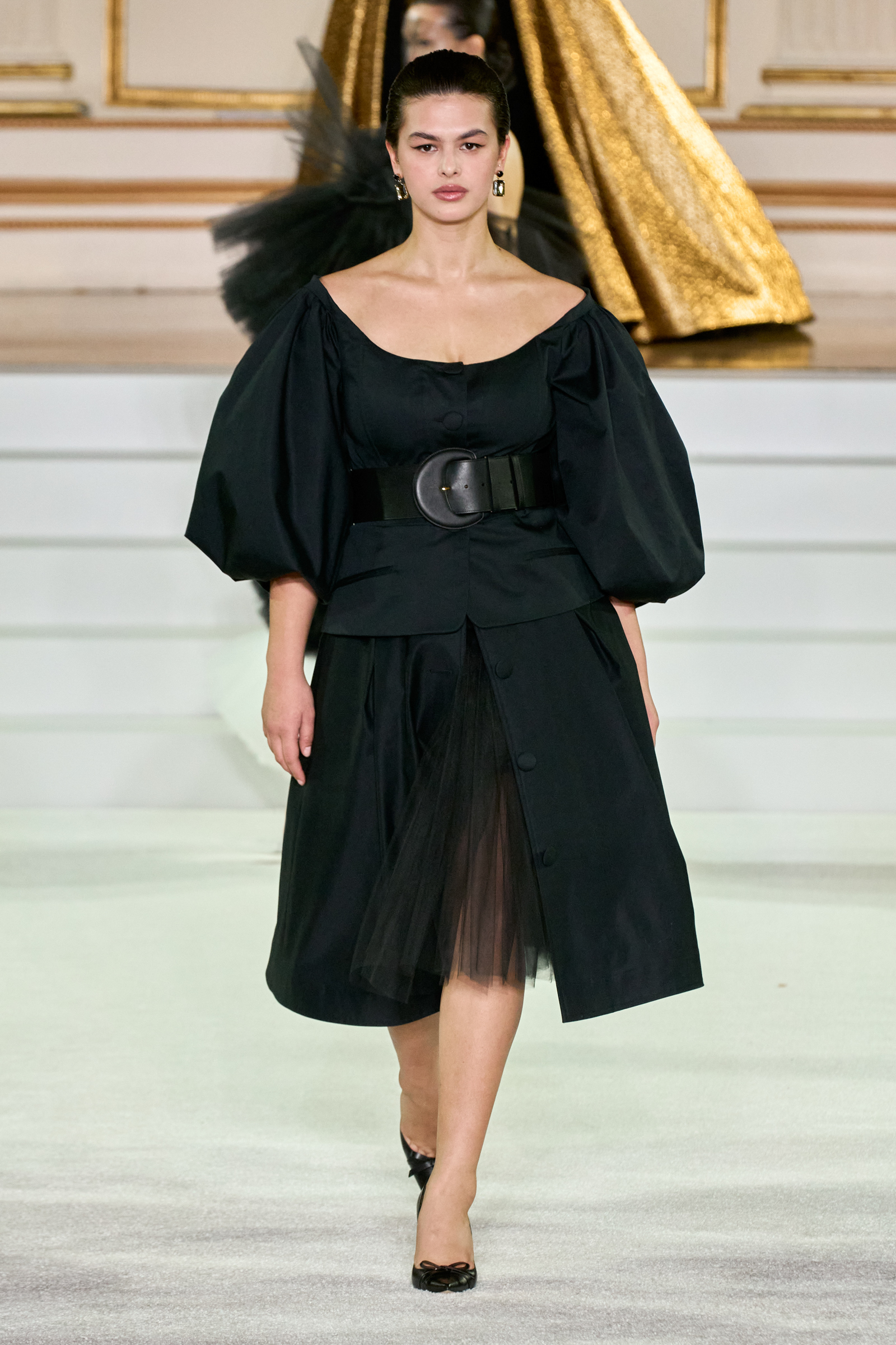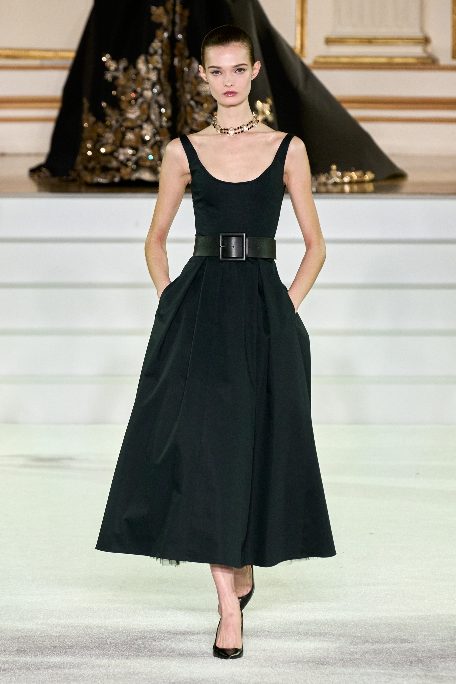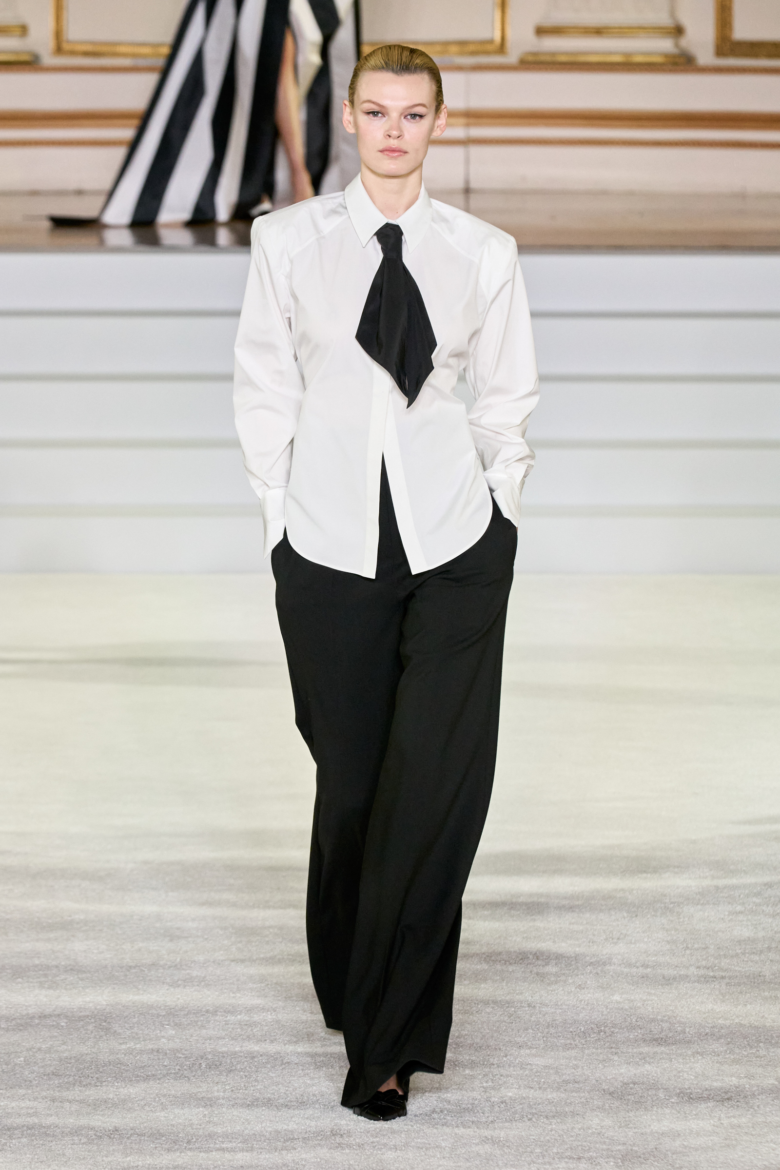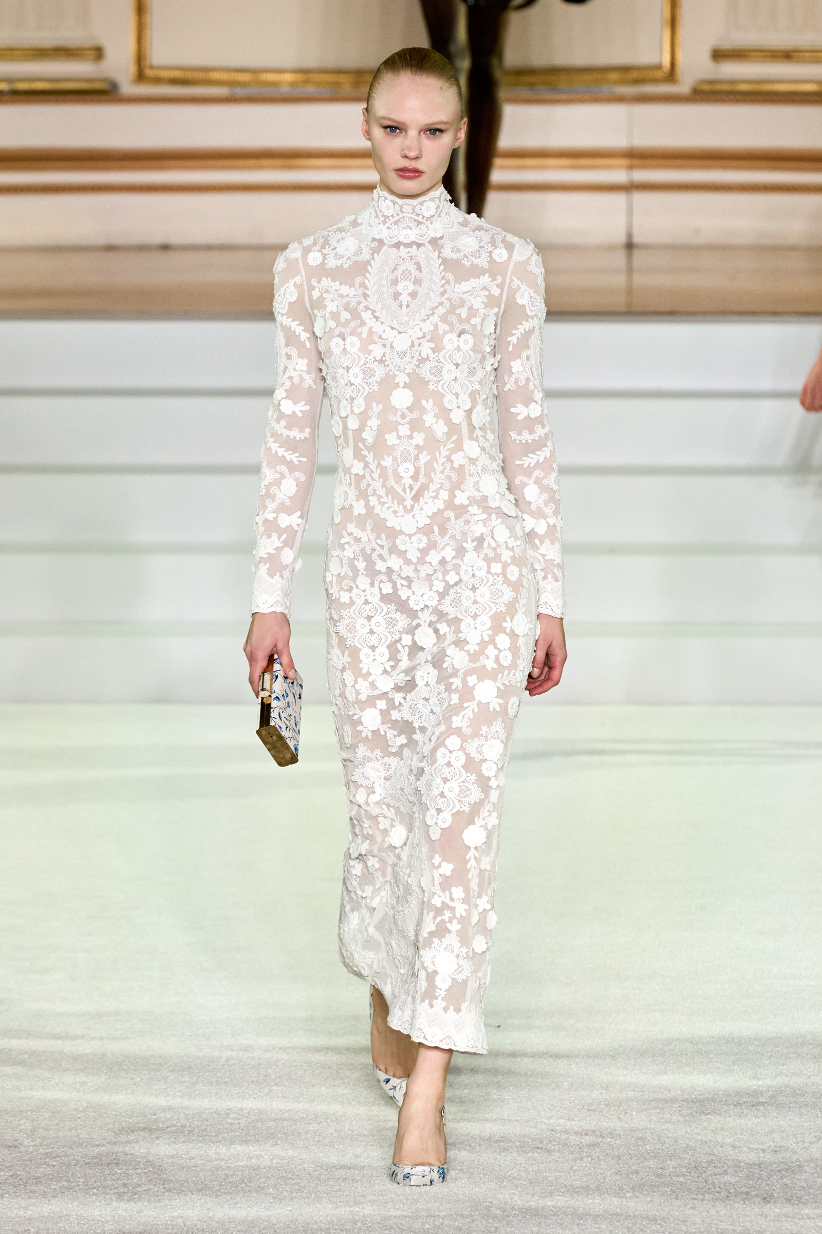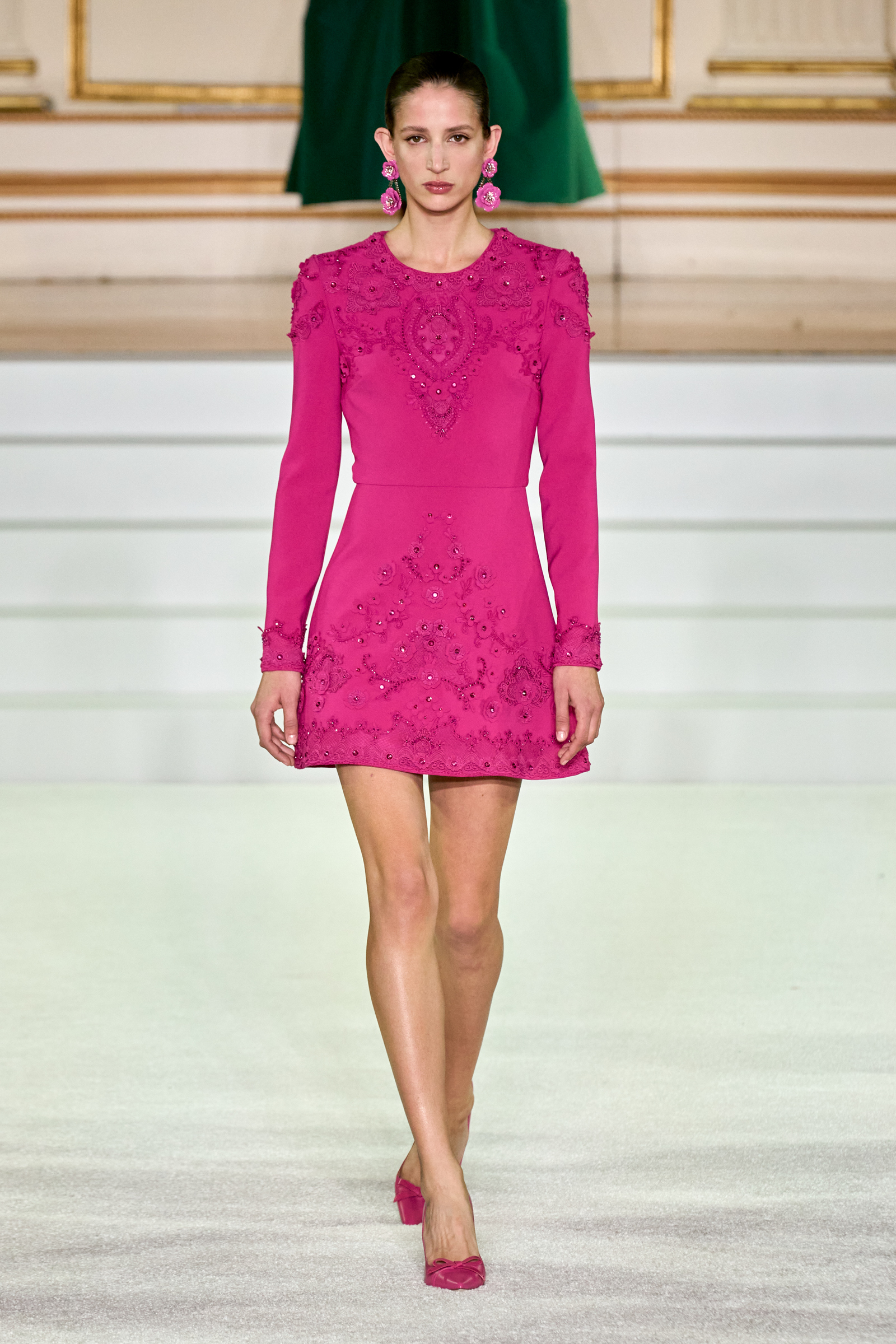 We were back in a ballroom at the Plaza for today’s show. As the models emerged from backstage, they paused before descending a staircase. That was fitting: Gordon specializes in entrance makers, no matter the occasion. Beforehand he said he likes to blend the distinctions between day and night, which meant that a short skirt suit was embellished with clusters of large crystals, while a fitted sheath was cut from yellow and white striped cotton poplin. Gordon is feeling more at home at Herrera than ever. Backstage he mentioned the Netflix series The Empress, which centers around the 19th century Viennese court of Sisi of Austria; he identifies with it because “the same combination is what made Mrs. Herrera and what made the house—that discipline and severity with the flamboyance.”