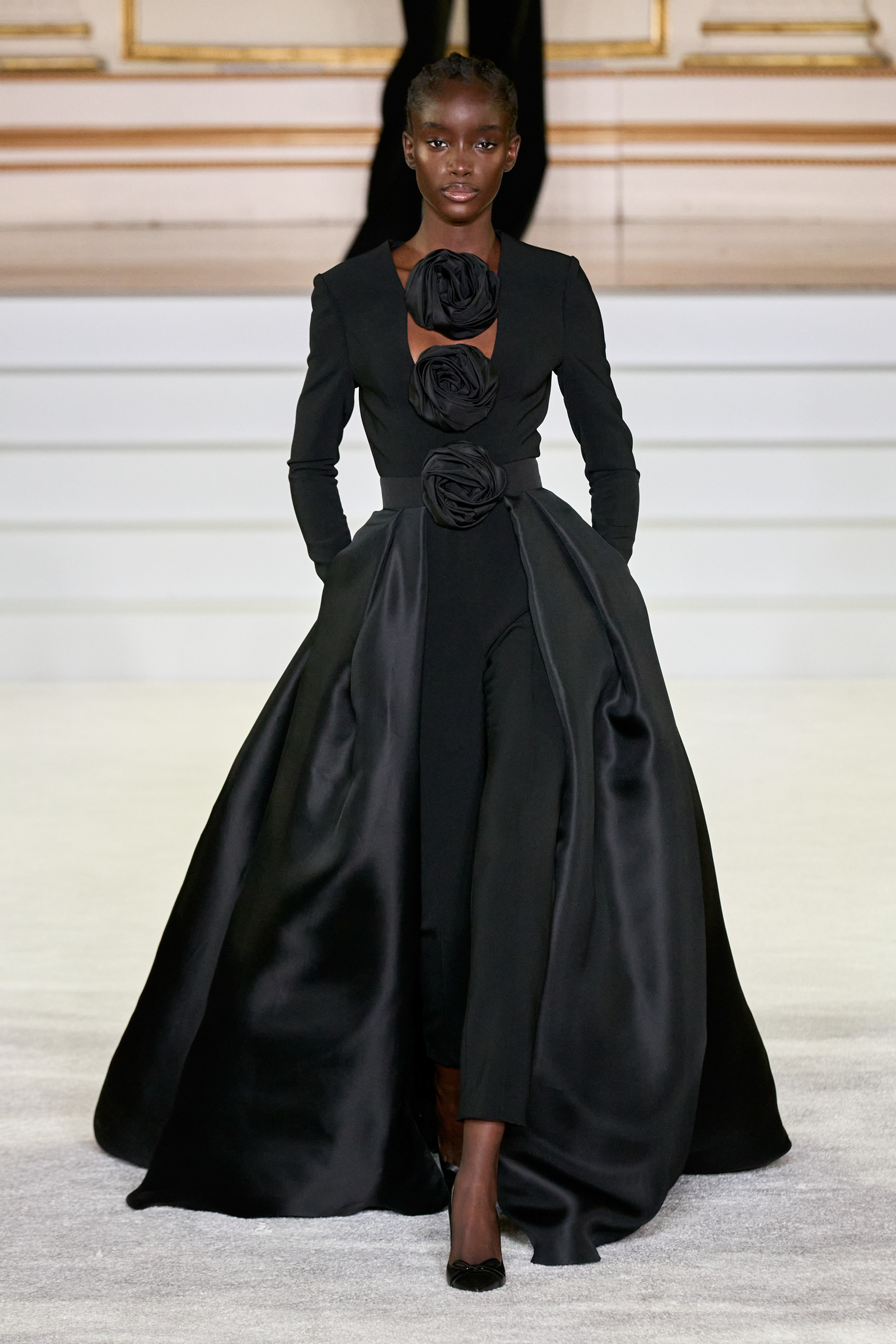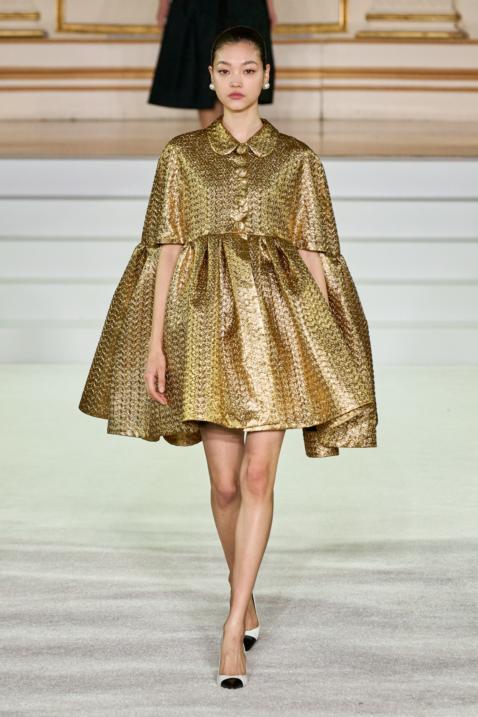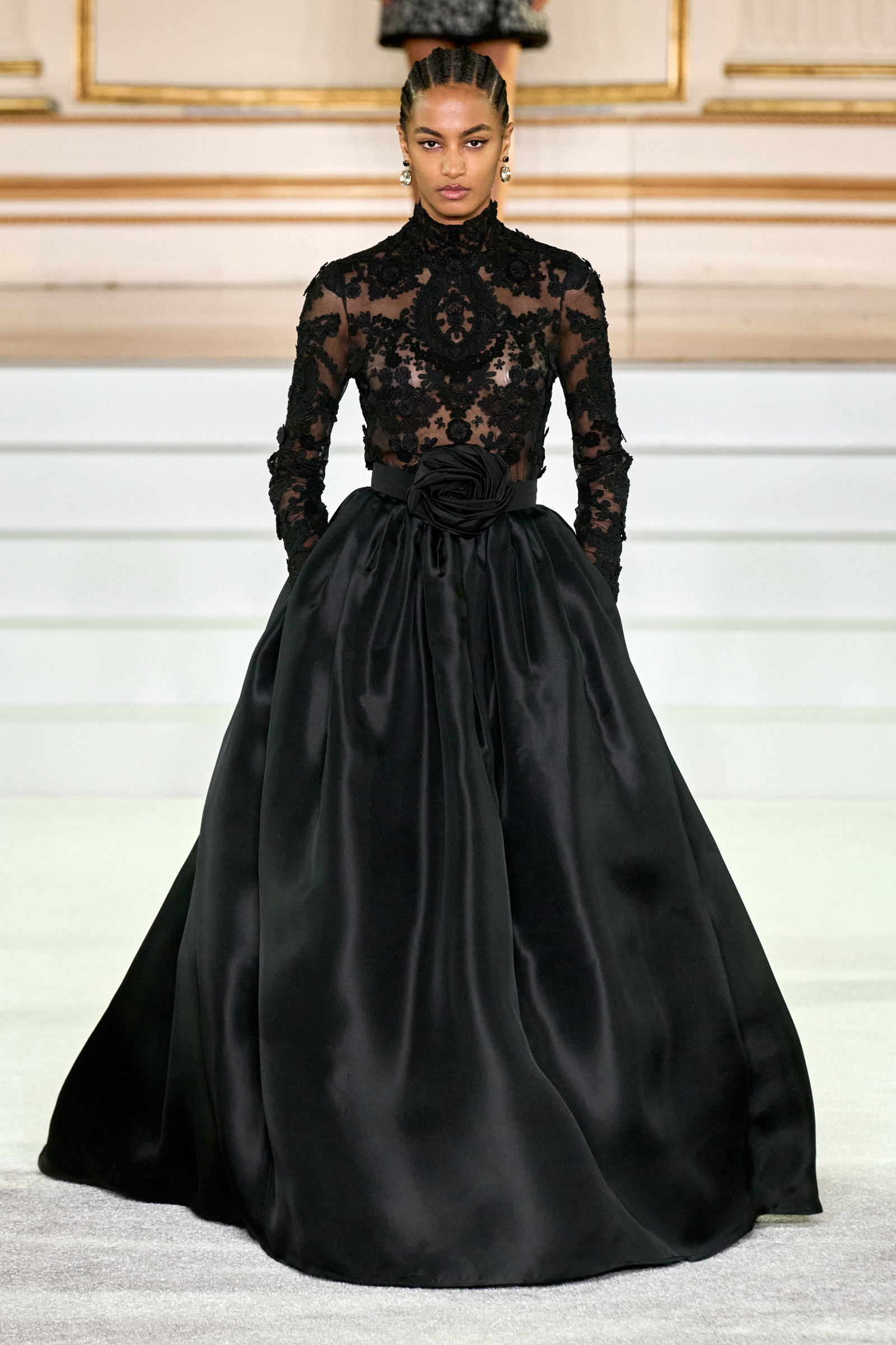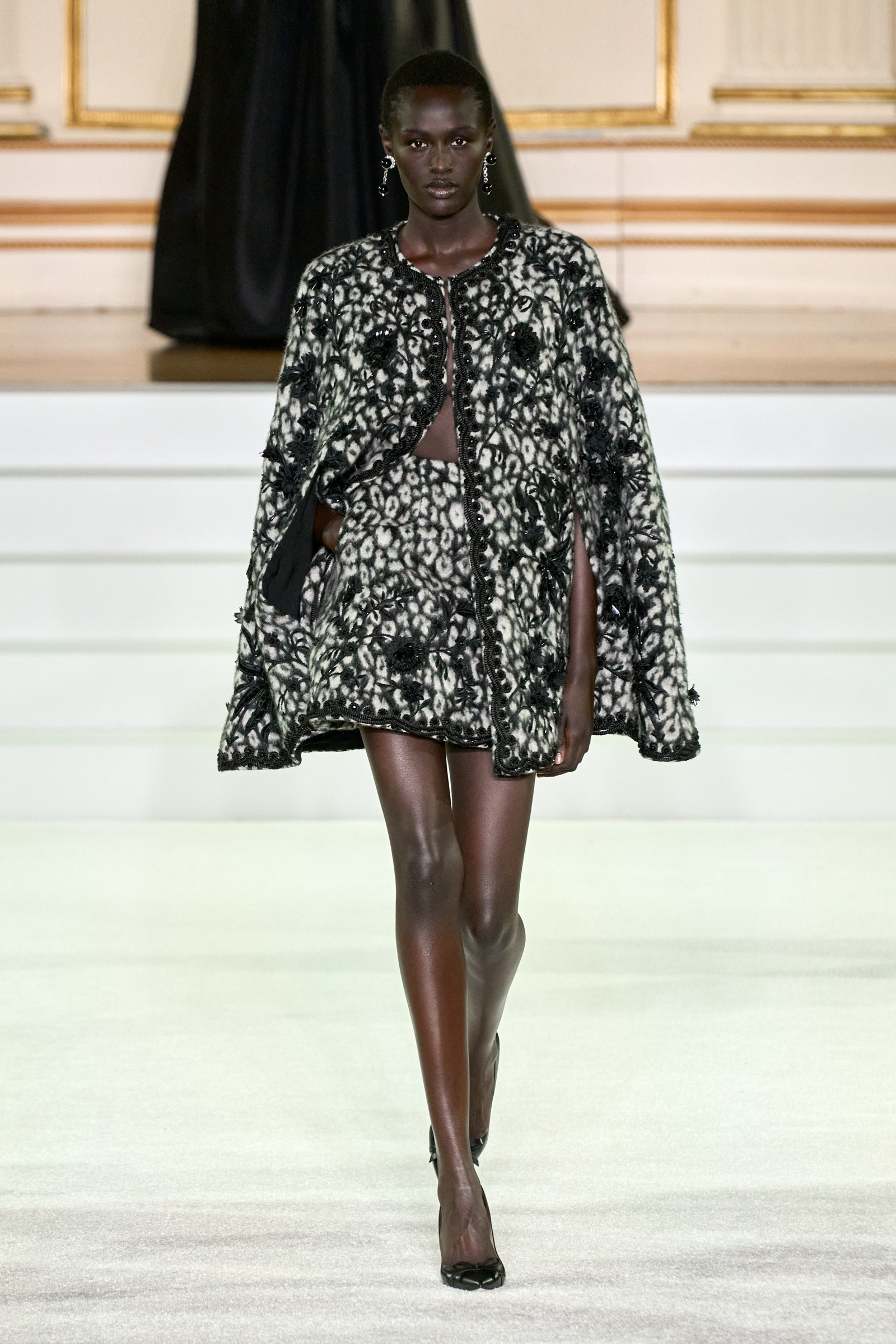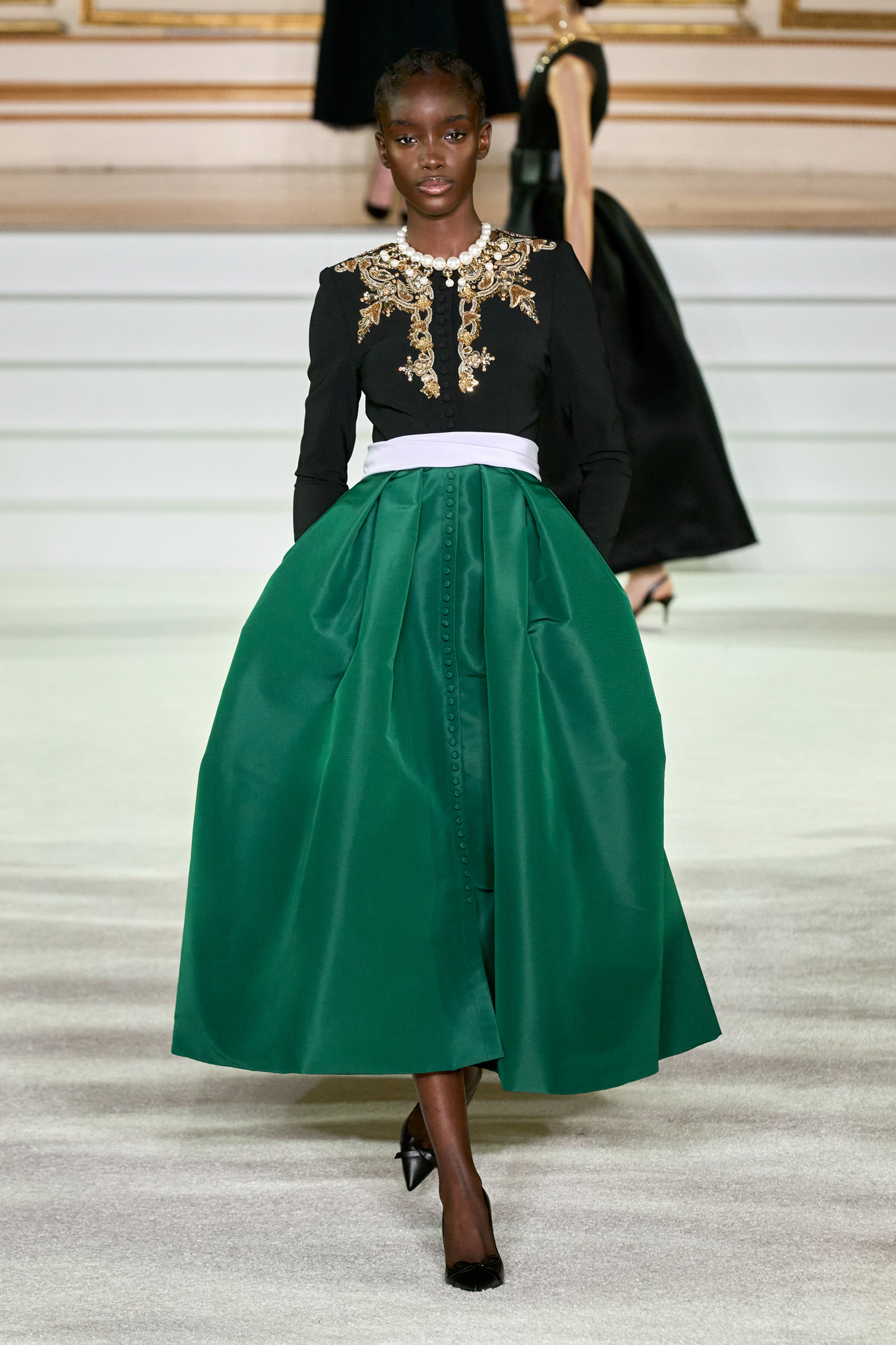 We were back in a ballroom at the Plaza for today’s show. As the models emerged from backstage, they paused before descending a staircase. That was fitting: Gordon specializes in entrance makers, no matter the occasion. Beforehand he said he likes to blend the distinctions between day and night, which meant that a short skirt suit was embellished with clusters of large crystals, while a fitted sheath was cut from yellow and white striped cotton poplin. Gordon is feeling more at home at Herrera than ever. Backstage he mentioned the Netflix series The Empress, which centers around the 19th century Viennese court of Sisi of Austria; he identifies with it because “the same combination is what made Mrs. Herrera and what made the house—that discipline and severity with the flamboyance.”