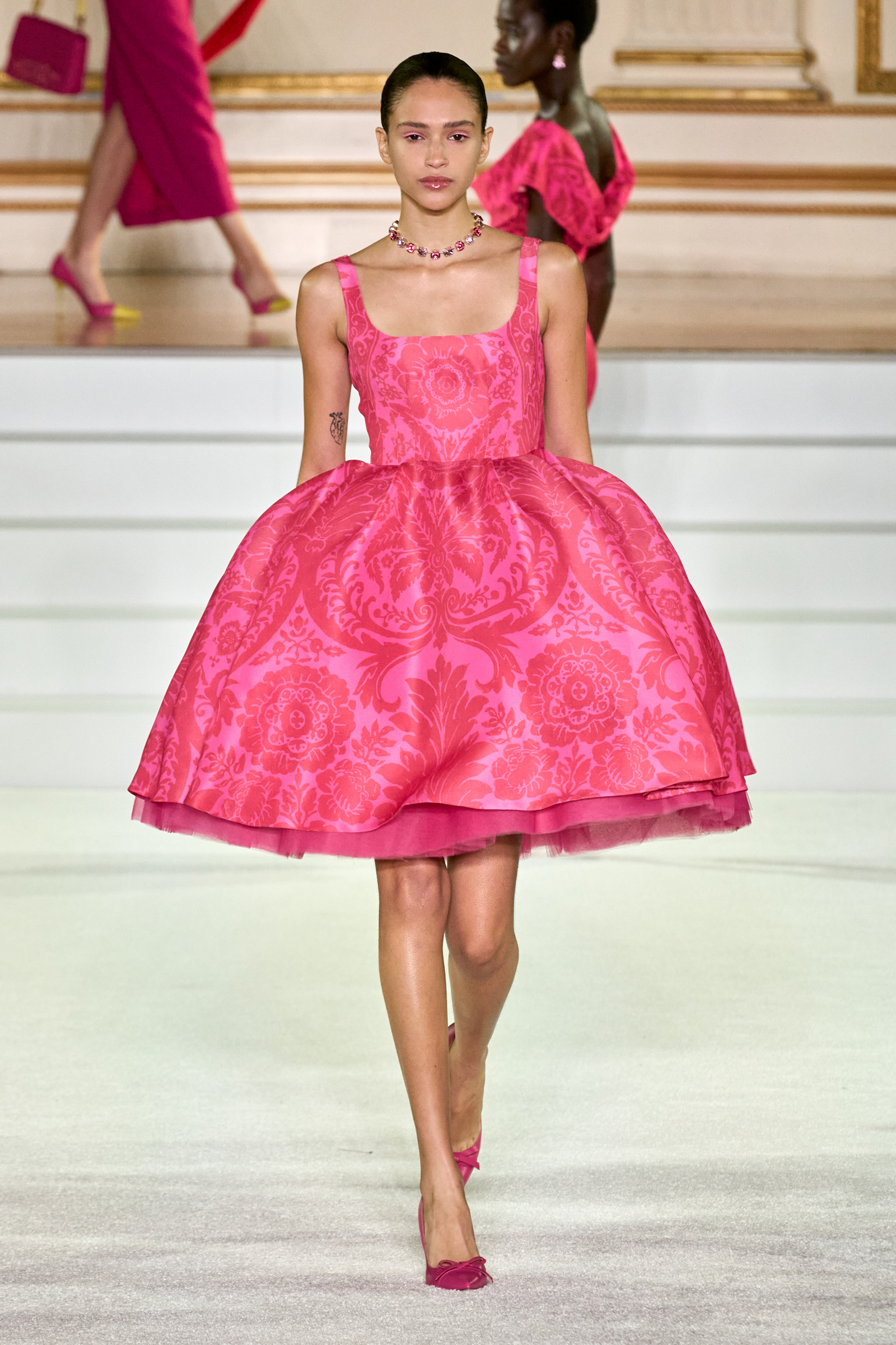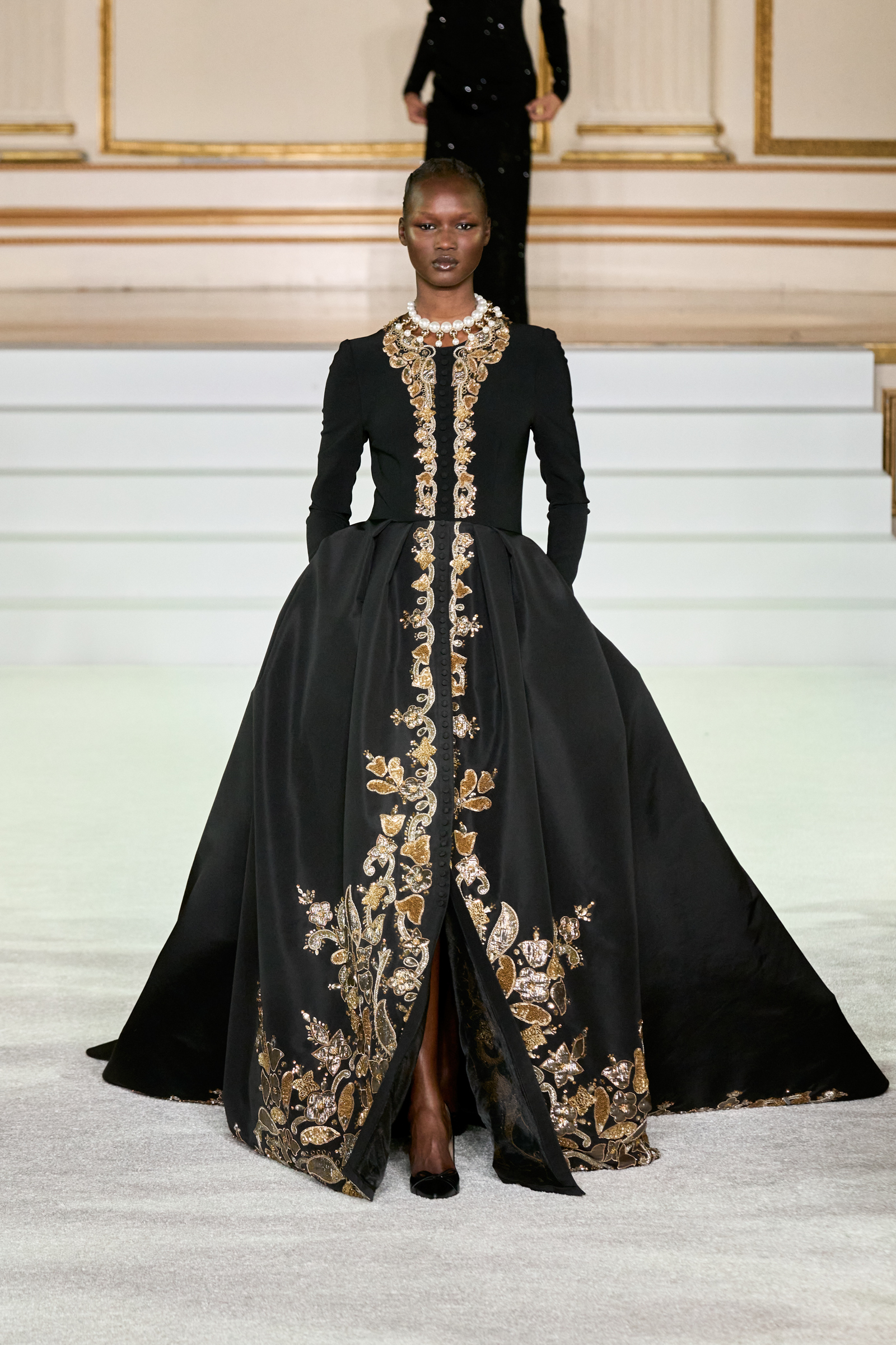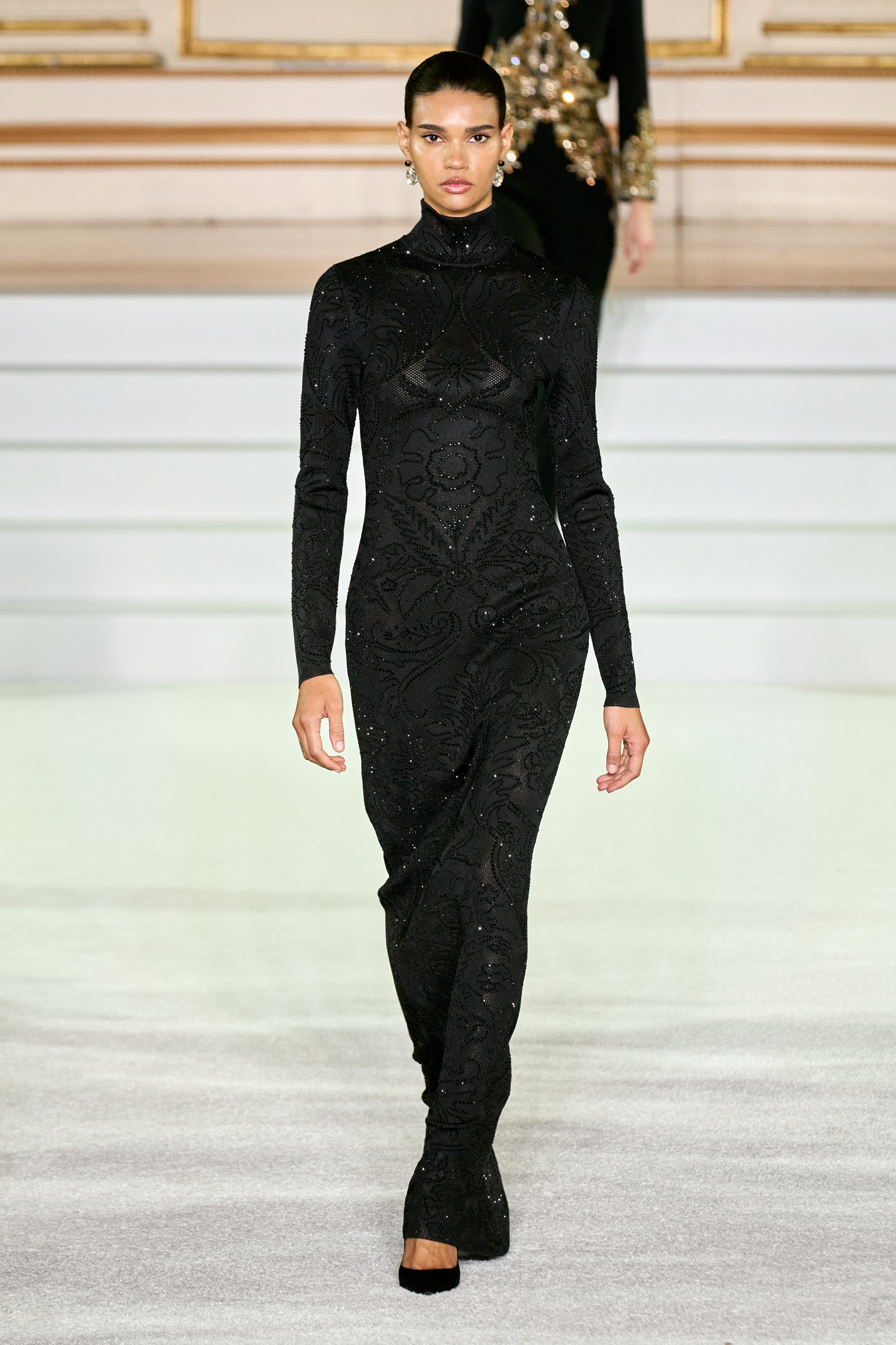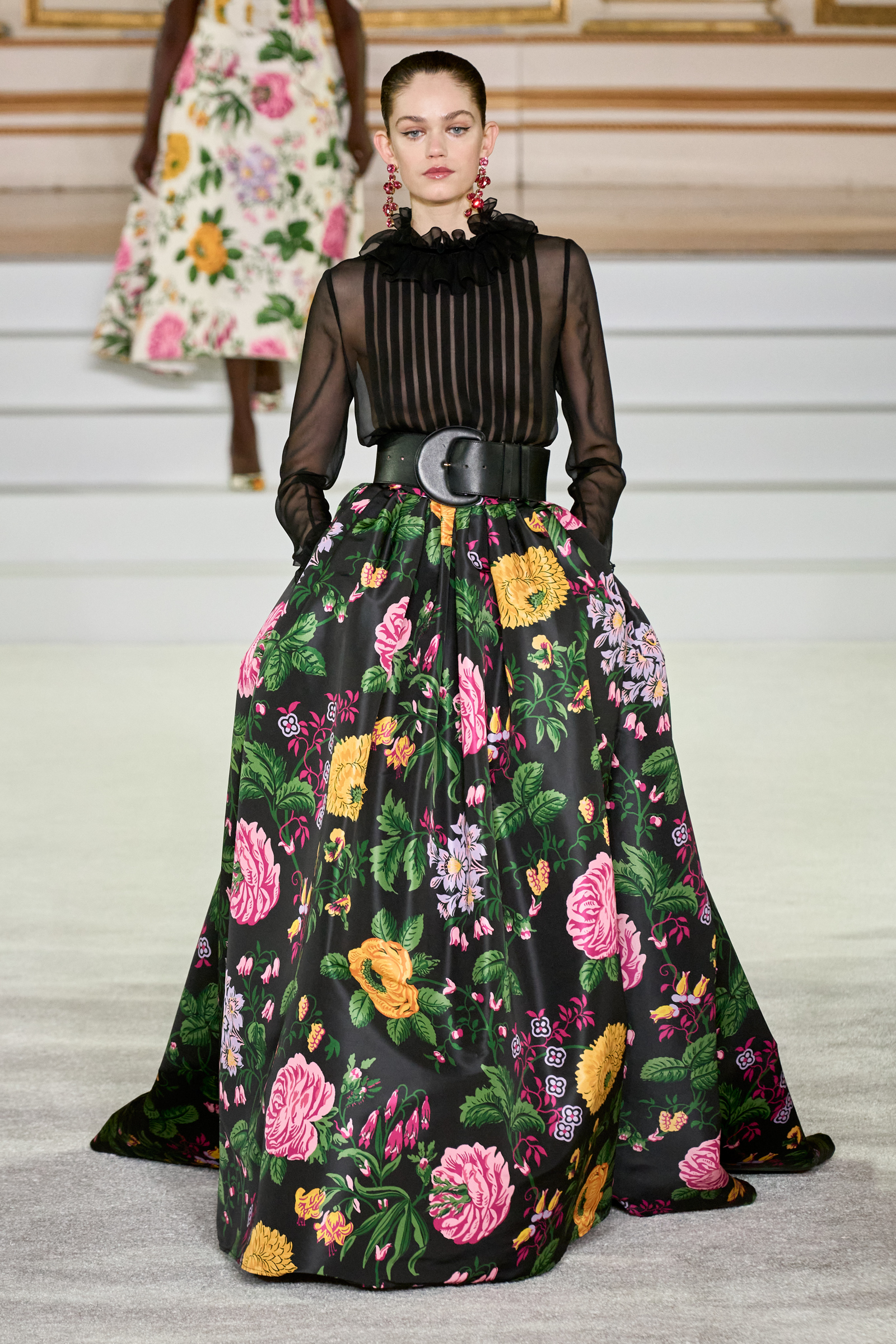 We were back in a ballroom at the Plaza for today’s show. As the models emerged from backstage, they paused before descending a staircase. That was fitting: Gordon specializes in entrance makers, no matter the occasion. Beforehand he said he likes to blend the distinctions between day and night, which meant that a short skirt suit was embellished with clusters of large crystals, while a fitted sheath was cut from yellow and white striped cotton poplin. Gordon is feeling more at home at Herrera than ever. Backstage he mentioned the Netflix series The Empress, which centers around the 19th century Viennese court of Sisi of Austria; he identifies with it because “the same combination is what made Mrs. Herrera and what made the house—that discipline and severity with the flamboyance.”