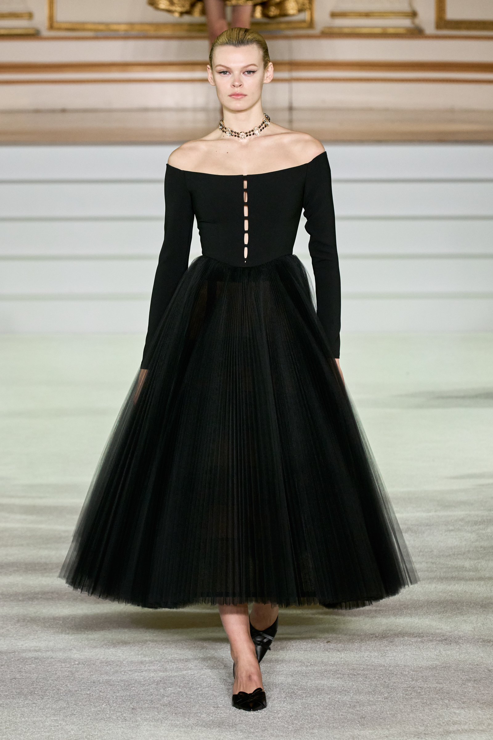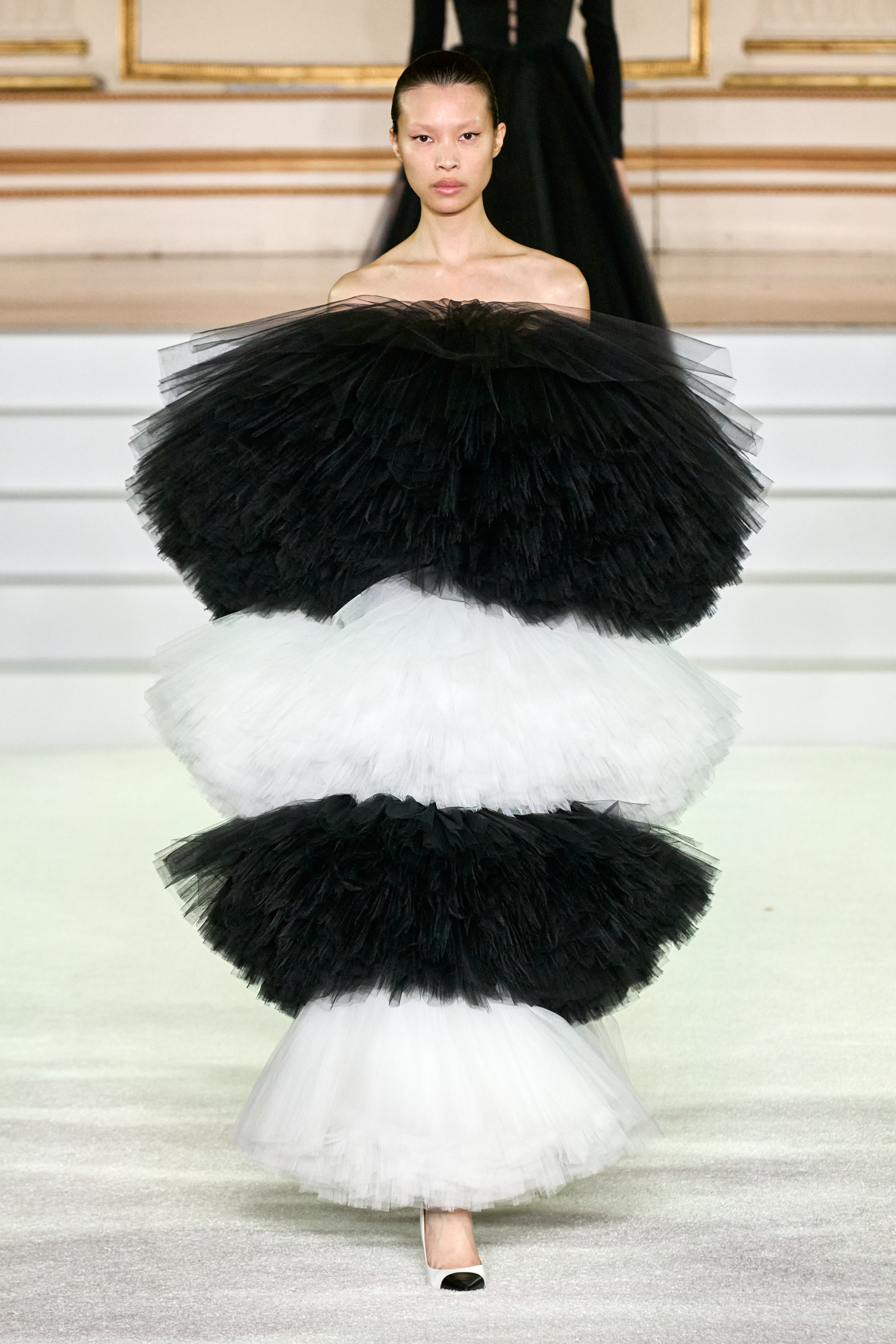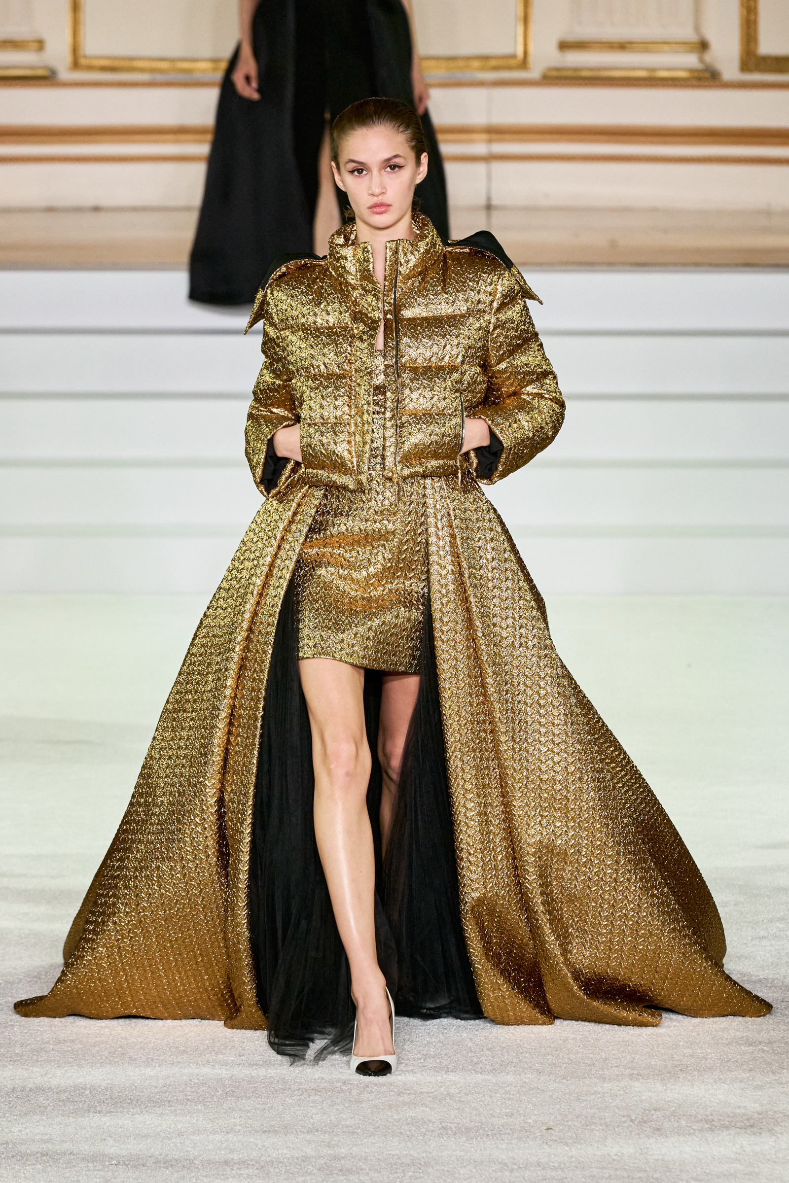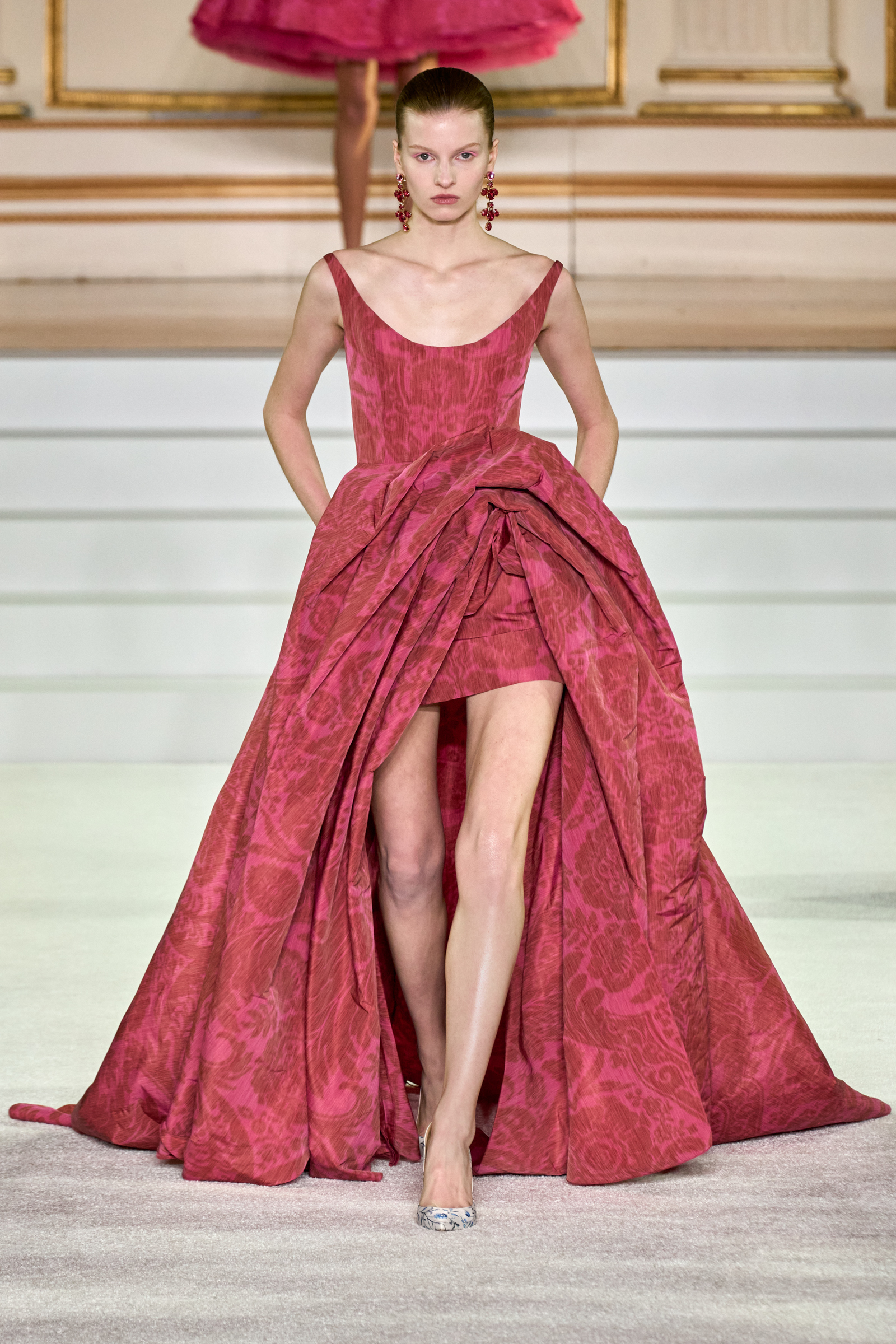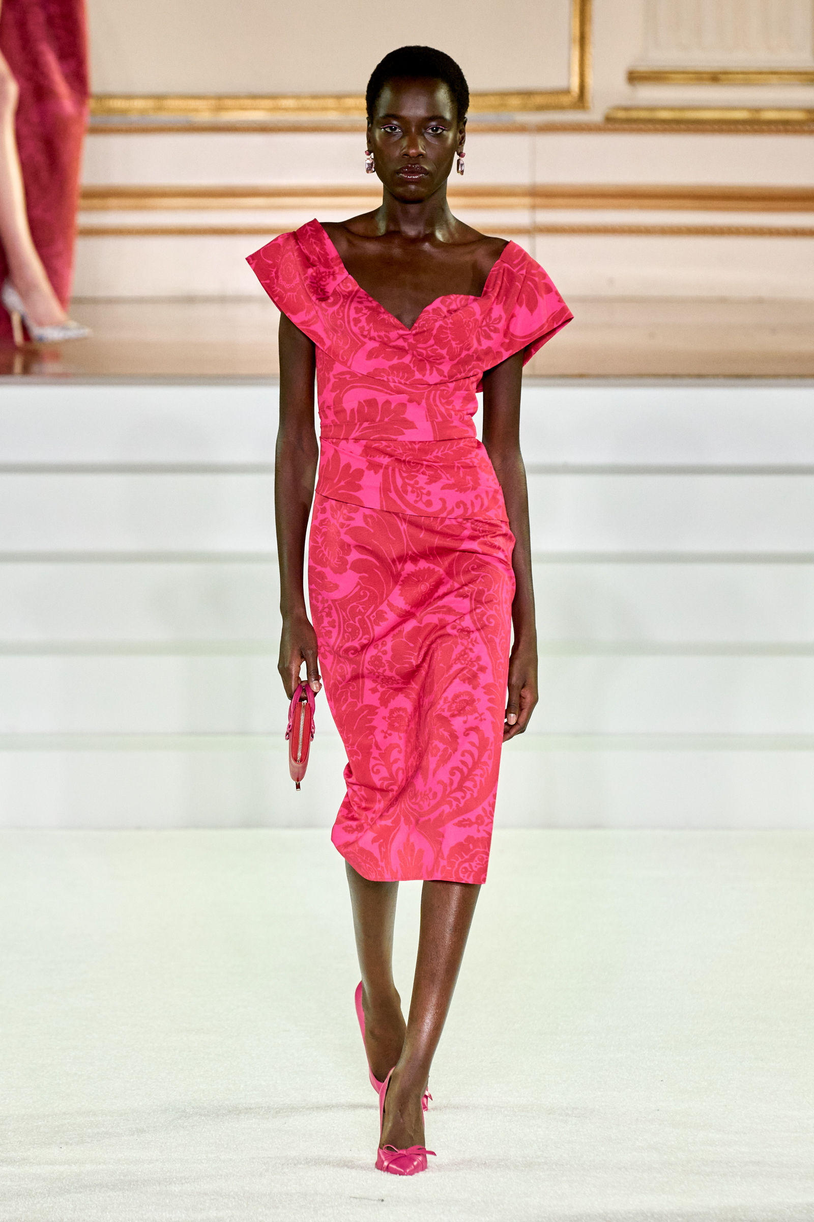 We were back in a ballroom at the Plaza for today’s show. As the models emerged from backstage, they paused before descending a staircase. That was fitting: Gordon specializes in entrance makers, no matter the occasion. Beforehand he said he likes to blend the distinctions between day and night, which meant that a short skirt suit was embellished with clusters of large crystals, while a fitted sheath was cut from yellow and white striped cotton poplin. Gordon is feeling more at home at Herrera than ever. Backstage he mentioned the Netflix series The Empress, which centers around the 19th century Viennese court of Sisi of Austria; he identifies with it because “the same combination is what made Mrs. Herrera and what made the house—that discipline and severity with the flamboyance.”
