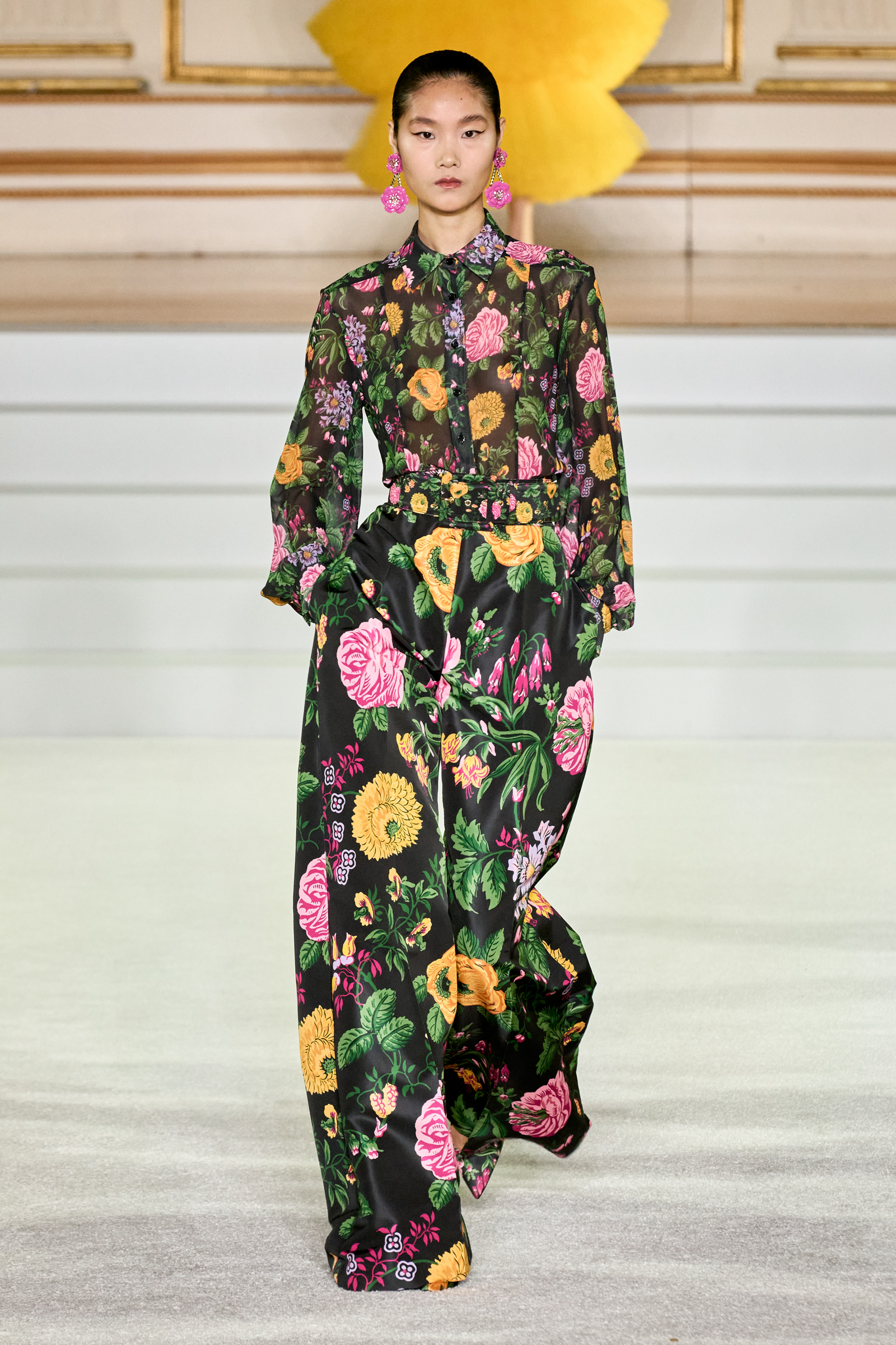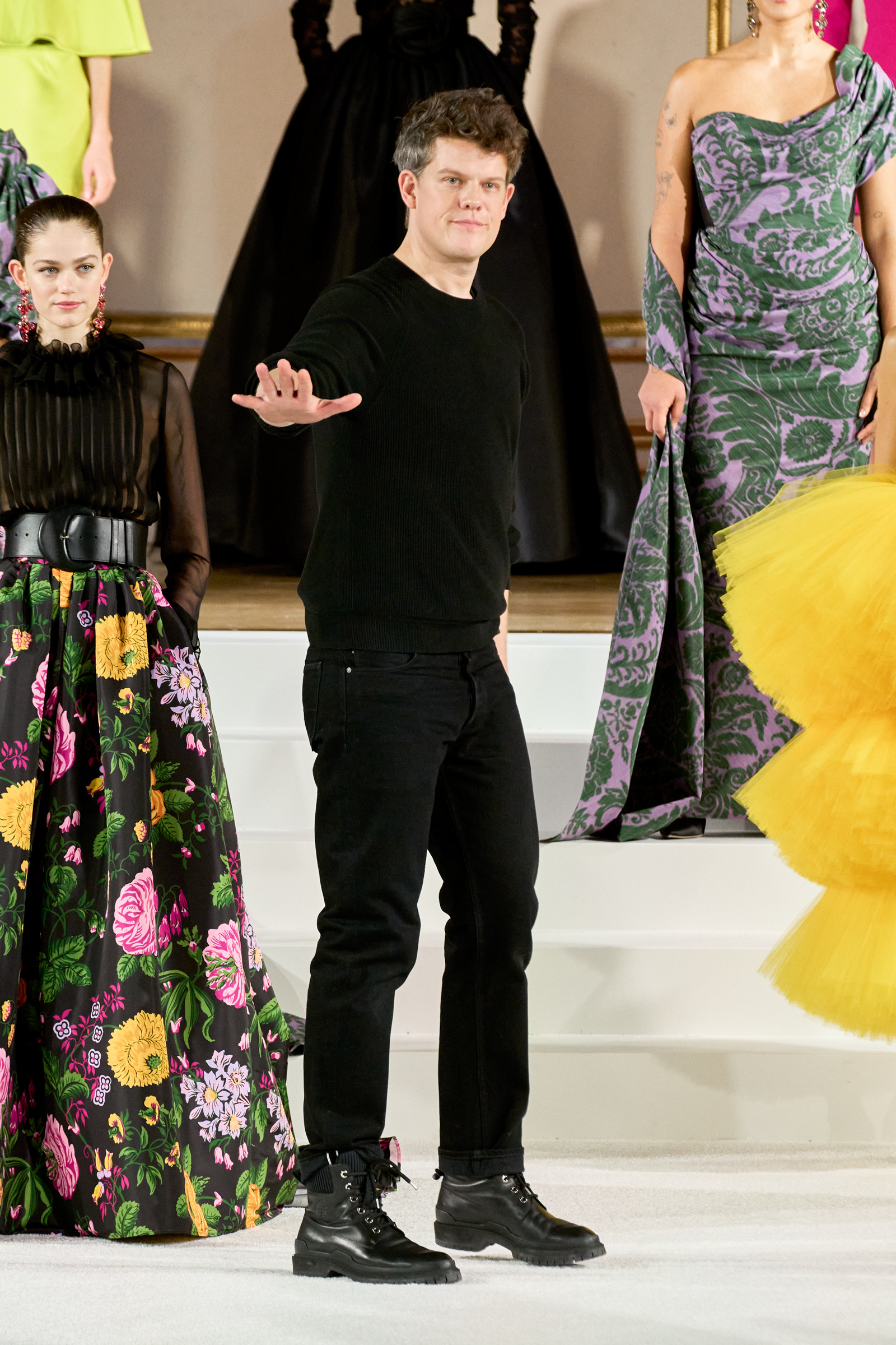 New York designers are divided into two camps, those who are meeting the darkness of the moment with understatement and in some cases austerity, and others who are responding with color, verve, and joie de vivre. It should come as no surprise that Carolina Herrera’s Wes Gordon is on the side of joy. “This house exists and has existed for so long because it promises to women who come to us something that makes them feel beautiful and happy,” he said. He has a personal reason to be happy, too. He and his husband welcomed their second child last week, a little girl. He put “Georgia on My Mind” on the soundtrack in her honor.