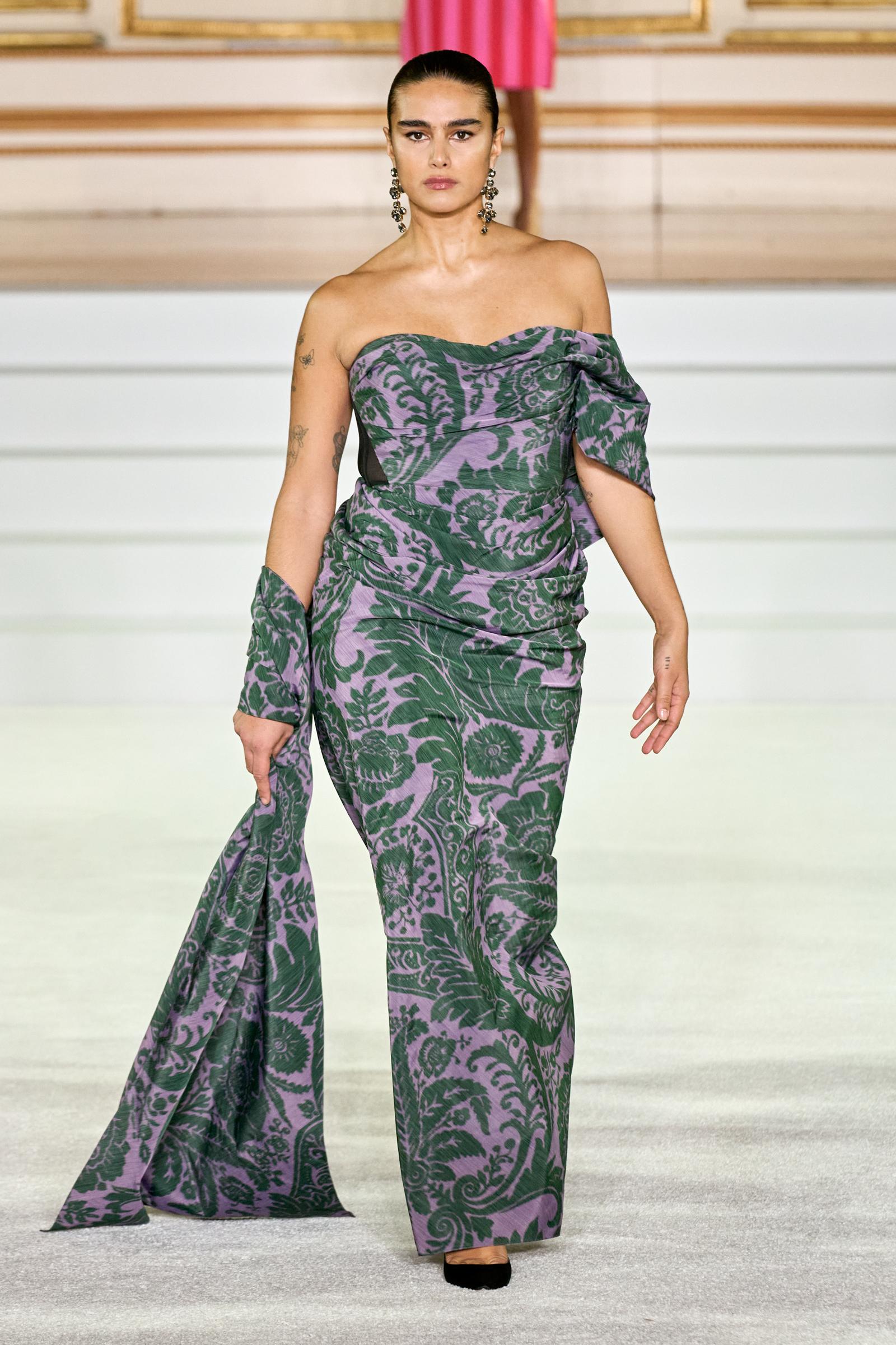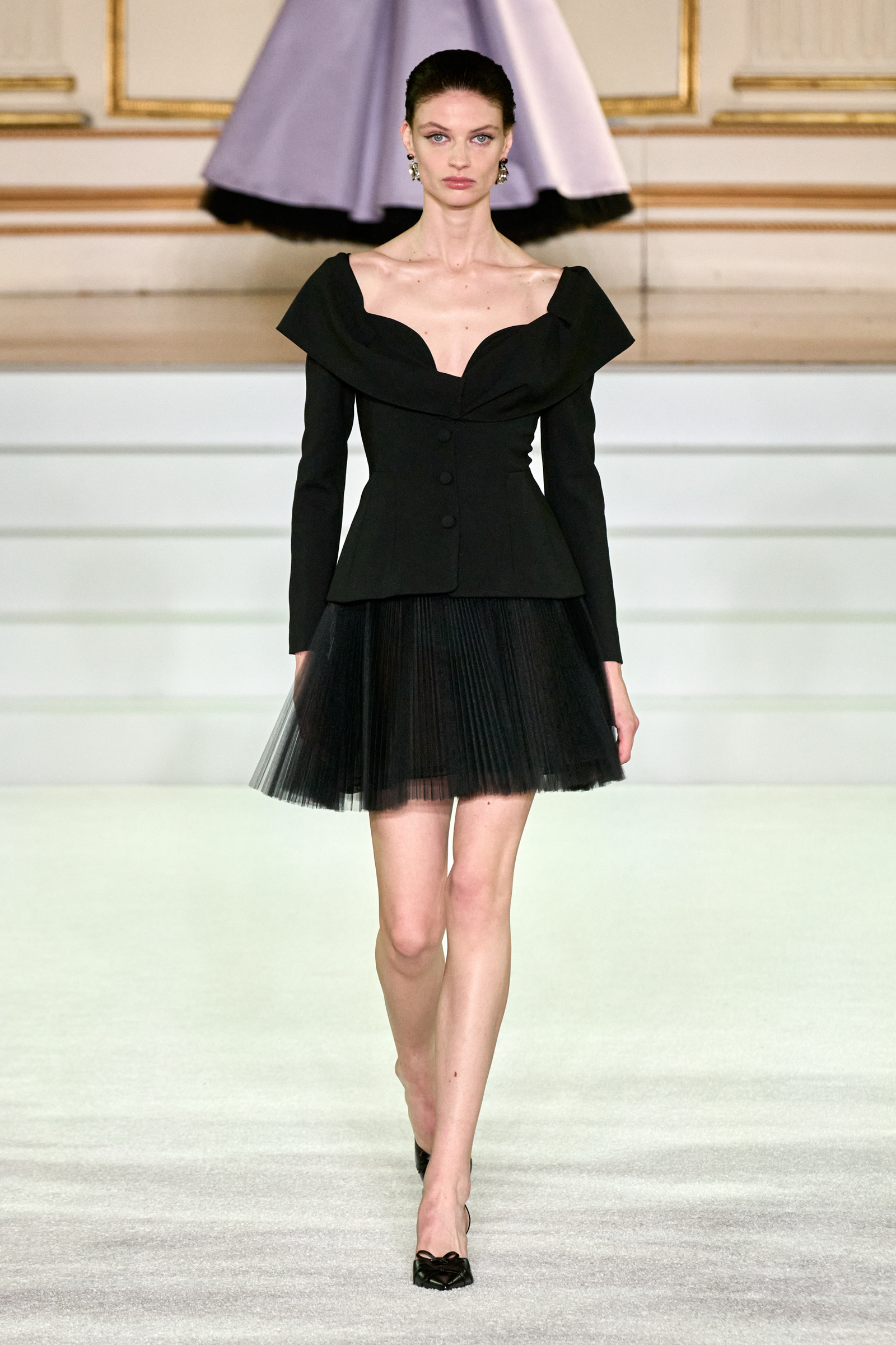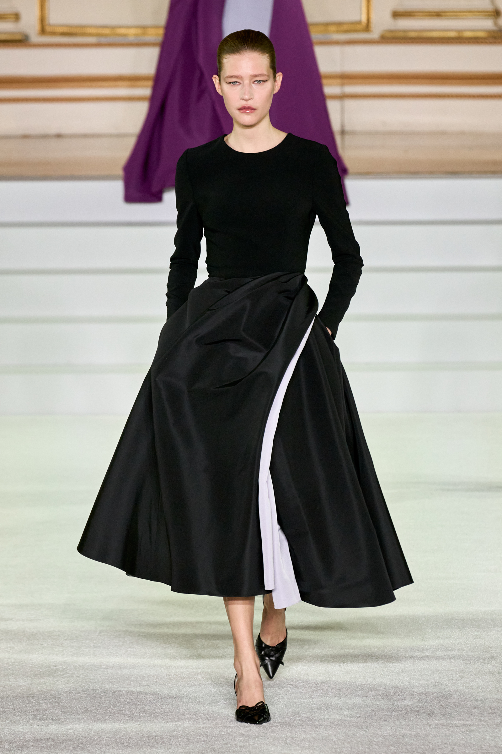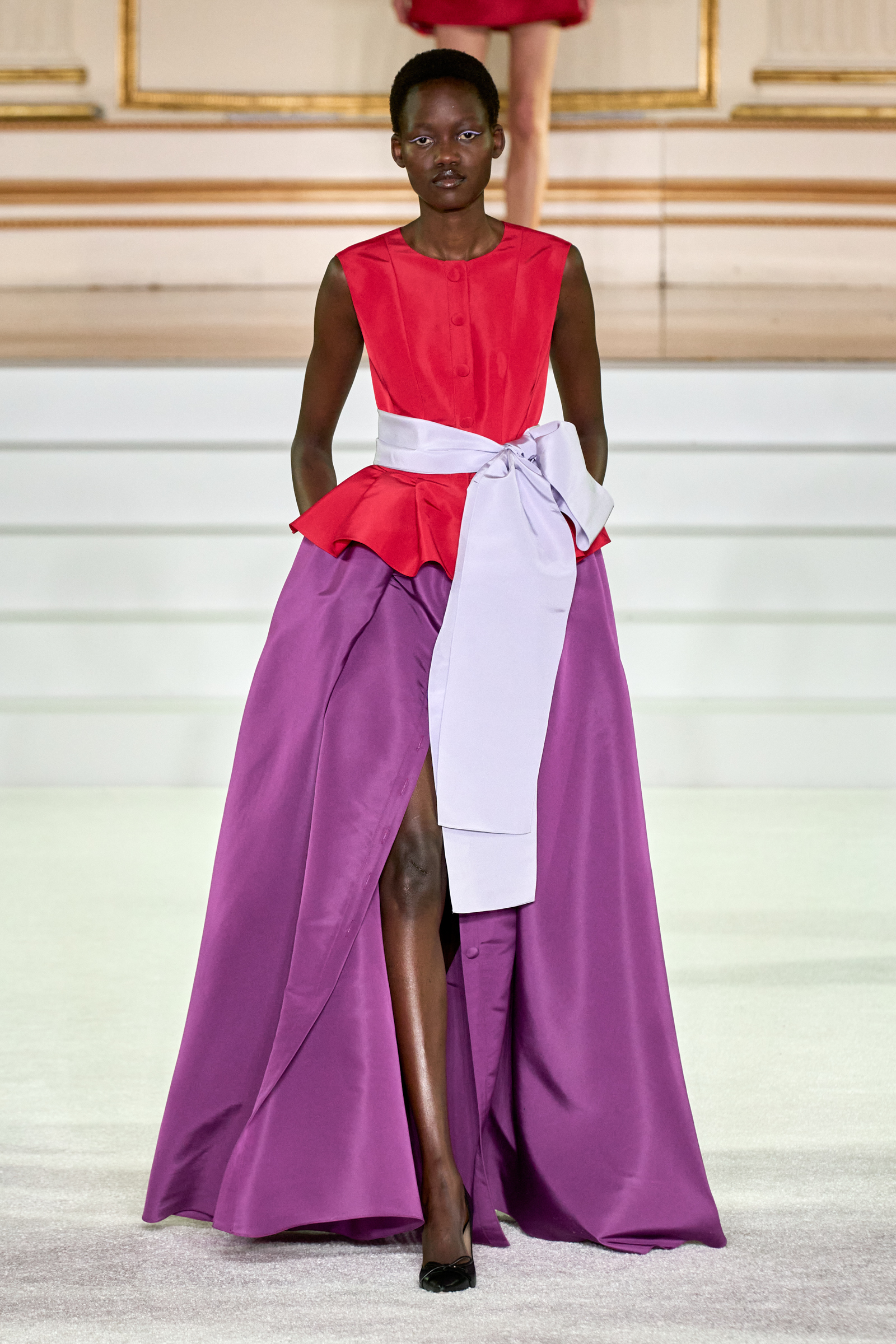 There were outliers here in the form of a few sculpted tulle creations that leaned more eccentric than flamboyant, but otherwise Gordon struck a lot of the right notes: a colorful floral print strapless gown banded with black stripes was inspired by an old porcelain print, a purple and green blanc de chine used for another voluptuously draped long dress came from a 19th century woodblock print he found. “We’ve been working with fabric mills to develop textiles that have been kind of endangered species on New York runways for two decades,” he said. A pair of colorblocked ensembles packed a lot of punch despite the simplicity of the pieces that formed them. Chartreuse, berry pink, and red; or red, purple, and lilac—it’s hard not to be happy around colors like that.