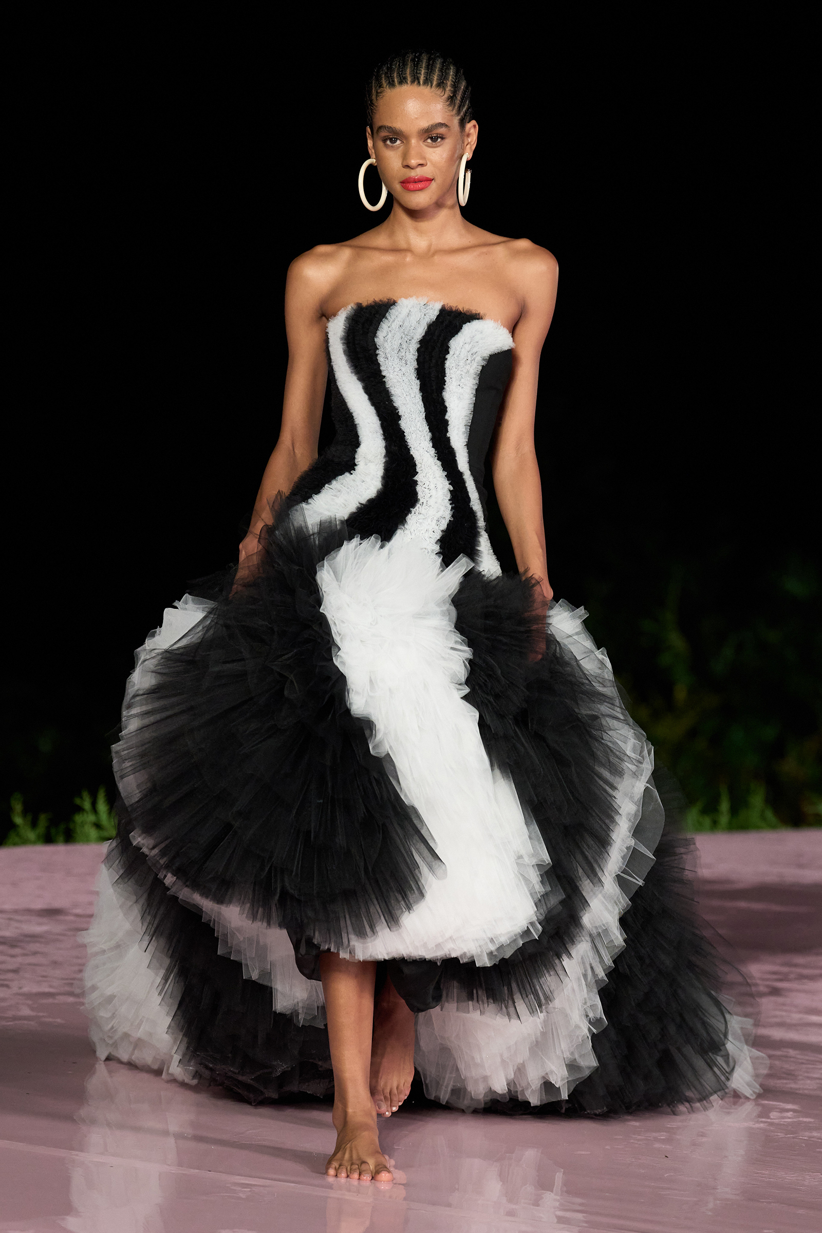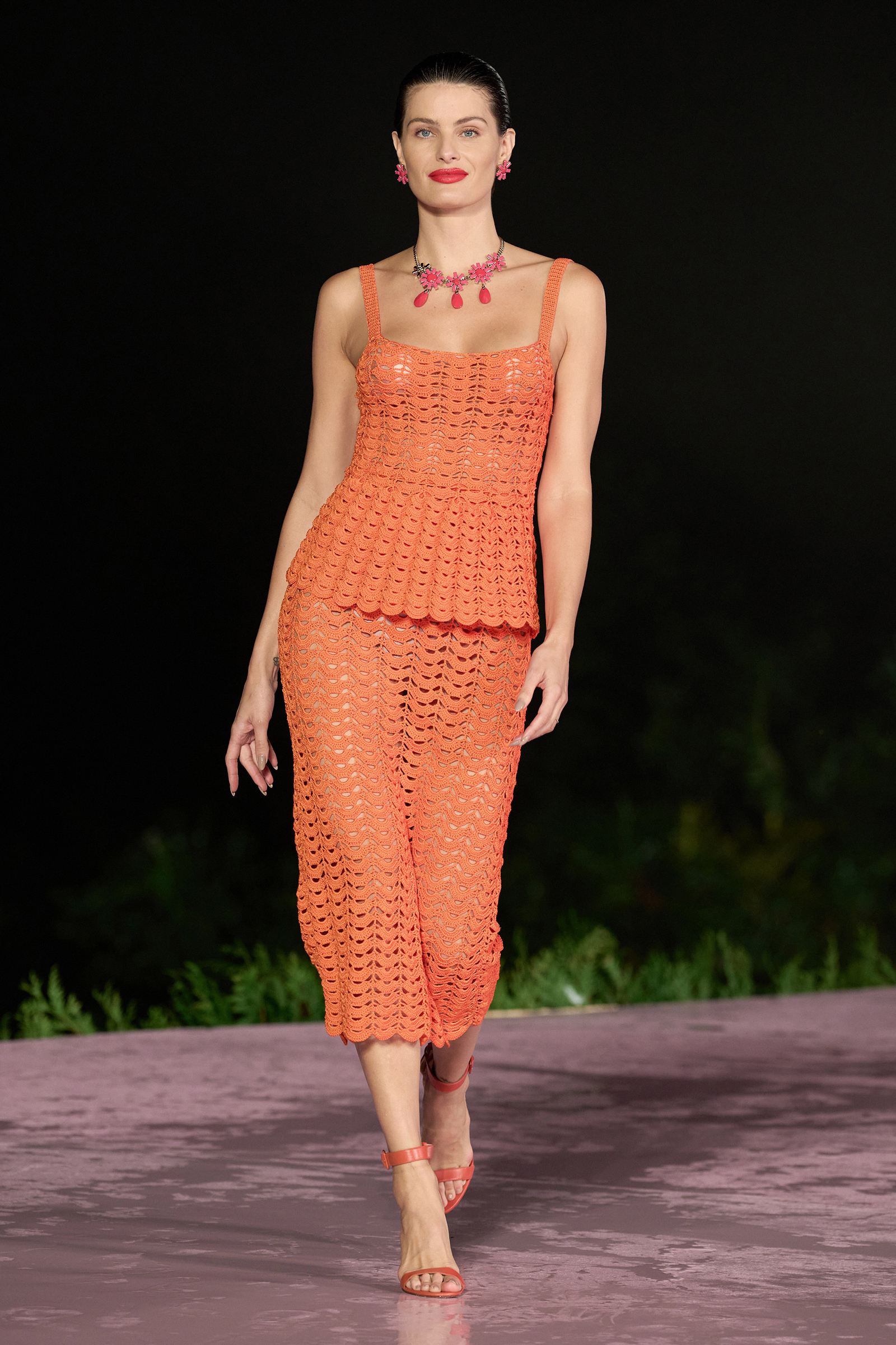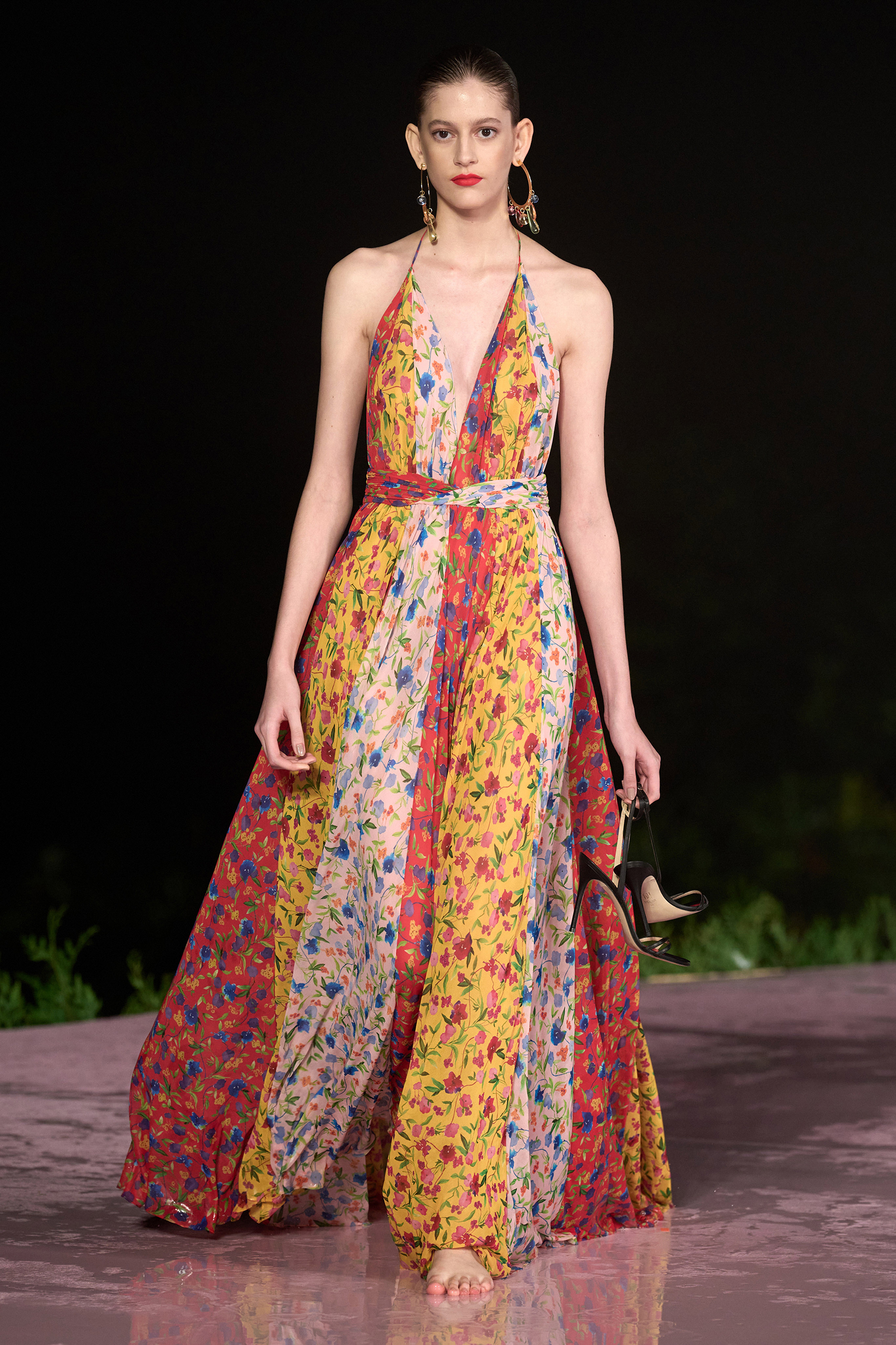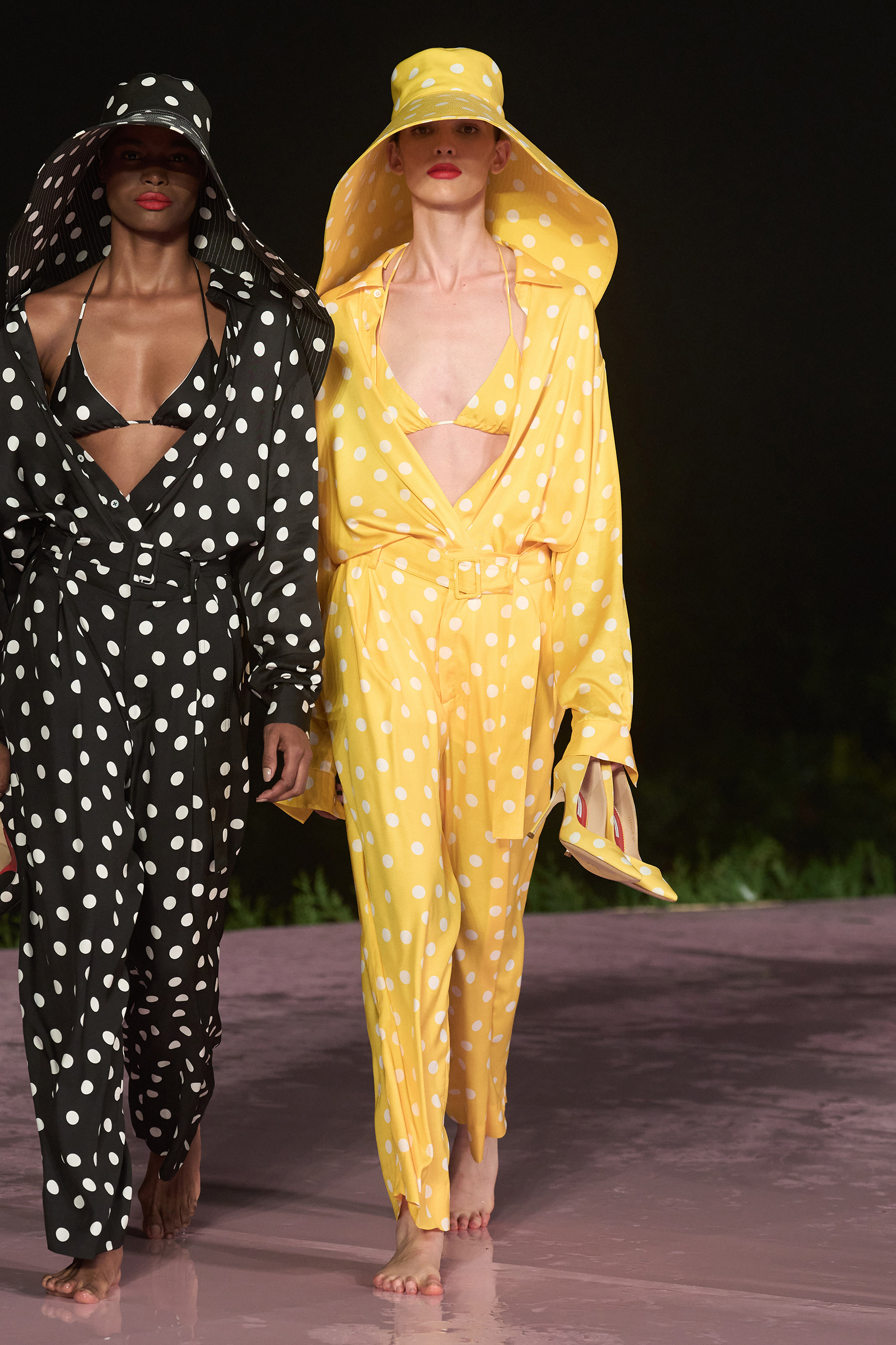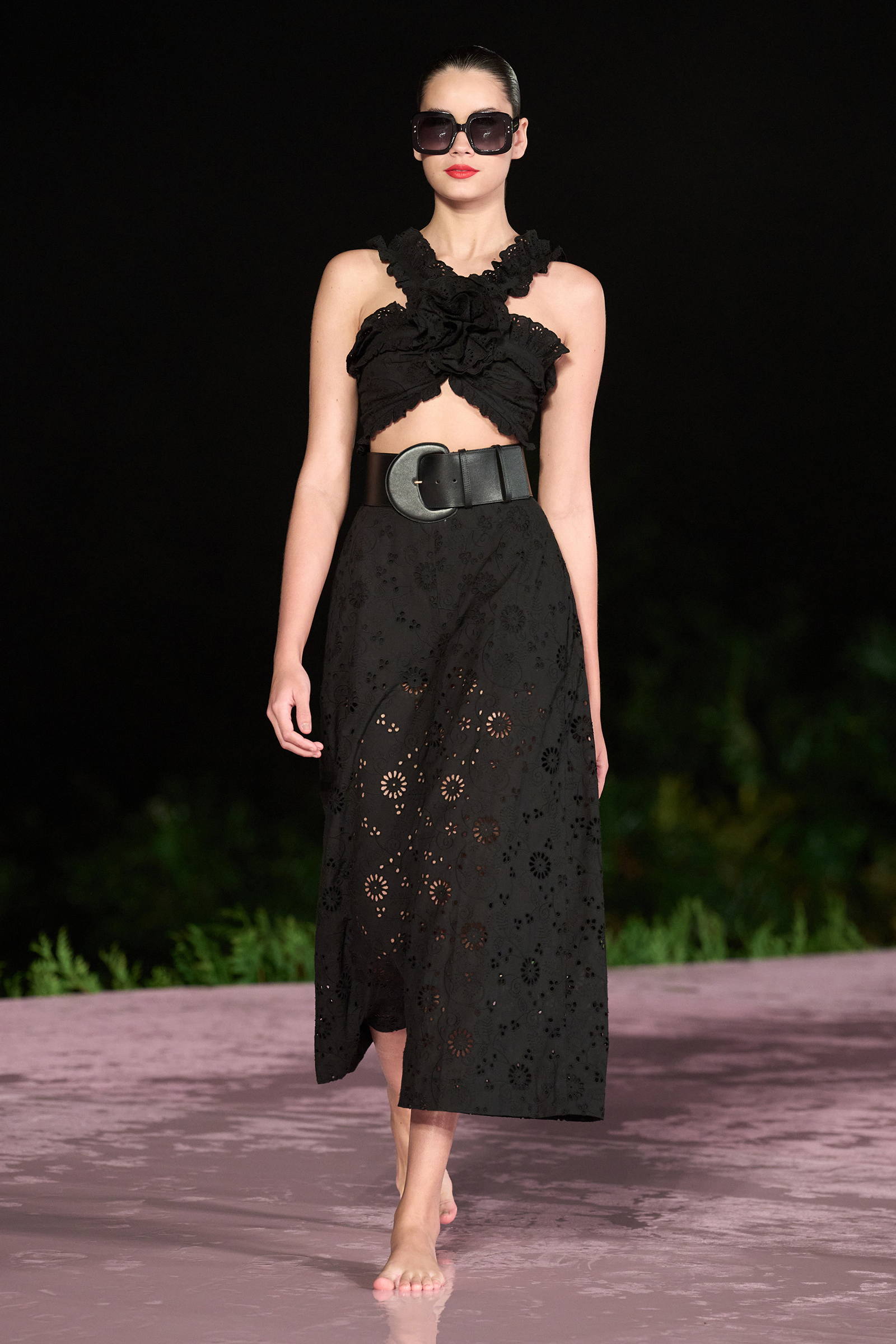 Earlier today, the sun came out, but by evening, the clouds arrived, and despite a promising rainbow over the Santa Teresa neighborhood where the show would take place, the skies opened. But rain or shine, the show must go on—and after a lengthy delay Caroline Trentini emerged on the blush-pink, puddle-filled runway. Her ruffled floral off-the-shoulder dress accessorized with a polka dotted belt and matching sandals was simultaneously sexy and elegant.