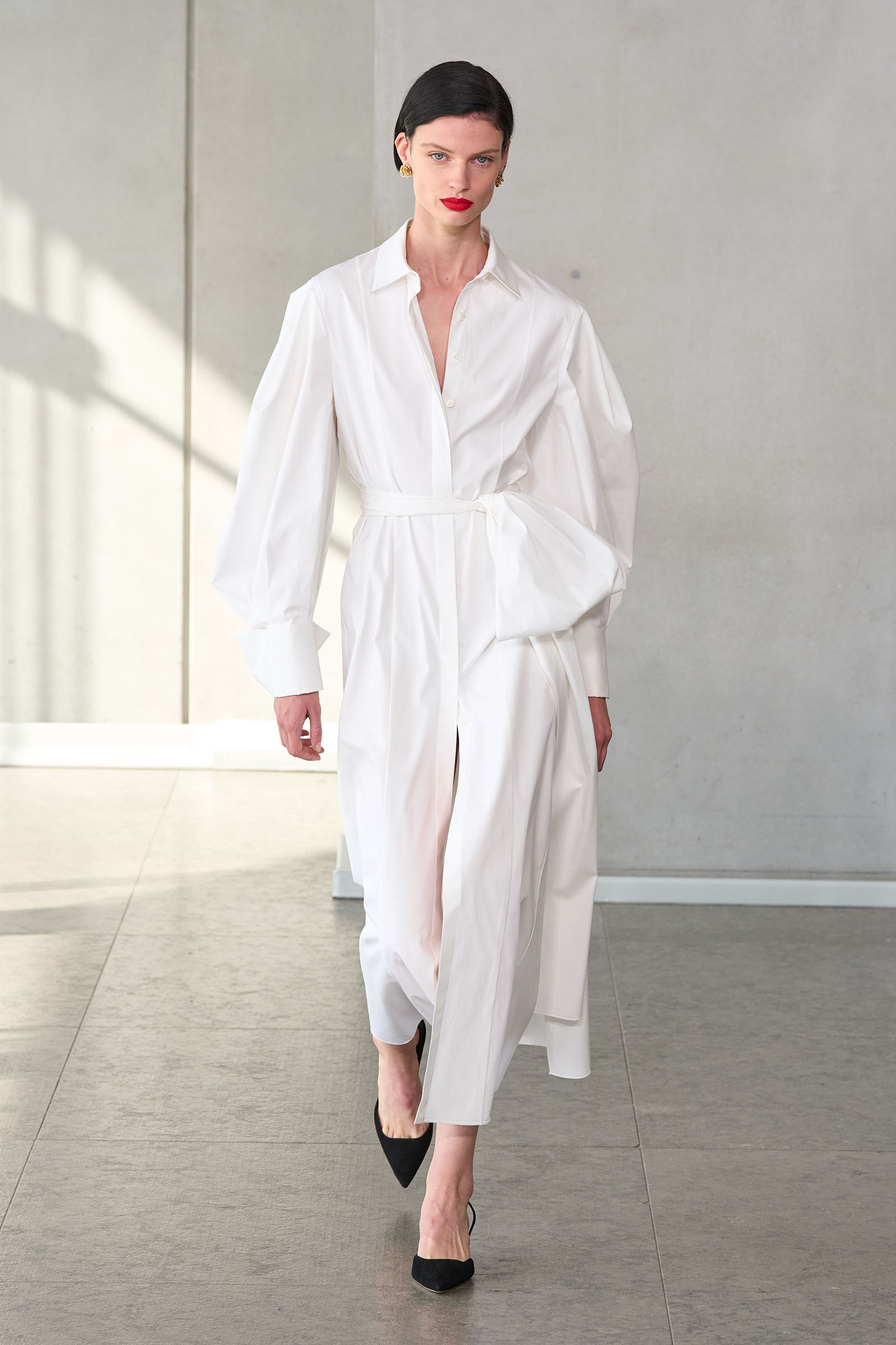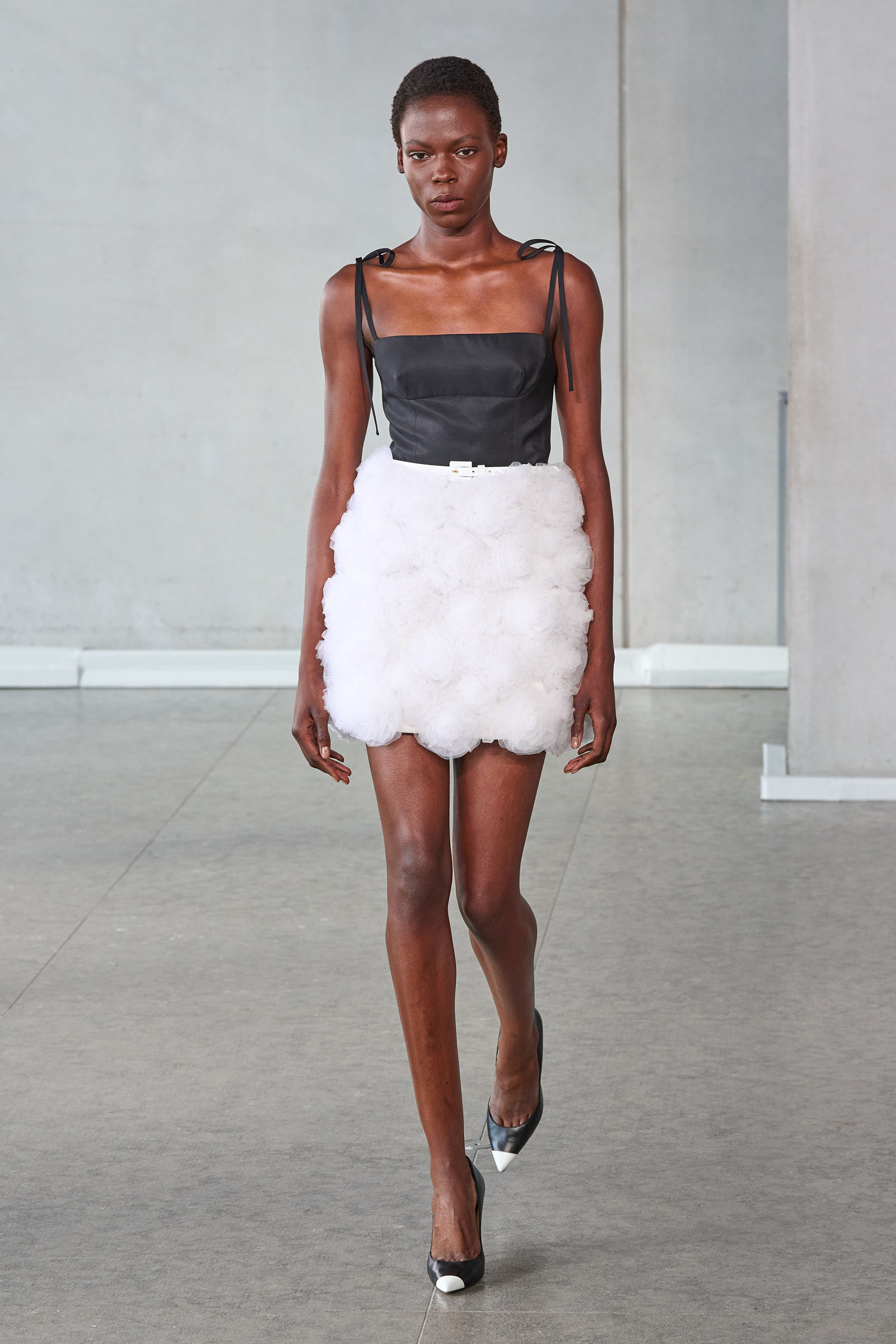 A lot has changed since Carolina and Oscar were dressing the Park Avenue crowd, not least of all the casualization of daywear. When jog bras and performance leggings qualify as fashion, it tests designers to come up with their own equivalencies. Gordon makes a point of using cotton for a lot of things that might have once been made in fancier materials, and he also mixes sportswear with evening pieces. The last look, for example, was a black version of that opening white shirt, paired with a silver sequined pencil skirt. Another of his tendencies has been to de-emphasize floor-length dresses in favor of less formal options. This season was no exception, but a striped powderpuff tulle style demonstrated that, when called upon, he can give good gown.