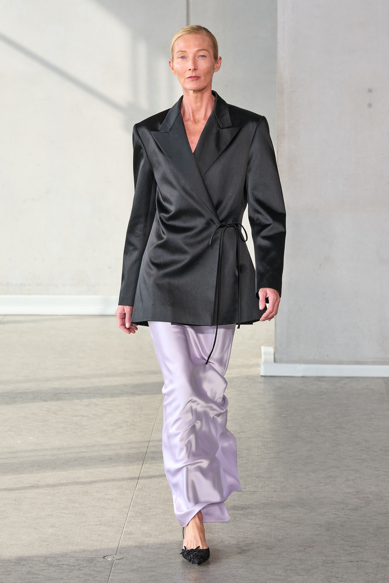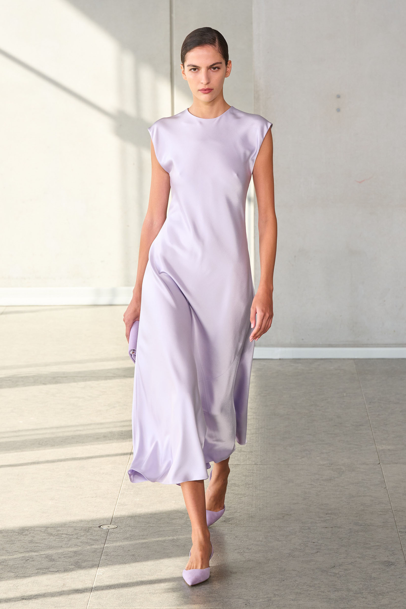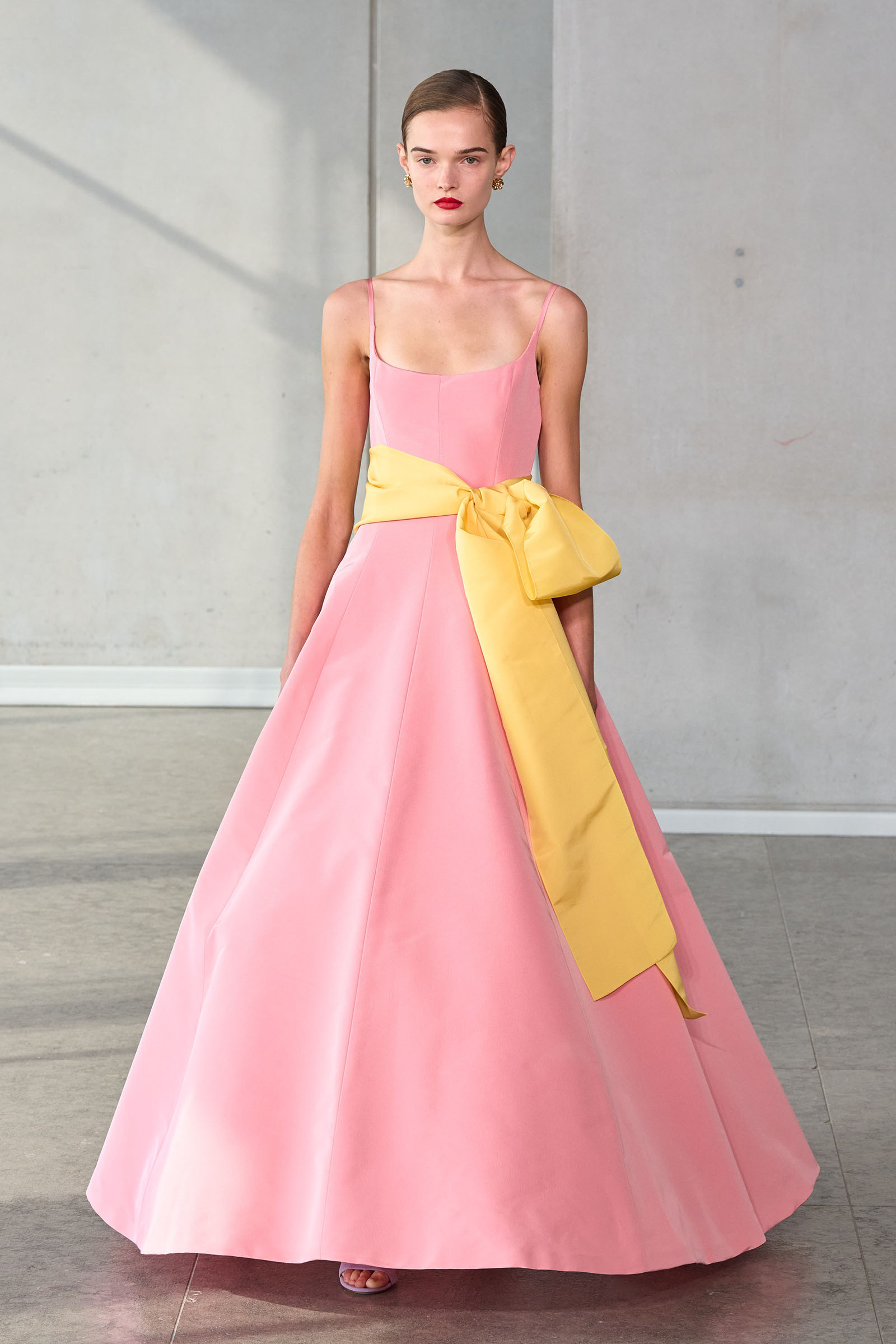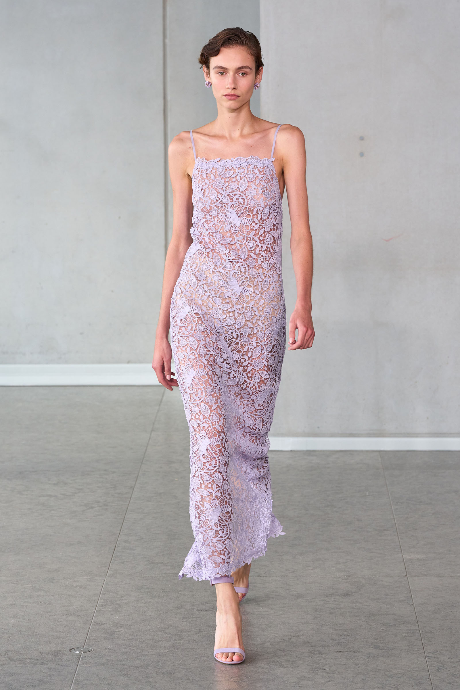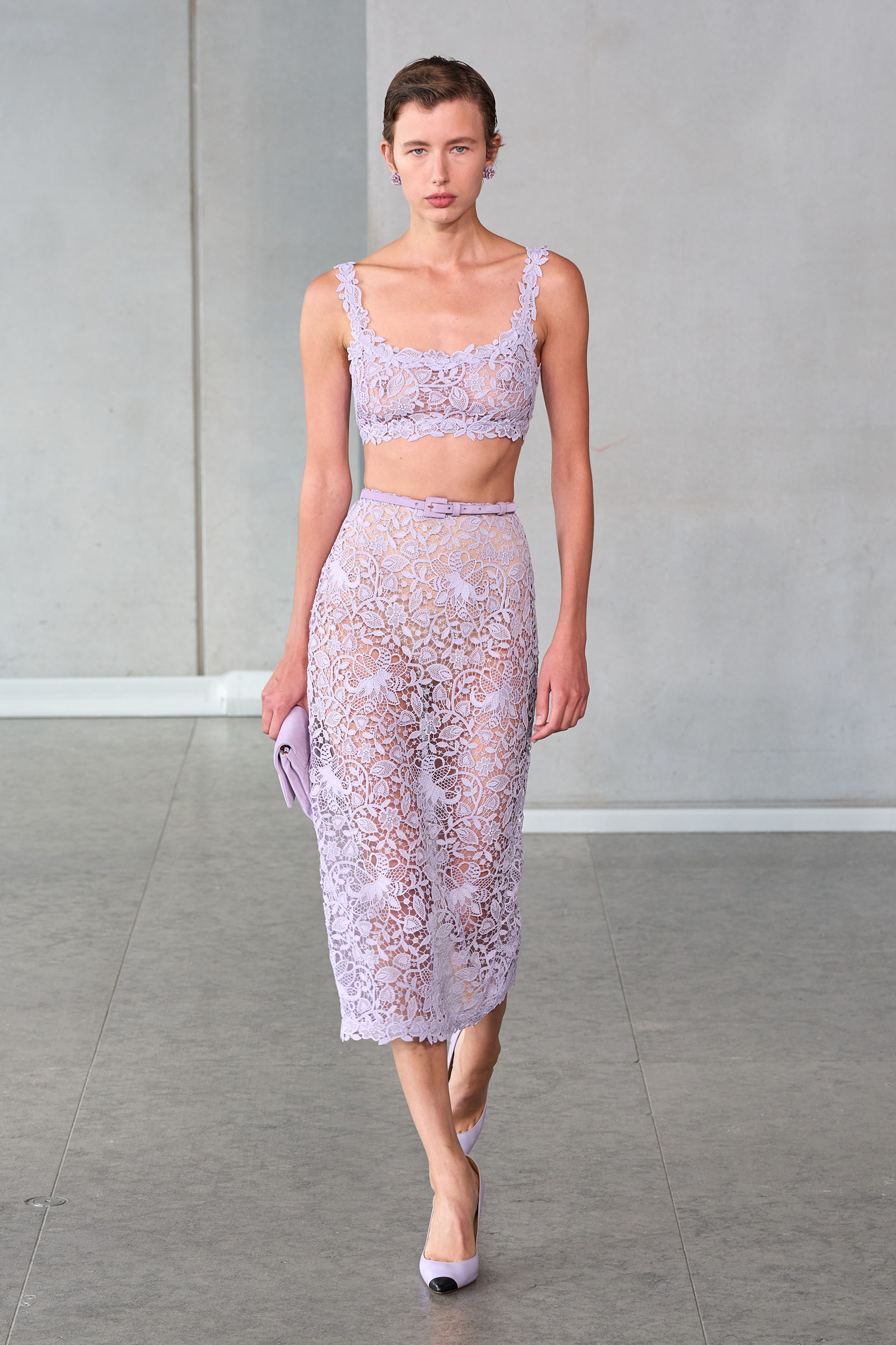 He opened with a white shirt, Mrs. Herrera’s signature piece and the garment that earned her the nickname “our lady of the sleeves,” but much of the rest of the collection seemed designed to say it’s his Herrera now. I’m thinking of the yellow mini crini dress or the lilac lace bra top and matching skirt, several inches of bare midriff between them, or the strapless black silk tunic and full-legged trousers. “I really was just thinking of pieces that I want my girlfriends to wear,” Gordon said backstage.
