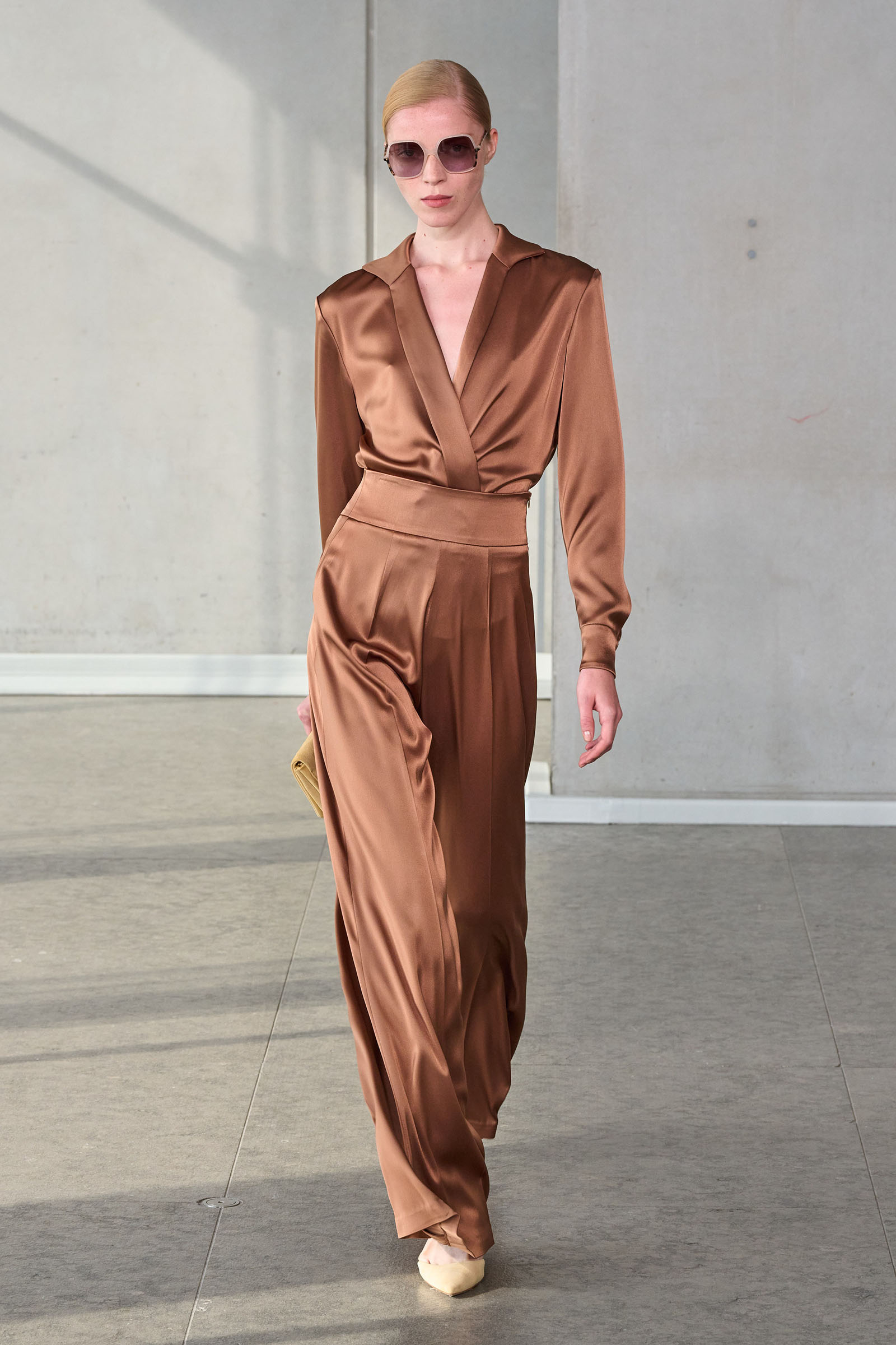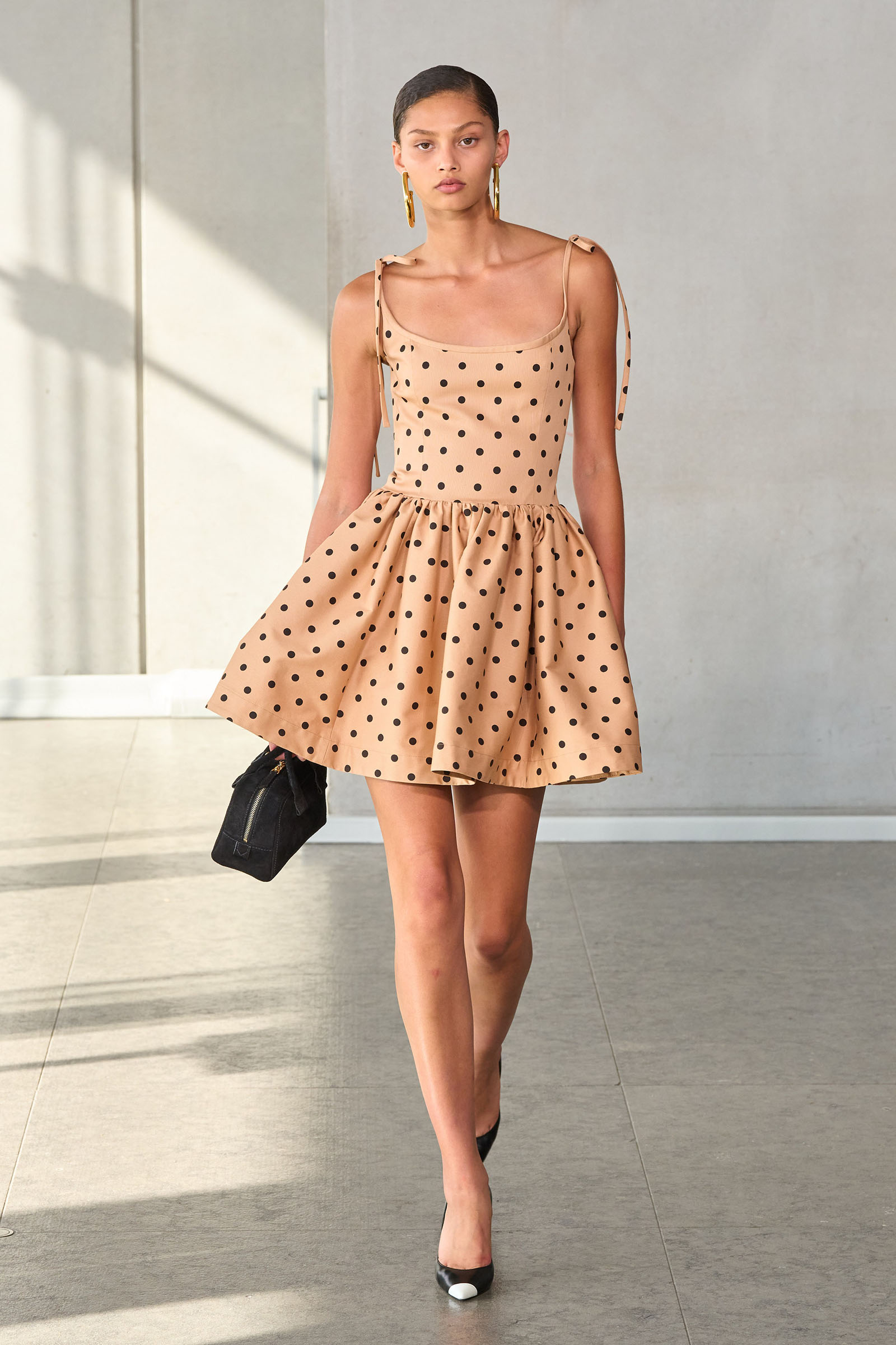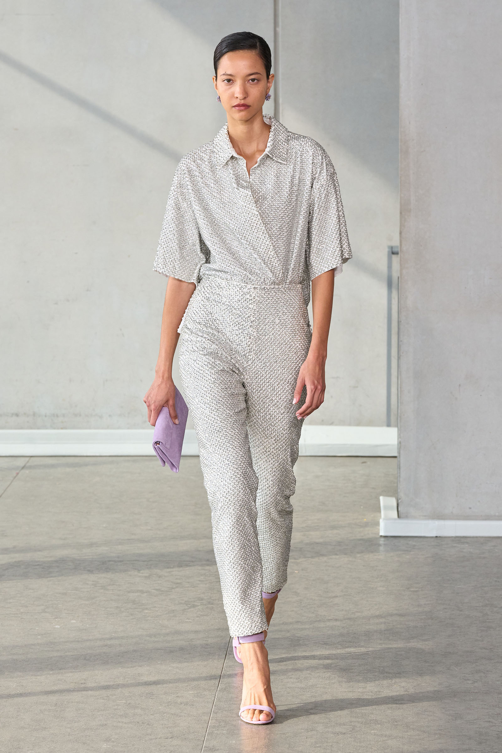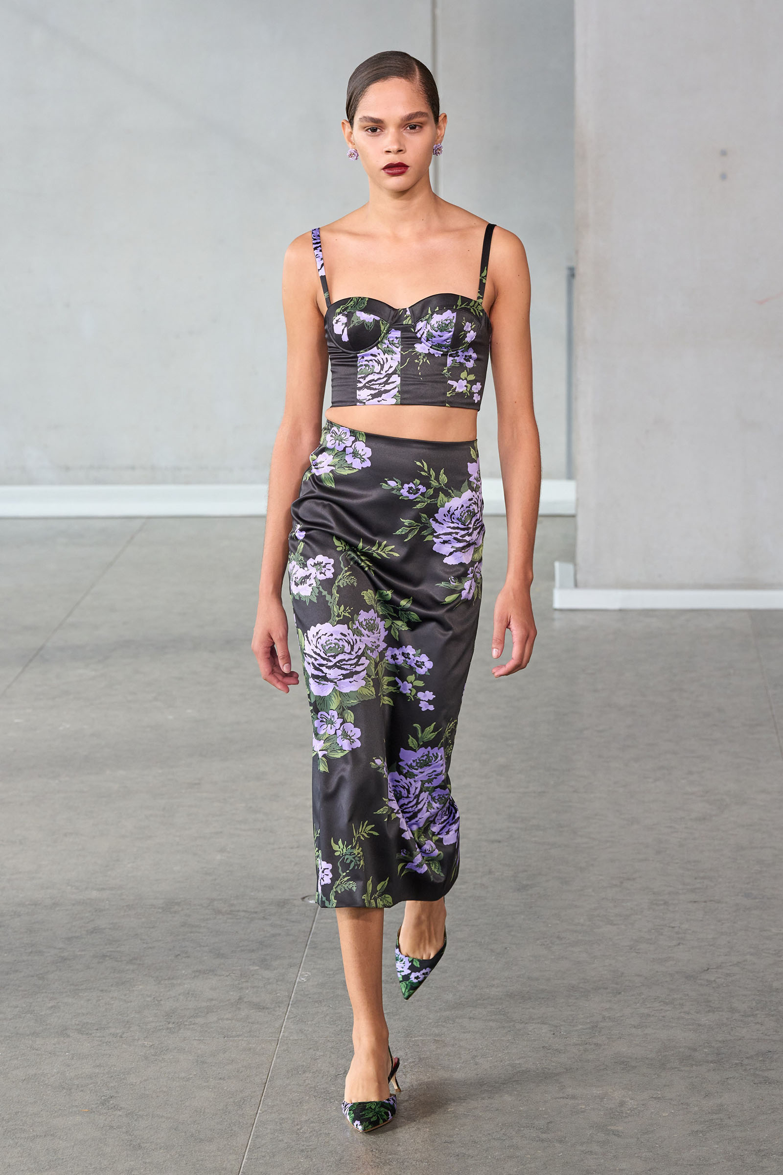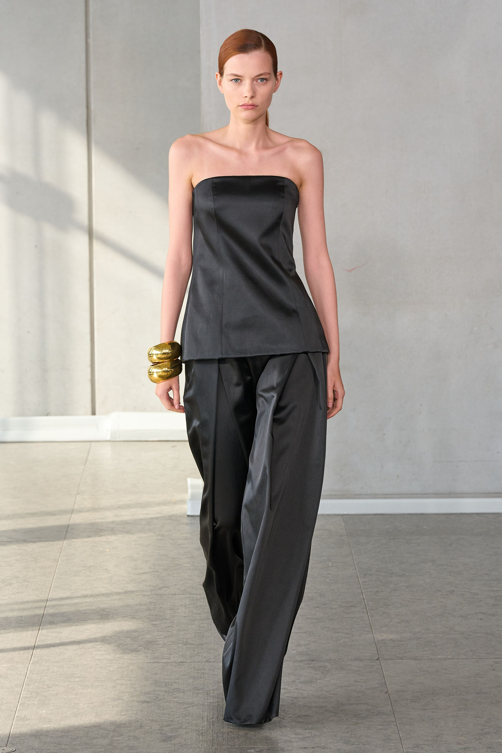 He opened with a white shirt, Mrs. Herrera’s signature piece and the garment that earned her the nickname “our lady of the sleeves,” but much of the rest of the collection seemed designed to say it’s his Herrera now. I’m thinking of the yellow mini crini dress or the lilac lace bra top and matching skirt, several inches of bare midriff between them, or the strapless black silk tunic and full-legged trousers. “I really was just thinking of pieces that I want my girlfriends to wear,” Gordon said backstage.