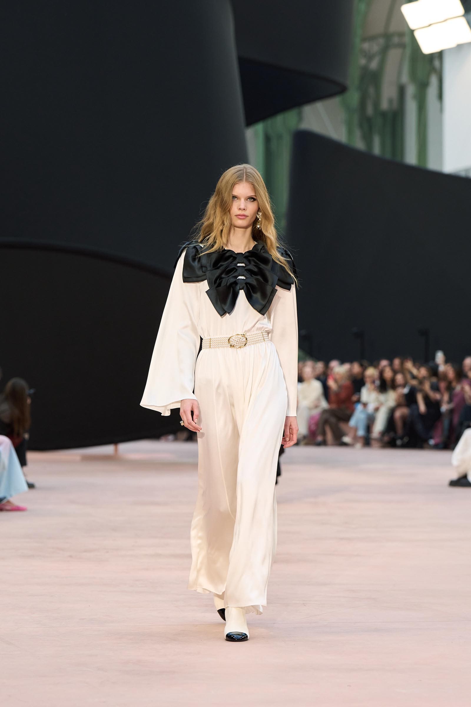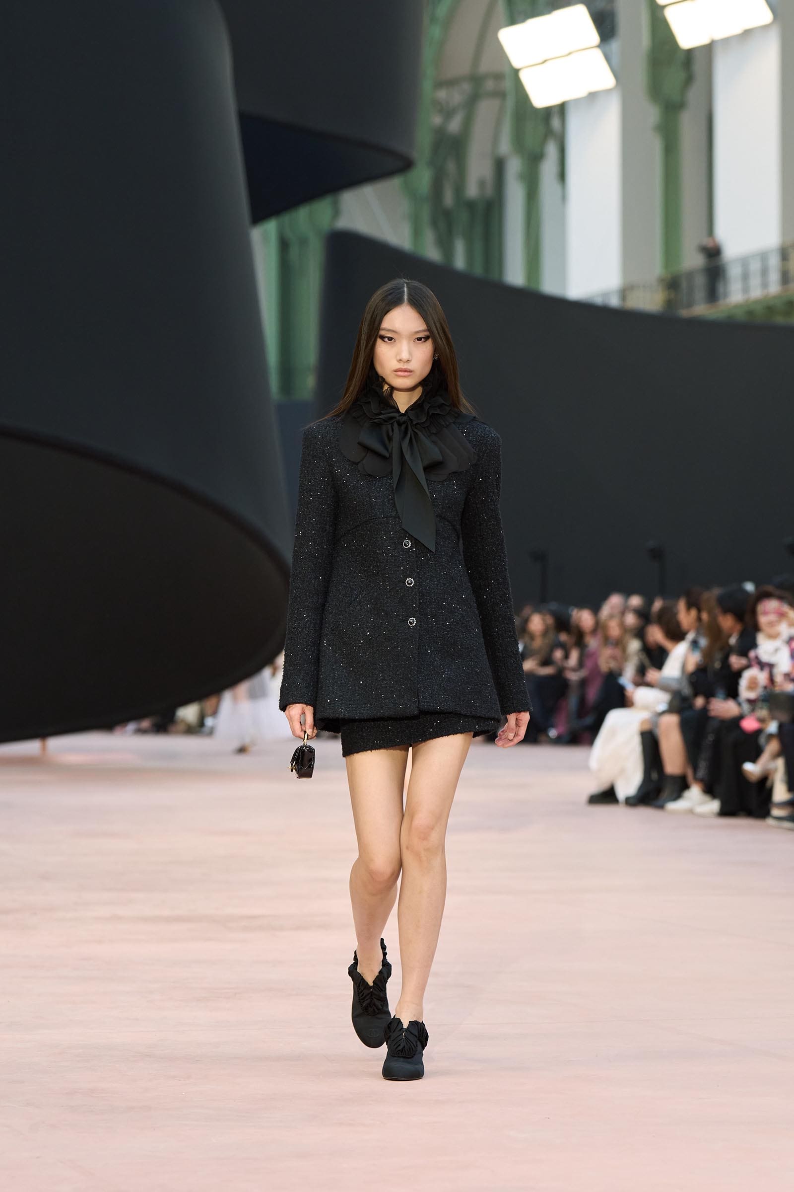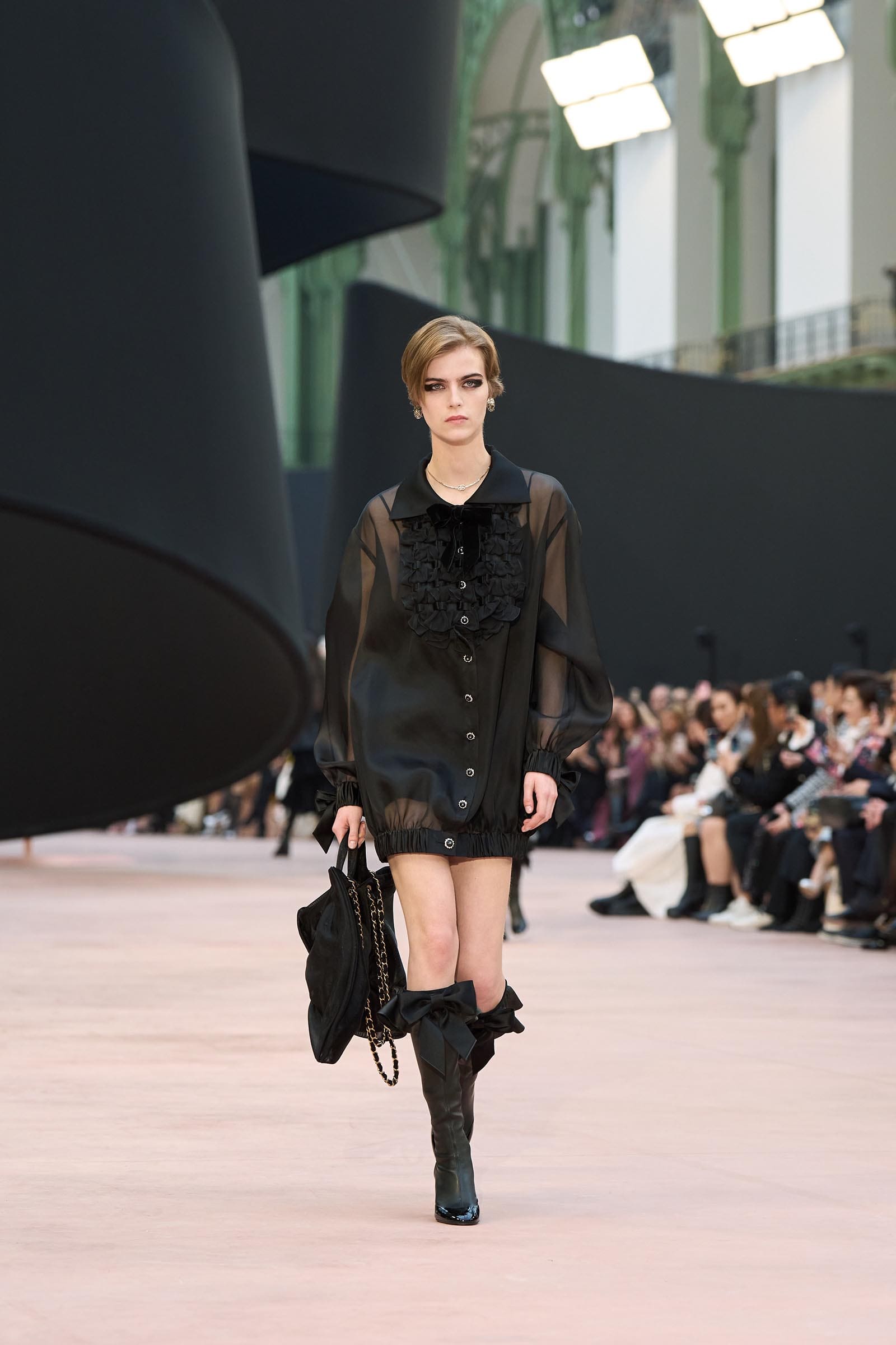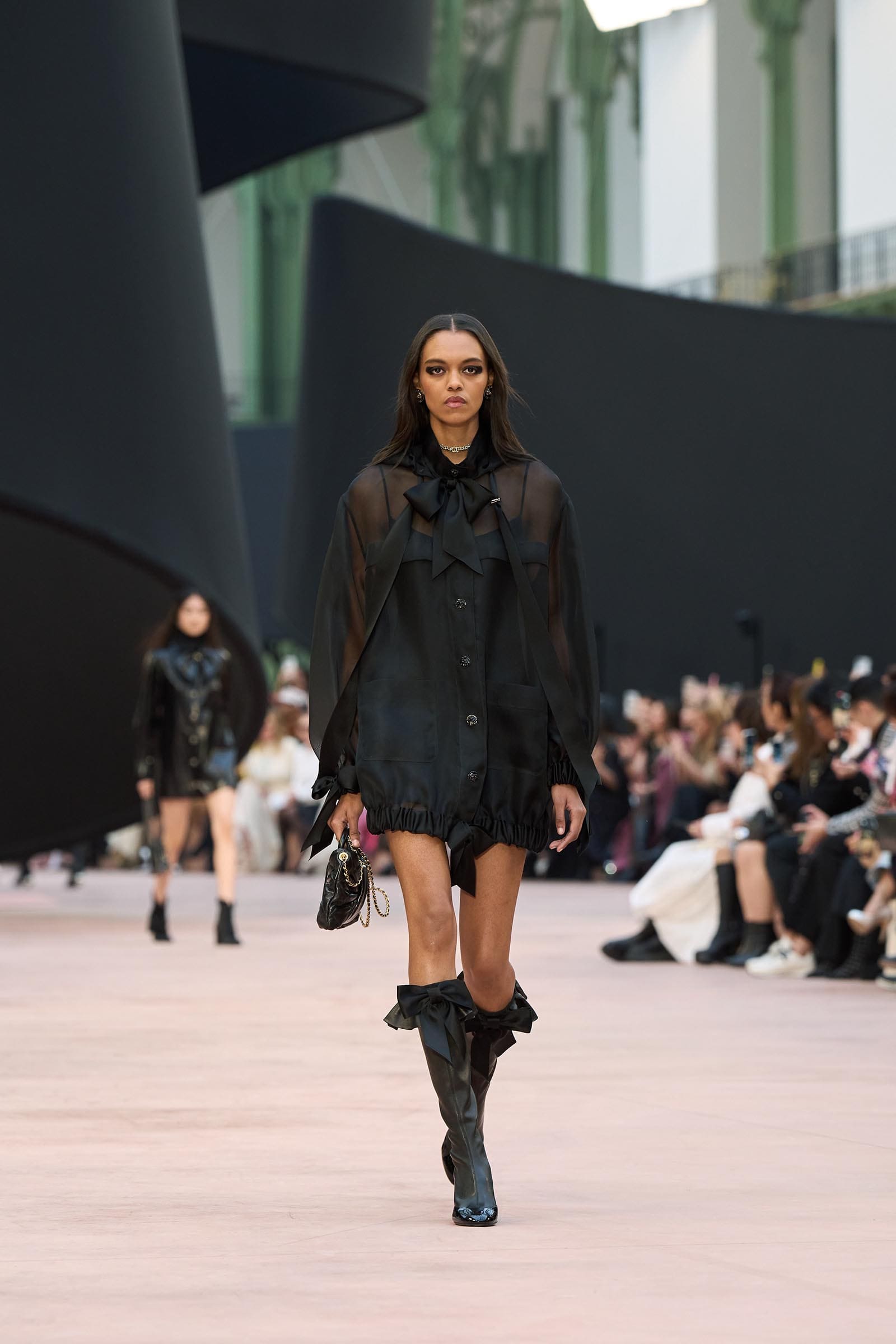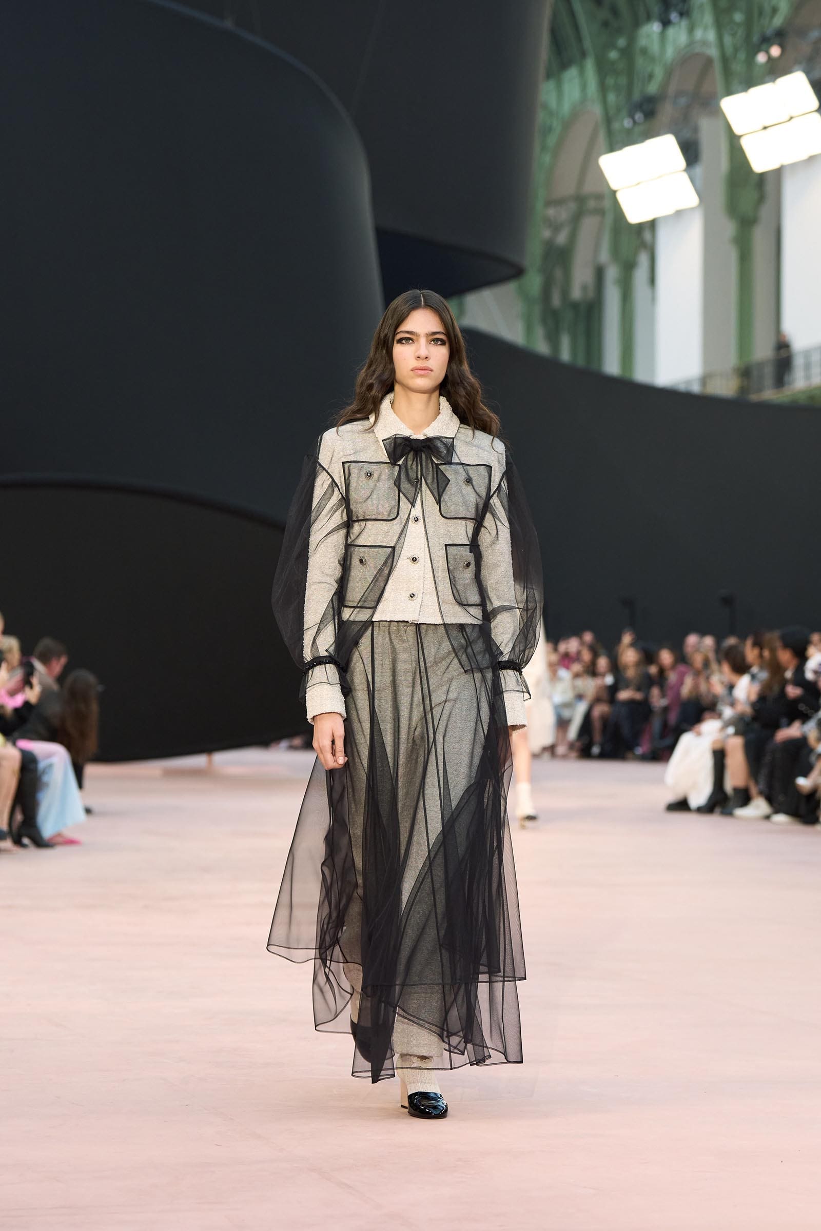In the interim before Matthieu Blazy’s much-anticipated debut, Chanel constructed a huge black ribbon-shaped set at the Grand Palais, the better to tie the fall show to Coco’s codes. Much as the haute couture was earlier this year, this was a case of continuity-Chanel by the Fashion Creation Studio at the Rue Cambon, fulfilled with a light-ish air.