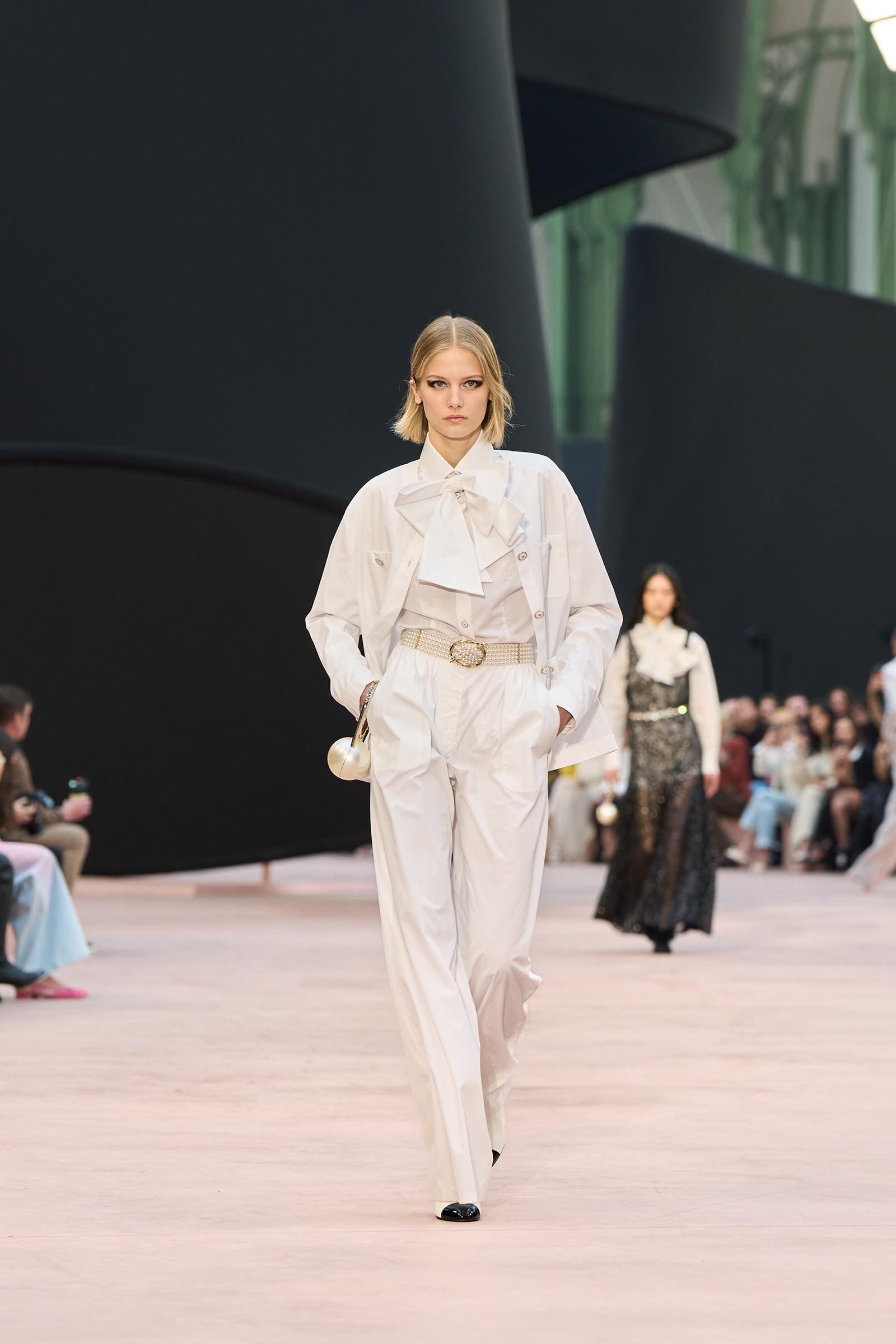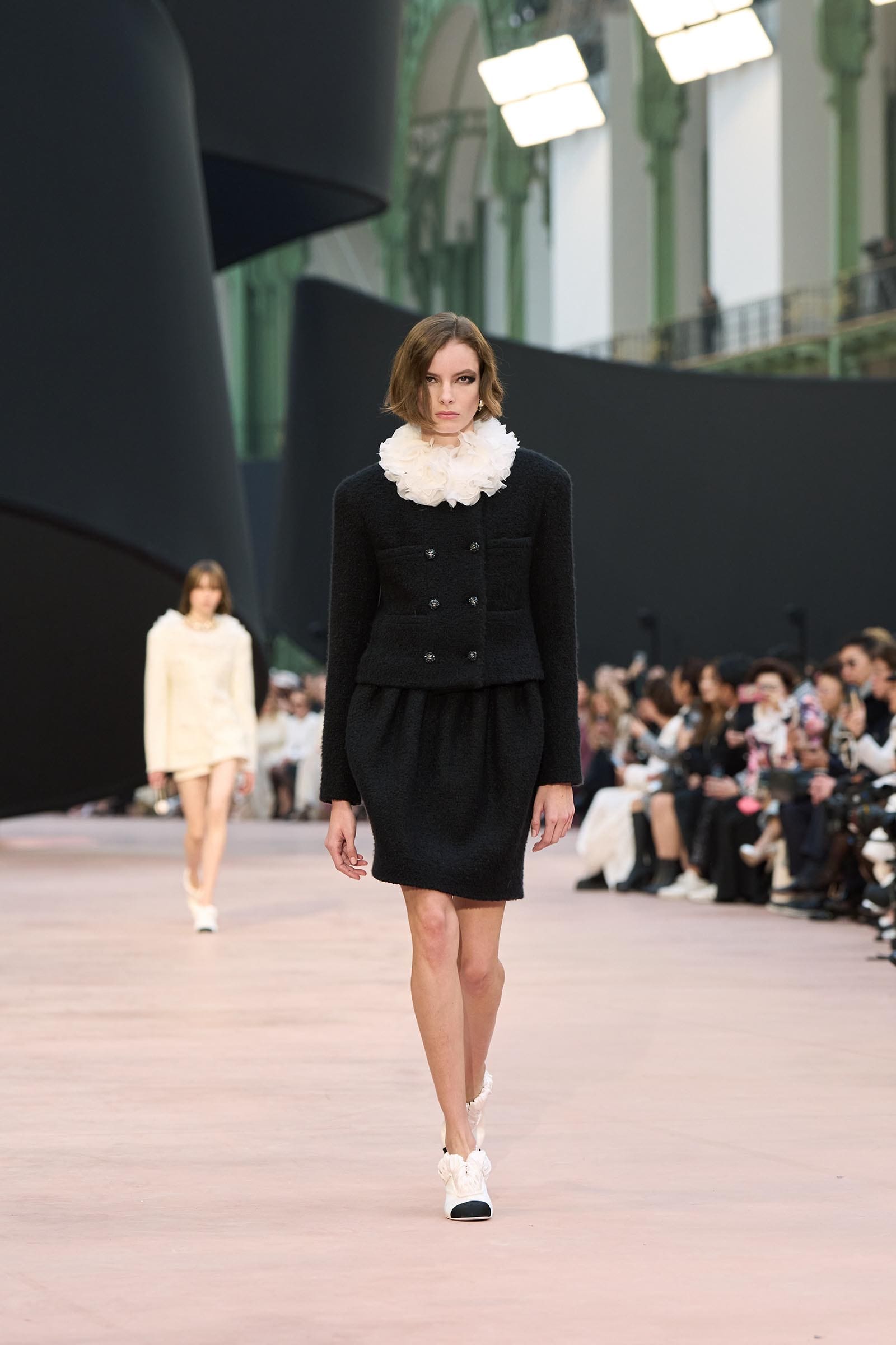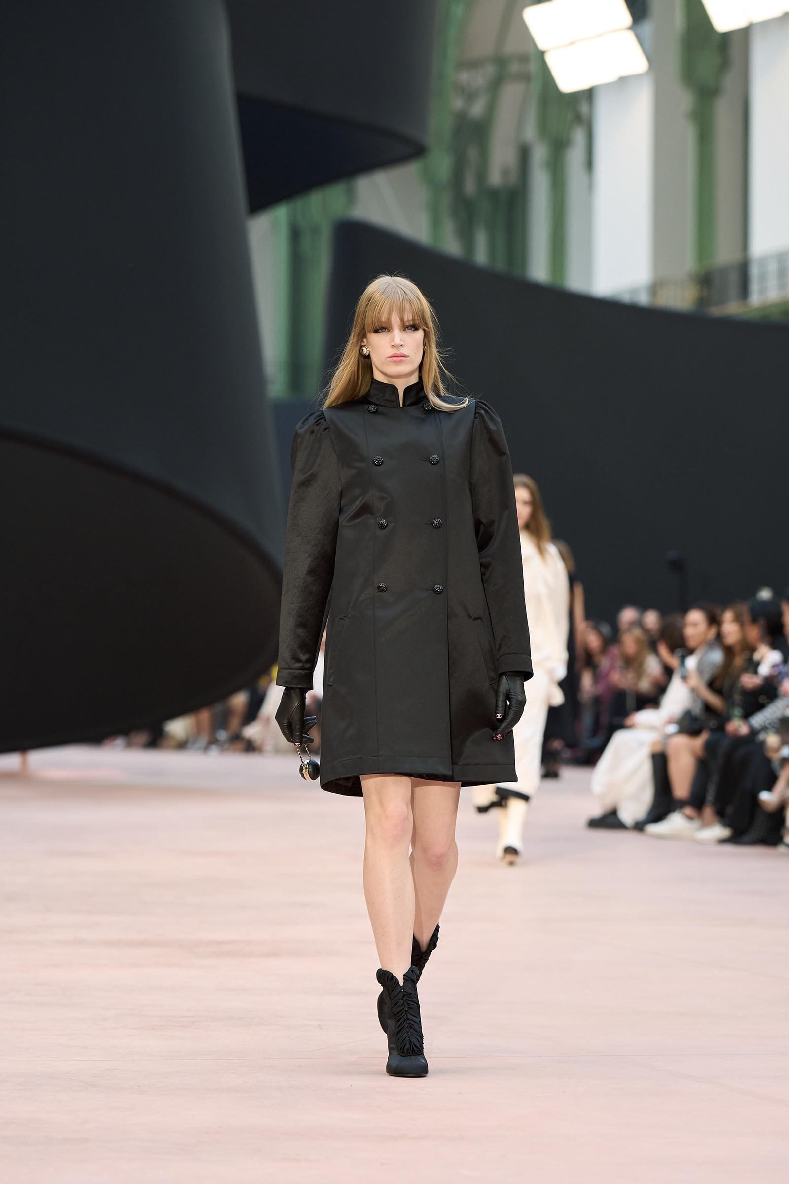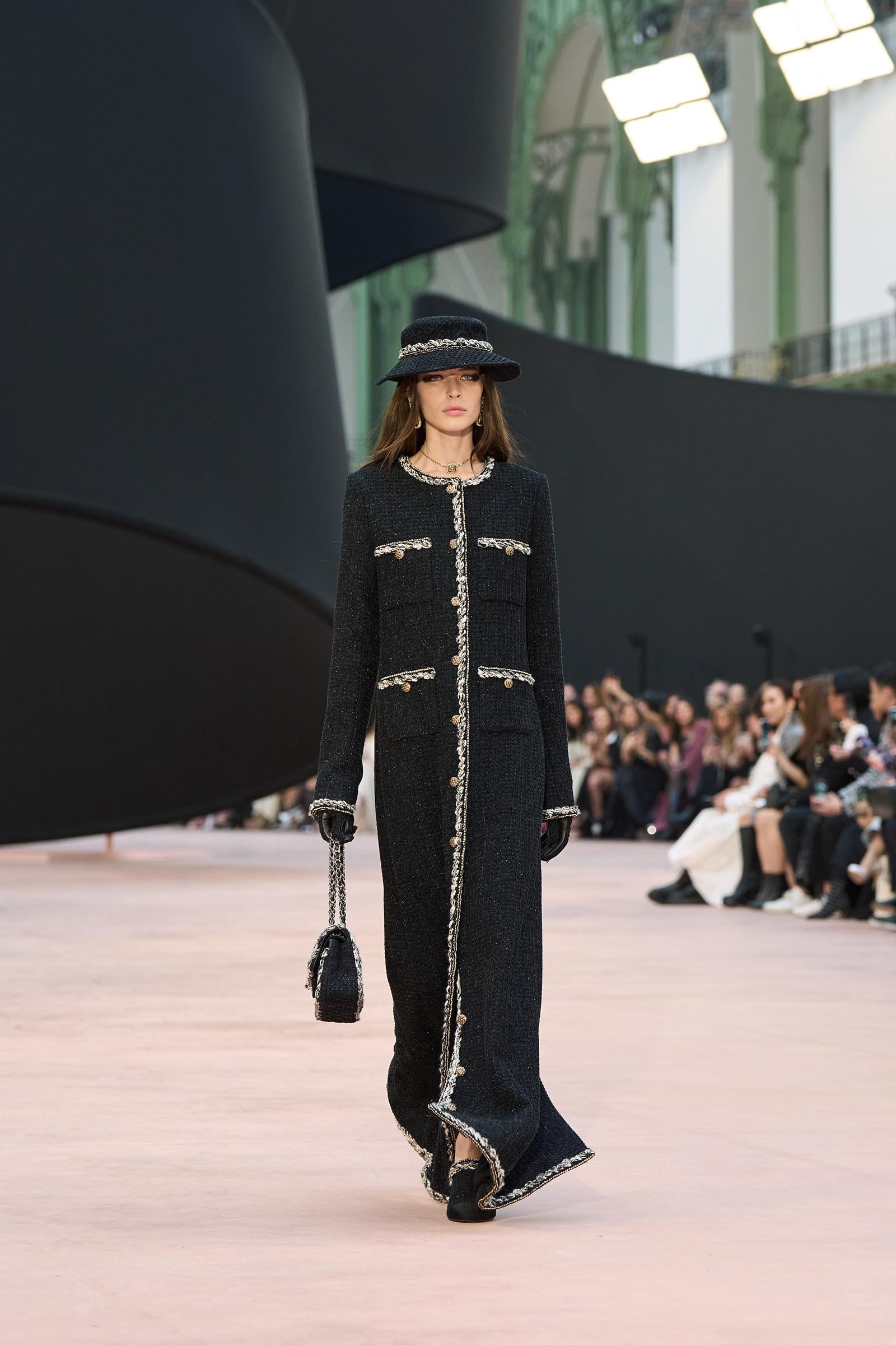 In the interim before Matthieu Blazy’s much-anticipated debut, Chanel constructed a huge black ribbon-shaped set at the Grand Palais, the better to tie the fall show to Coco’s codes. Much as the haute couture was earlier this year, this was a case of continuity-Chanel by the Fashion Creation Studio at the Rue Cambon, fulfilled with a light-ish air.