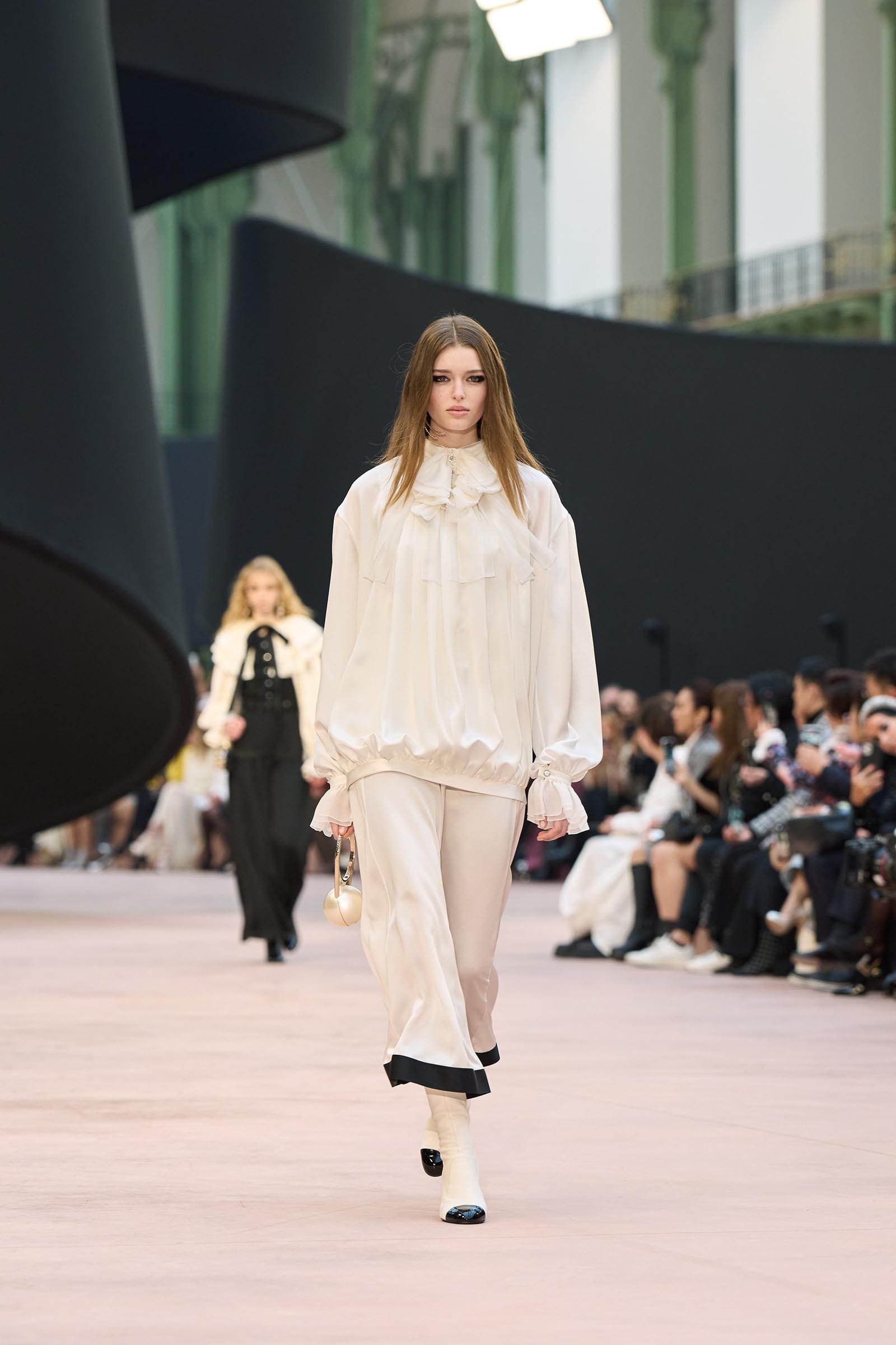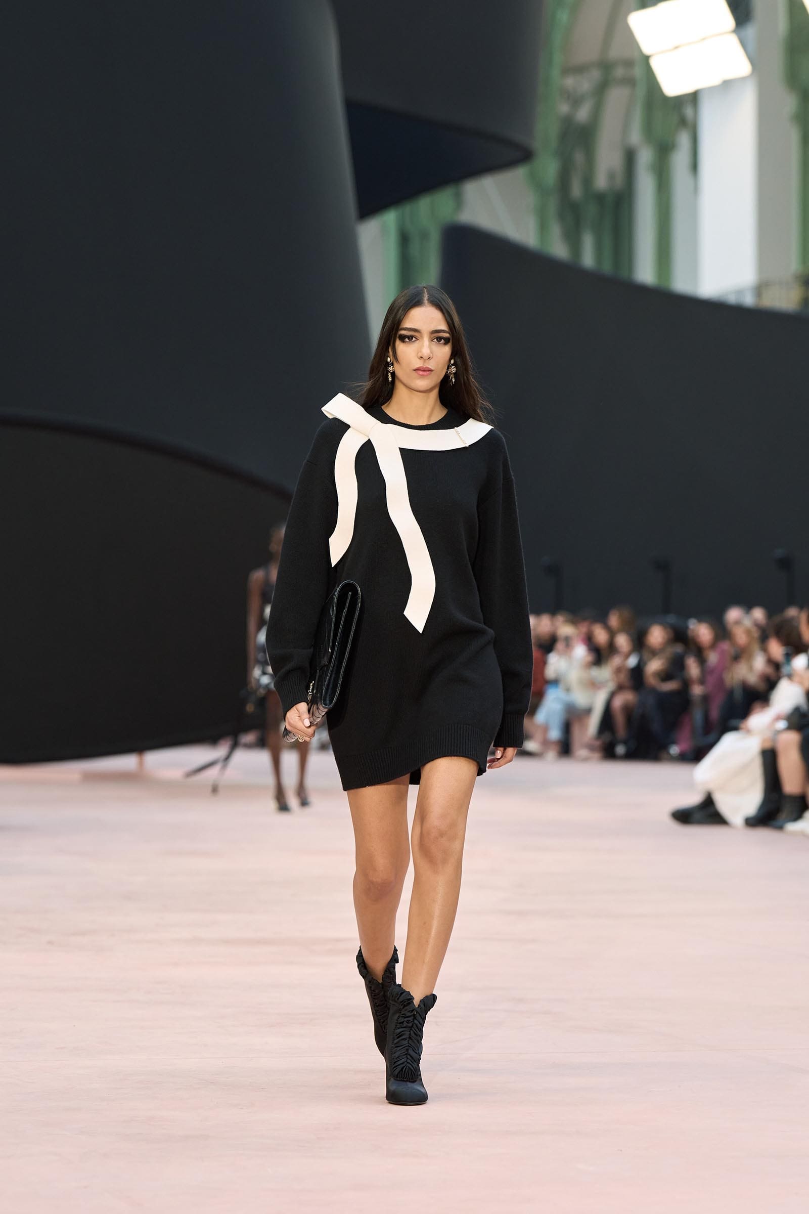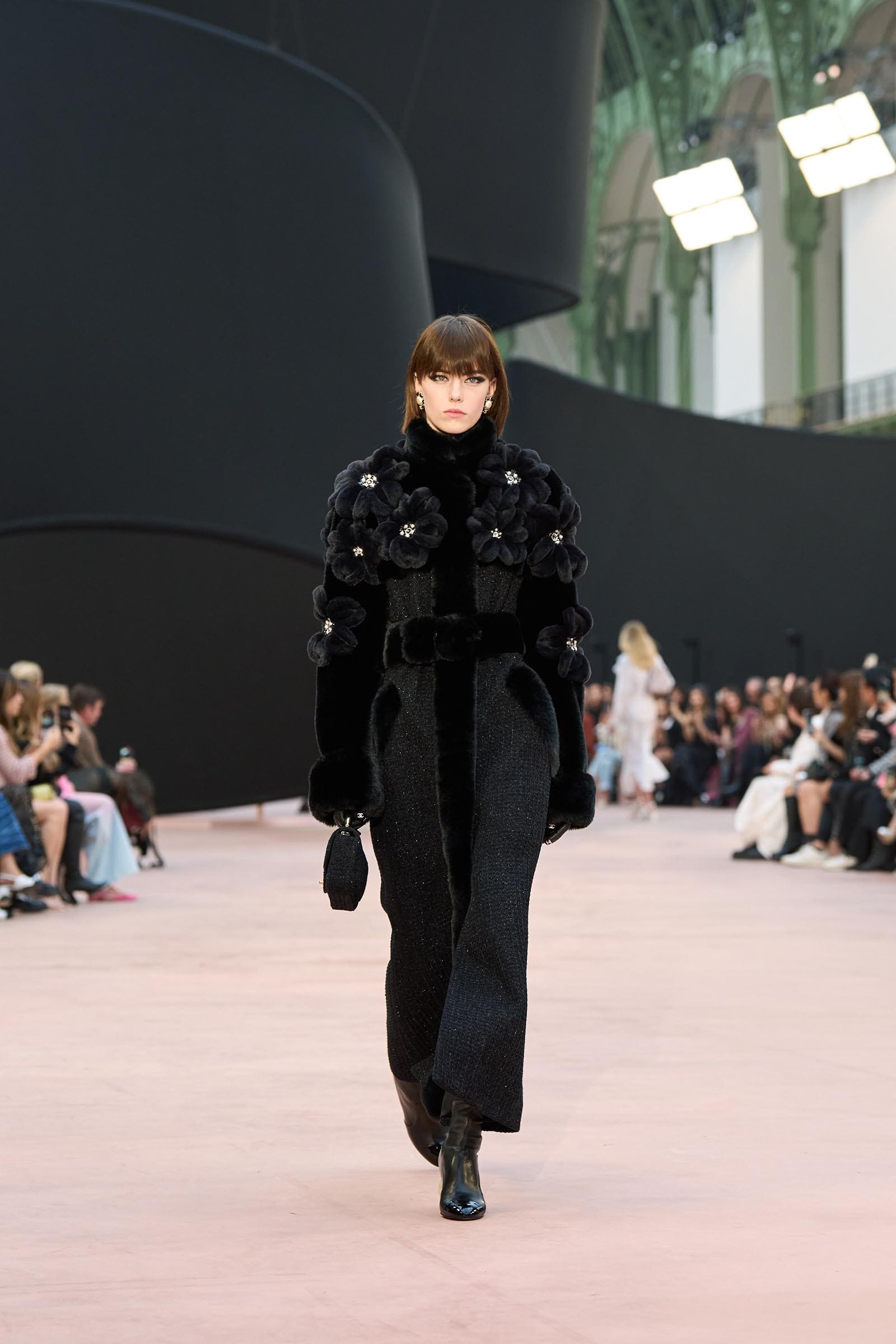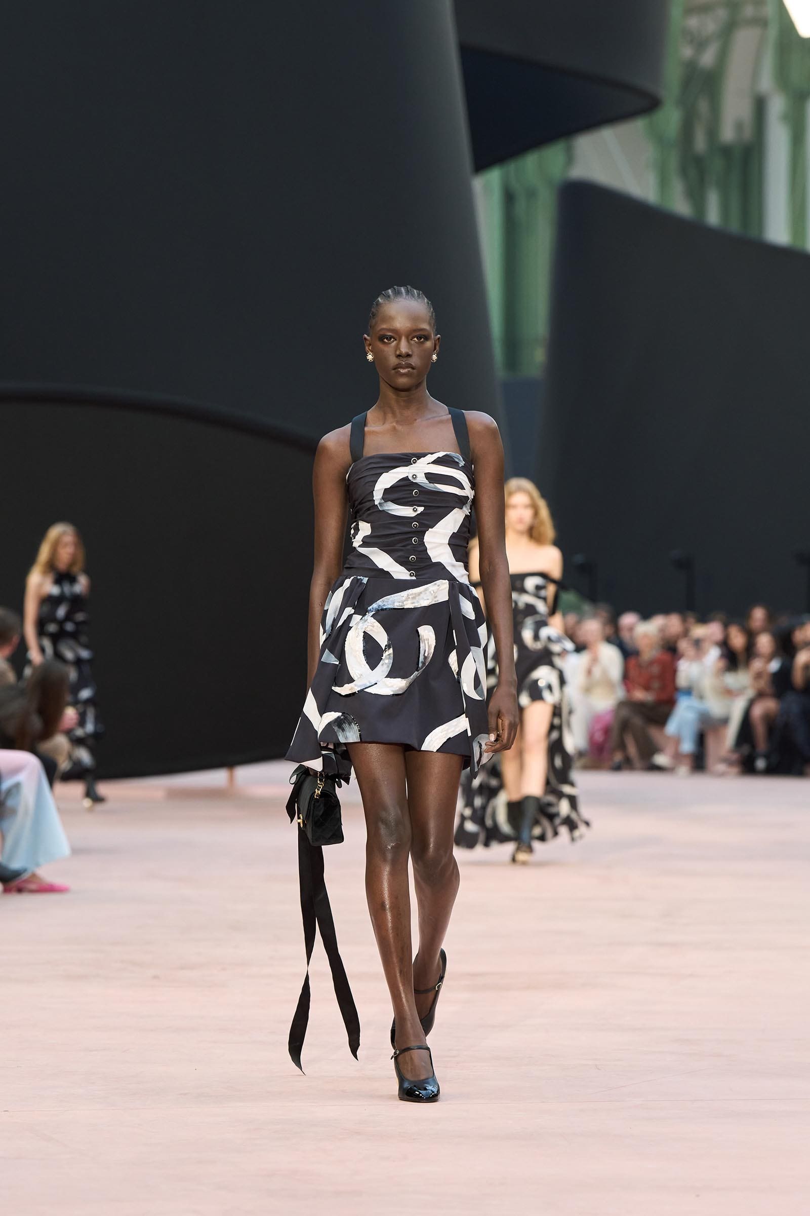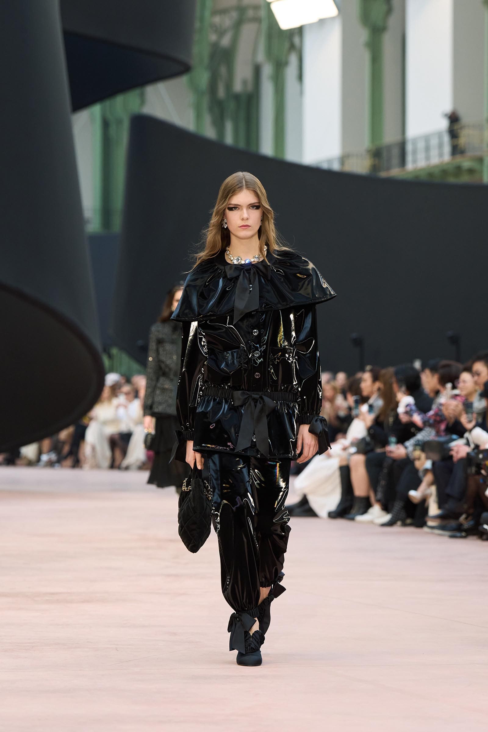 In the interim before Matthieu Blazy’s much-anticipated debut, Chanel constructed a huge black ribbon-shaped set at the Grand Palais, the better to tie the fall show to Coco’s codes. Much as the haute couture was earlier this year, this was a case of continuity-Chanel by the Fashion Creation Studio at the Rue Cambon, fulfilled with a light-ish air.