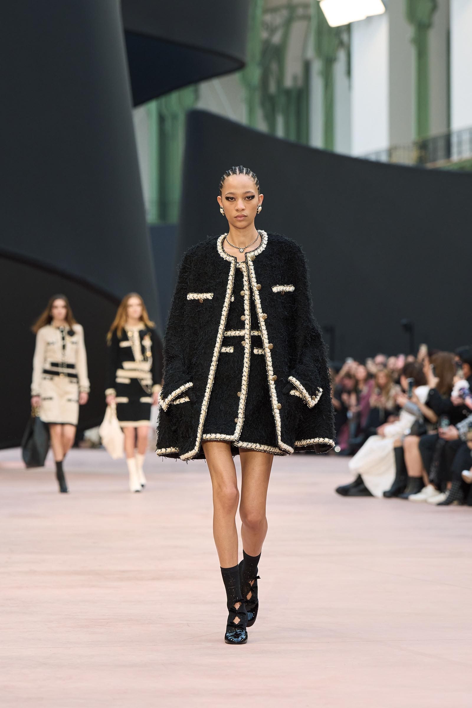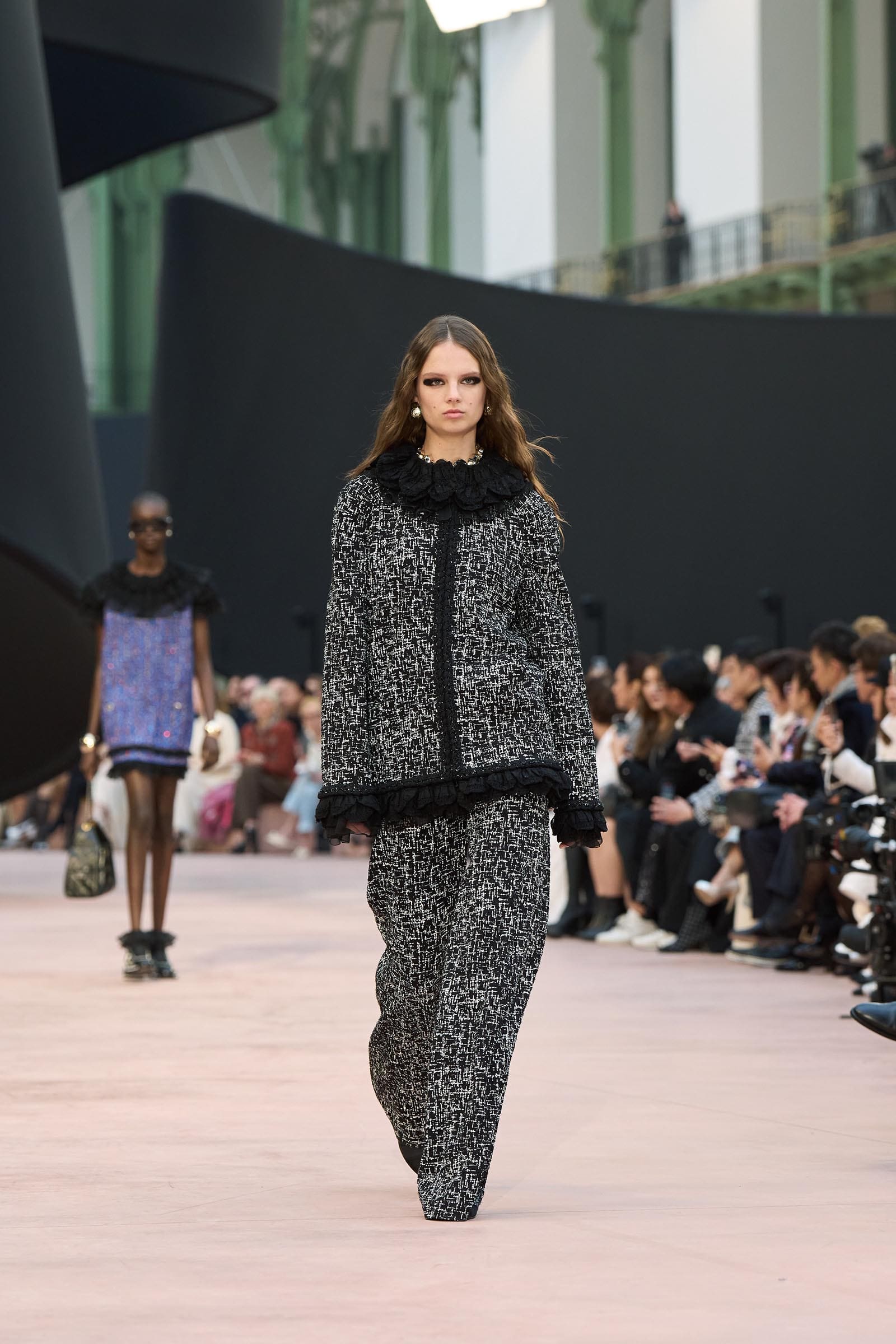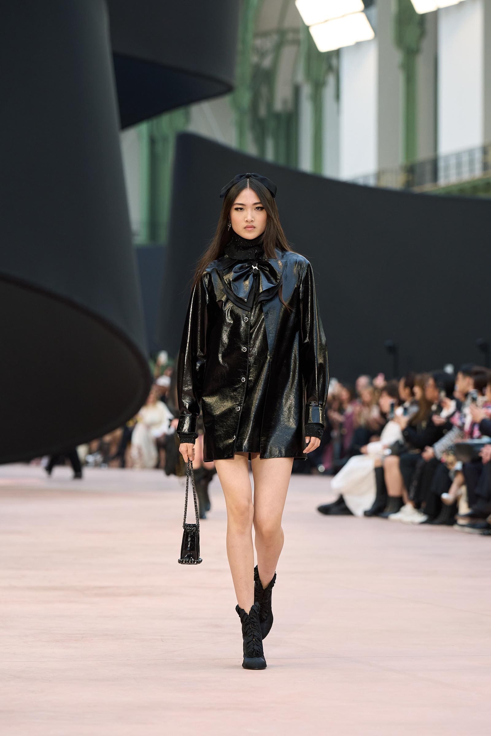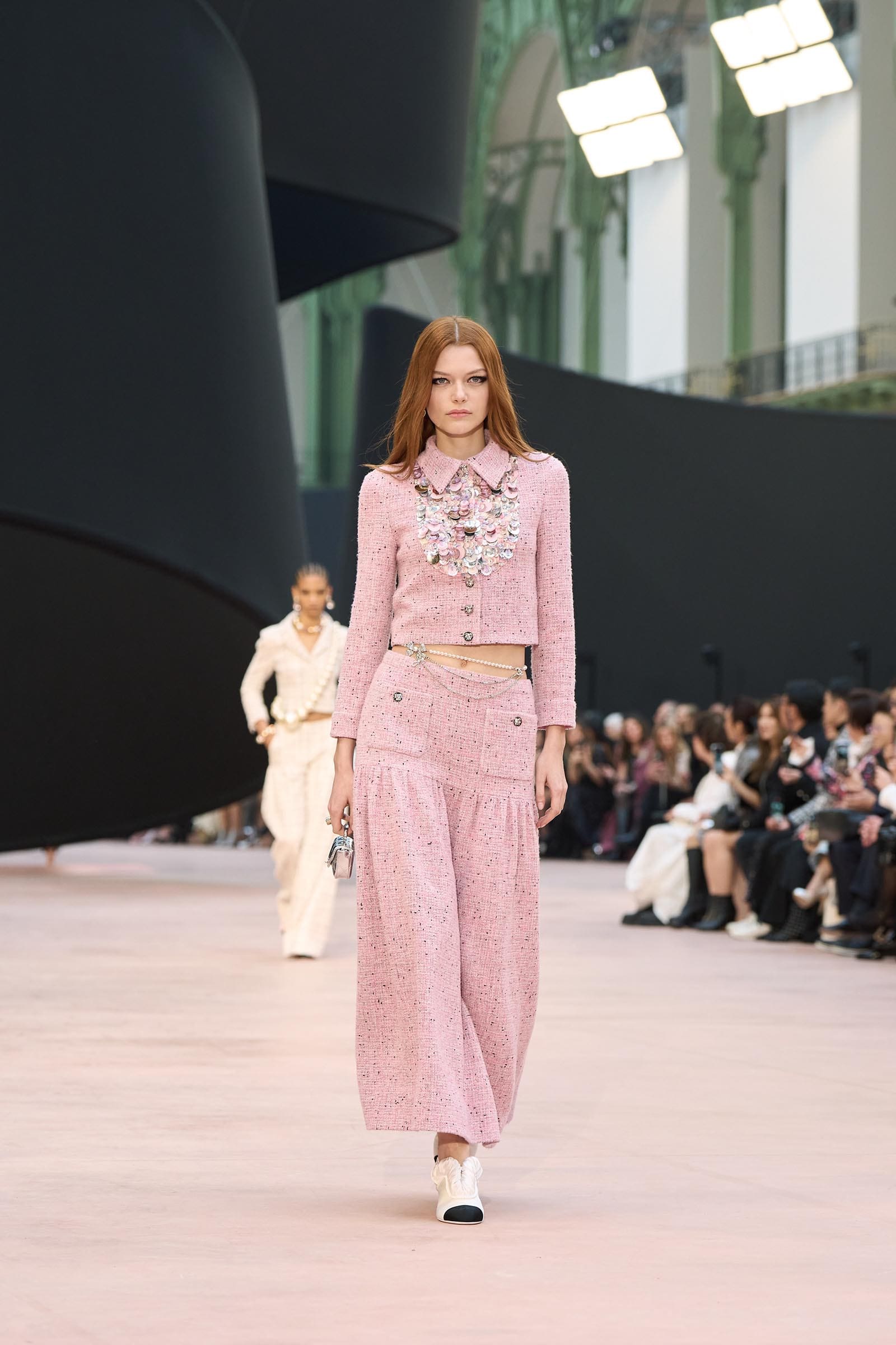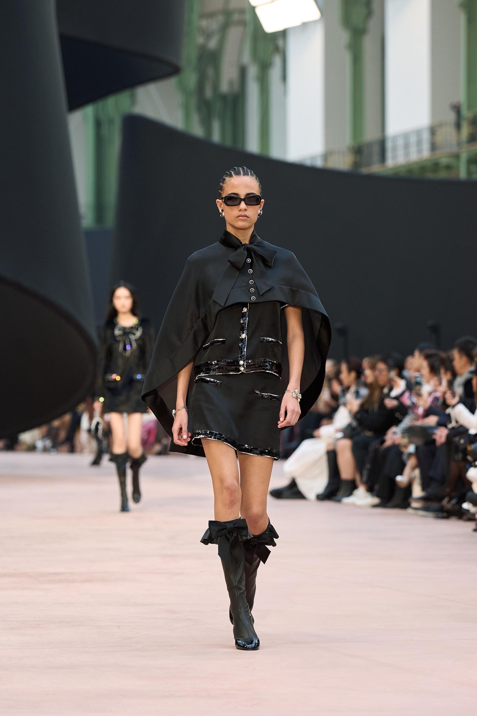 In the interim before Matthieu Blazy’s much-anticipated debut, Chanel constructed a huge black ribbon-shaped set at the Grand Palais, the better to tie the fall show to Coco’s codes. Much as the haute couture was earlier this year, this was a case of continuity-Chanel by the Fashion Creation Studio at the Rue Cambon, fulfilled with a light-ish air.