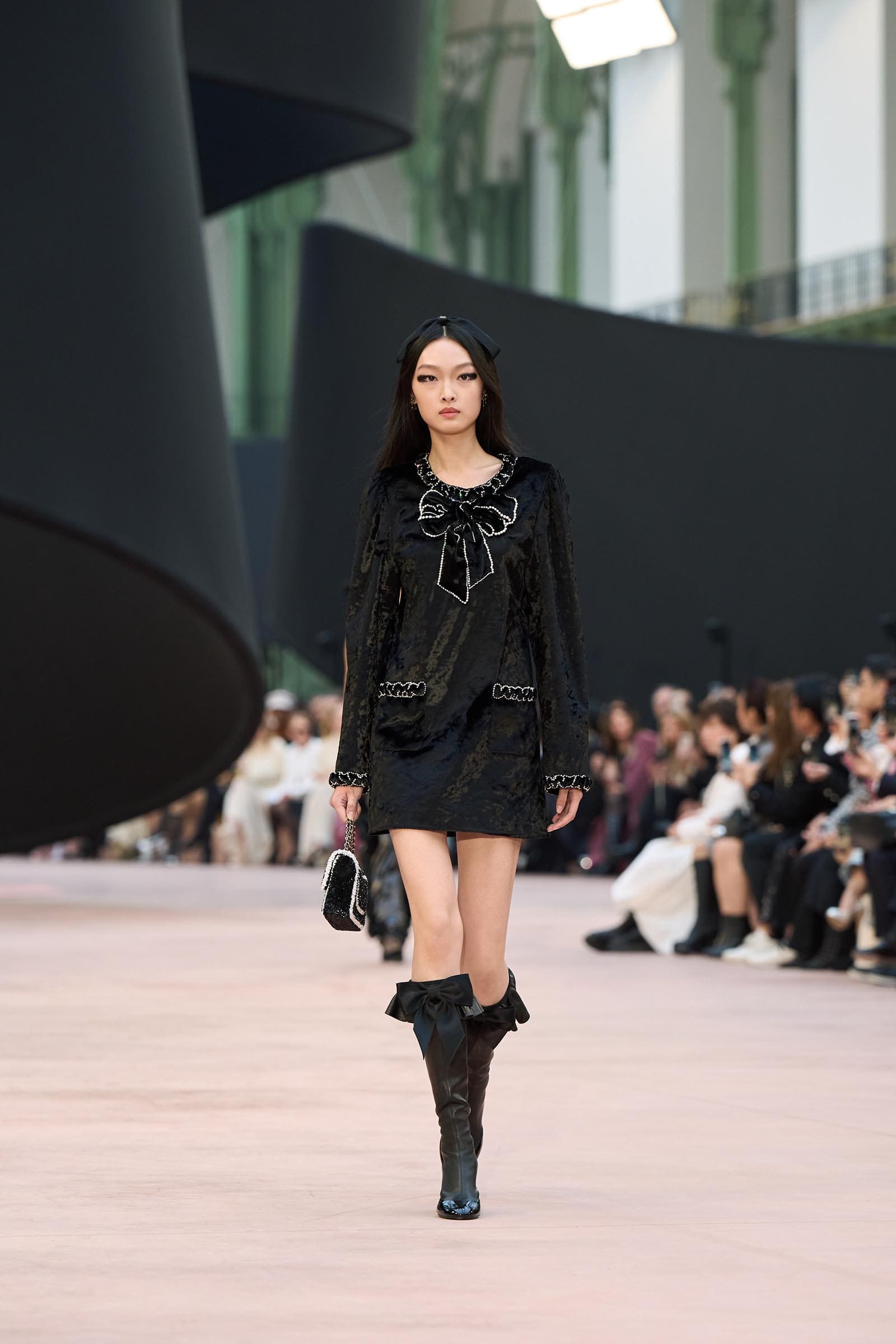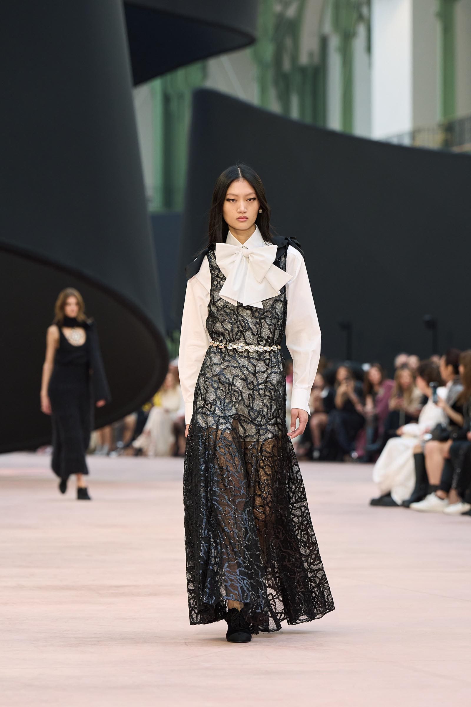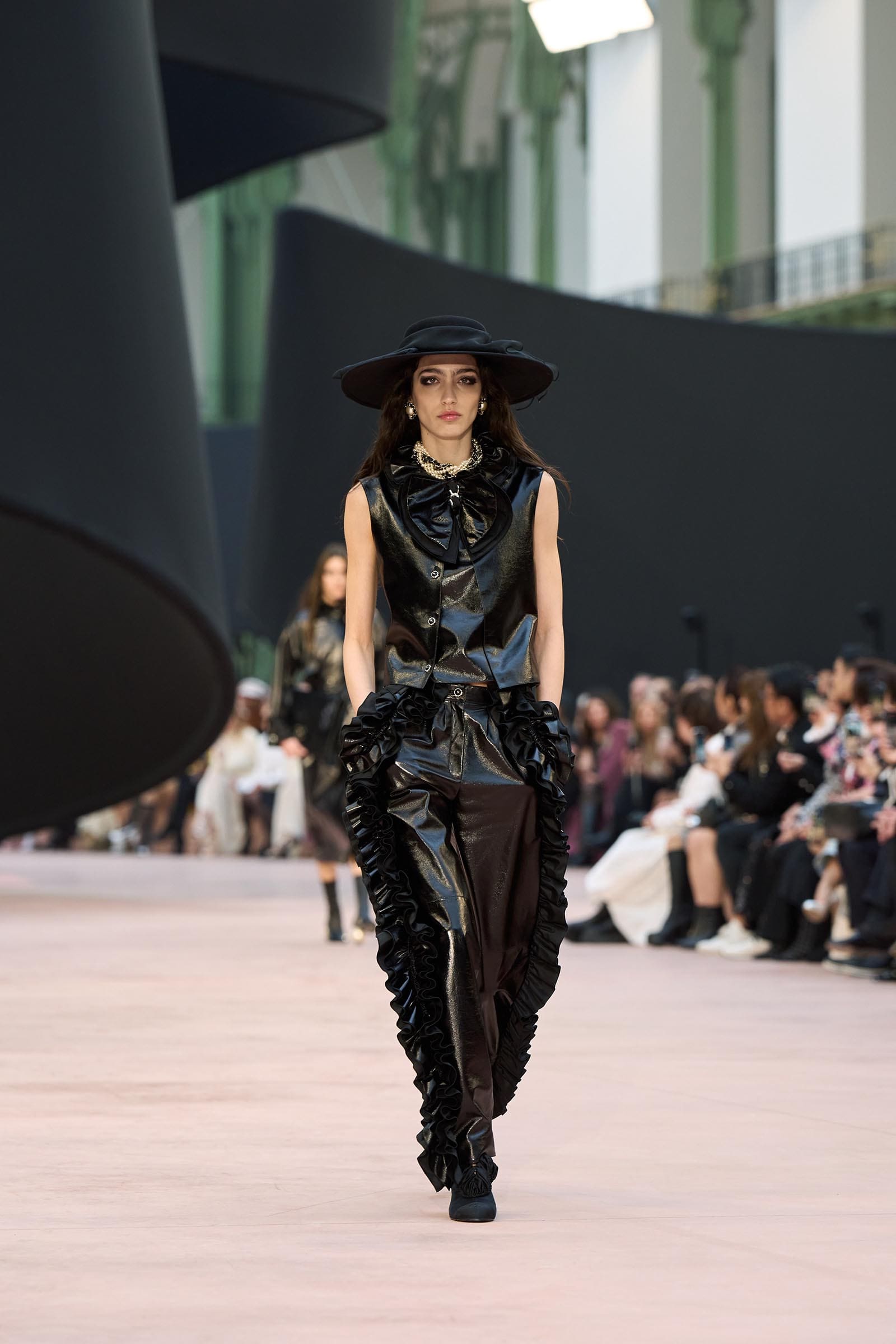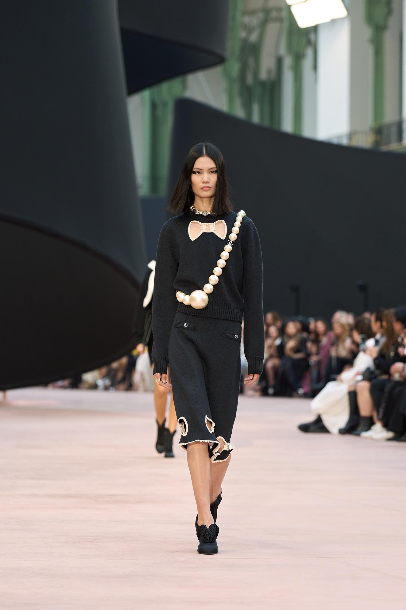 In the interim before Matthieu Blazy’s much-anticipated debut, Chanel constructed a huge black ribbon-shaped set at the Grand Palais, the better to tie the fall show to Coco’s codes. Much as the haute couture was earlier this year, this was a case of continuity-Chanel by the Fashion Creation Studio at the Rue Cambon, fulfilled with a light-ish air.