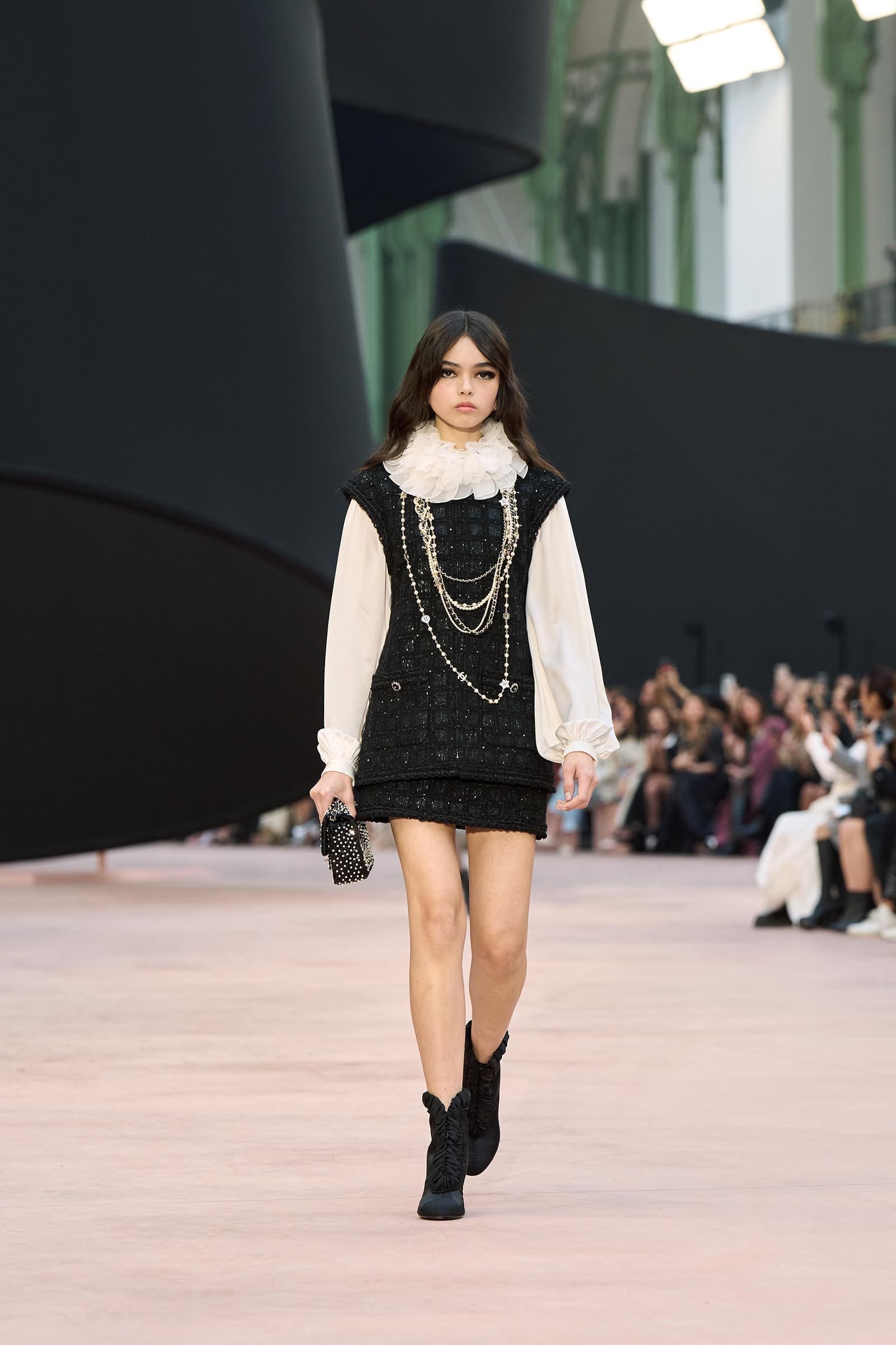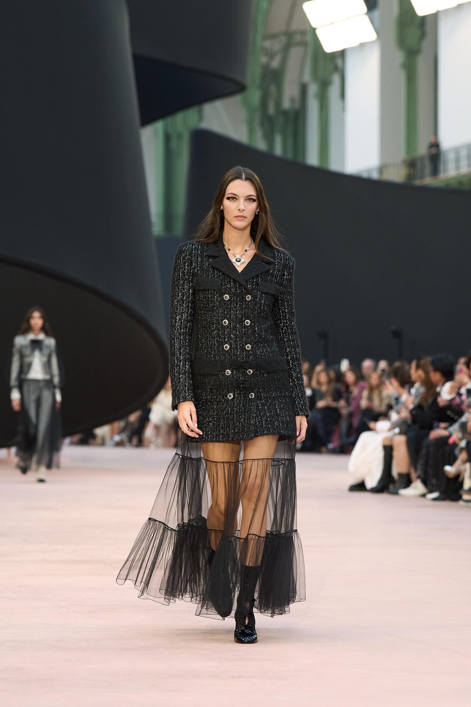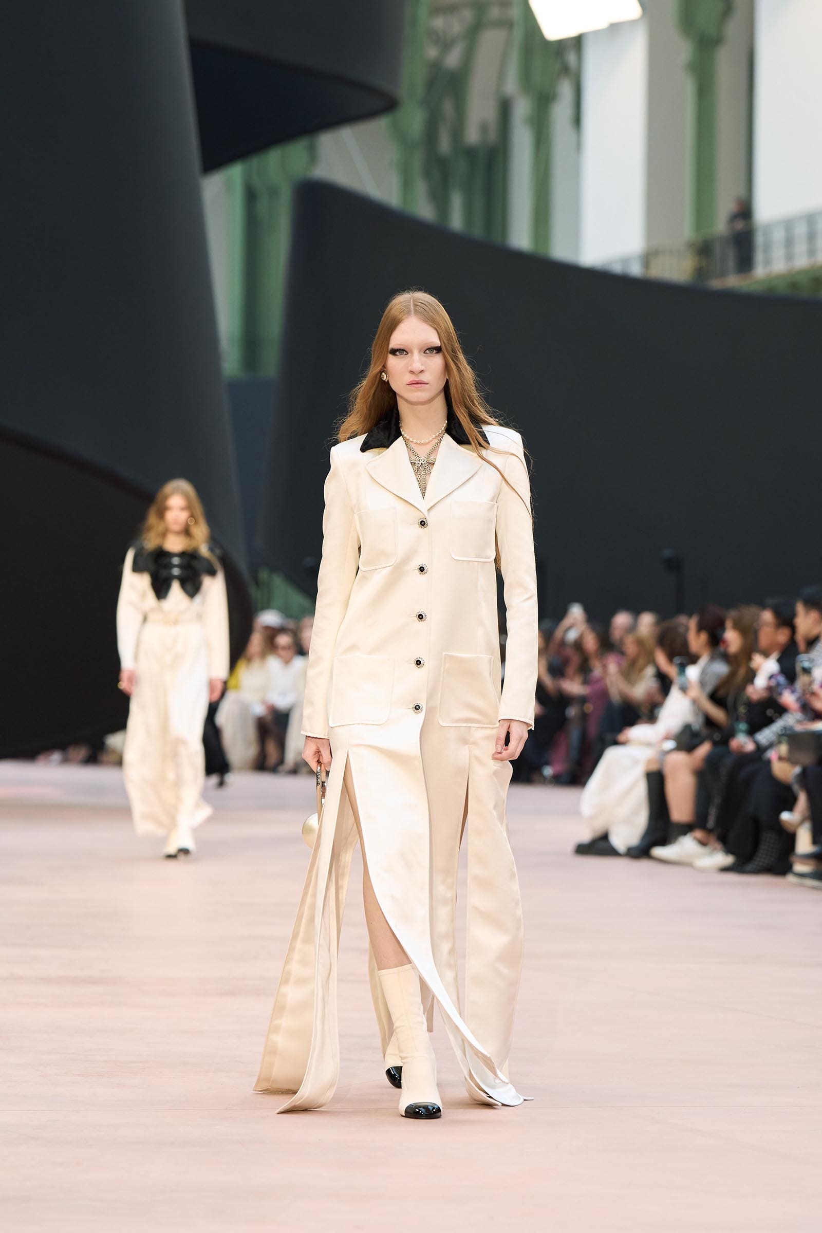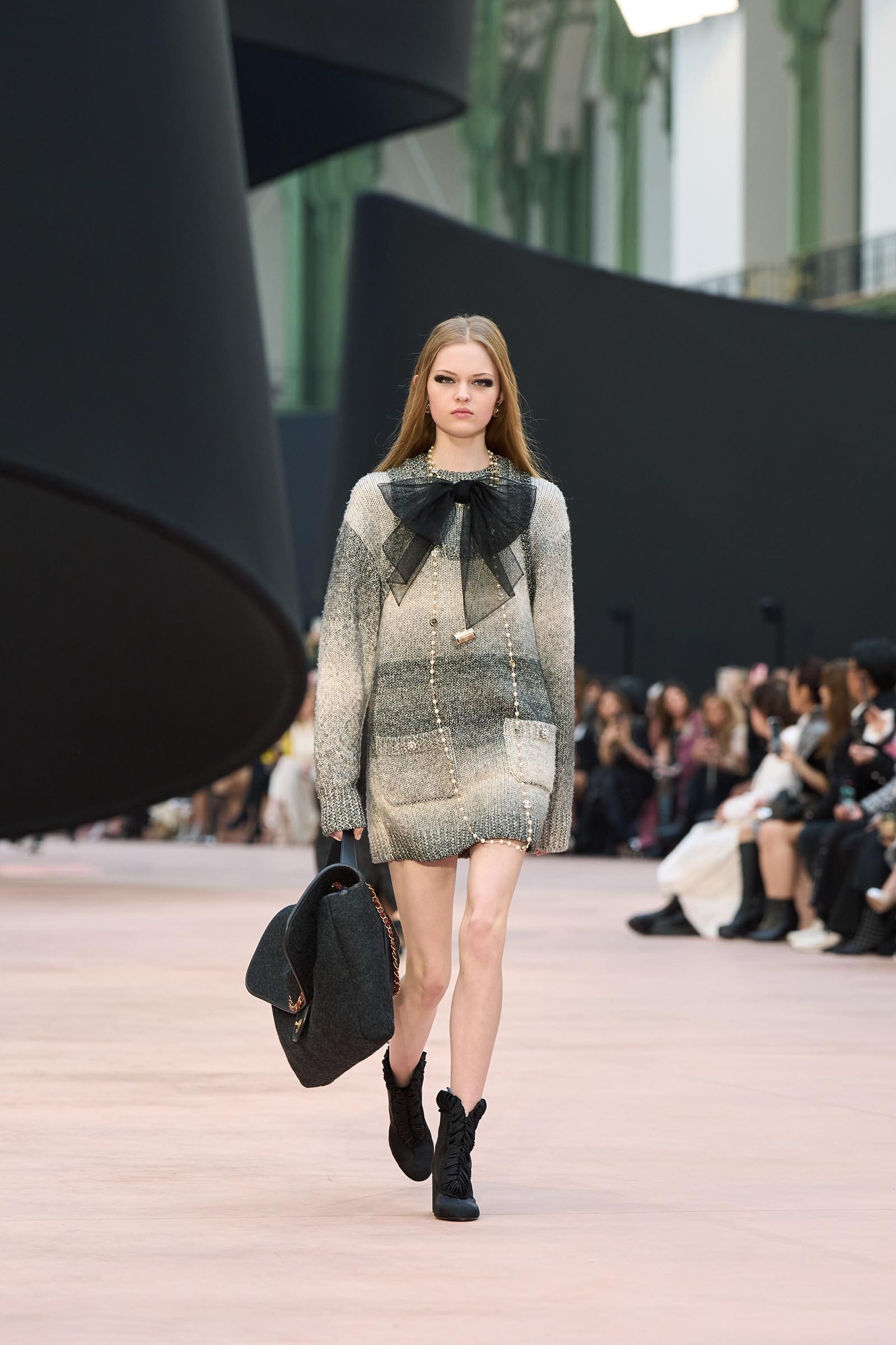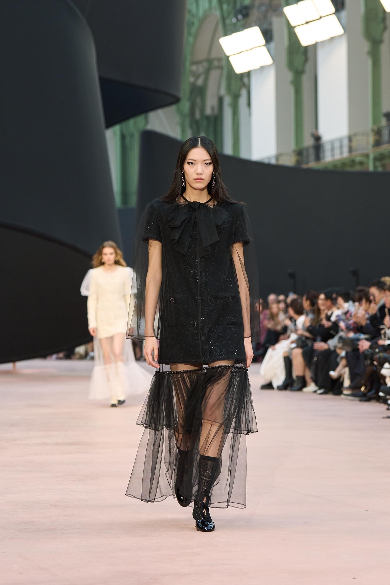 In the interim before Matthieu Blazy’s much-anticipated debut, Chanel constructed a huge black ribbon-shaped set at the Grand Palais, the better to tie the fall show to Coco’s codes. Much as the haute couture was earlier this year, this was a case of continuity-Chanel by the Fashion Creation Studio at the Rue Cambon, fulfilled with a light-ish air.