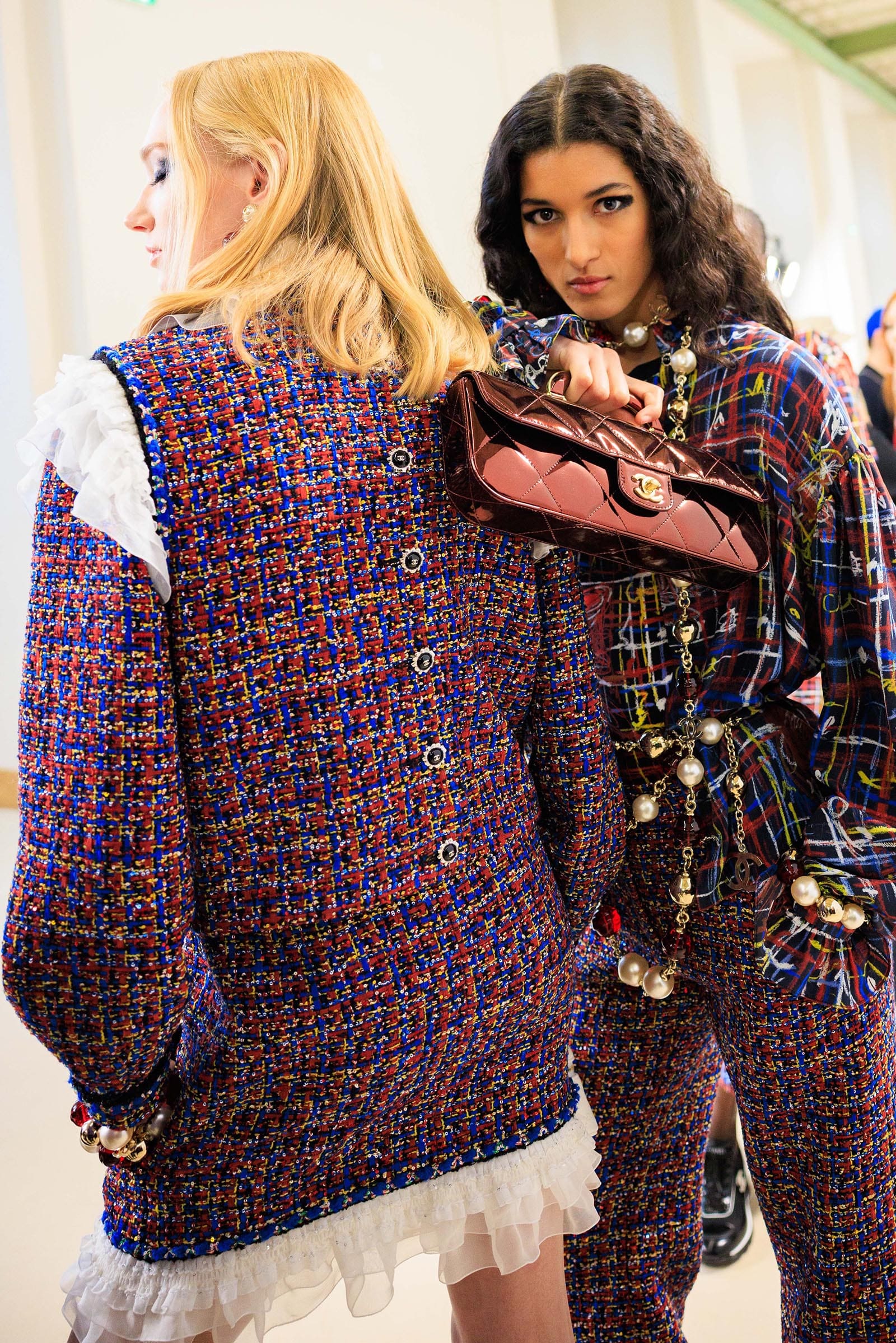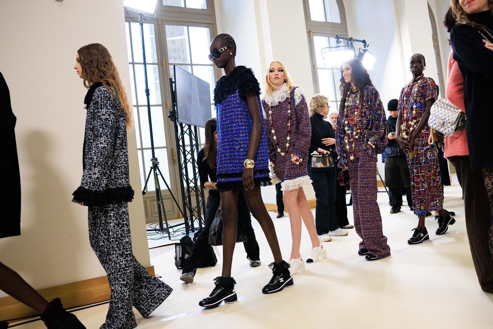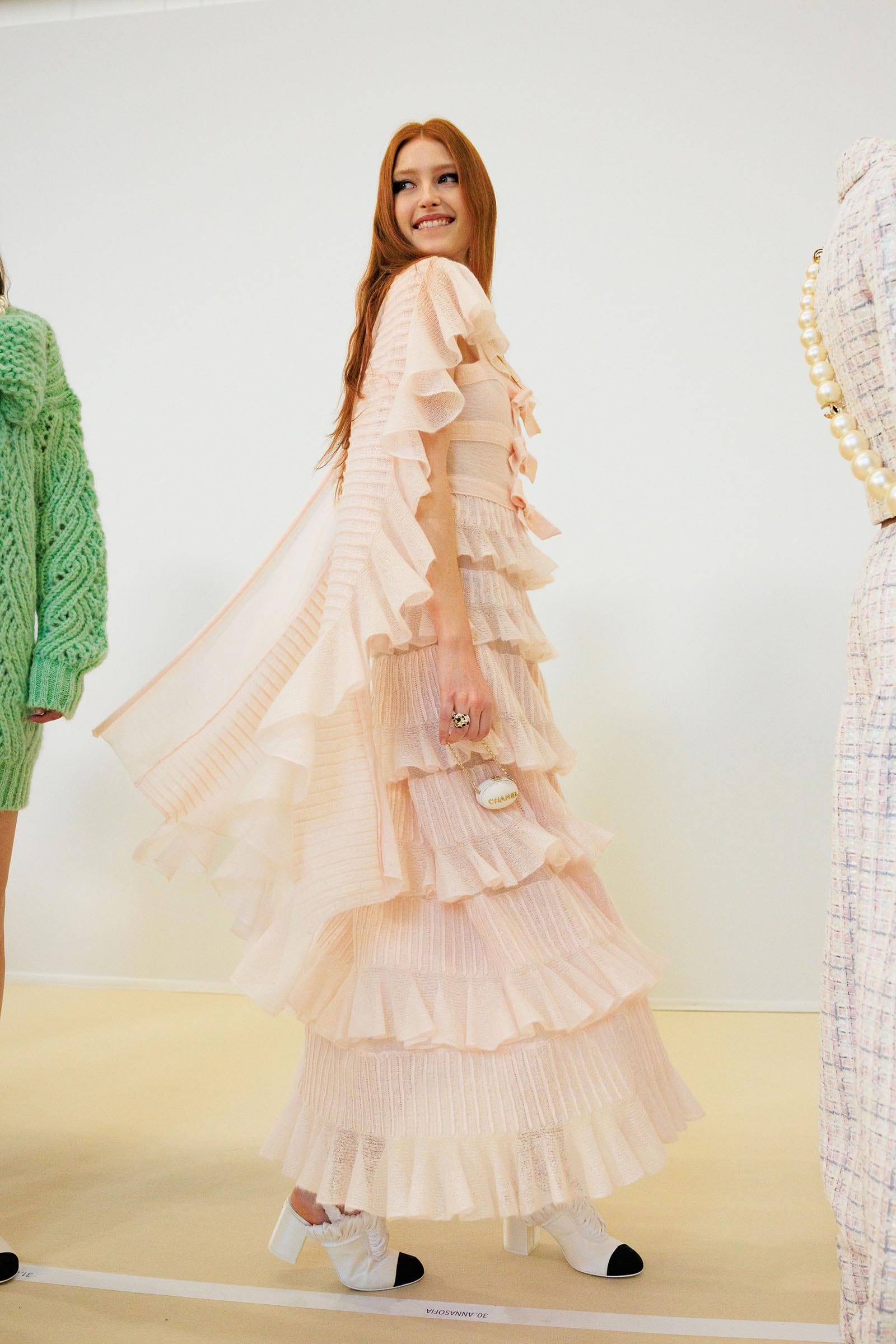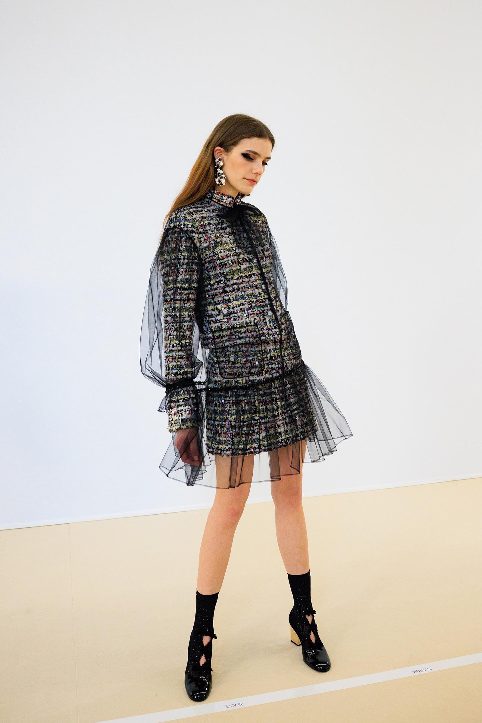 First, though, there were more strategies for blurring the edges of tweed suits and shifts. One revived Coco Chanel’s own white-ruff signature—amazing in the way she wore it herself in chic contrast to a black jacket (it’s an accessory which also popped up at Dior and McQueen this season). A short multicolored tweed shift grew cream chiffon ruffles at the hem, shoulders and neck in a cute way.