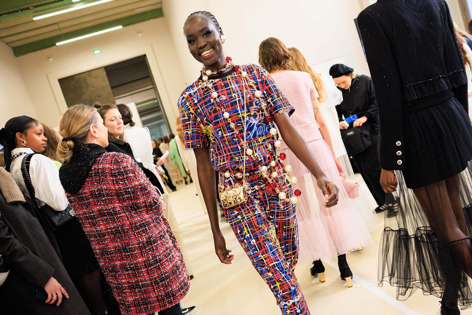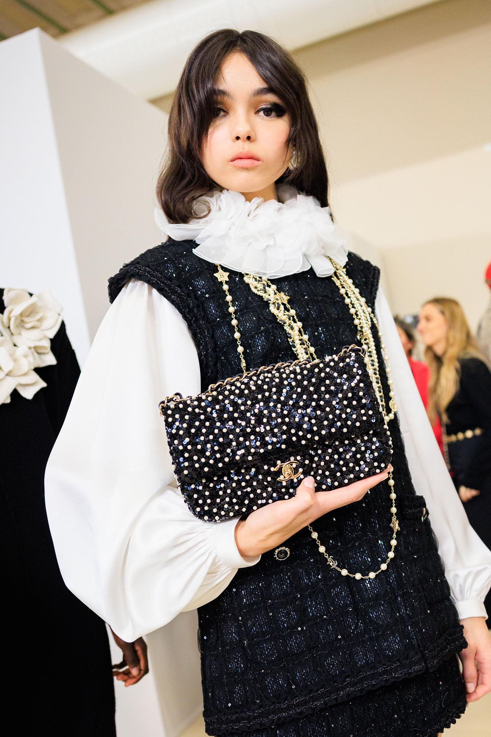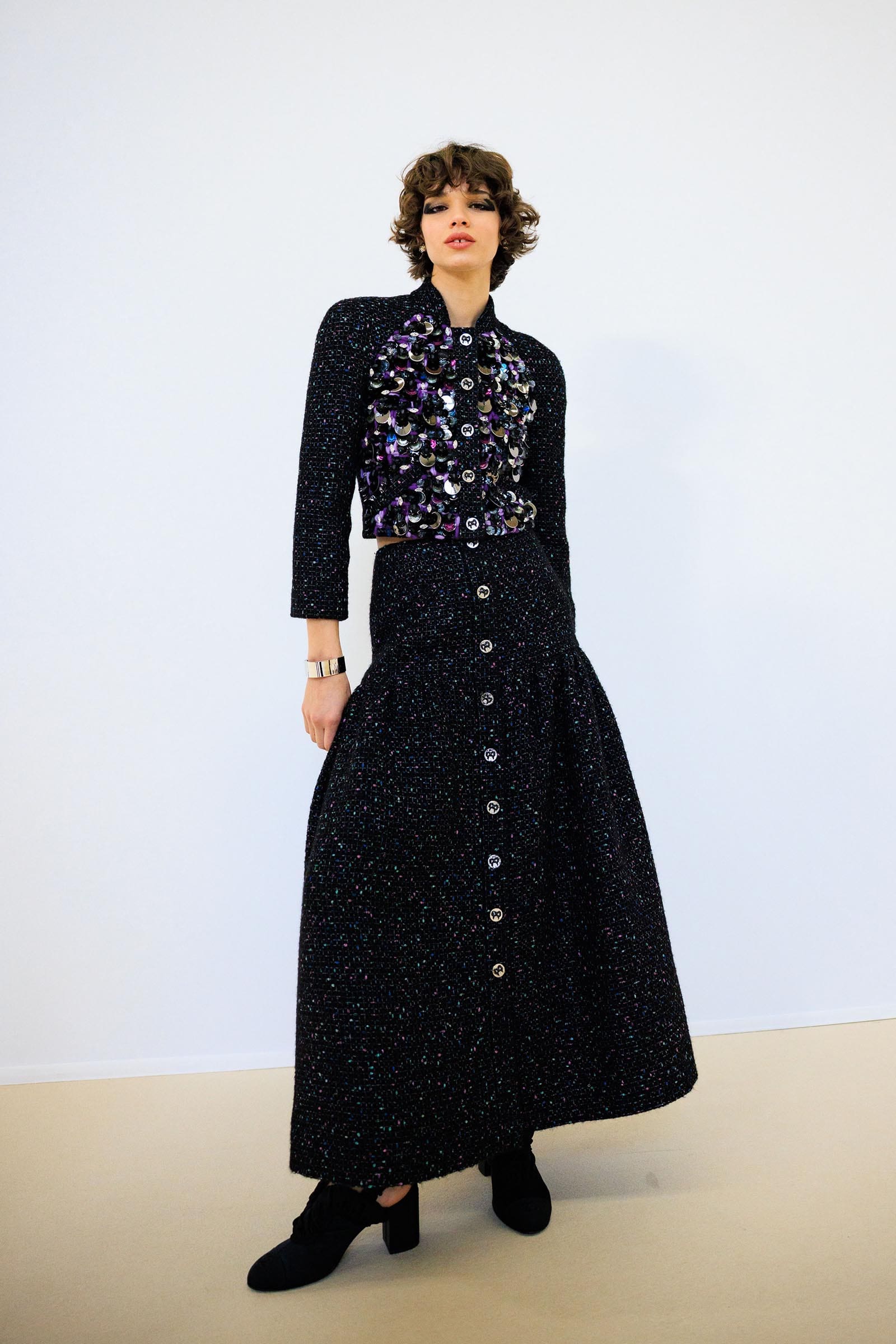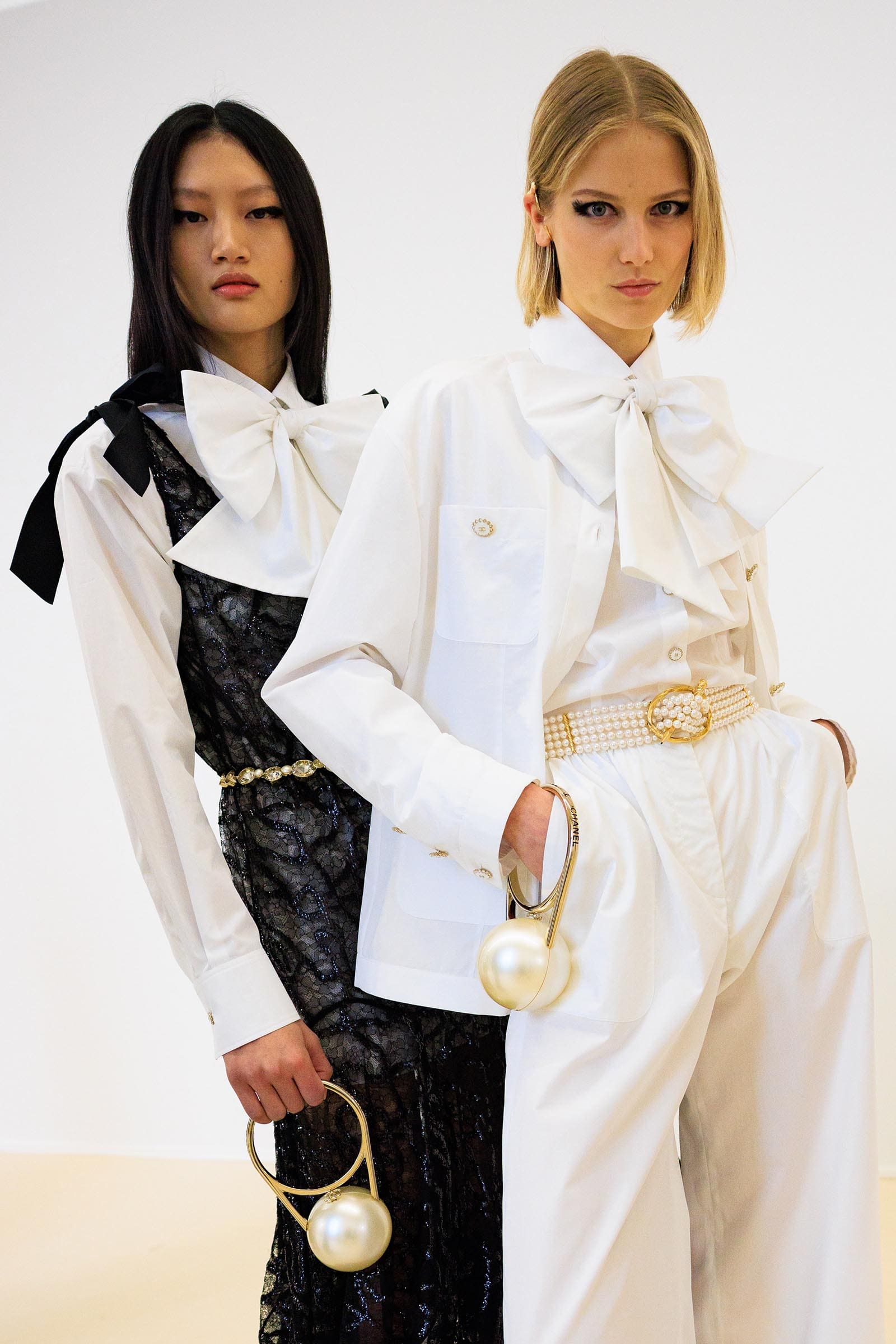As the set suggested, the design team had brainstormed just about everything you can do with a Coco ribbon bow: tie it at the neck, print it, sequin-embroider it, cut it out, knit it, put it in the hair. Of course, the black satin bow tied in the neck of a silk blouse is truly an identifier, a classic ‘owned’ by Chanel if not in legal copyright, then in spirit. In its purest form, it’s a styling trick that looks great on practically everyone from 14 to 94. When you see it in any other collection, you think: oh, a curtsey to Chanel.